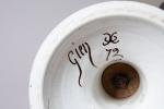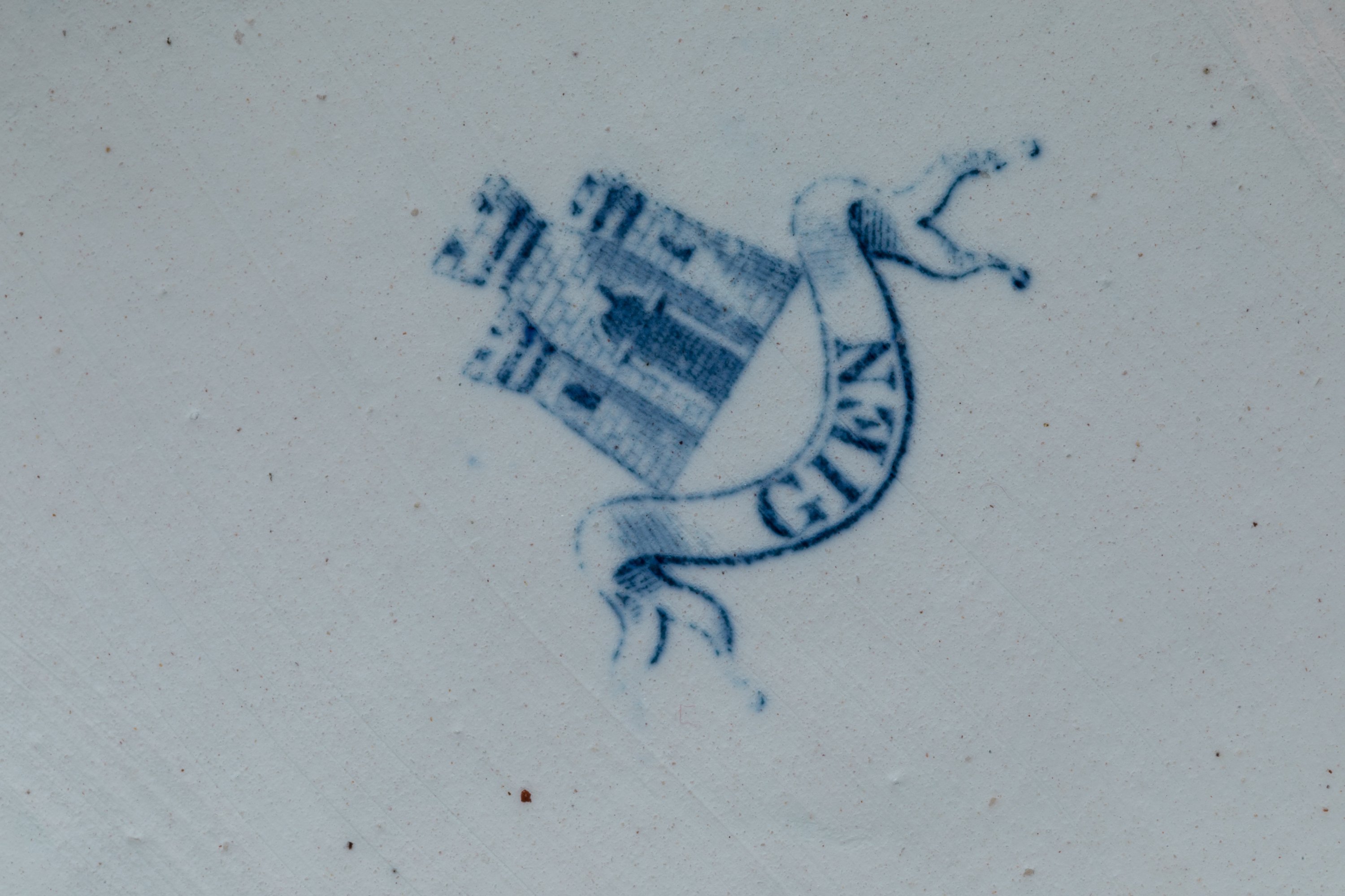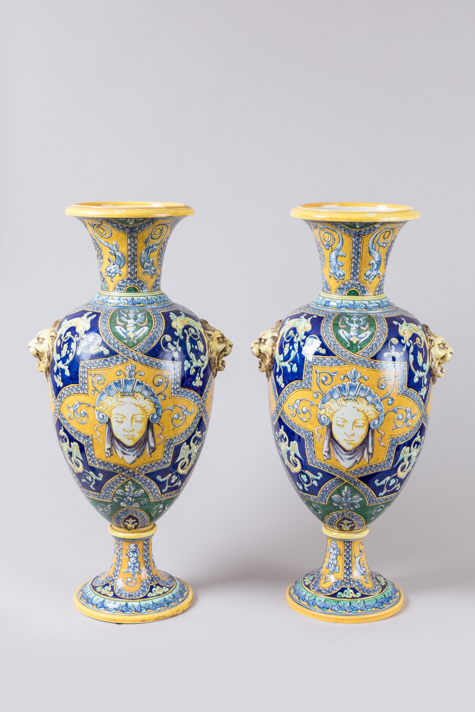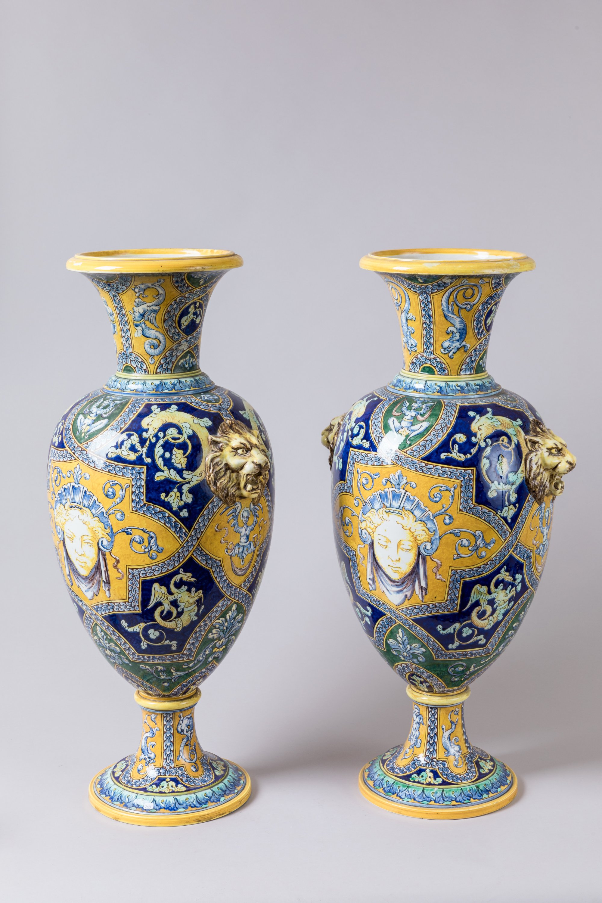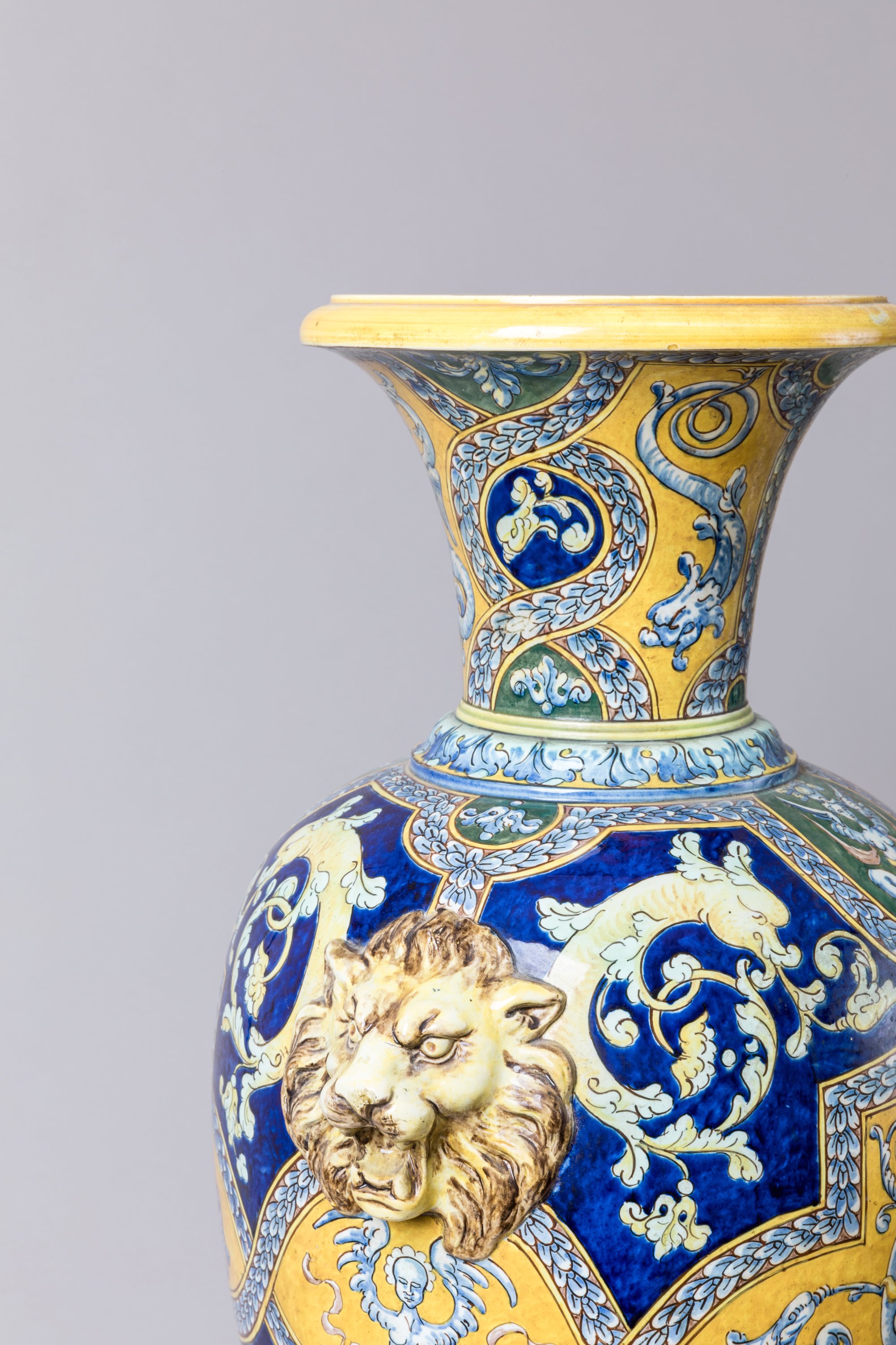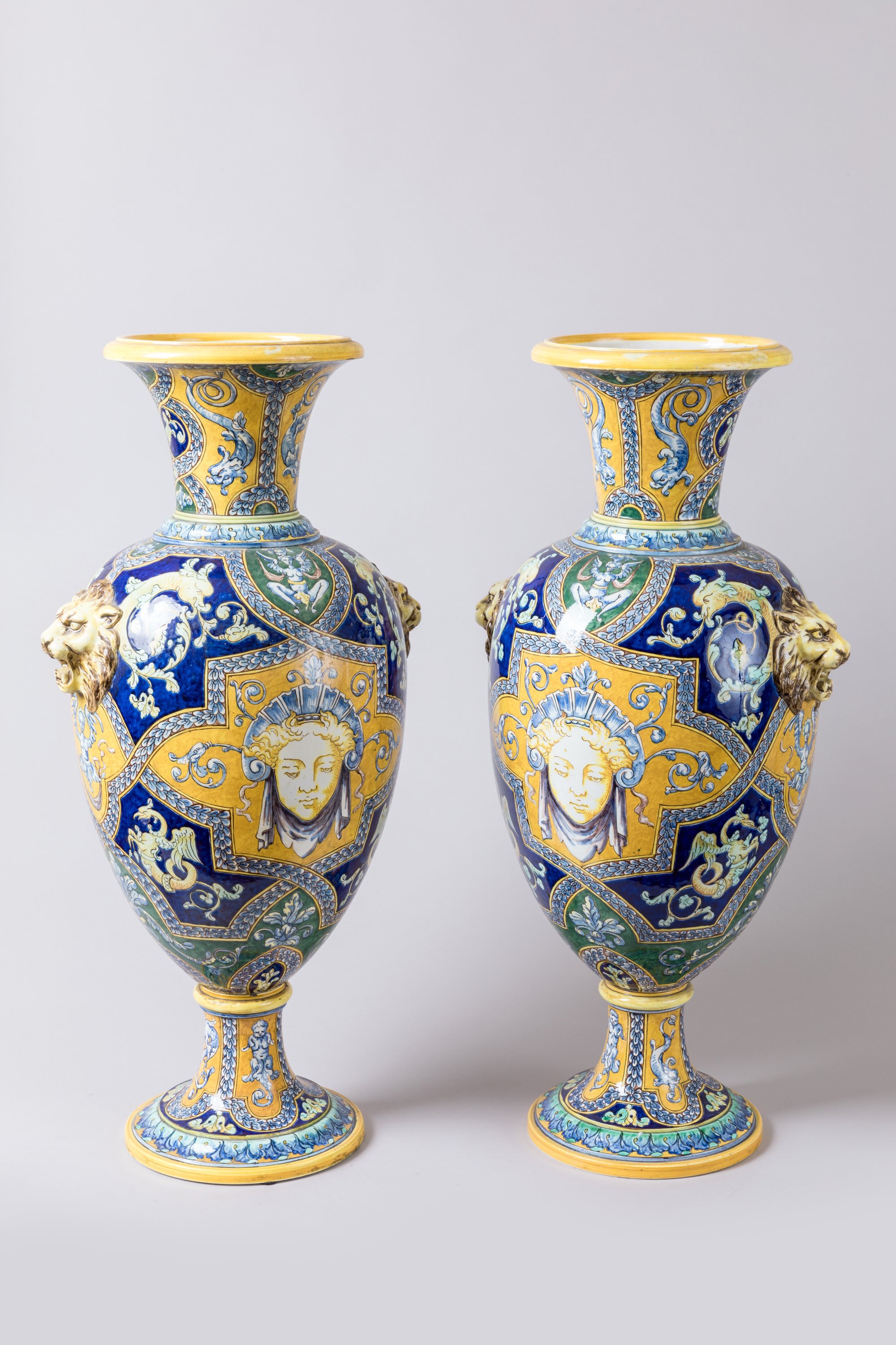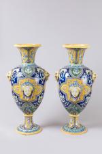en céramique émaillée au décor de grotesque à la Bérain, prises aux mufles de lion.