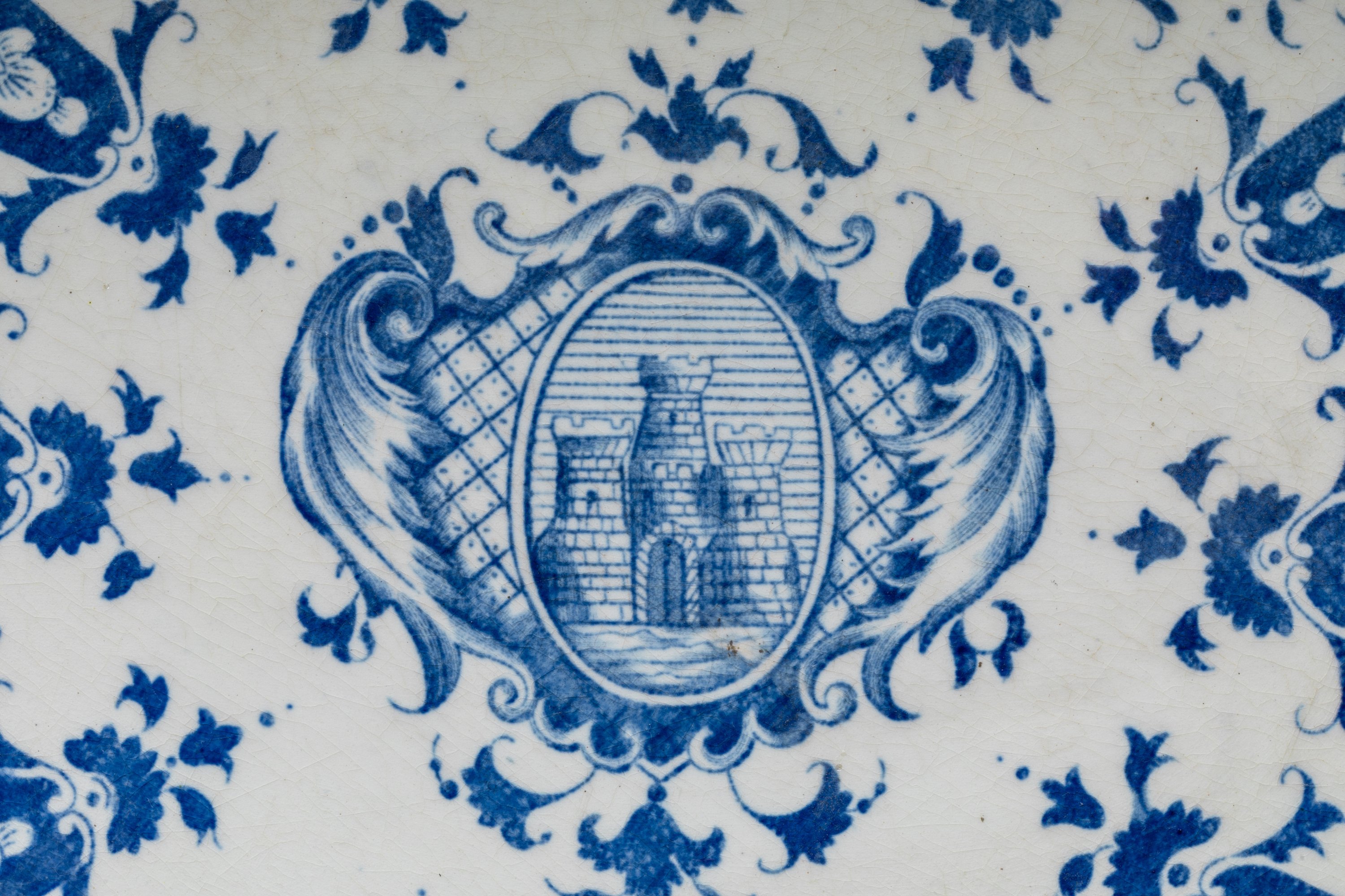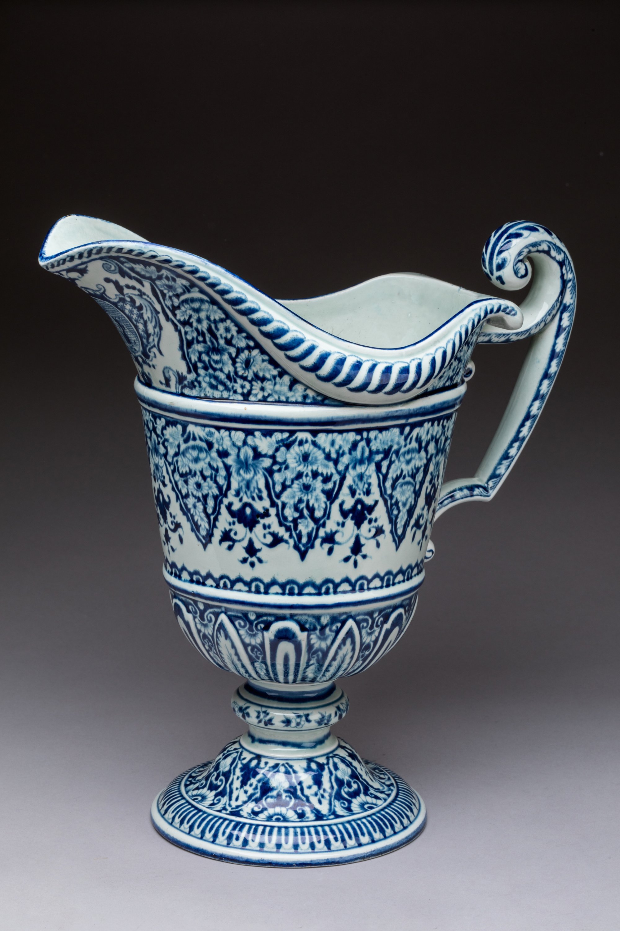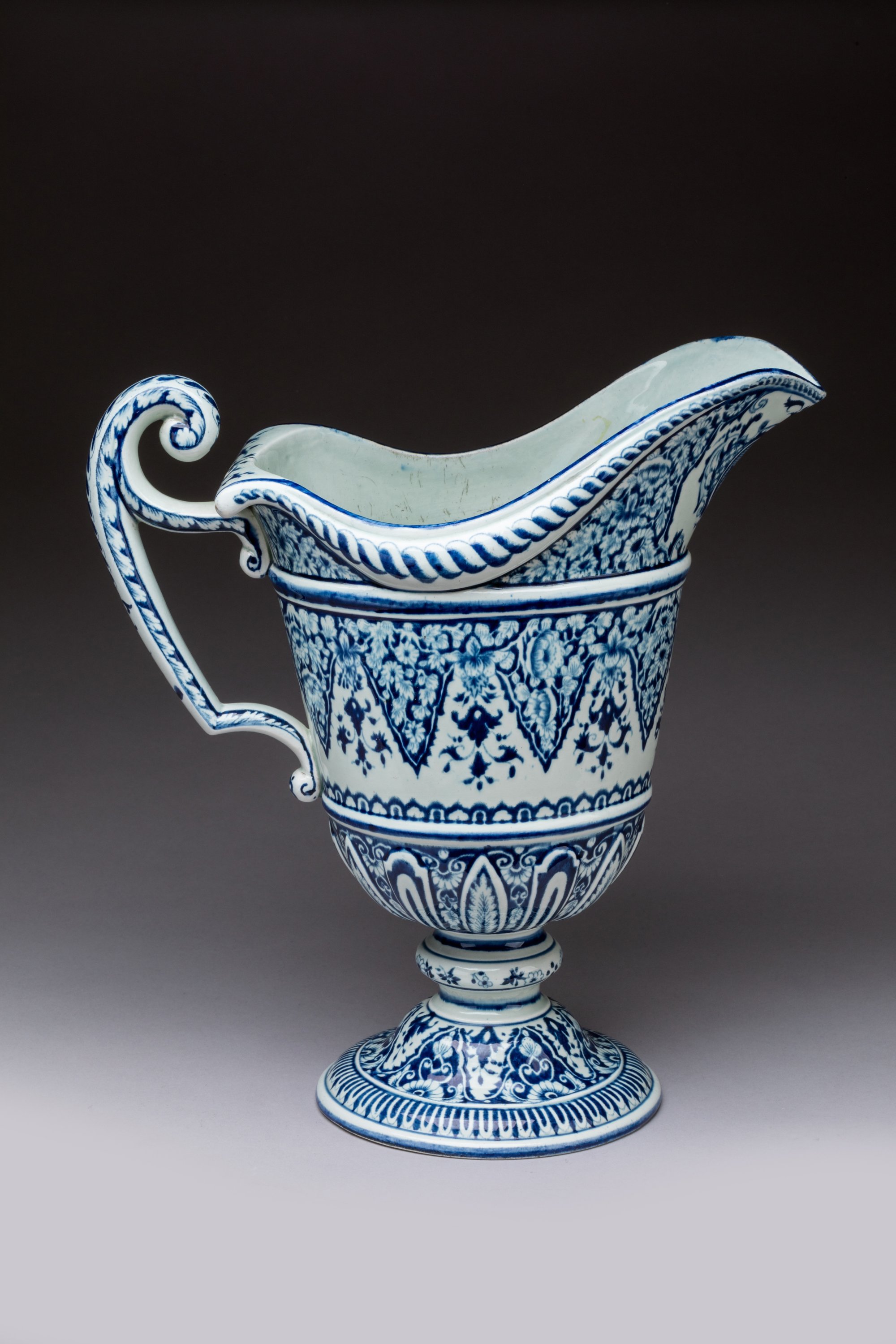 en céramique émaillée bleue blanche à la façon de Rouen avec cartouche Gien aux trois tours. Anses à mufles de grotesque.