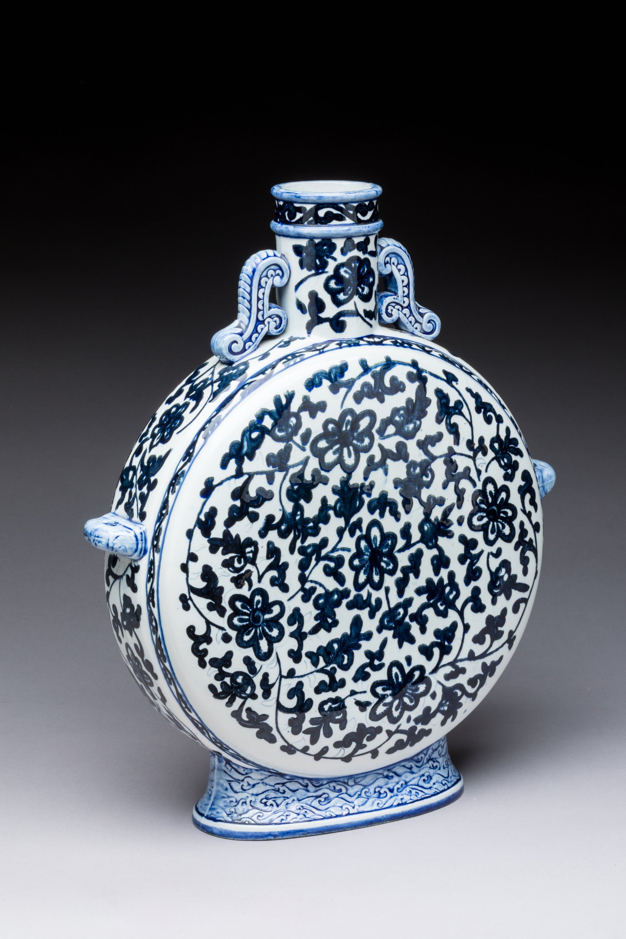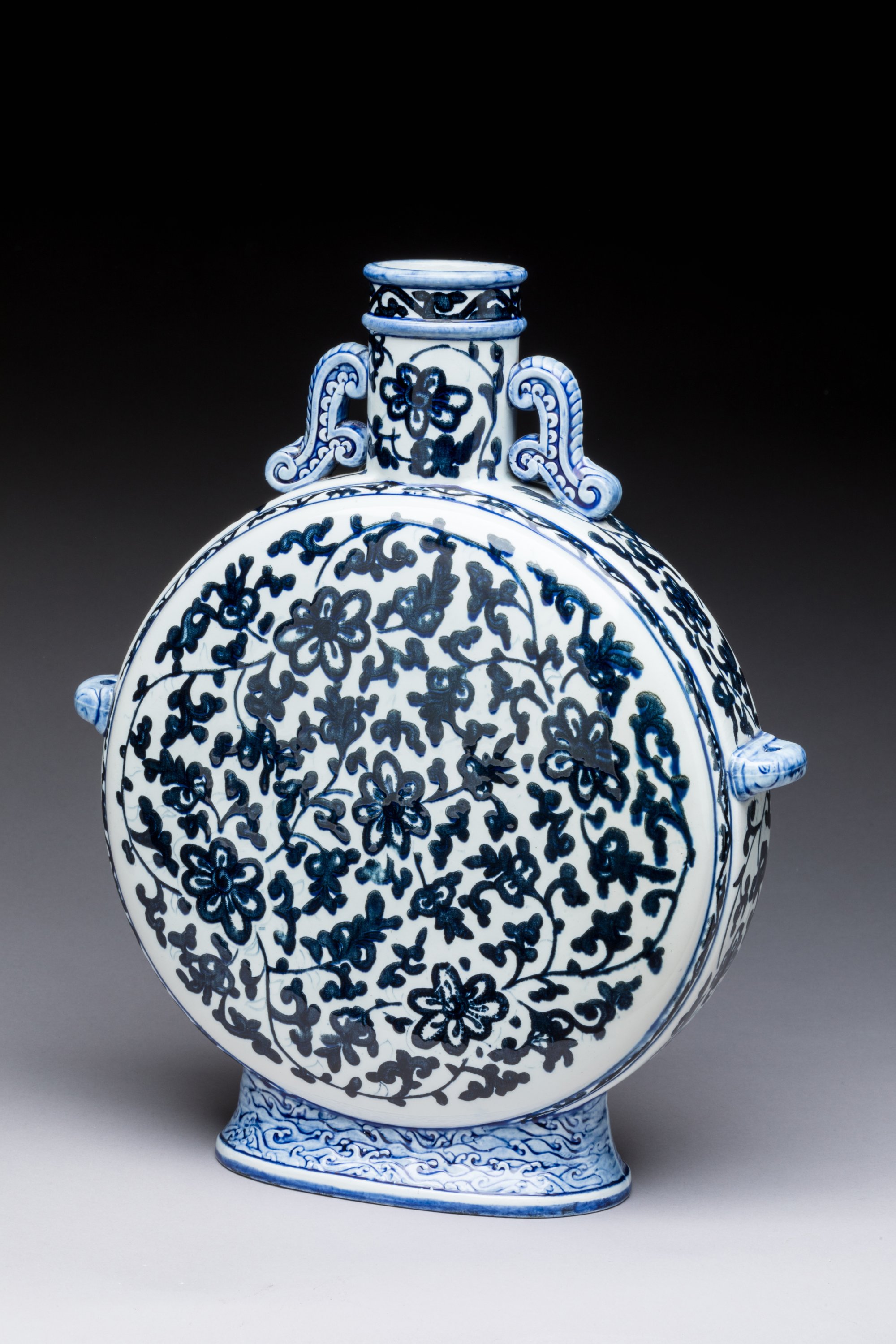 en céramique à décor émaillé bleu sur fond blanc de feuillages dans le goût chinois, et de vagues sur le piétement.
