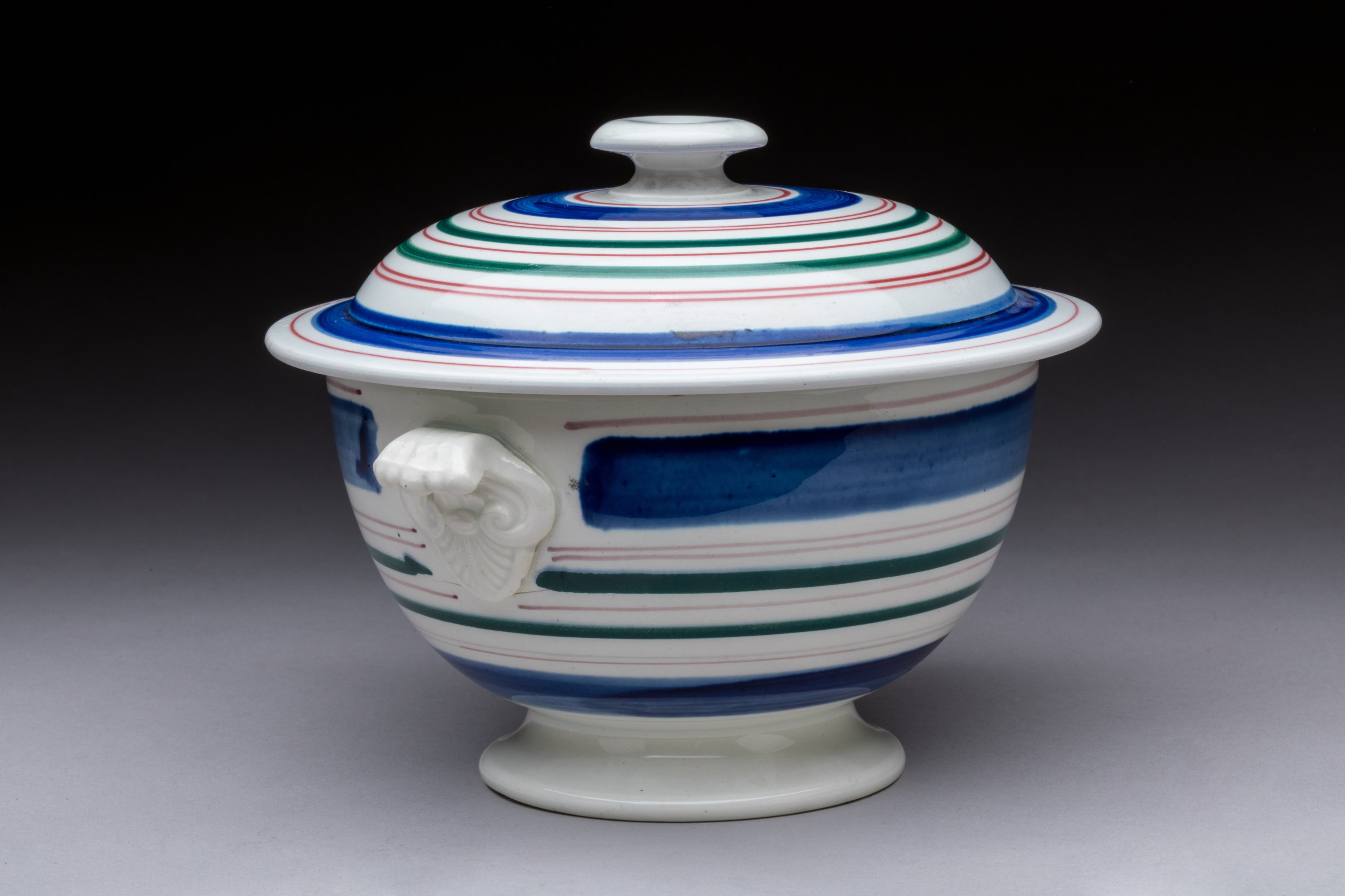 en céramique émaillée à décor de bandes bleues sur fond blanc. Prises rocailles.