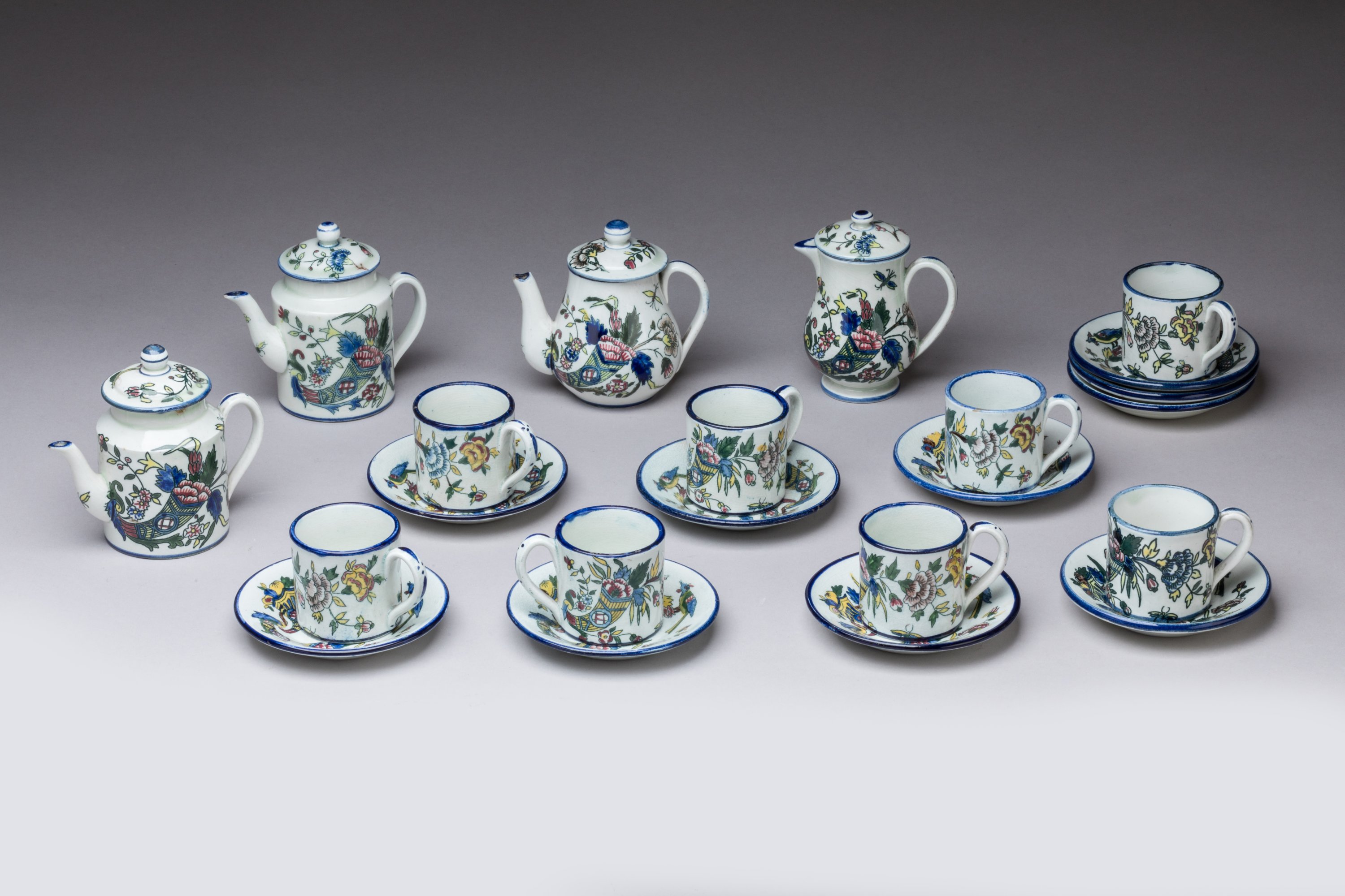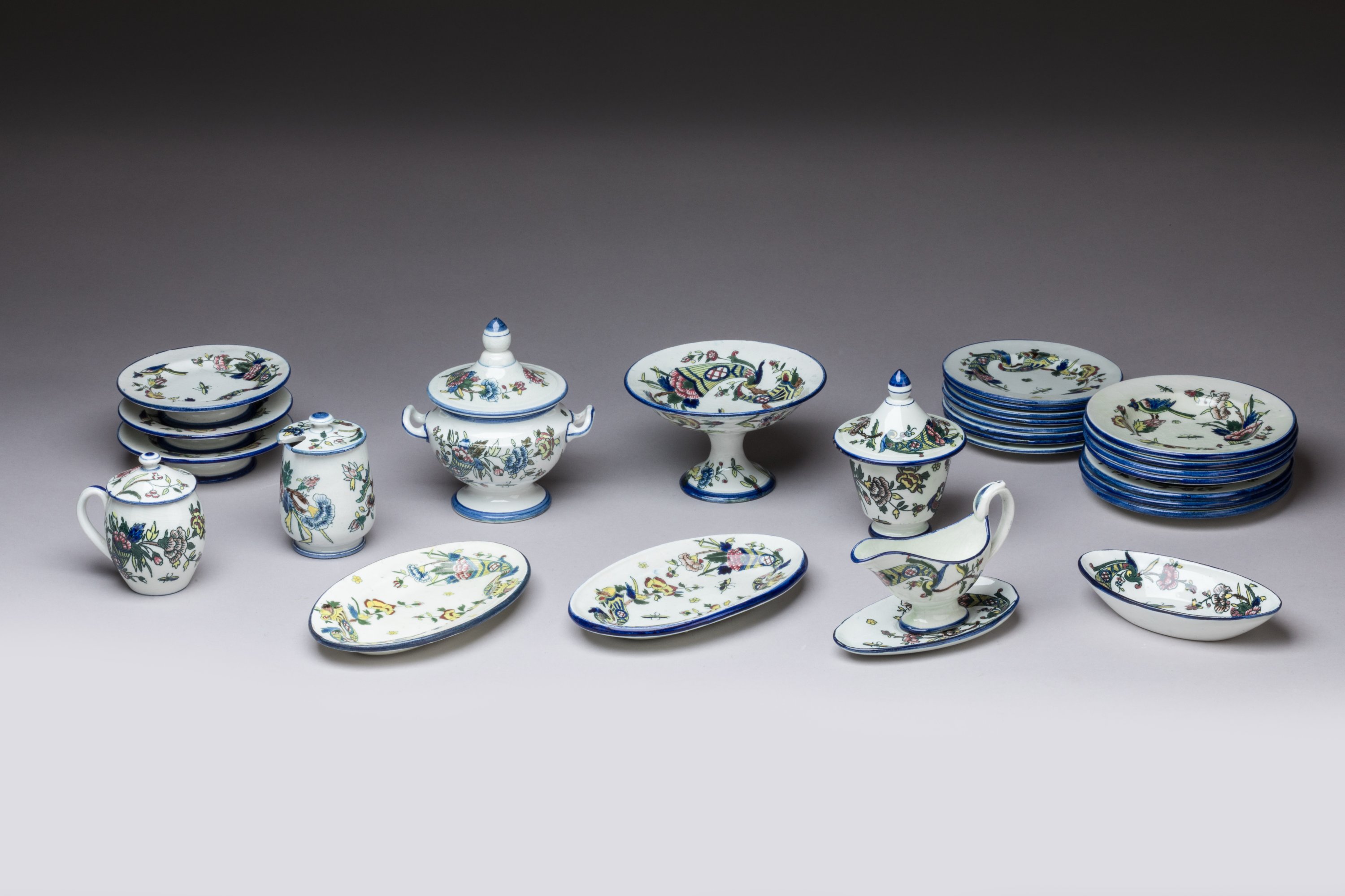 en céramique émaillée, dont huit tasses et sept sous-tasses, dix-huit assiettes, quatre plats et raviers, quatre coupes et dix pièces de forme.