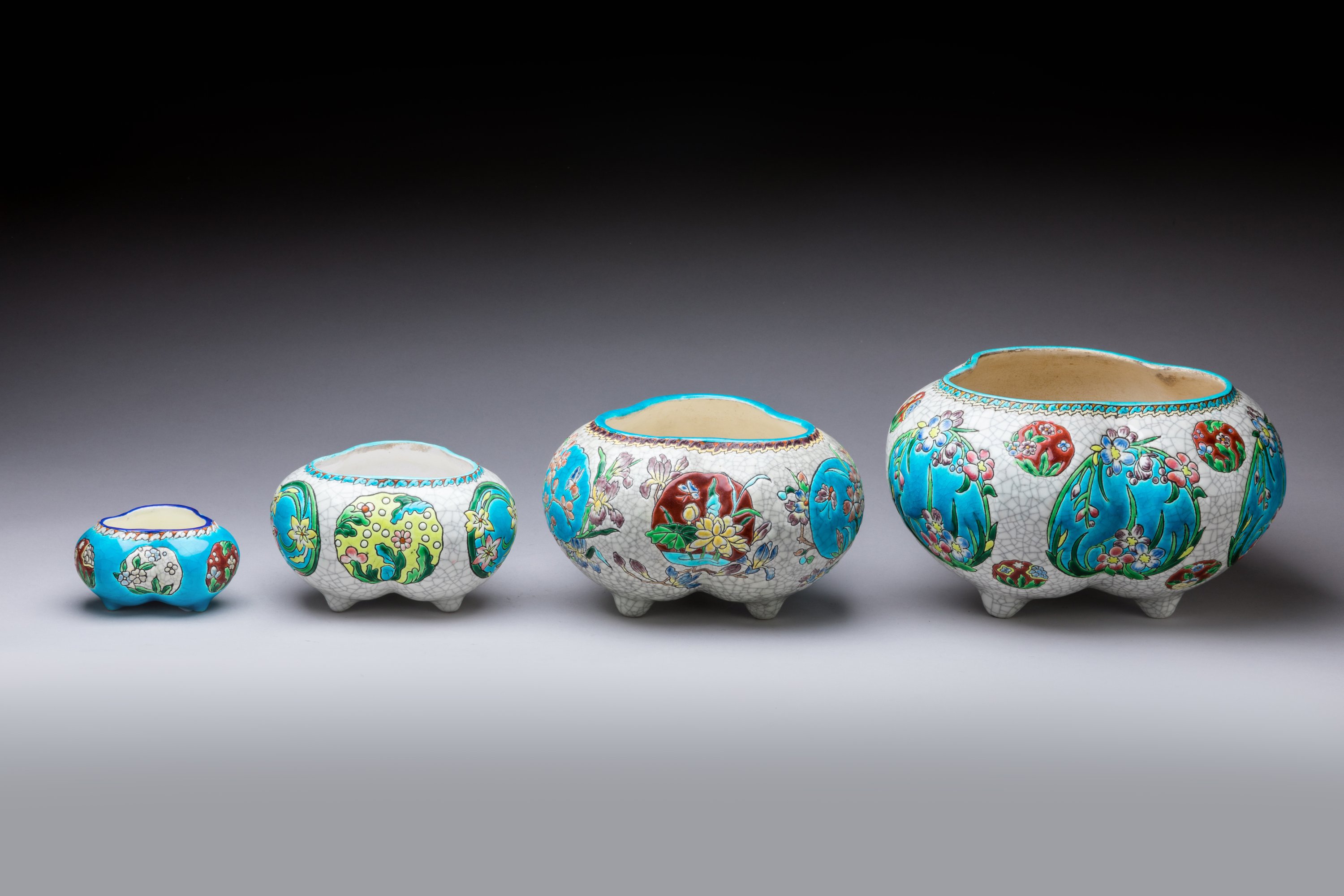 en céramique émaillée dite de Longwy, trois à fond clair et médaillons turquoise et une à fond bleu.