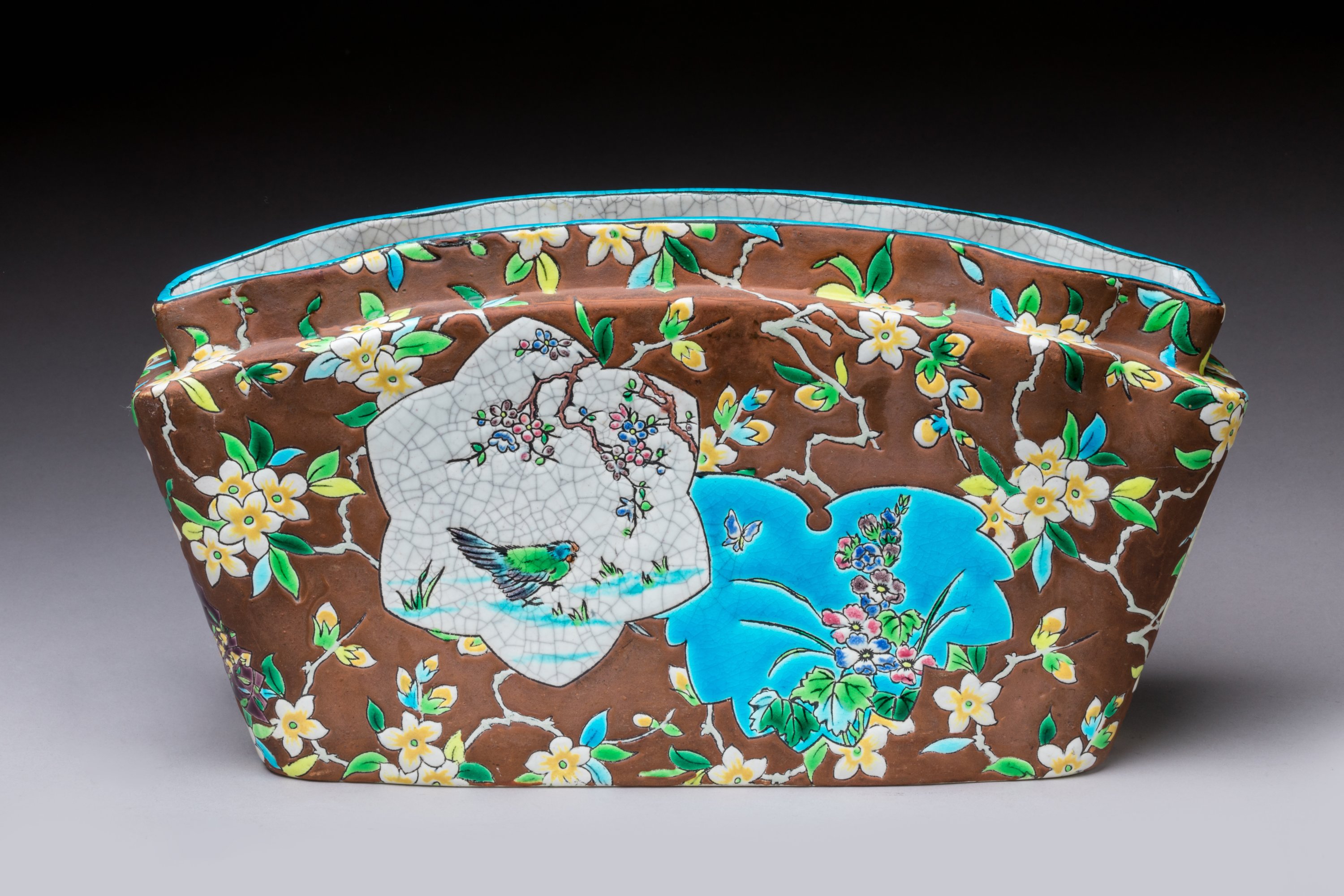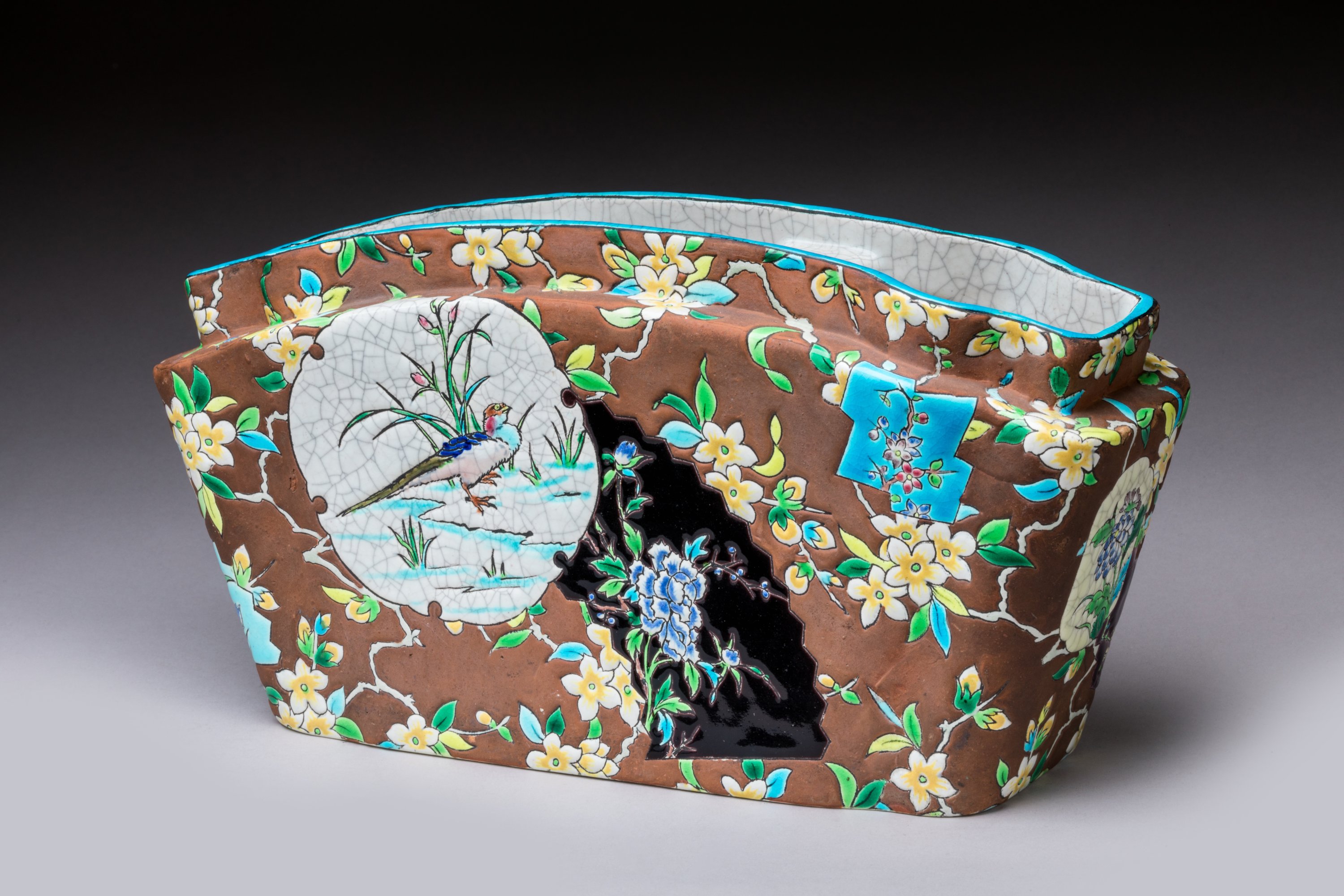 en céramique émaillée dite de Longwy à fonds chocolat à décor d'oiseaux dans des cartouches.