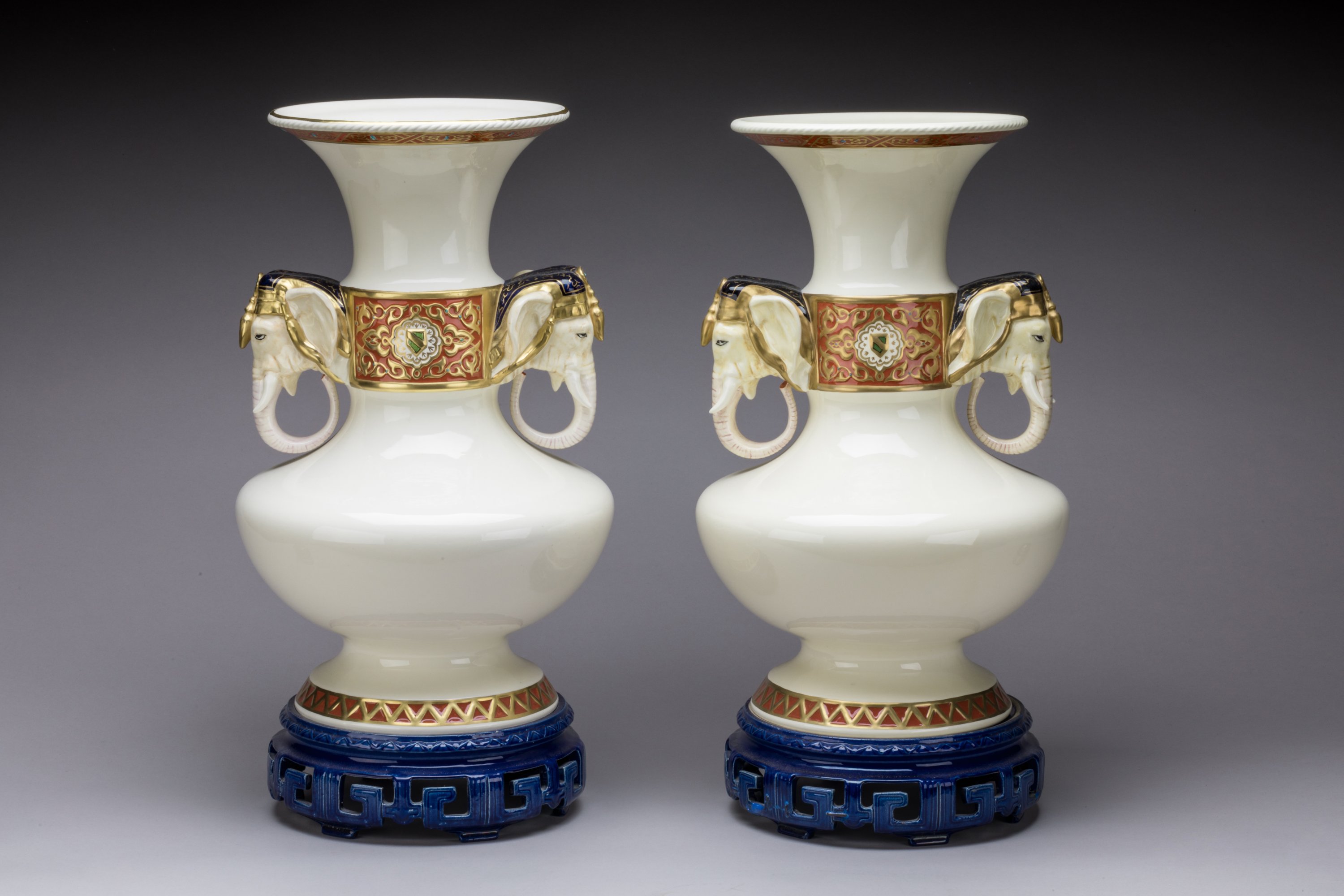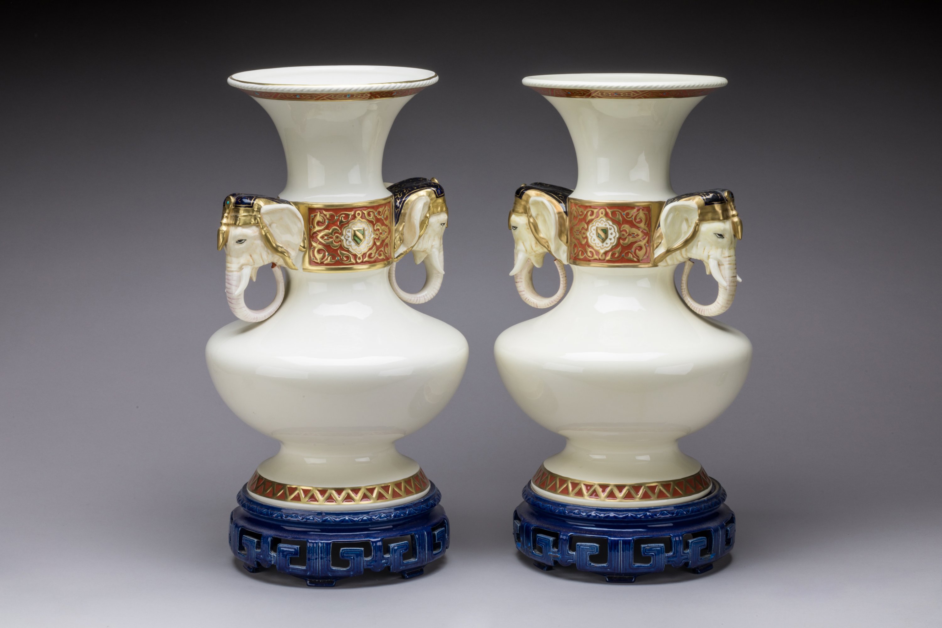 Paire de VASES BALUSTRES aux ÉLÉPHANTS sur deux SOCLES bleu à frise de grecque