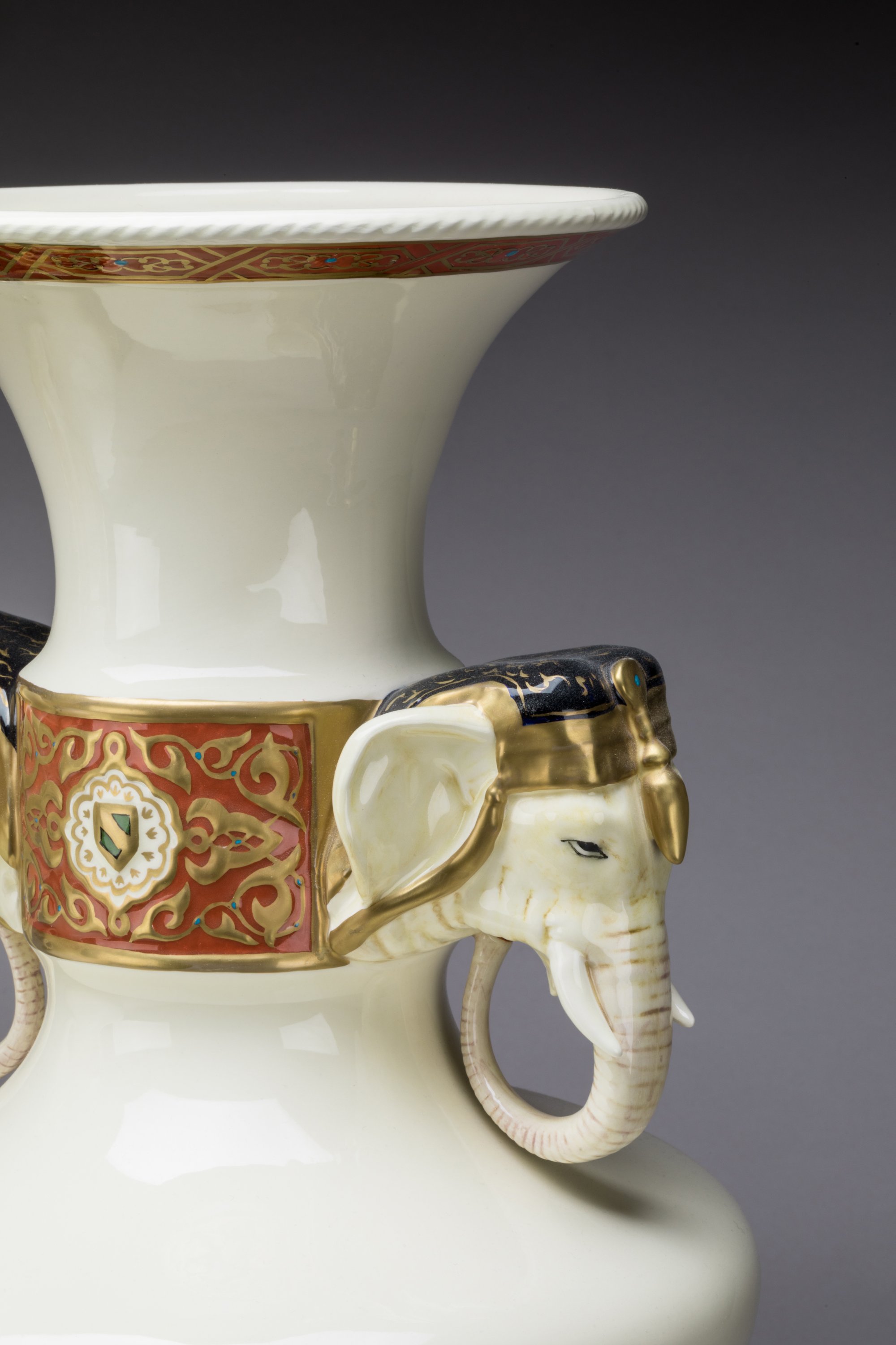 en céramique émaillée à fond maïs, émaux polychromes, têtes de pachyderme appliquées en ronde bosse et rehaut d'or.