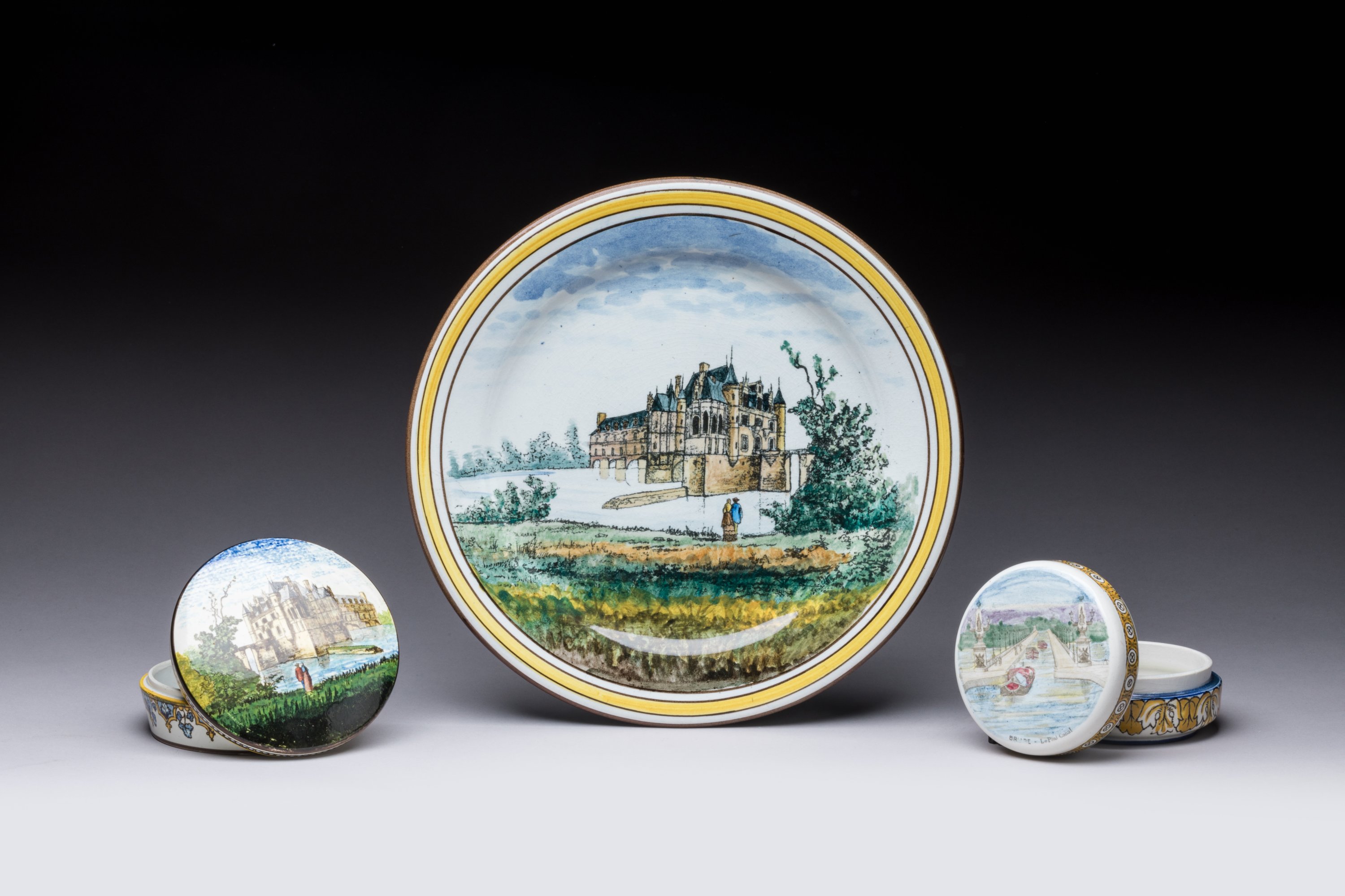 Une assiette et une bonbonnière en céramique émaillée au décor peint auxquelles on joint une bonbonnière au PONT CANAL de BRIARE.