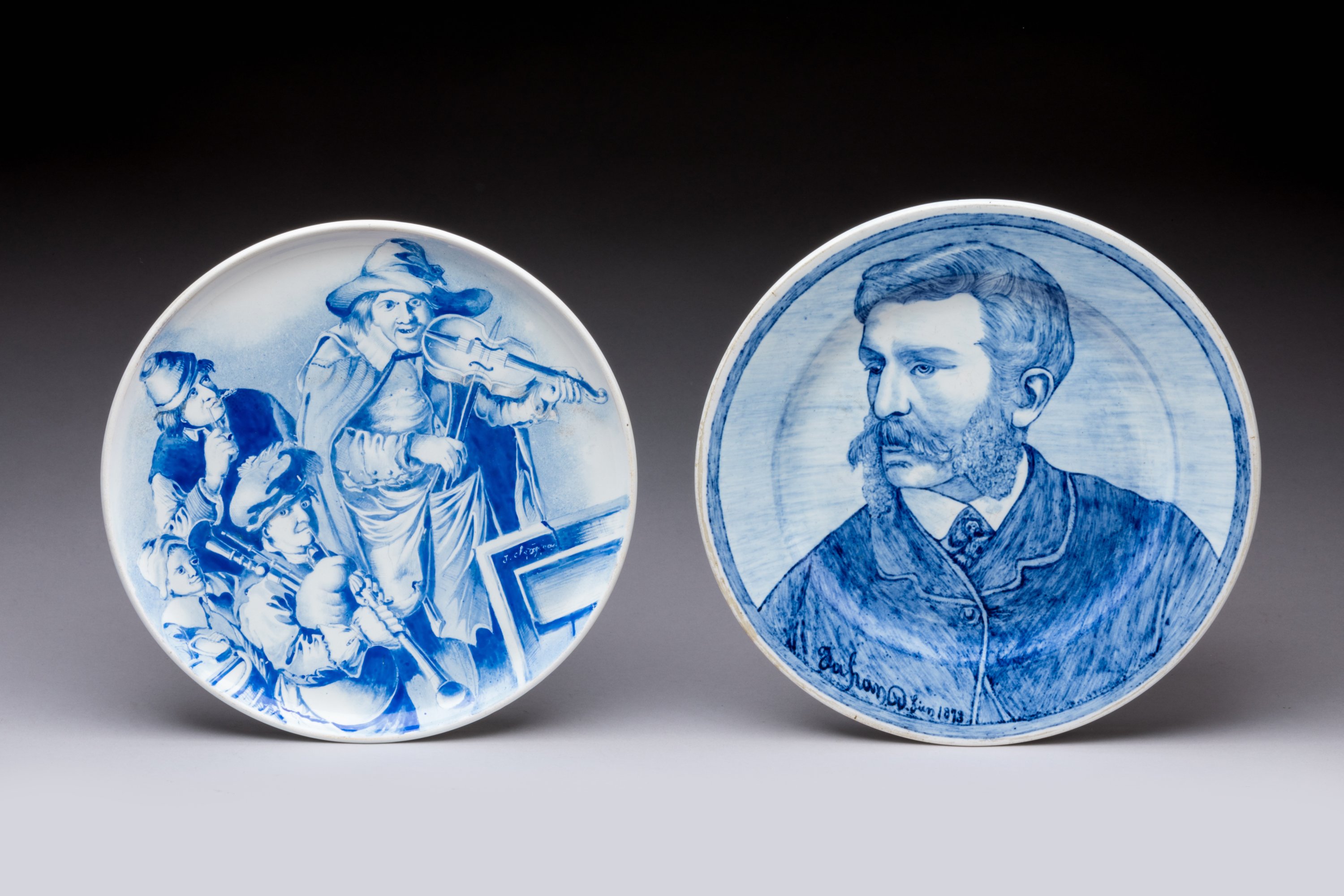 Assiette portrait en céramique émaillée figurant le prince lorsqu'il vint à la faïencerie chercher le service qu'il avait commandé. Signature dans le décor, datée 1873 et située Gien. Titrée au dos.