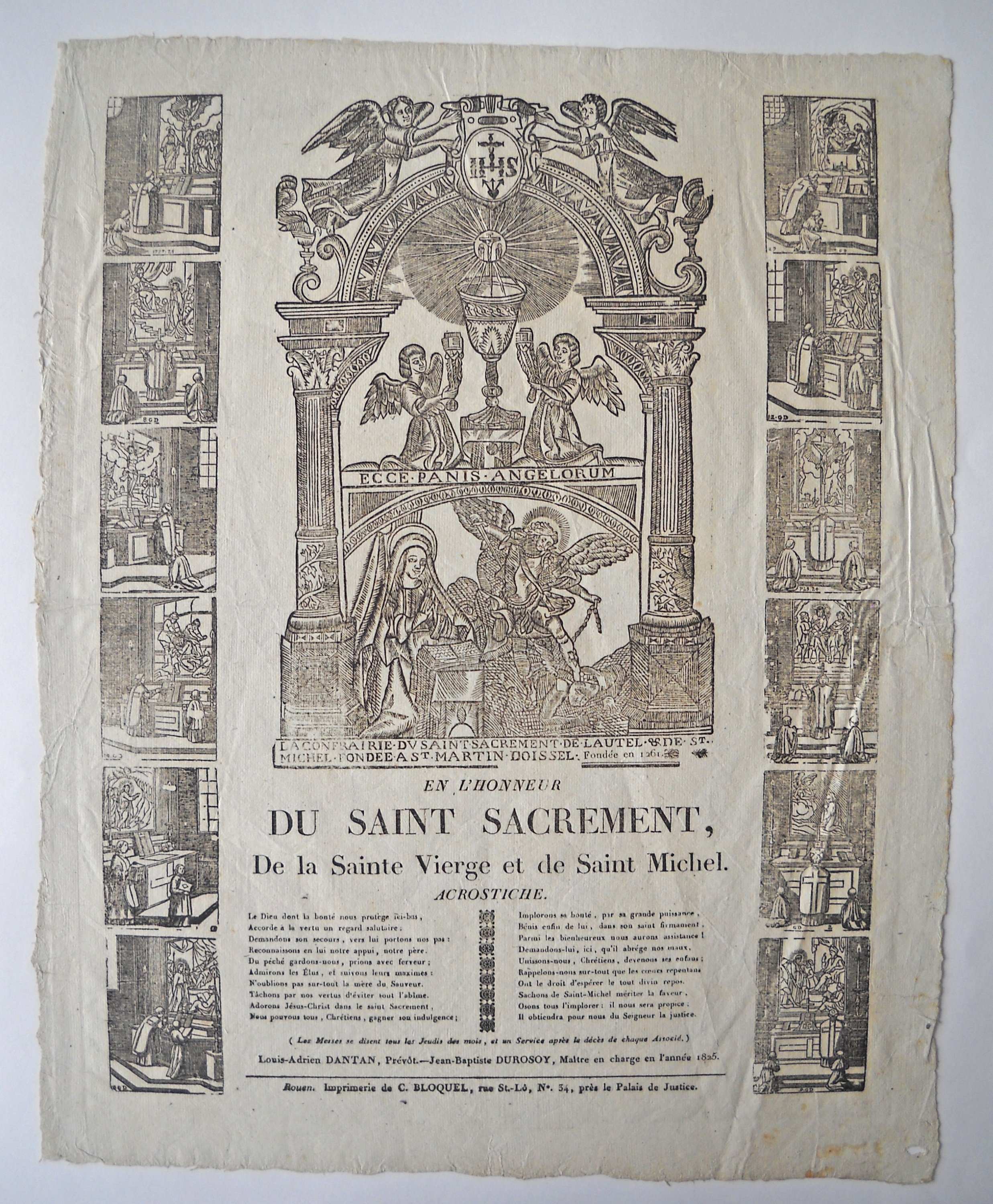 5 épreuves, gravures sur bois, sur papier vergé, placées sous passe-partout : Image de confrérie " du Roseire en l'honneur de la Sainte Vierge ", " De l'impr. de P. SEYER, rue du Petis-Puits ", ca 1776, 44 x 33 cm (rest. et petits manques) - Image de confrérie " en l'honneur du SAINT SACREMENT, de la Sainte Vierge et de Saint Michel ", " Rouen, Imprimerie de C. BLOQUEL