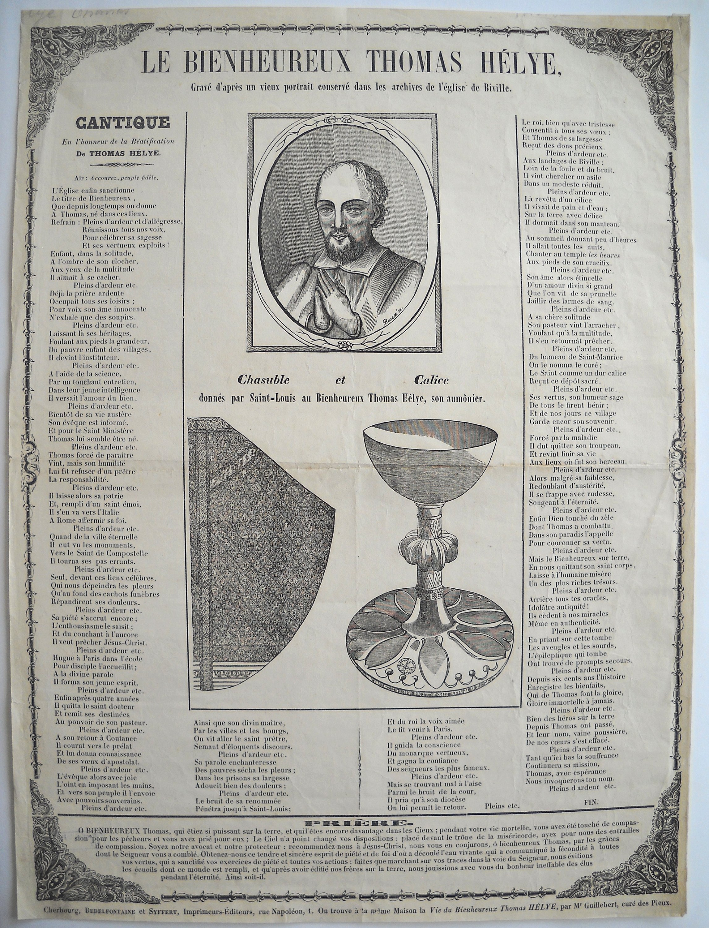 ", XIXe s., 43,5 x 35 cm - " LE BIENHEUREUX THOMAS HELYE ", " Cherbourg, BEDELFONTAINE et SYFFERT
