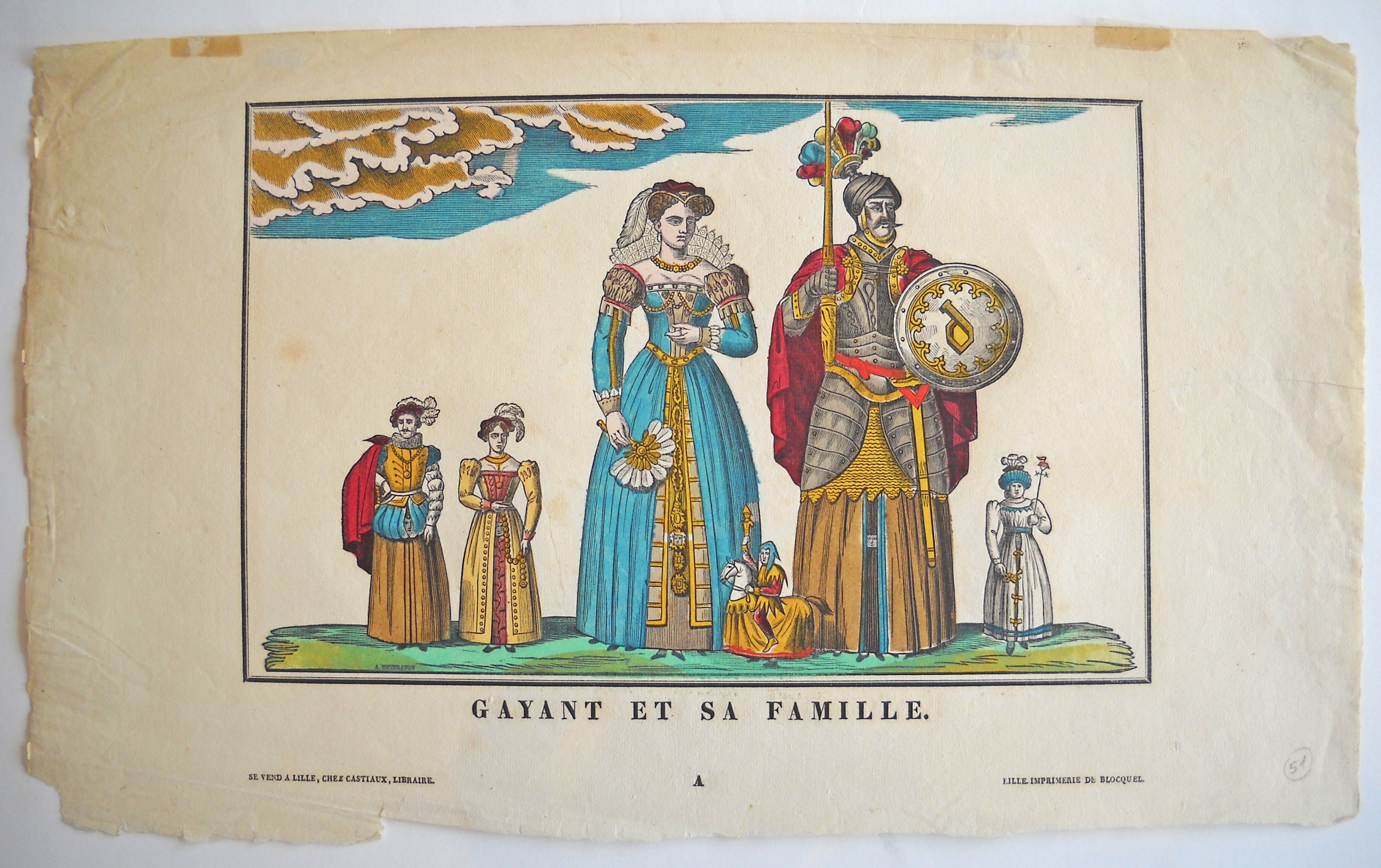 4 épreuves, gravures sur bois, coloris d'époque, dont 3 sur papier vergé crème ou azuré, dont 2 placées sous passe-partout : " LA PROCESSION DE MONS, CHANSON MONTOISE ", 30,5 x 38 cm (plis) - " Vie de Michel Morin ", 27 x 42 cm - " GAYANT ET SA FAMILLE ", 26 x 43 cm - " LE NOUVEL ASTROLOGUE FRANÇAIS, ALMANACH UNIVERSEL, UTILE ET AMUSANT, POUR L'ANNÉE 1831 ", affichette, [imprimée chez Castiaux à Lille], 53,5 x 44 cm (plis), rare exemplaire.
