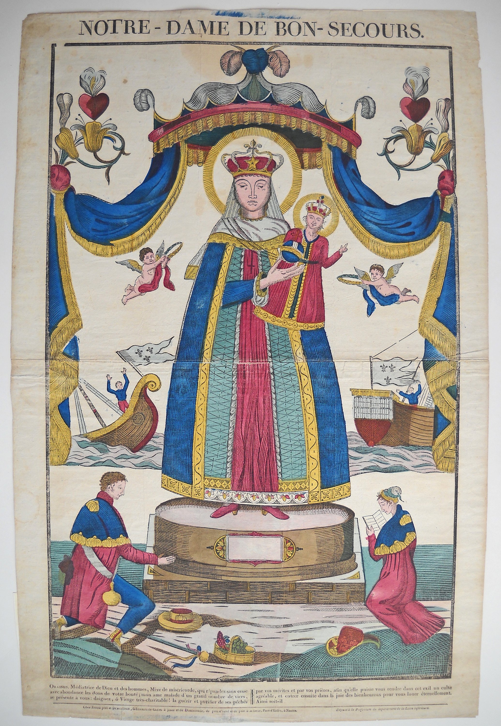 4 épreuves, gravures sur bois, coloris d'époque, en majorité sur papier vergé, placées sous passe-partout : " NOTRE DAME DE BON-SECOURS " " Chez ROINÉ père et DUMOUTIER ", entre 1817 et 1820, 85,5 x 55,5 cm (plis) - " STE ROSALIE " " A NANTES, chez Roiné père, DUMOUTIER et Roiné fils ", entre 1820 et 1823, 39,5 x 32 cm (plis, taches, rest.) - " CHRIST A LA PASSION " " Chez ROINÉ père et fils ", entre 1823 et 1826, 39 x 31 cm - " VÉRITABLE PORTRAIT DU JUIF ERRANT " " Chez ROINÉ AÎNÉ ", avant 1840, 38,5 x 30 cm (plis, rest. petits défauts).