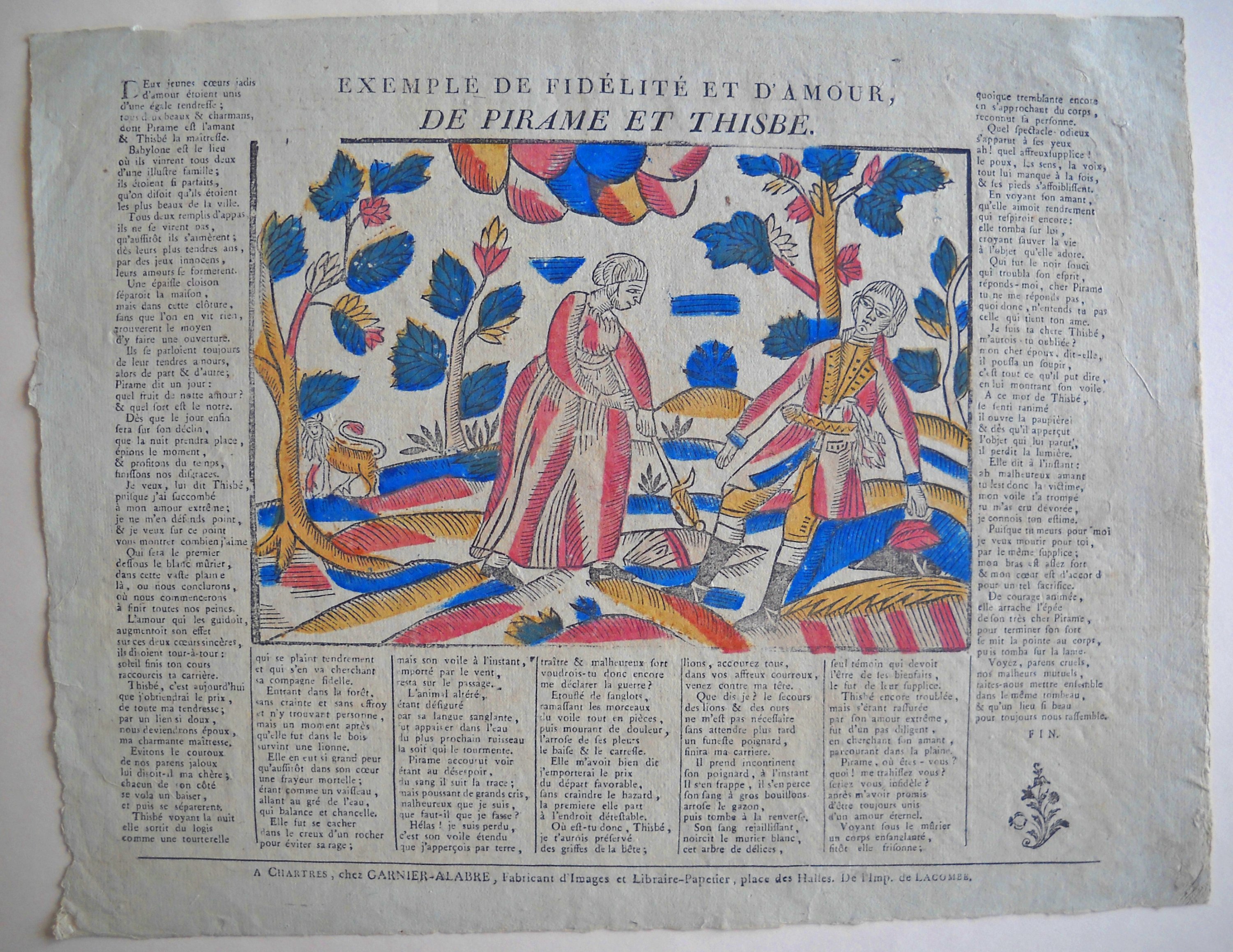 2 épreuves, gravures sur bois, coloris d'époque, sur papier vergé crème ou azuré : " LE VRAI PORTRAIT DU JUIF ERRANT ". Placée sous passe-partout. 38 x 30,5 cm (légers plis et taches). - " EXEMPLE DE FIDELITE ET D'AMOUR, DE PIRAME ET THISBE " " A CHARTRES, CHEZ GARNIER ALABRE ". 31 x 40,5 cm.