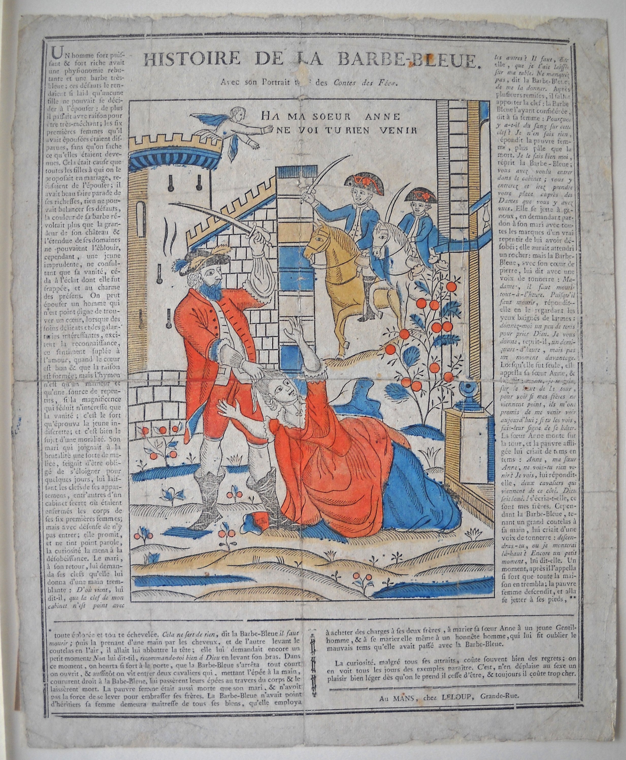 3 épreuves, gravures sur bois, coloris d'époque, sur papier vergé, placées sous passe-partout : fragment de frise de la suite [LE JARDIN SPIRITUEL DU MARTYRE DES APOTRES], attribuée à Pierre LELOUP et inspirée de l'épreuve imprimée par LEBLOND et SEVESTRE à Chartres à la fin du XVIIIe s., 37 x 45 cm - " HISTOIRE DE LA BARBE BLEUE AVEC SON PORTRAIT