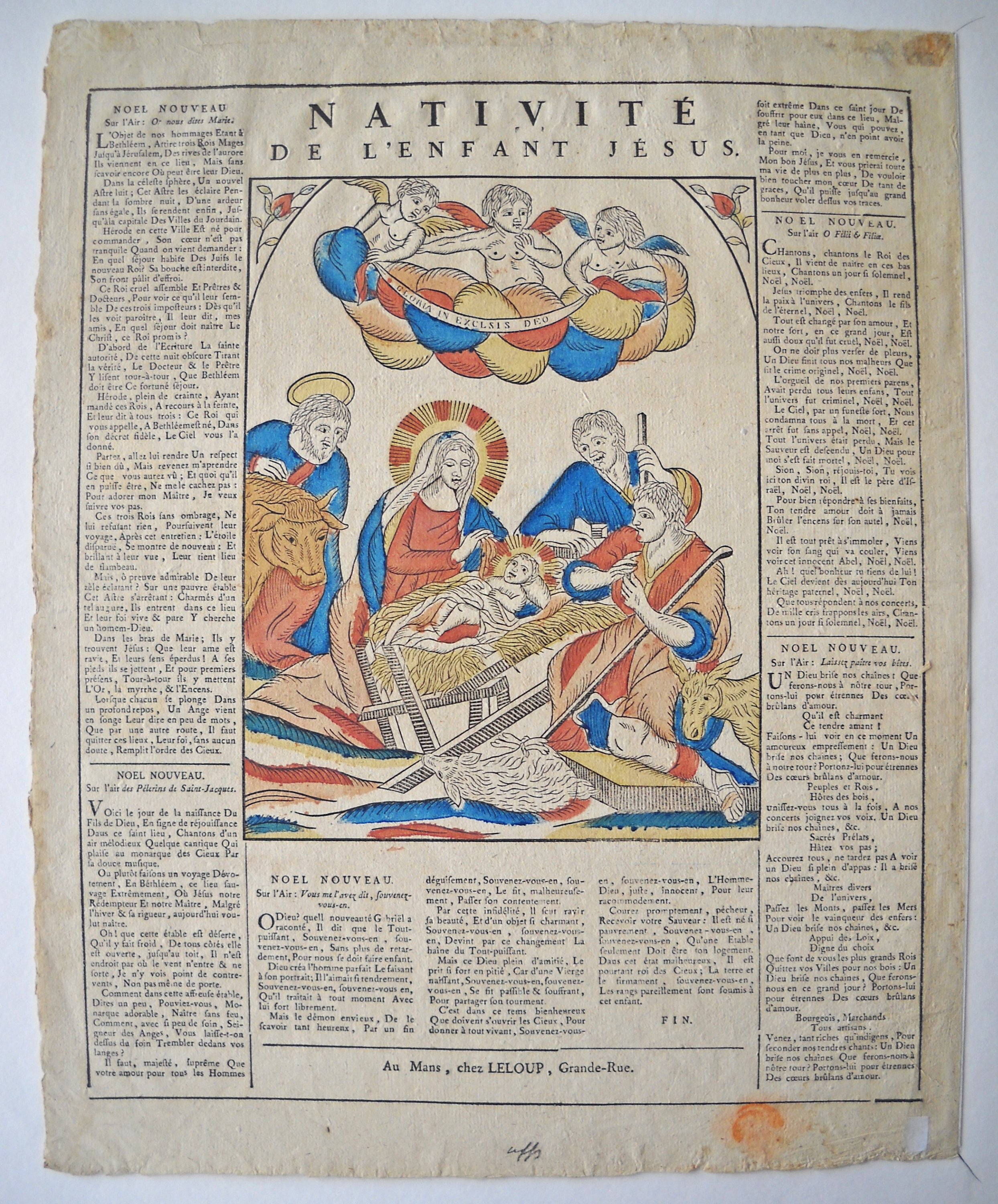 ", " Au Mans, chez LELOUP, Grande-Rue ", 38,5 x 31,5 cm (plis, petites lacunes, doublée sur japon) - " NATIVITÉ DE L'ENFANT JÉSUS ", " Au Mans, chez LELOUP, Grande-Rue ", 39 x 31,5 cm.