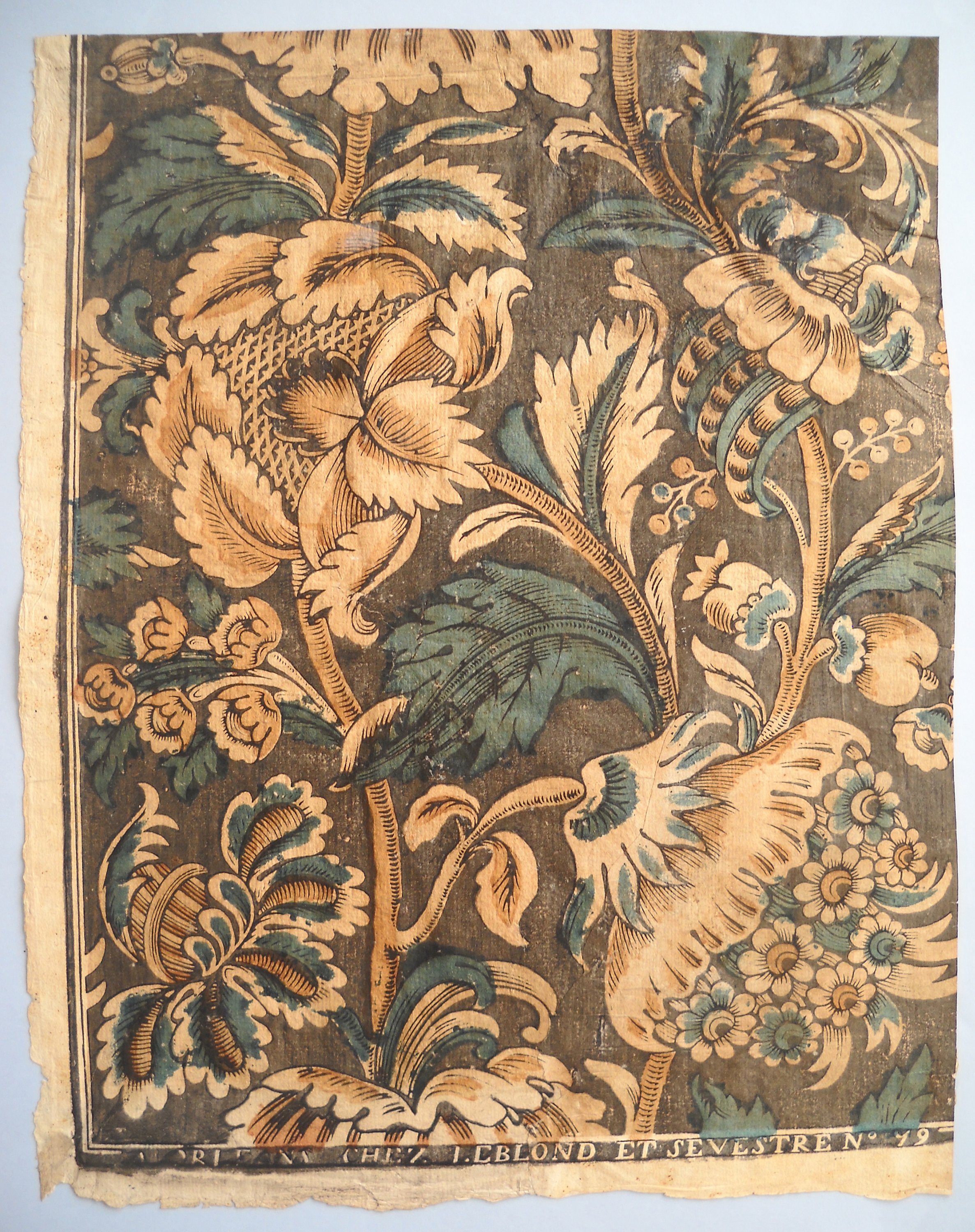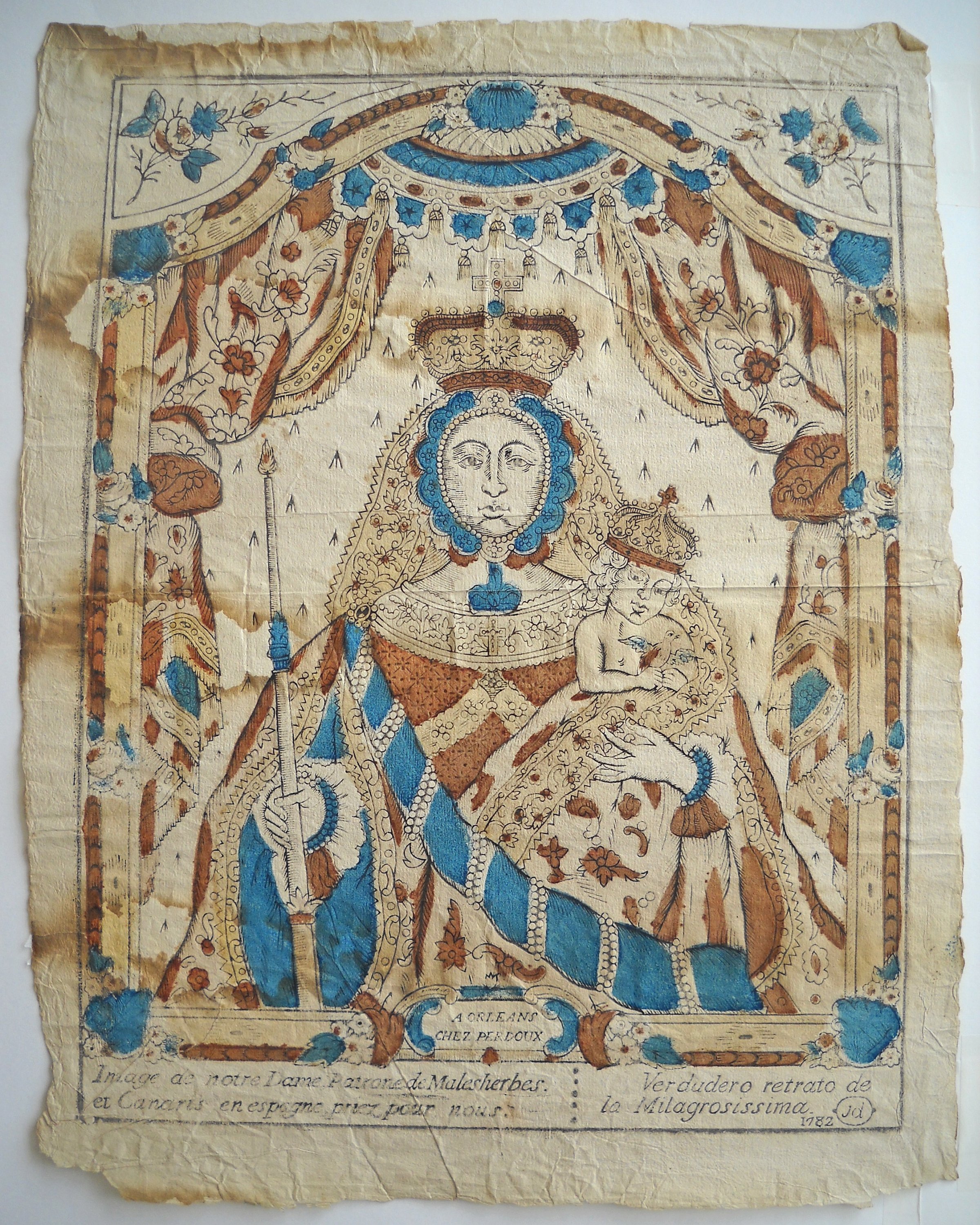 2 épreuves, gravures sur bois, coloris d'époque, sur papier vergé, placées sous passe-partout : [Dominoterie à décor floral] " A ORLEANS CHEZ LEBLOND ET SEVESTRE n°79 ", entre 1751 et 1771, 43 x 33 cm (rest., recollage) - " Image de notre Dame de Malesherbes et Canaris en espagne ", " A ORLEANS CHEZ PERDOUX ", avec légende bilingue en espagnol, daté " 1782 " et monogramme " Jd " pour Jean DUBOCQ graveur sur bois à Orléans ; 48,5 x 38 cm (taches, petite rest., plis). Exemplaire rarissime.