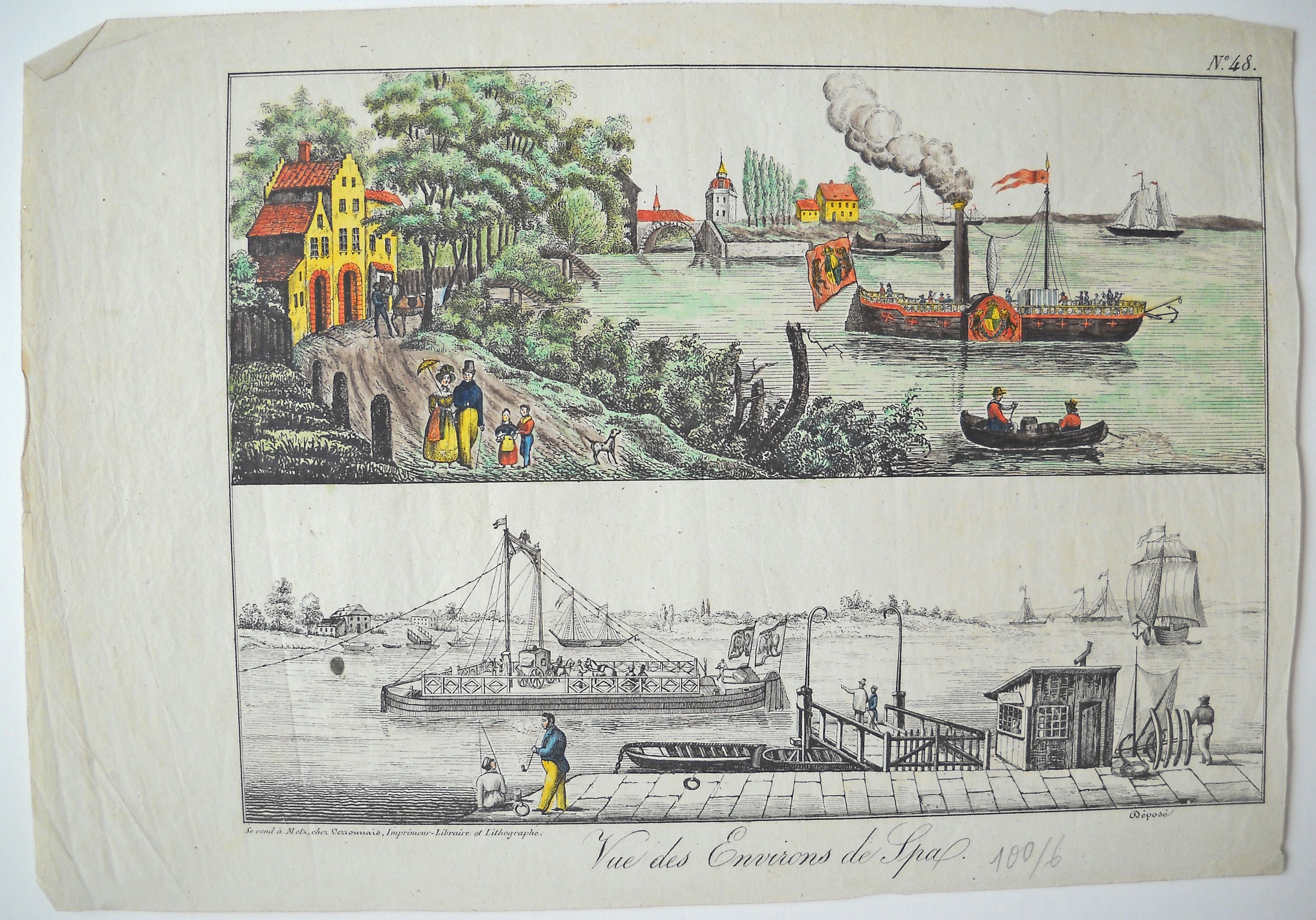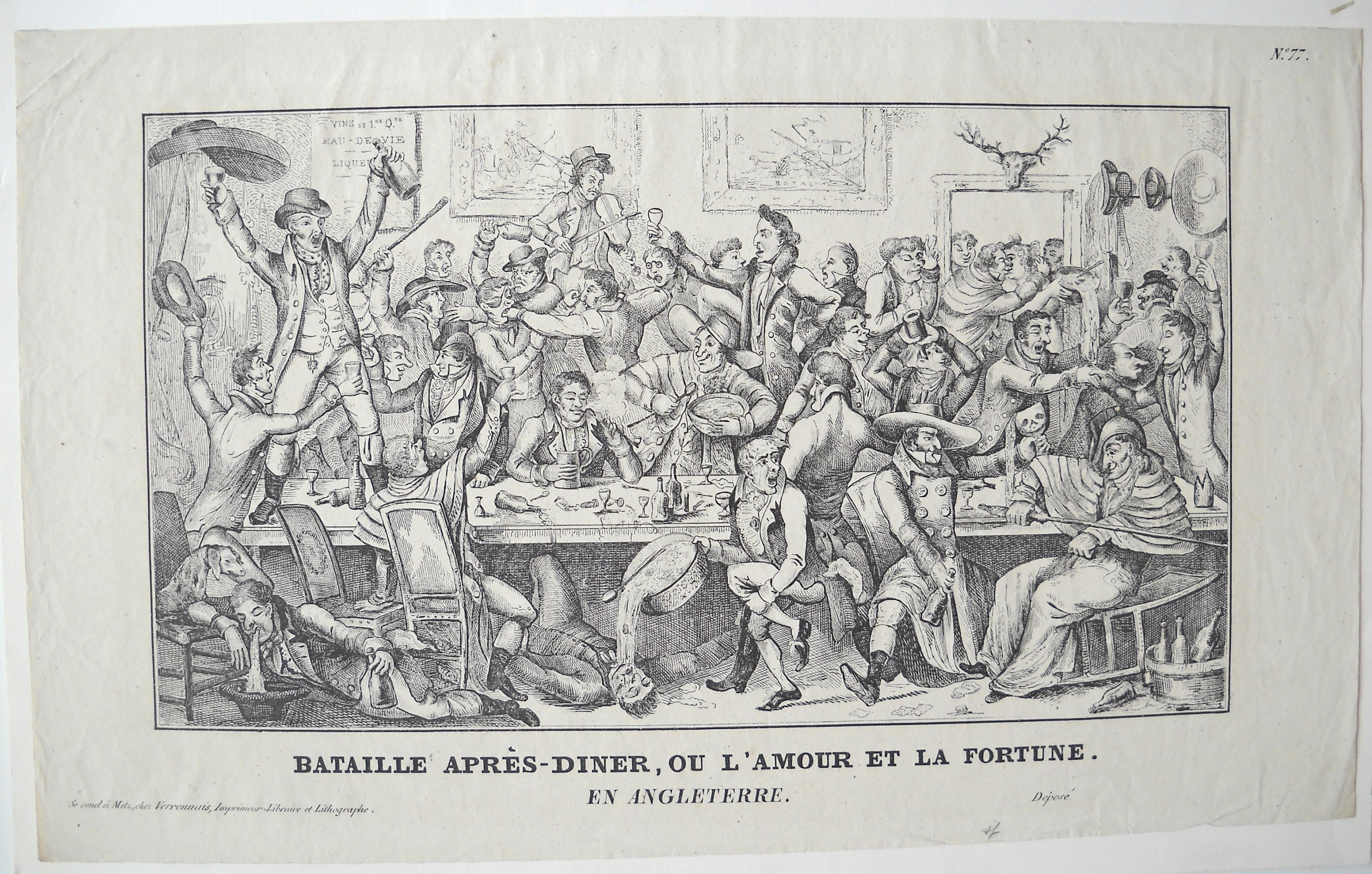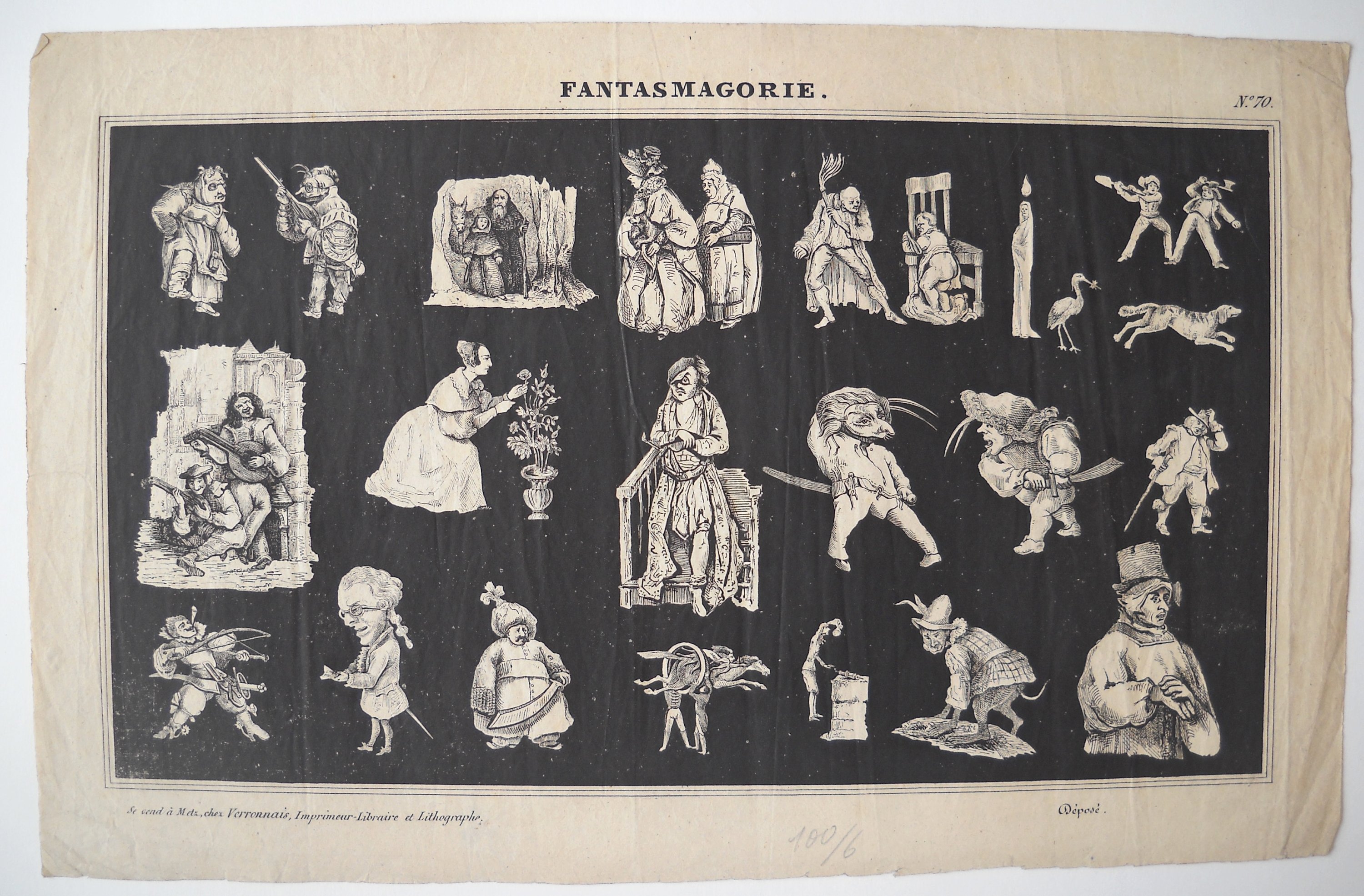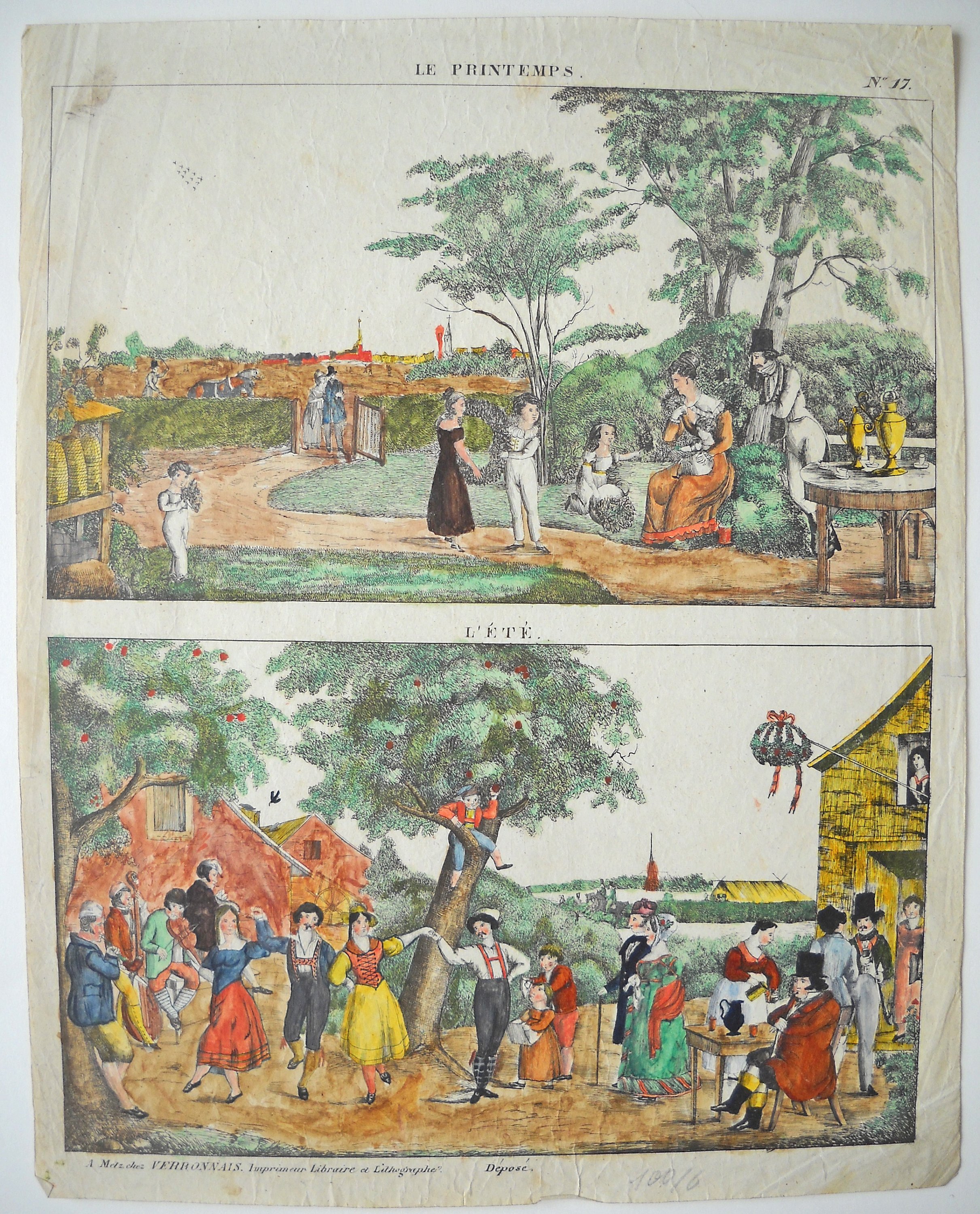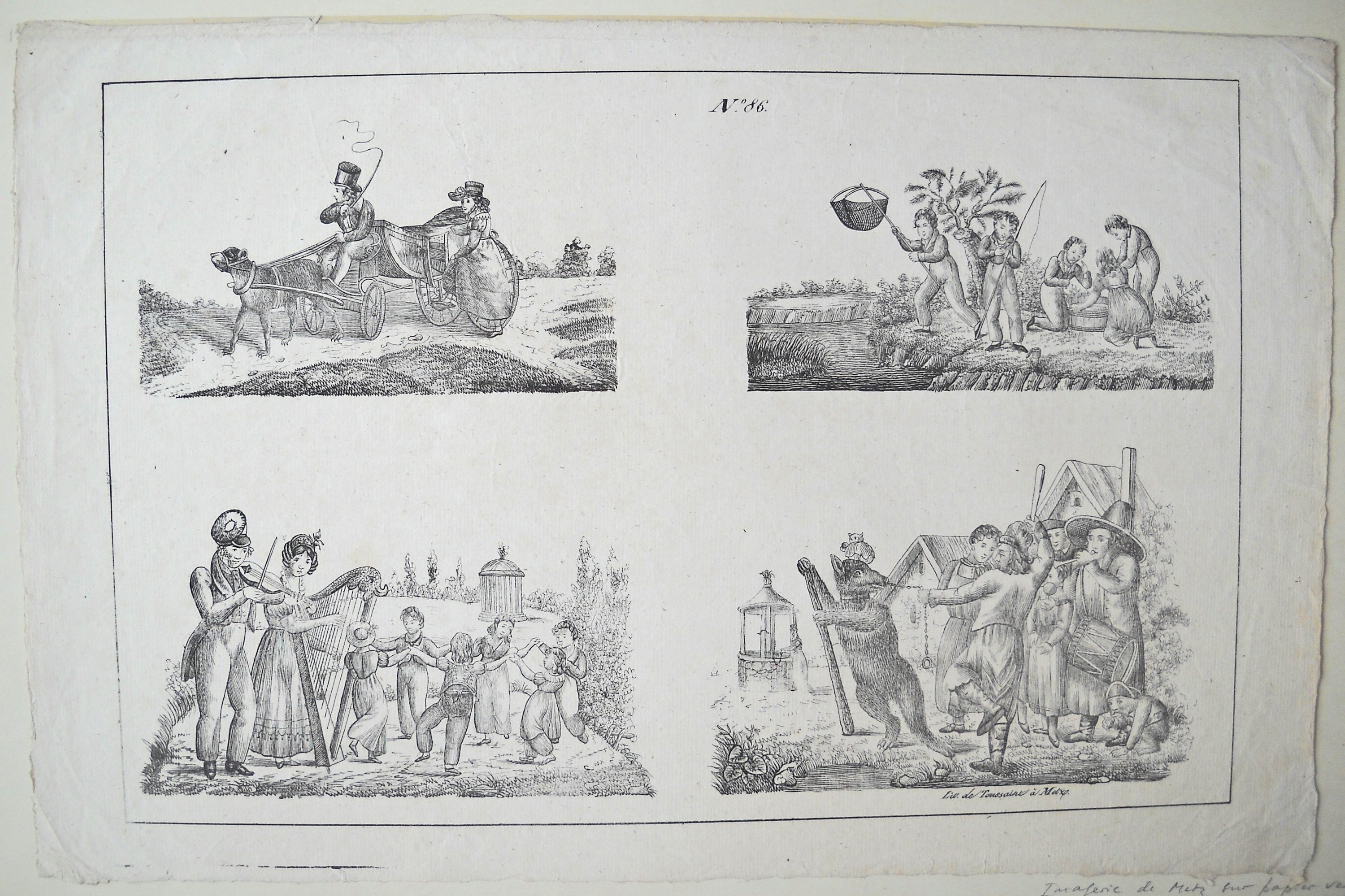8 épreuves, xylographies et lithographies, sur papier vergé ou mince, en noir ou coloris de l'époque, certaines contrecollées sur carton épais : " FANTASMAGORIE ", 27,5 x 43,5 cm - " BATAILLE APRÈS-DINER, OU L'AMOUR ET LA FORTUNE. / EN ANGLETERRE ", 27 x 43 cm - " Vue des Environs de Spa ", 27 x 39,5 cm - " LE PRINTEMPS " et " L'ÉTÉ ", 39 x 30,5 cm - Planche de scénettes " N°21 ", 42,5 x 30,5 cm - " Intérieur d'une Ferme ", 32 x 43 cm - Planche à compartiments (2 x 5) de saintetés, 26,5 x 38 cm - Planche de quatre scénettes " N°86 ", 26,5 x 41 cm.