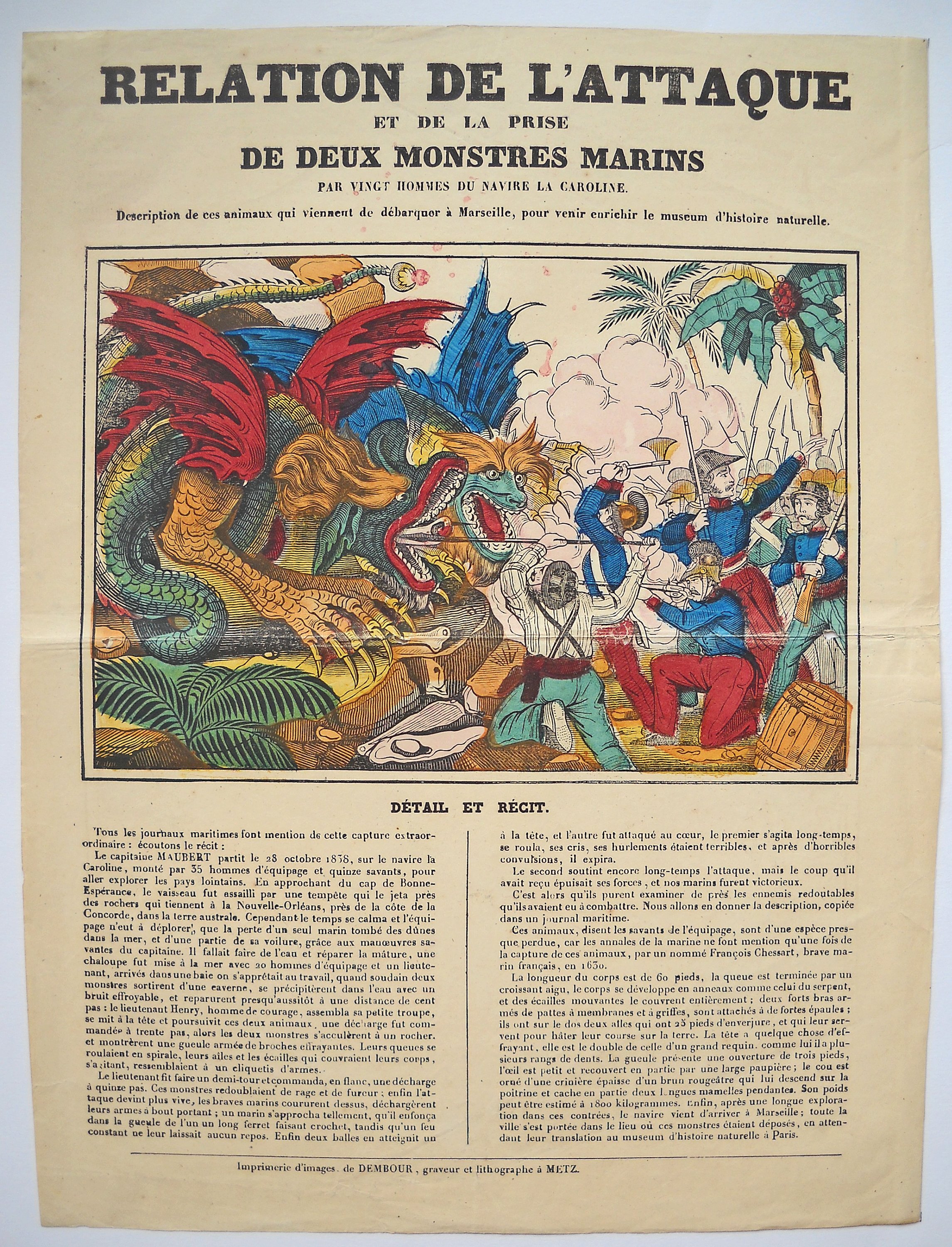 13 épreuves, gravures sur bois, xylographie et lithographie, sur papier vergé ou papier mince, en noir ou coloris de l'époque, certaines placées sous passe-partout ou contrecollées sur carton épais, B à TTB, env. 42 x 28 cm : " RELATION DE L'ATTAQUE ET DE LA PRISE DE DEUX MONSTRES MARINS " - " MORT EPOUVANTABLE D'UN AVARE " - [Cadran d'horloge] (tache, petits déf.) - Planche de militaires : GRENADIERS (taches) - " AVENTURES DE M. MAYEUX " - Planche de saintetés et sujets bibliques (3 x 6) - " CANTIQUE SPIRITUEL / SAINT ALEXIS " (petits déf.) - " SAINT MATHIEU " - " SAINT MARC " - " SAINT LUC, ÉVANGÉLISTE " - " SACRÉ CUR DE MARIE " - " SAINT LUBIN, ÉVÊQUE DE CHARTRES " - " SAINT LAMBERT, ÉVÊQUE DE MAESTRICHT ".