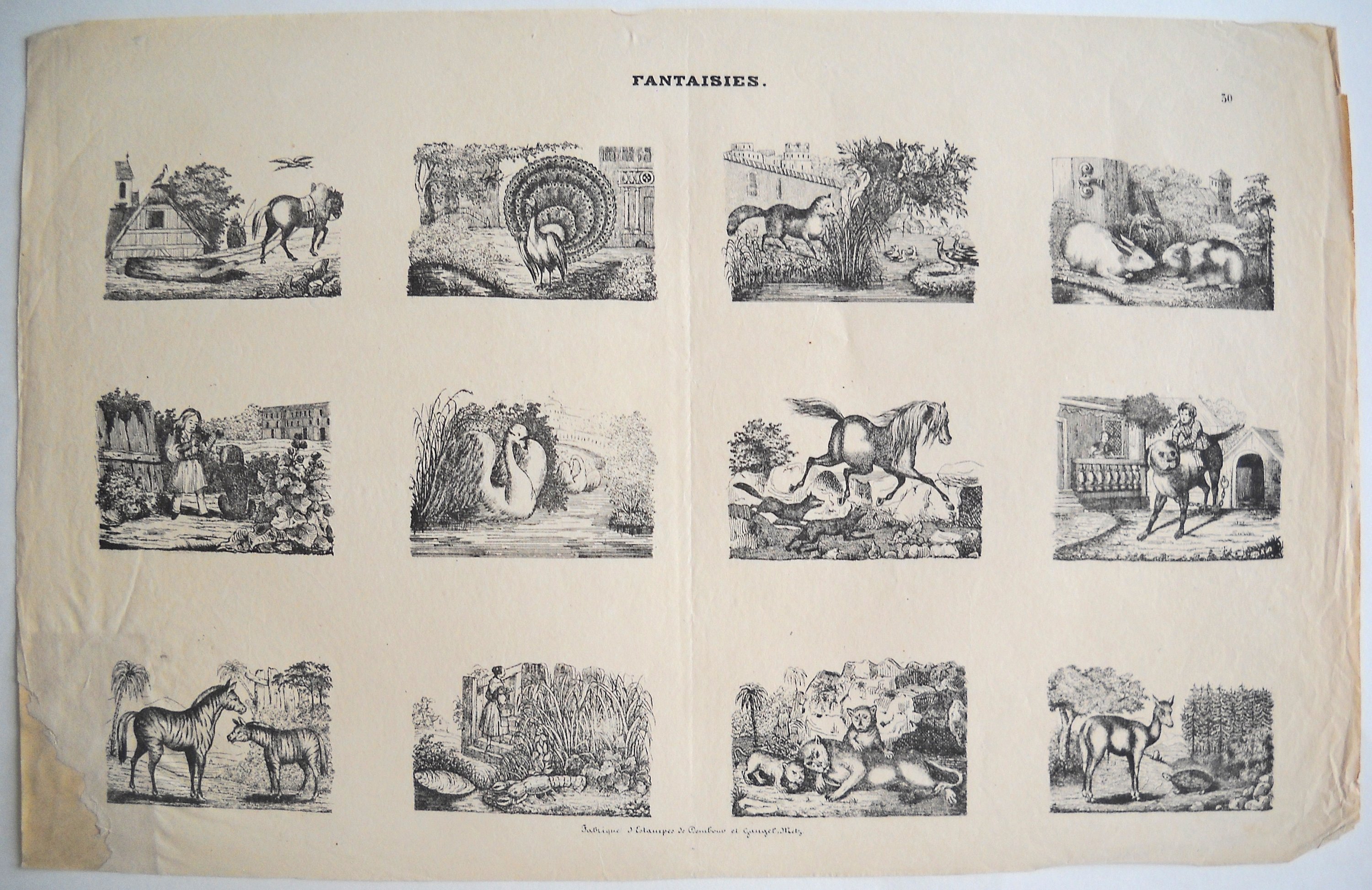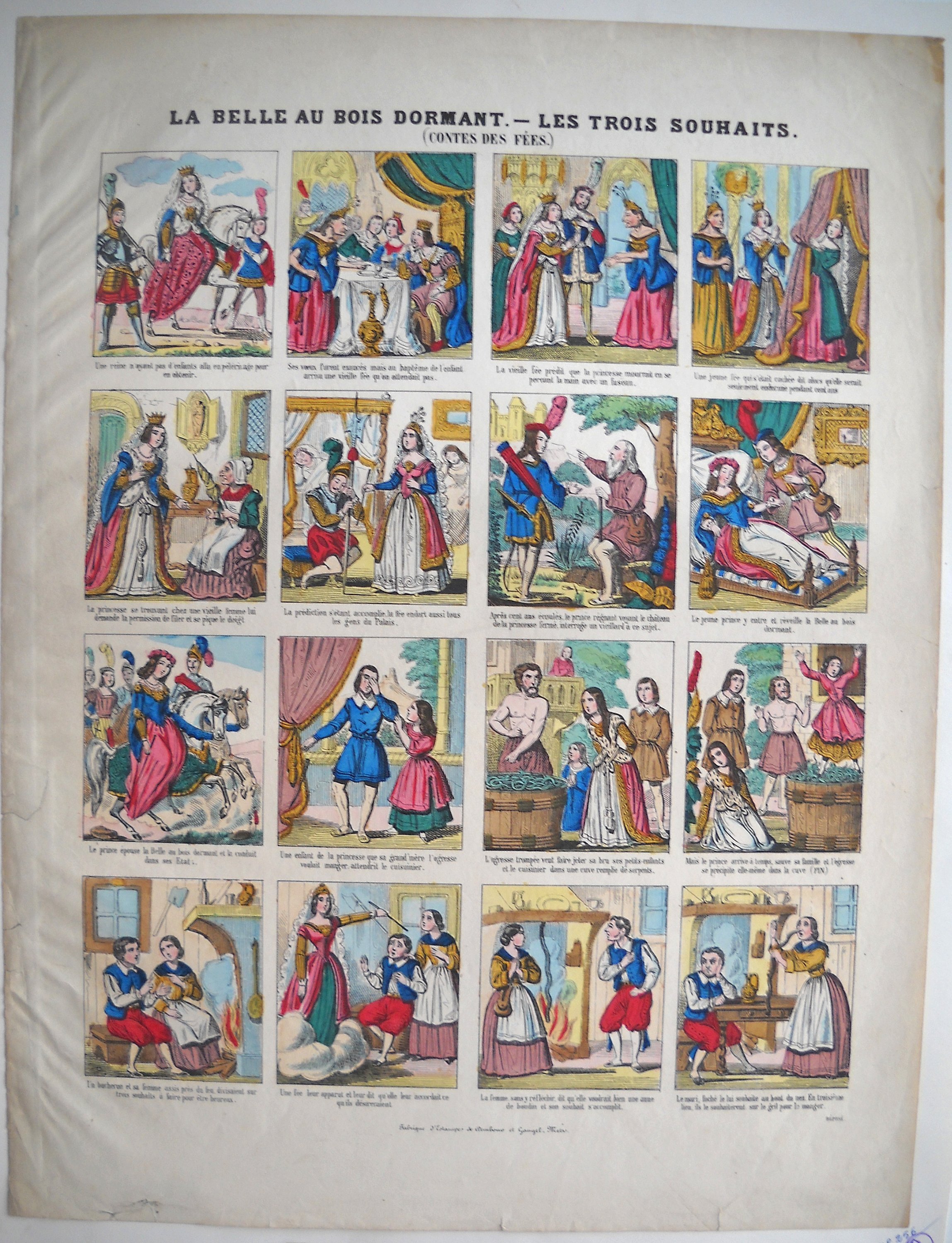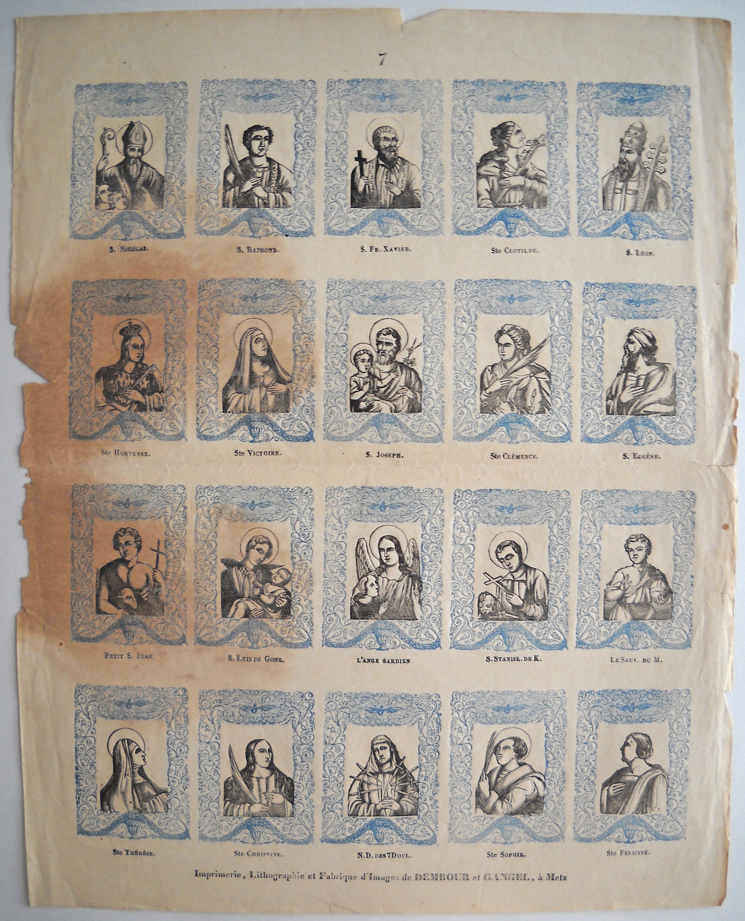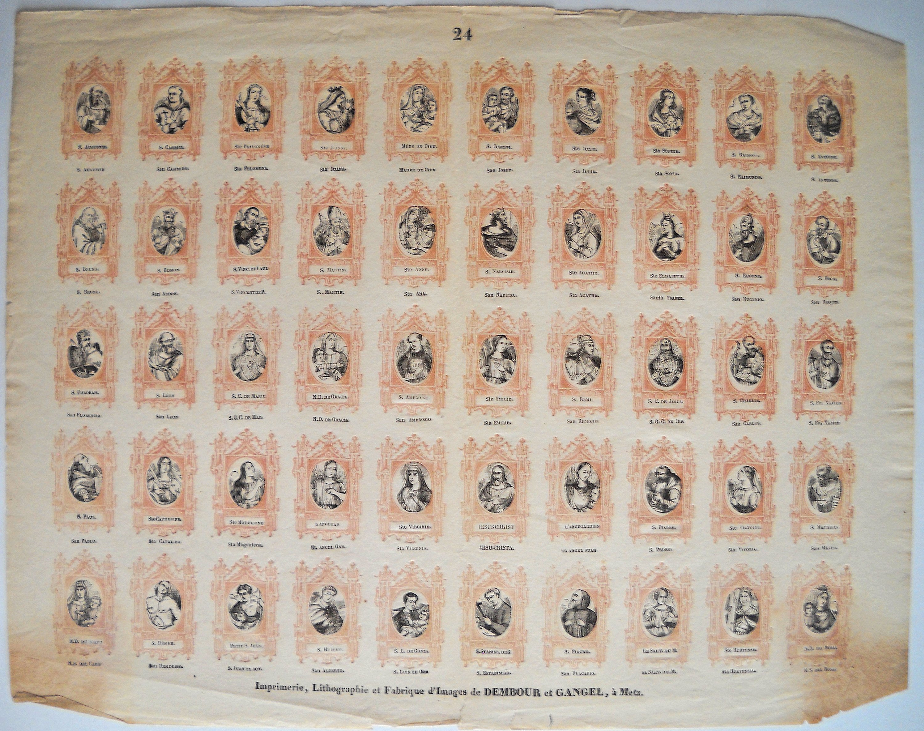 ", 41,5 x 32 cm (petits déf.) - " HISTOIRE D'UN OFFICIER FRANÇAIS EN AFRIQUE ", légende en français/allemand, 27 x 34,5 cm - " LE GRAULLY (LÉGENDE MESSINE) " - " OMBRES CHINOISES, GRAND CARNAVAL DE VENISE " - 8 planches d'historiettes, 45,5 x 34,5 cm, états divers : " LA BELLE AU BOIS DORMANT - LES TROIS SOUHAITS " ; " LE ROBINSON SUISSE " ; " LE PÈRE FOUETTARD " ; " AVANTURES DE M. DE CRAC " ; " HISTOIRE DU NOUVEAU PETIT POUCET " ; " HISTOIRE DE GULLIVER " ; " HISTOIRE DE CHARLES " ; " LES PLAISIRS DE L'HIVER. LES PATINEURS " - 5 planches à découper, env. 44 x 28 cm : les métiers d'hommes ; " Le Renard et les Poules " ; " TRAVESTISSEMENTS " ; " FANTAISIES " ; " MARINE. VAISSEAUX DIVERS " - 8 planches de vignettes de saintetés, env. 42 x 32,5cm (en l'état) - " CANTIQUES SPIRITUELS / SAINTE GERMAINE COUSIN ", 41,5 x 32,5 cm - " JUGEMENT DE Ne Sr JESUS CHRIST ", 28,5 x 38,5 cm (en l'état) - " SAINT ANTOINE " ; " SAINTE CLAIRE " ; " SAINT MARTIN " ; " SAINT JEAN BAPTISTE ", env. 42 x 31 cm - " Se BARBE ", 45 x 31 cm - " Ne De DES LUMIERES " - " Ne De DES SEPT DOULEURS " - 2 planches à compartiments de saintetés (2 x 4 et 3 x 4) --" Se PHILOMÈNE ".