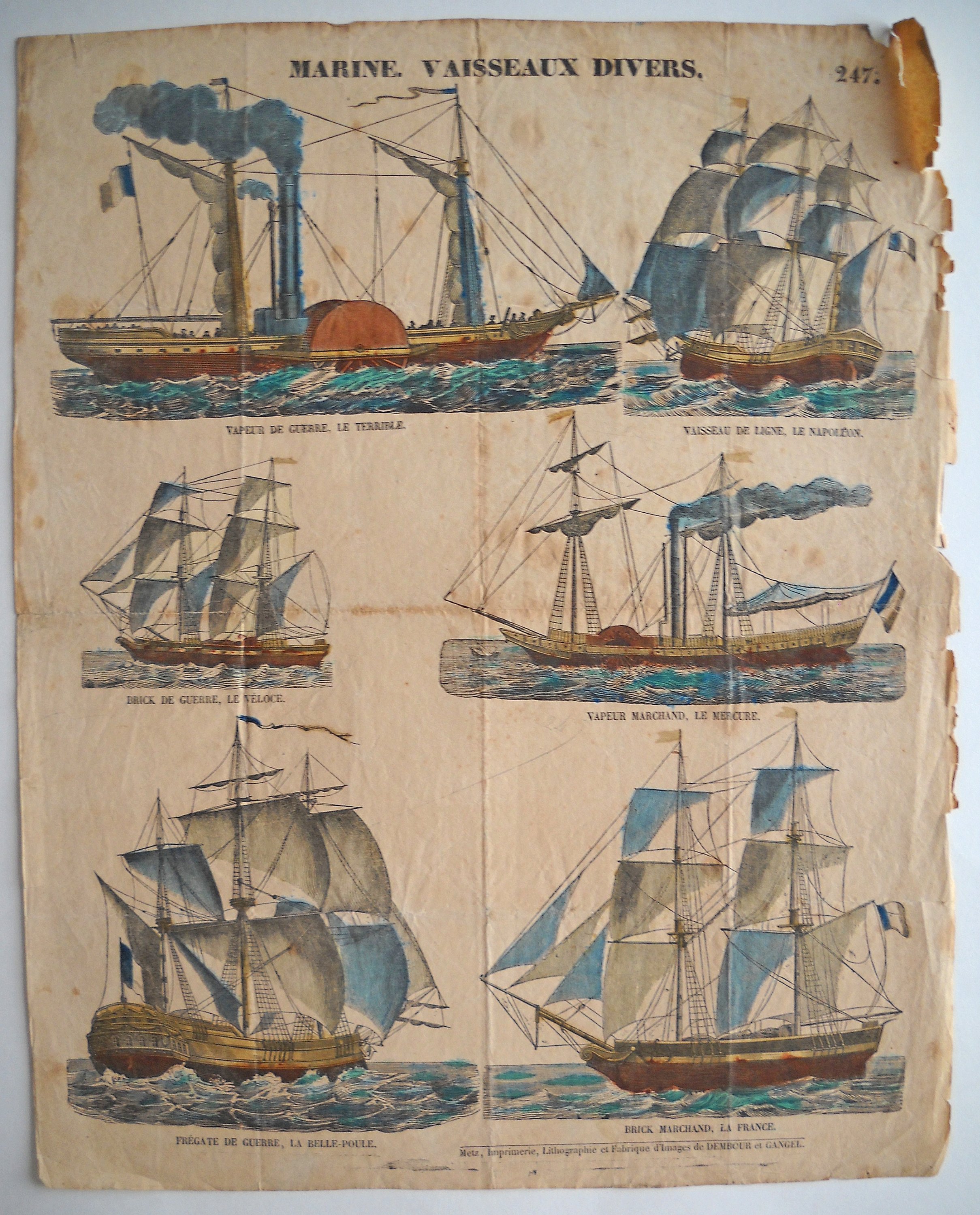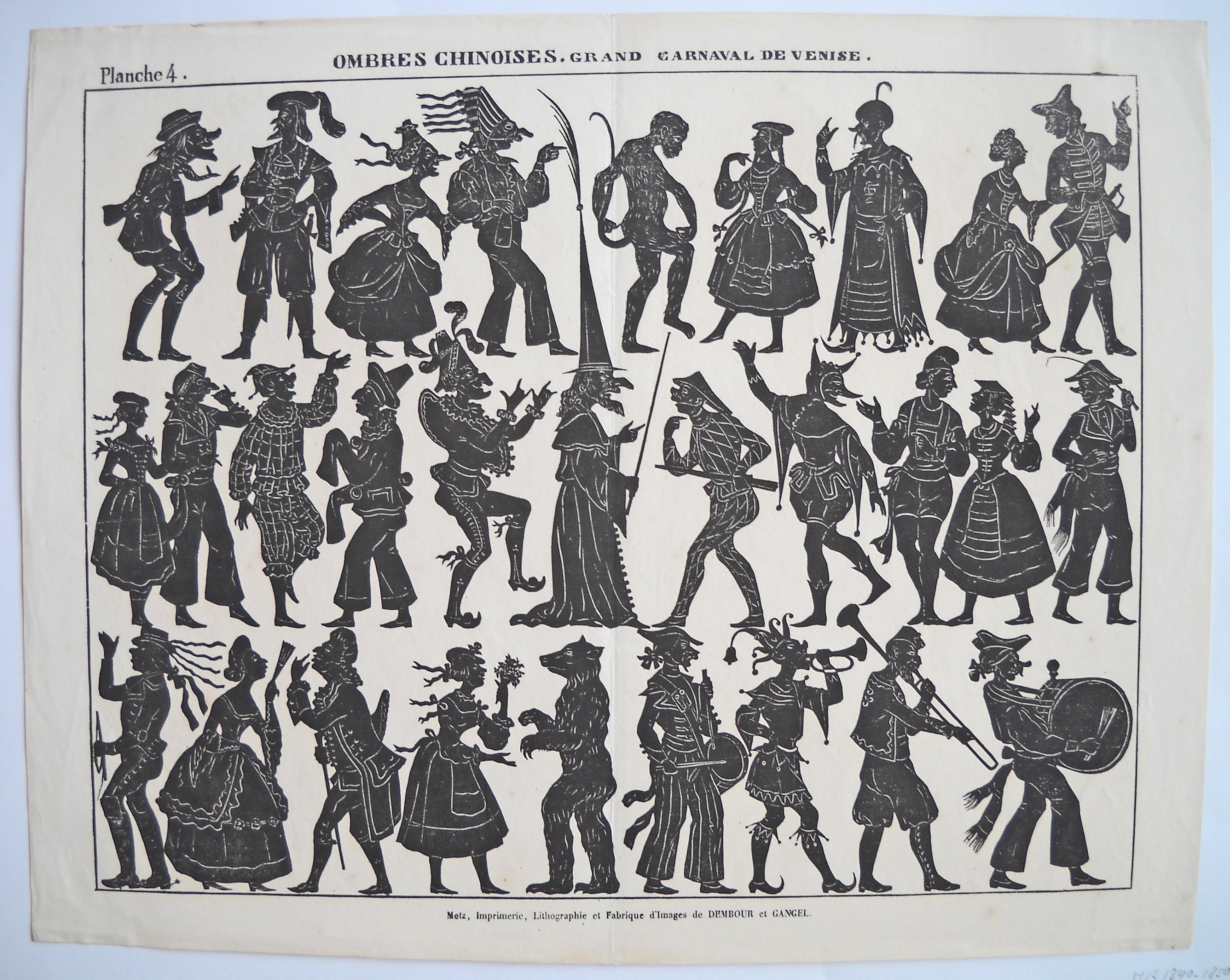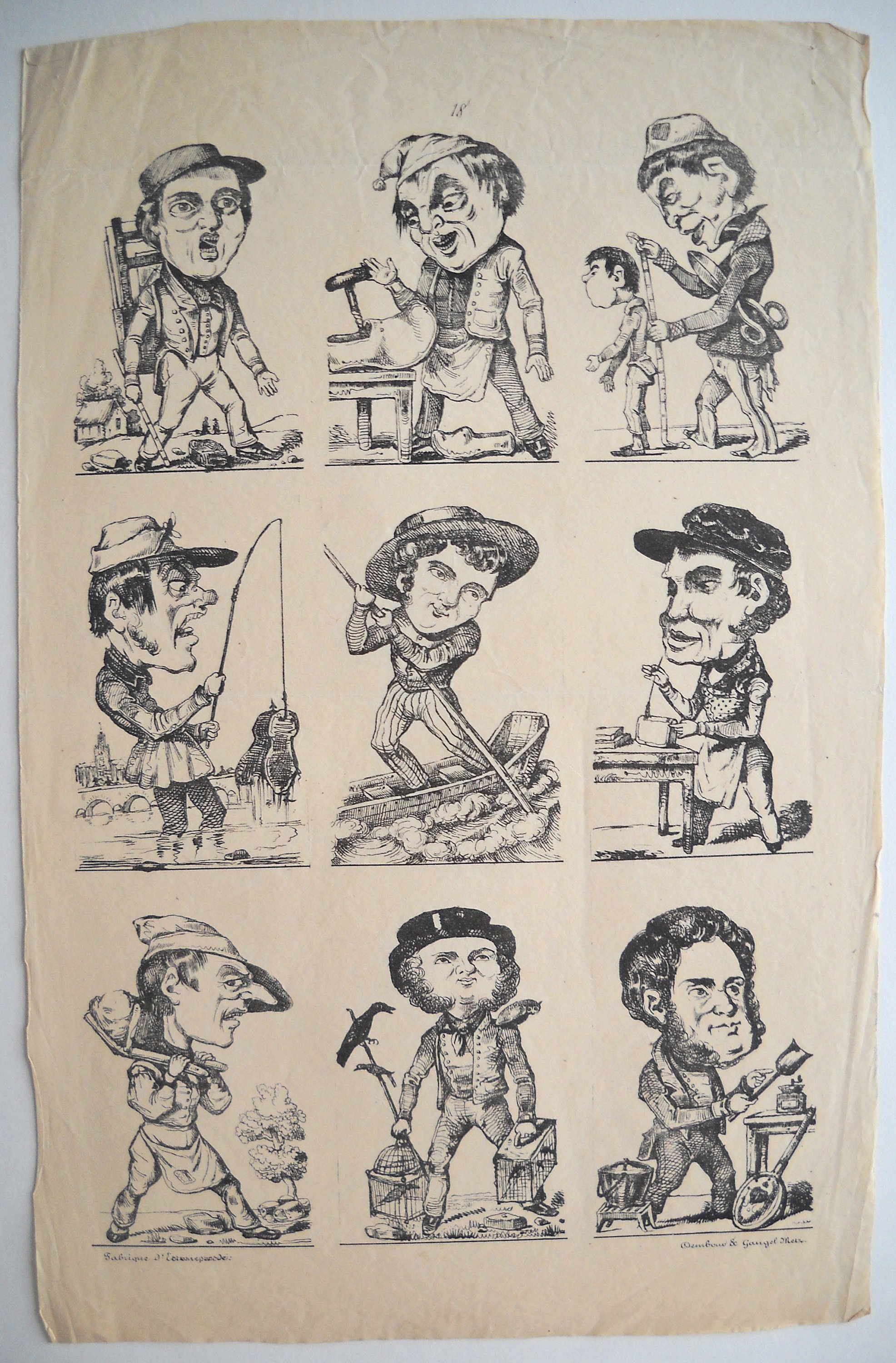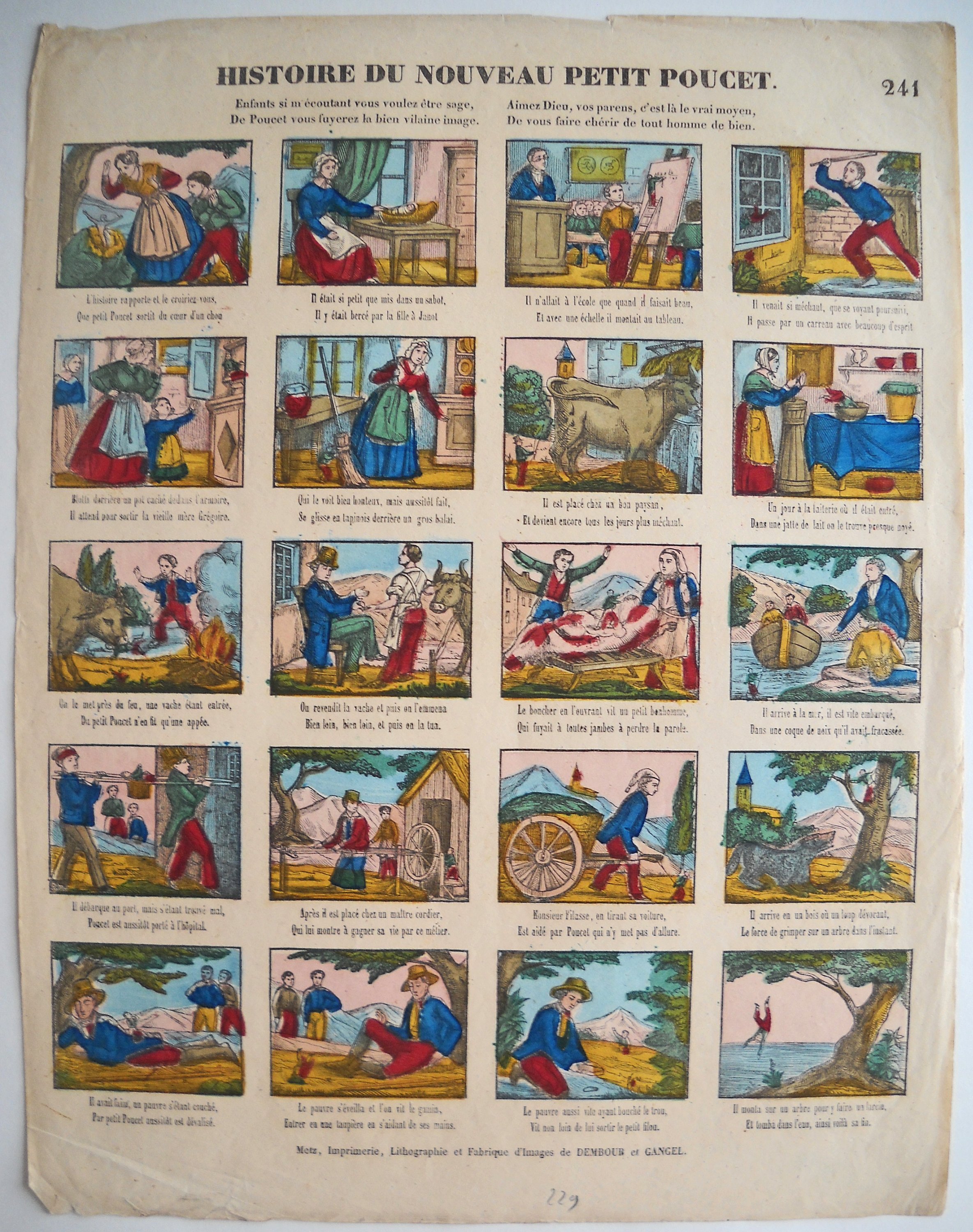", 41,5 x 32 cm (petits déf.) - " HISTOIRE D'UN OFFICIER FRANÇAIS EN AFRIQUE ", légende en français/allemand, 27 x 34,5 cm - " LE GRAULLY (LÉGENDE MESSINE) " - " OMBRES CHINOISES, GRAND CARNAVAL DE VENISE " - 8 planches d'historiettes, 45,5 x 34,5 cm, états divers : " LA BELLE AU BOIS DORMANT - LES TROIS SOUHAITS " ; " LE ROBINSON SUISSE " ; " LE PÈRE FOUETTARD " ; " AVANTURES DE M. DE CRAC " ; " HISTOIRE DU NOUVEAU PETIT POUCET " ; " HISTOIRE DE GULLIVER " ; " HISTOIRE DE CHARLES " ; " LES PLAISIRS DE L'HIVER. LES PATINEURS " - 5 planches à découper, env. 44 x 28 cm : les métiers d'hommes ; " Le Renard et les Poules " ; " TRAVESTISSEMENTS " ; " FANTAISIES " ; " MARINE. VAISSEAUX DIVERS " - 8 planches de vignettes de saintetés, env. 42 x 32,5cm (en l'état) - " CANTIQUES SPIRITUELS / SAINTE GERMAINE COUSIN ", 41,5 x 32,5 cm - " JUGEMENT DE Ne Sr JESUS CHRIST ", 28,5 x 38,5 cm (en l'état) - " SAINT ANTOINE " ; " SAINTE CLAIRE " ; " SAINT MARTIN " ; " SAINT JEAN BAPTISTE ", env. 42 x 31 cm - " Se BARBE ", 45 x 31 cm - " Ne De DES LUMIERES " - " Ne De DES SEPT DOULEURS " - 2 planches à compartiments de saintetés (2 x 4 et 3 x 4) --" Se PHILOMÈNE ".
