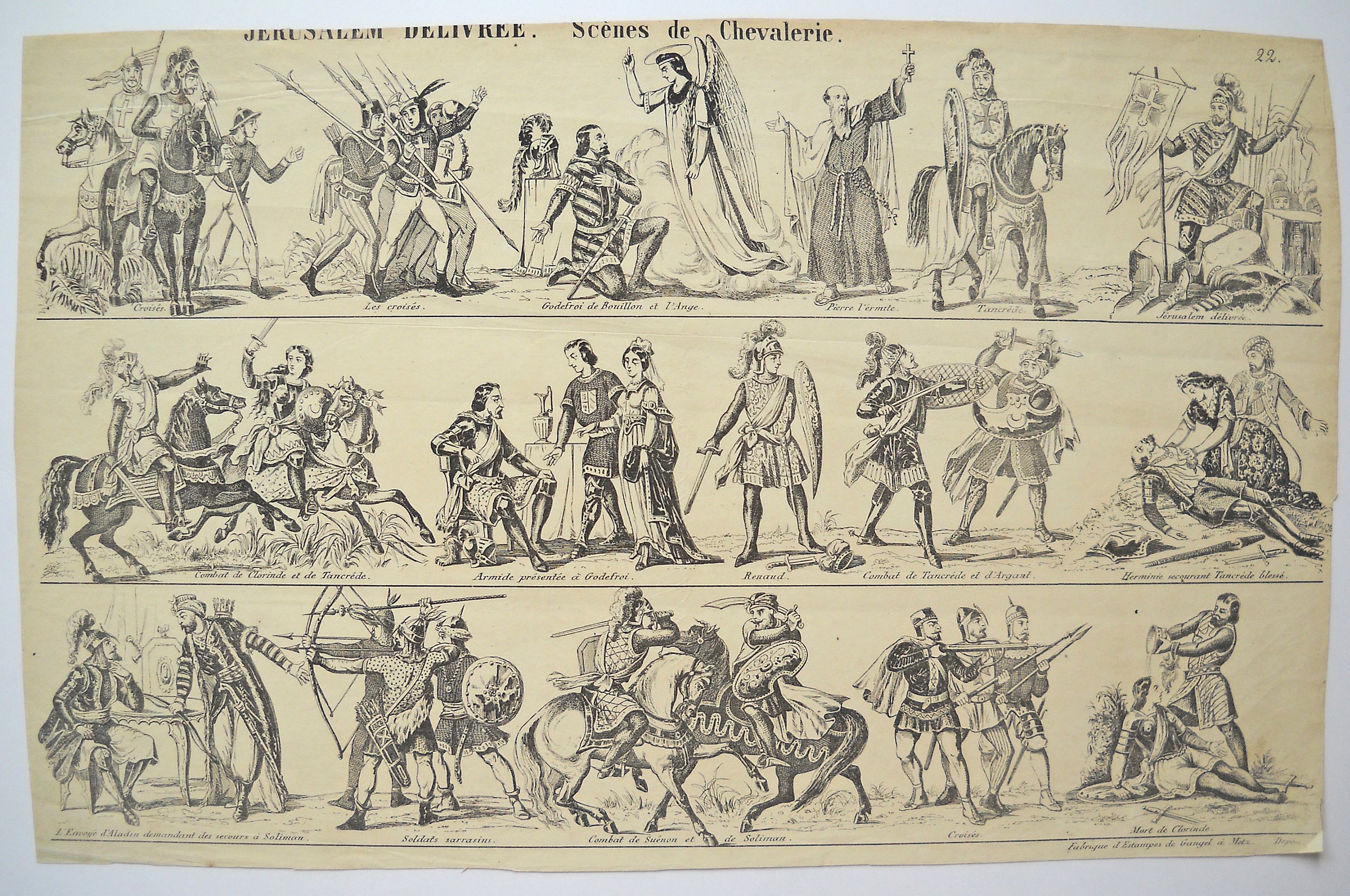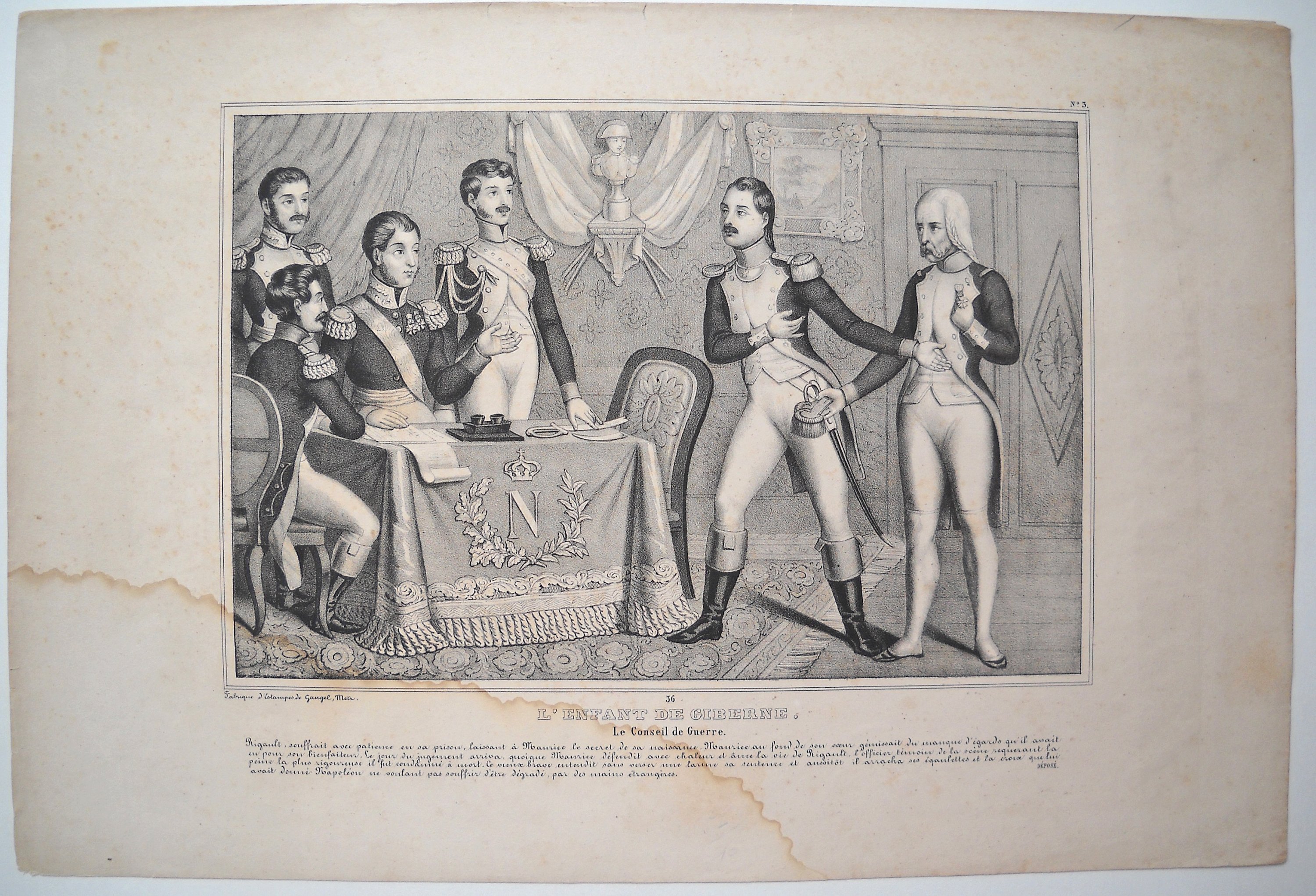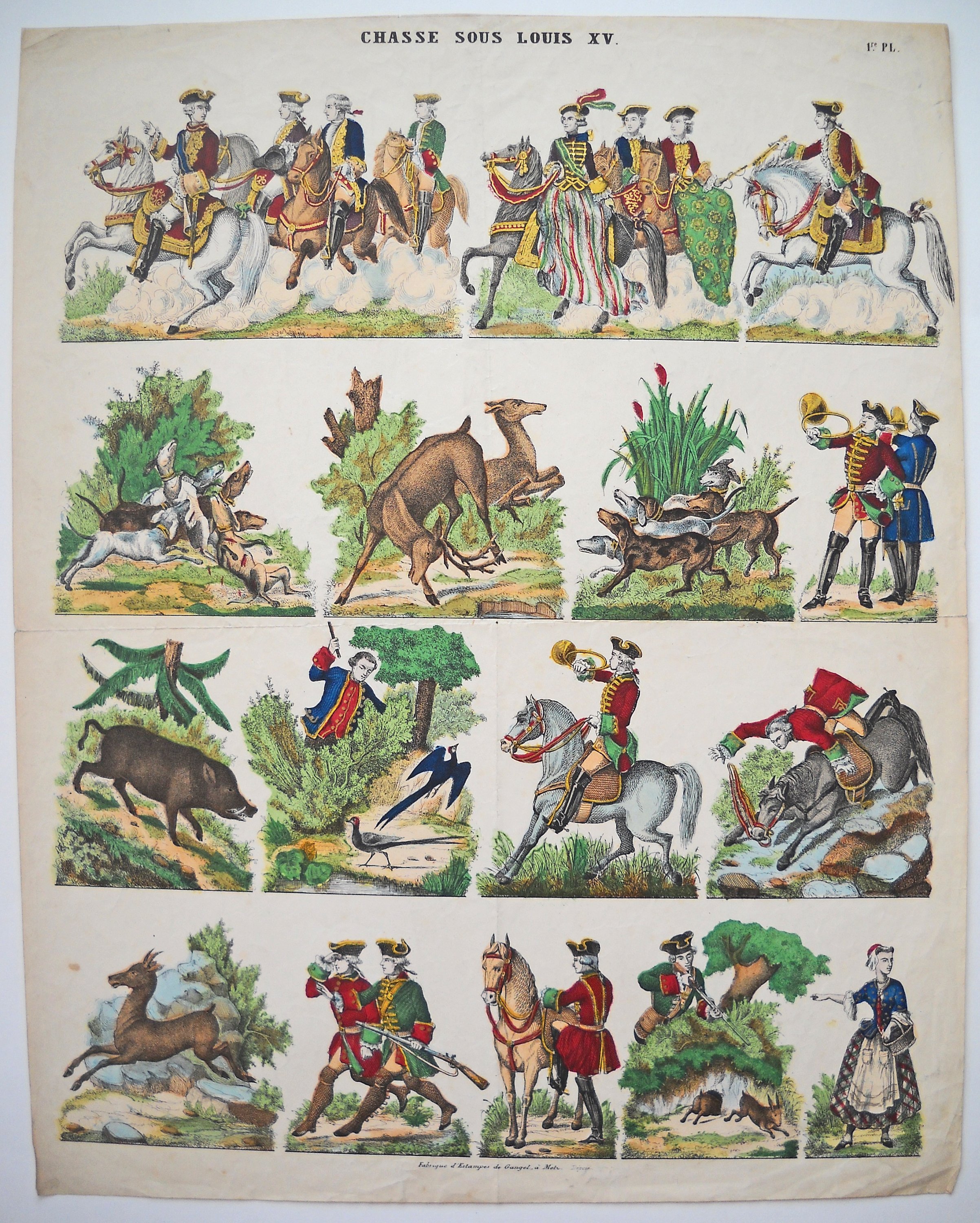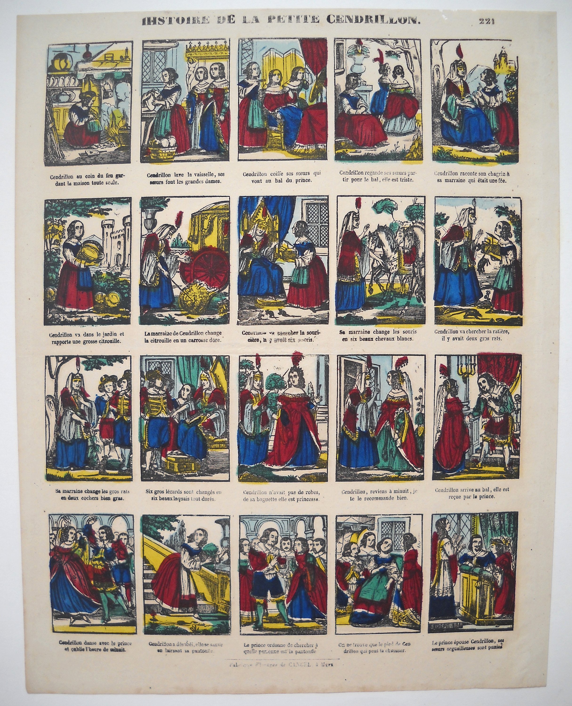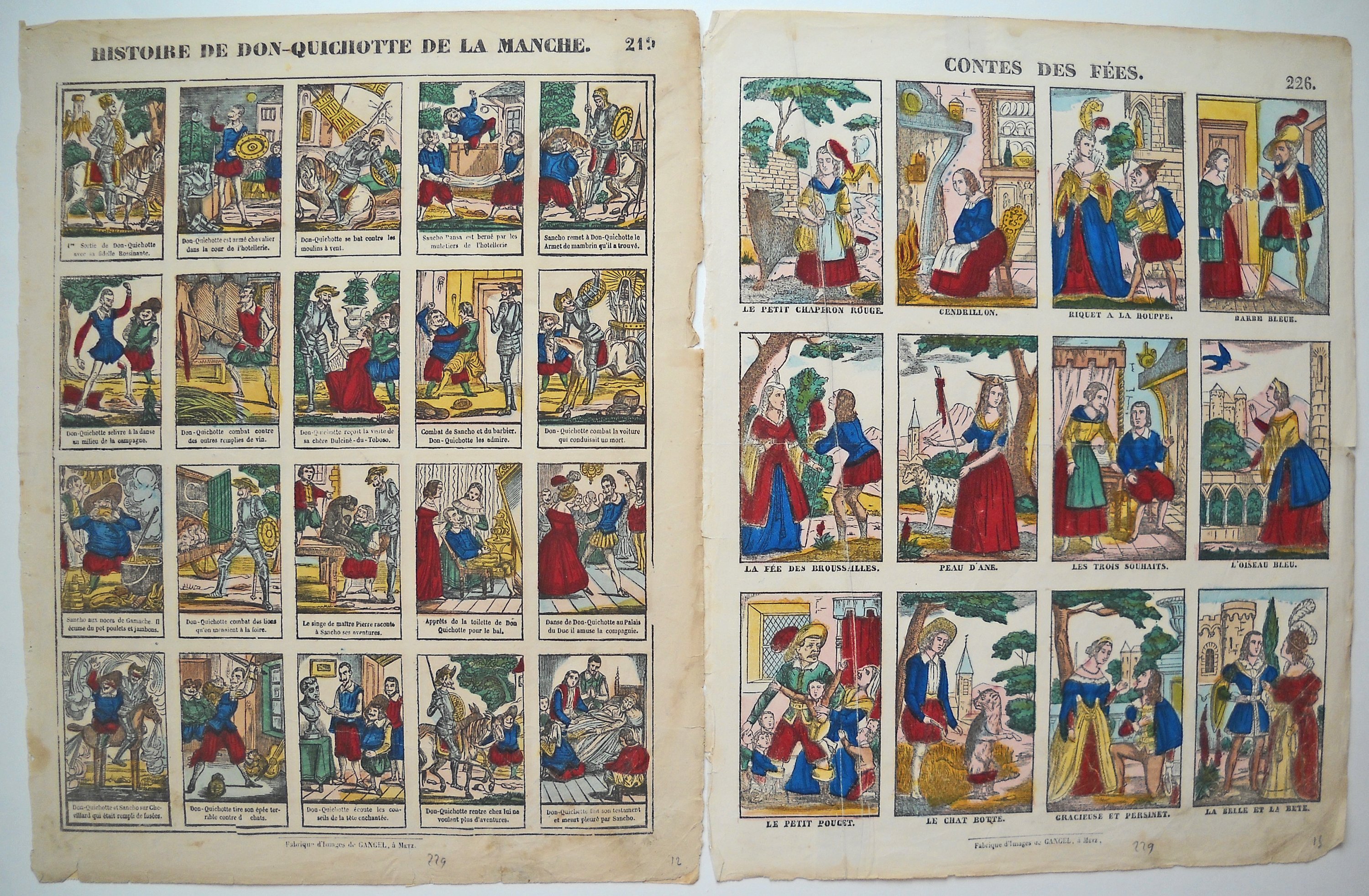 68 épreuves, gravures sur bois, xylographies et lithographies, sur papier mince, en noir ou coloris de l'époque, certaines placées sous passe-partout ou contrecollées sur carton épais, états moyen à TTB : env. 41 x 61 cm : " BATAILLE DE FLEURUS / REMPORTÉE EN 1794, CONTRE LES AUTRICHIENS " ; " LES QUATRE VERITES DU SIECLE " ; " PYRAME ET THISBÉ " ; " HISTOIRE DE DAMON ET HENRIETTE " - 2 ex. " LE JUIF-ERRANT ", 42 x 32 cm - 2 ex. " LES TAILLEURS ALLEMANDS ", 32,5 x 41 cm - Env. 41 x 32 cm et inverse : " OMBRES CHINOISES, LA TENTATION DE St ANTOINE " ; " ADELAIDE ET FERDINAND / OU LES TROIS ANNEAUX " ; 2 ex. " DAMON ET HENRIETTE " ; CADRAN D'HORLOGE ; 4 portraits de femmes : " L'HIVER ", " L'EUROPE ", " CAROLINE ", " ADÈLE " ; 2 ex. " JERUSALEM DELIVREE. Scènes de chevaleries " ; " VAISSEAUX DE LA MARINE FRANCAISE " ; " MARIAGE de HENRI IV " ; " LE PLAISIR DE L'EUROPE " ; 4 ex. de la série " L'ENFANT DE GIBERNE " - " CONTES DES FÉES " ; " CARICATURES " ; " FAMILLE DE JEAN " ; 2 ex. " PERSONNAGES DE THÉÂTRE " ; " SCÈNES VILLAGEOISES " ; 2 ex. " COSTUMES DIVERS " - env. 46 x 35,5 cm et inverse : " COSTUMES DE THÉÂTRE " ; " CHASSE SOUS LOUIS XV " ; 2 ex. " PAYSAGES " ; " HEUR ET MALHEUR DE LA CRINOLINE " ; " LES ÉTRANGERS A L'EXPOSITION UNIVERSELLE " ; " SOUVENIRS DROLATIQUES, HISTORIQUES DE L'EXPOSITION UNIVERSELLE " ; " FINETTE OU L'ADROITE PRINCESSE " ; - 22 planches d'historiettes, env. 42 x 32 cm et inverse : " TERRIBLES AVENTURES DE BABYLES-MACHIN " ; " TABLEAU PHYSIONOMISTE DES DOUZE ARRONDISSEMENTS DE PARIS " ; 2 ex. " HISTOIRE DE DAMON ET HENRIETTE " ; " LES AMOURS MALHEUREUSES / DE PIERRE GUIGNOLET ET DE FIFINE MISTANFLUTE " ; " LA BOUCHERIE LIBRE et ses agréments " ; " CADET ROUSSELLE " ; " HISTOIRE DE PEAU D'ANE " ; " LES POSITIONS DELICATES ET DESAGREABLES " ; FLORISE, conte de Fénélon " ; " L'OISEAU BLEU " ; " LE BOSSU " ; " LE MONDE RENVERSÉ " ; " LA CHINE AU XIXe SIÈCLE " ; " HISTOIRE DE LA PETITE DESOBEISSANTE " ; " HISTOIRE DU PETIT DESOBEISSANT " ; " HISTOIRE DE DON-QUICHOTTE DE LA MANCHE " ; " HISTOIRE DE LA PETITE CENDRILLON " ; " JULIETTE " ; " HISTOIRE TRAGIQUE DE TOUCHE-A-TOUT " ; " LE SIRE DE CRAMOISY " ; " RECREATIONS DE L'ENFANCE " ; " FABLE DE FLORIAN " - 3 planches de rébus.
