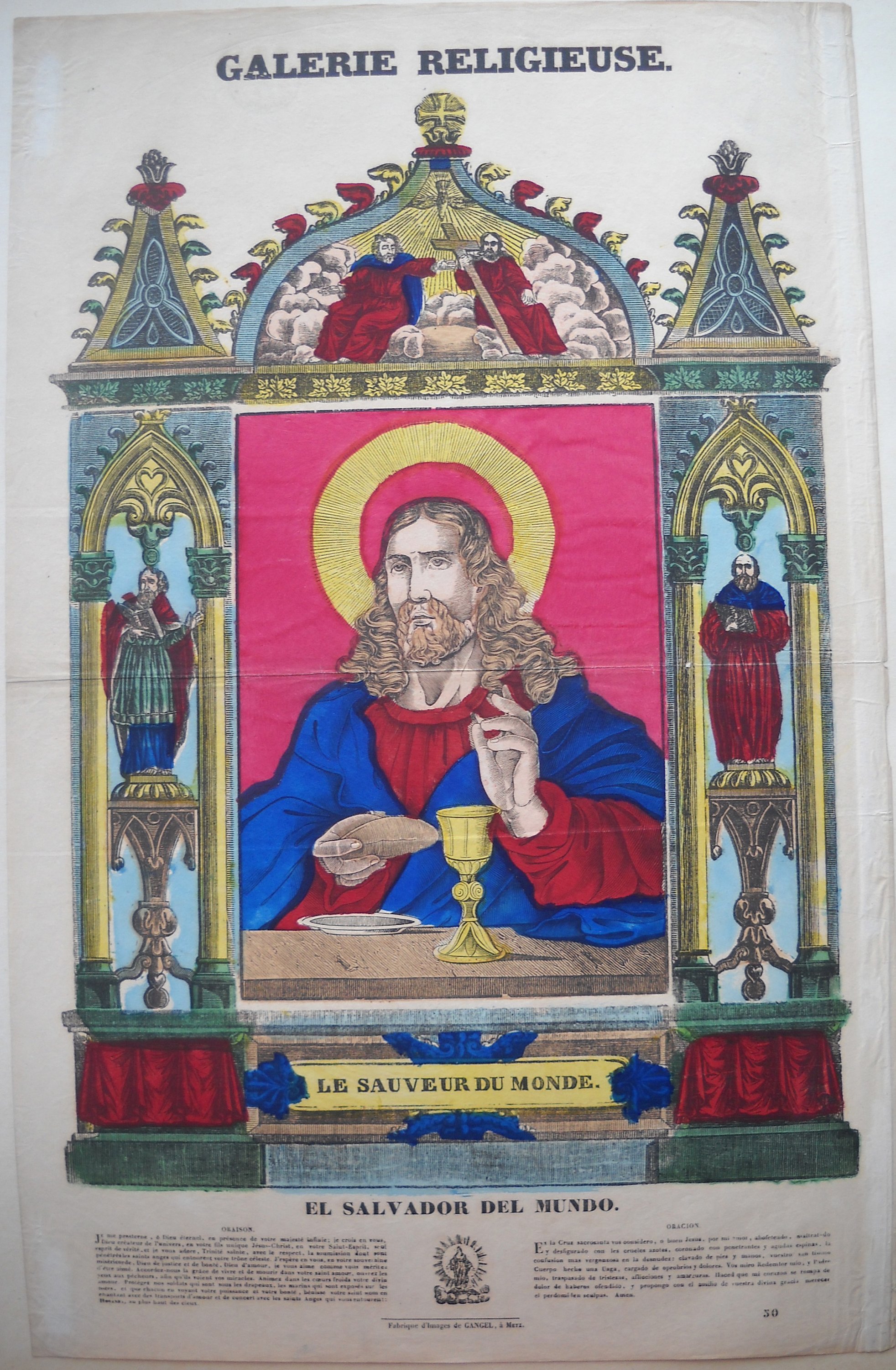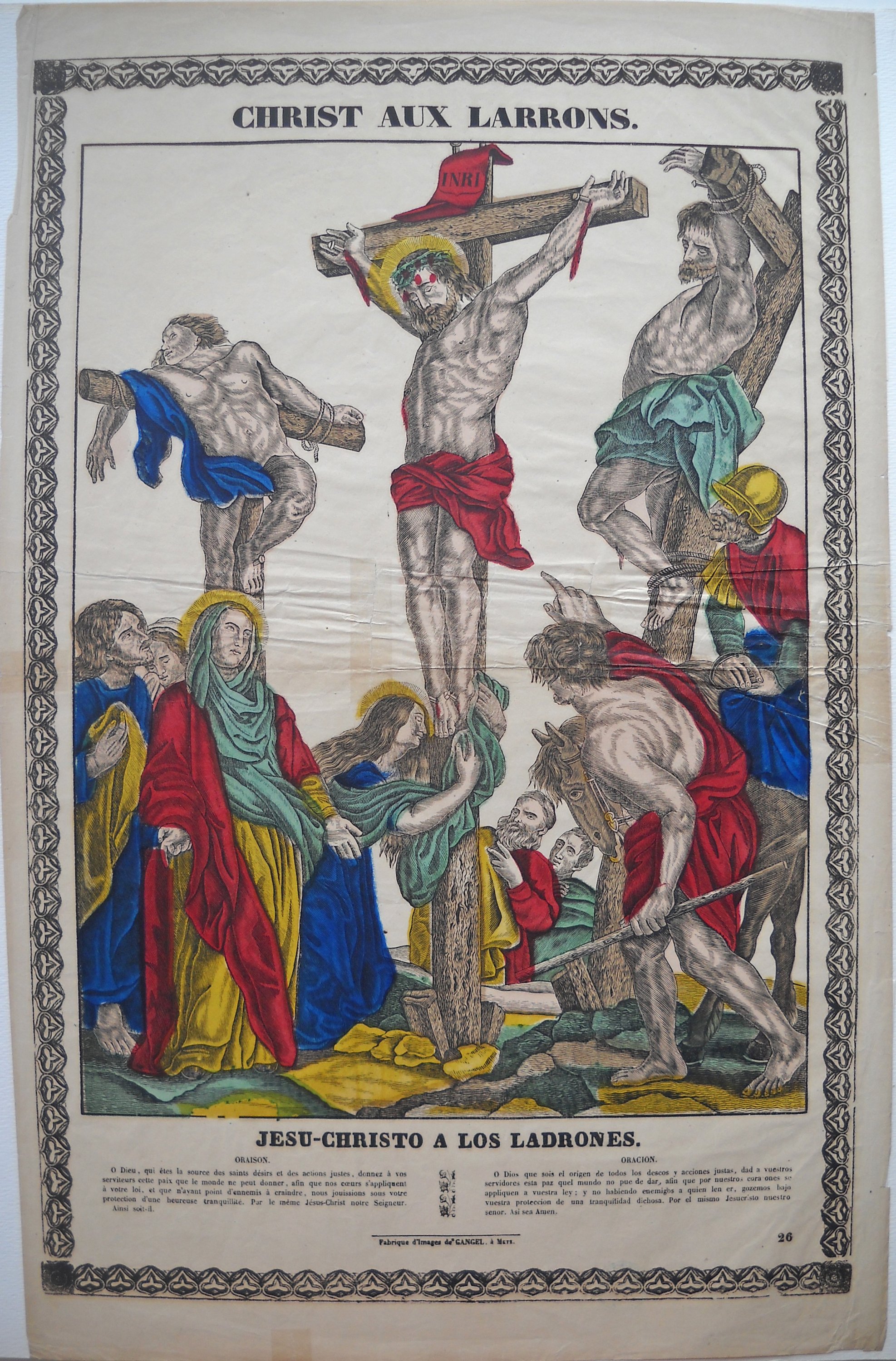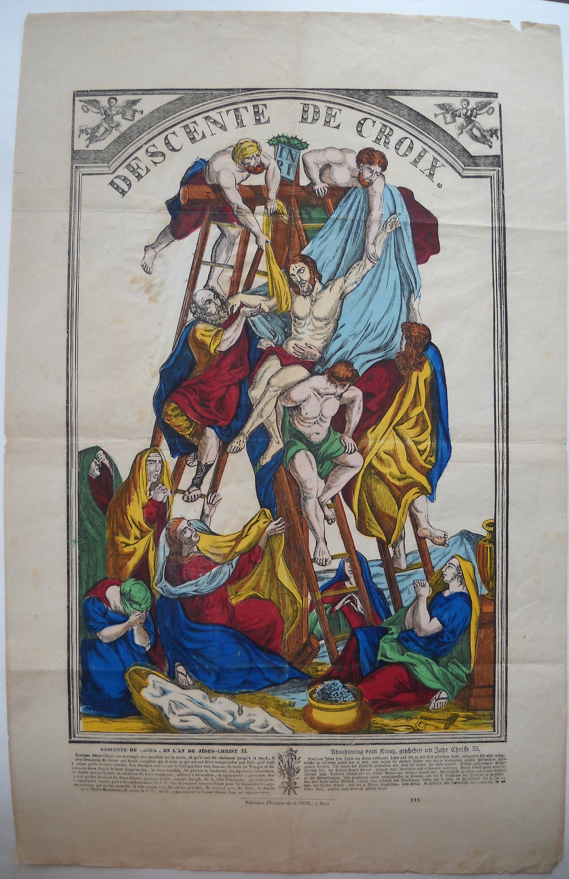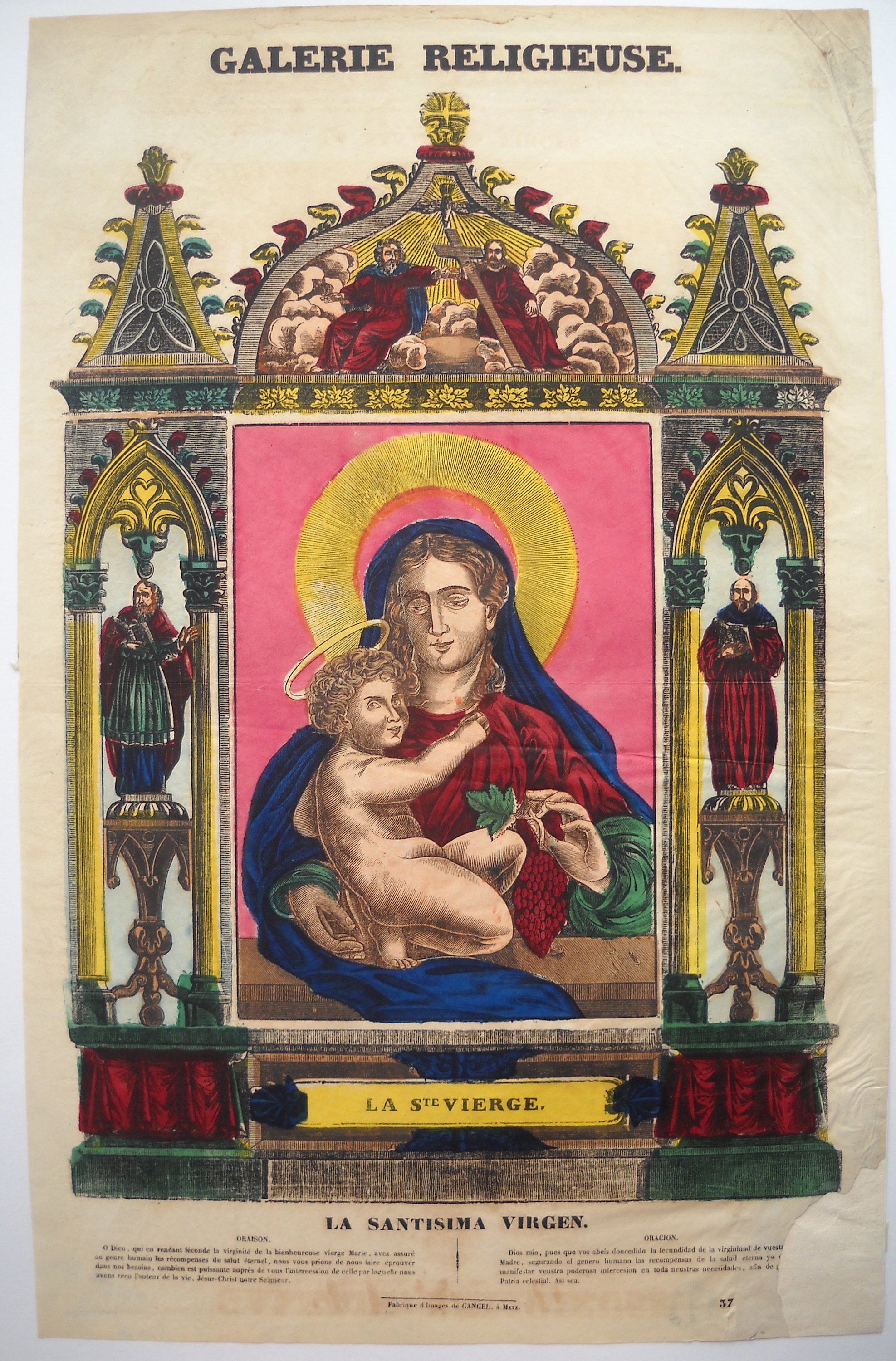 Exceptionnel lot de 72 épreuves, xylographies et lithographies, sur papier vergé ou mince, en majorité rehaussées aux coloris de l'époque, certaines double légende français/espagnol ou français/allemand, la plupart contrecollées sur carton épais ou placées sous passe-partout, env. 63 x 40 cm et inverse, états B à TTB : " L'ENFER - Tourments des damnés " ; " JESUS SUR LE CALVAIRE " ; " LA MORT DU JUSTE " ; " CHRIST AUX EVANGELISTES " ; " DESCENTE DE CROIX " ; 2 ex. " INSTITUTION DE LA CENE " ; " JUGEMENT ET CONDAMNATION DE JESUS " ; " CHRIST AUX LARRONS " ; " JESUS BENISSANT LES ENFANTS " ; " LE SAUVEUR DU MONDE " ; " HEUREUSE BENEDICTION DES MAISONS ET DES FAMILLES " ; " L'ENFANT PRODIGUE " ; 2 ex. " PROCESSION DE LA FÊTE DIEU " ; " L'ENFANT PRODIGUE " ; " L'ADORATION DES BERGERS " ; 3 ex. " L'ADORATION DES ROIS " ; " MARIAGE DE LA STE VIERGE AVEC ST JOSEPH " ; " JOSEPH / EXPLIQUANT LES SONGES DE PHARAON " ; " SAINT JOSEPH EPOUX DE LA VIERGE MARIE " ; " SAINT PAUL " ; " SAINT FAUSTIN MARTYR " ; " SAINT ANTOINE " ; " SAINT DONAT " ; " GRANDE CONFRERIE / DE SAINT CREPIN ET DE SAINT CREPINIEN " ; " SAINT FRANCOIS-XAVIER " ; " PORTRAIT / DU VENERABLE MONTFORT, MISSIONNAIRE " ; " SAINT YVES DE TREGUIER " ; 2 ex. " SAINT ELOI " ; " SAINT MARTIAL " ; " STE BARBE, / PATRONNE DES ARTILLEURS " ; " SAINTE GENEVIEVE DE BRABANT " ; " SAINTE THERESE " ; " Ste MARGUERITE " ; " Ste PHILOMENE " ; " SAINTE CATHERINE " ; " L'ASSOMPTION DE LA VIERGE " ; " MEDAILLE MIRACULEUSE " ; " LA Ste VIERGE " ; " LA TRES SAINTE VIERGE, / REFUGE DES CHOLERIQUES " ; 3 ex. " NOTRE-DAME DE HALL " ; " N.D. SOUTERRAINE / DU PORT " ; " NUESTRA SENORA DE UXUE, / En Navarra " ; " N. DAME D'ORCIVAL " ; " NOTRE-DAME / SUR VIRE " ; " NOTRE-DAME DE LA GARDE DE MARSEILLE " ; " NOTRE-DAME DES ERMITES " ; " NOTRE-DAME DES ANGES " ; " NOTRE-DAME DE MONTAIGU " ; 2 ex. " N.D. DES OLIVIERS " ; " N.D. DU SAINT ROSAIRE " ; 3 ex. " N.D. DE BON-SECOURS " ; " NOTRE-DAME DE FOURVIERES " ; 2 ex. " NOTRE-DAME DE BONNE-ESPERANCE " ; 2 ex. " NOTRE-DAME DE BON-SECOURS " ; " N.S. DE GUADALOUPE " ; " NOTRE-DAME / AUX FLEURS " ; etc.