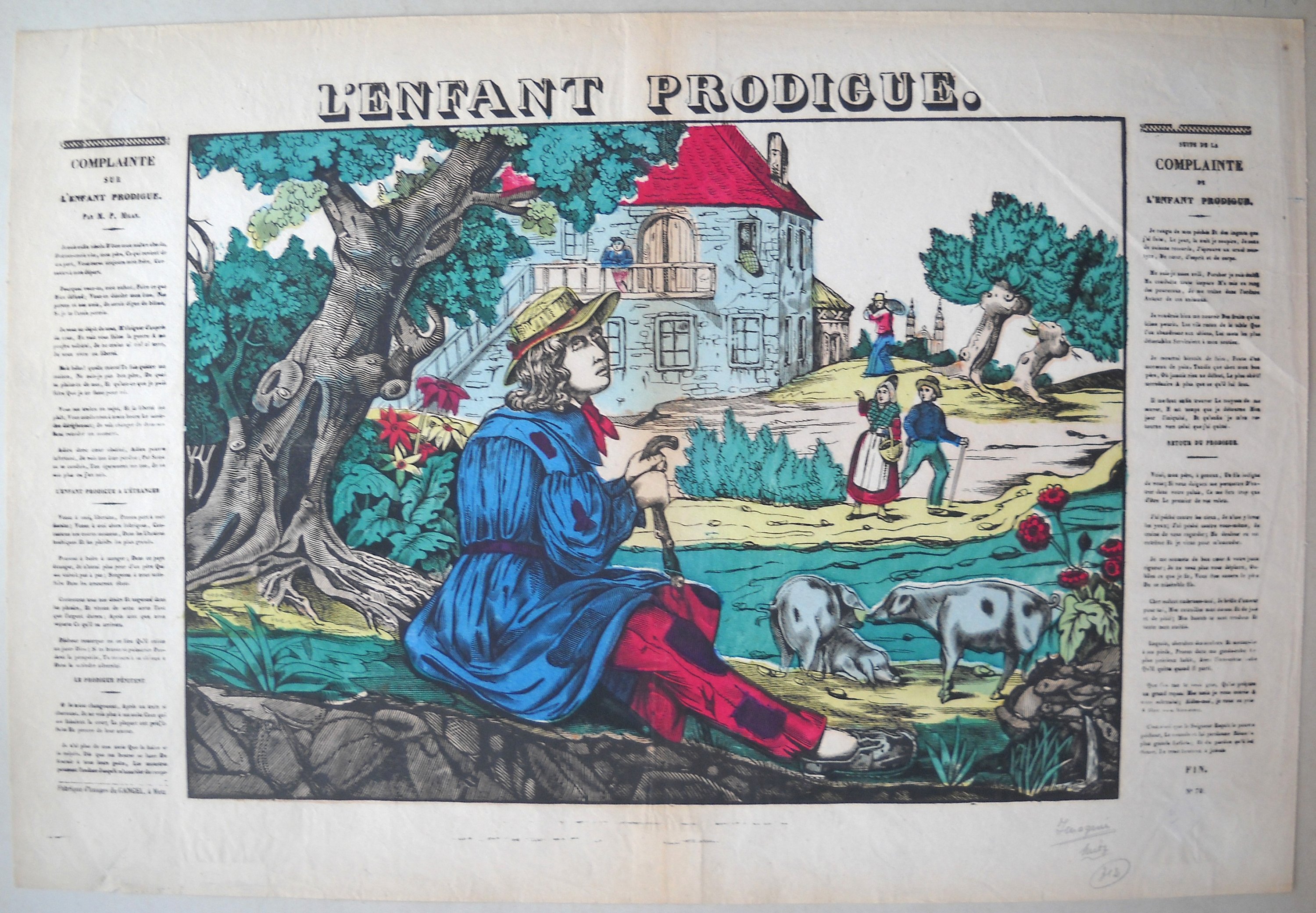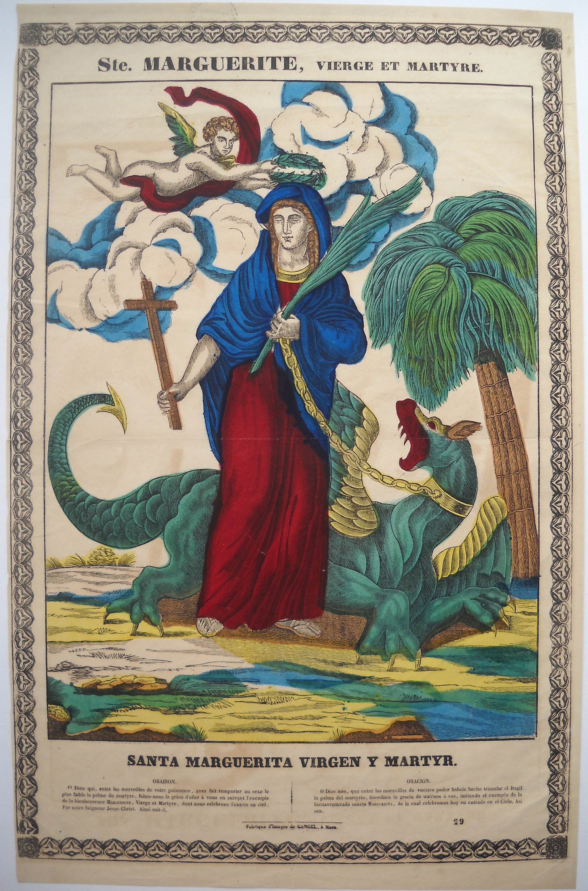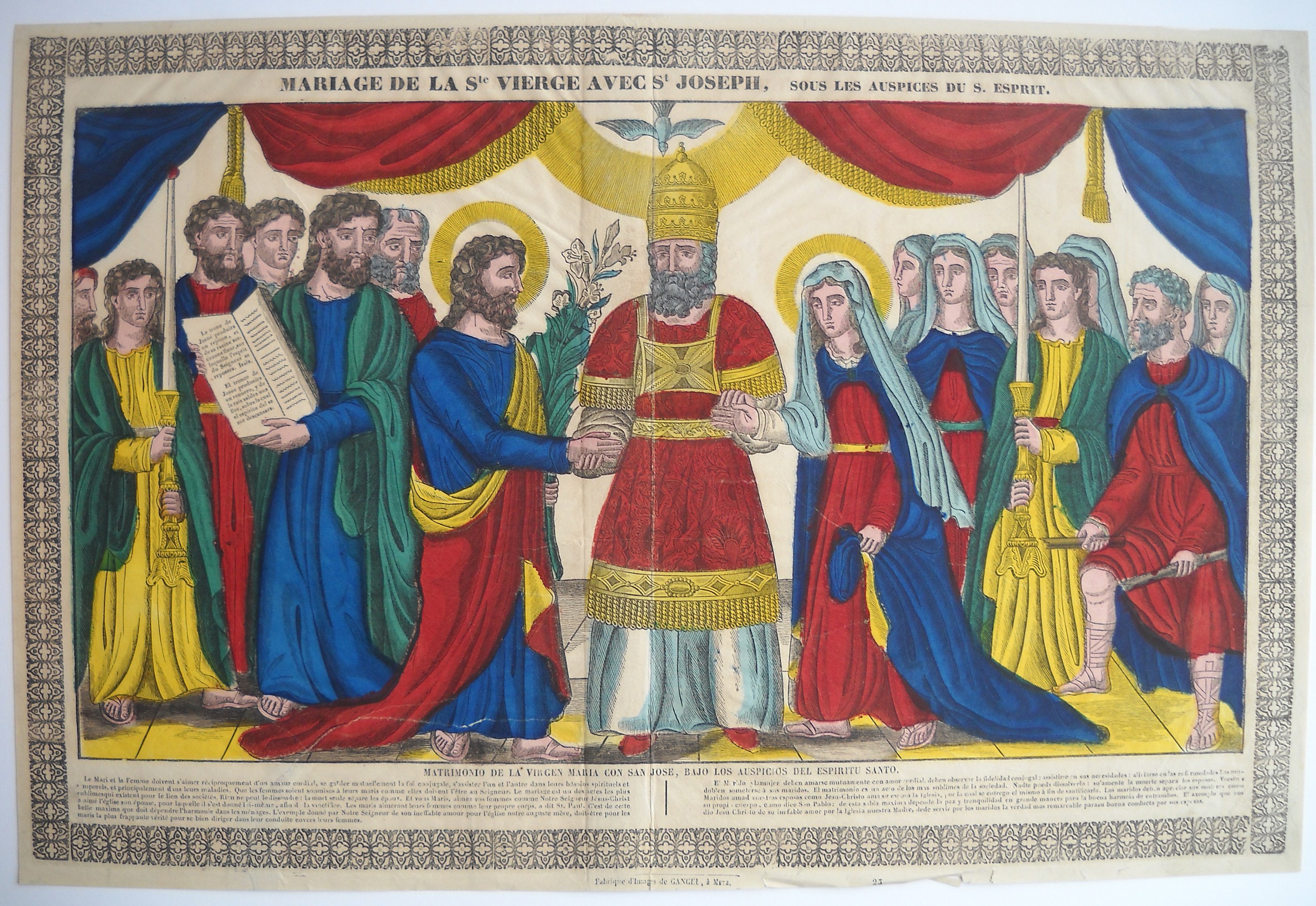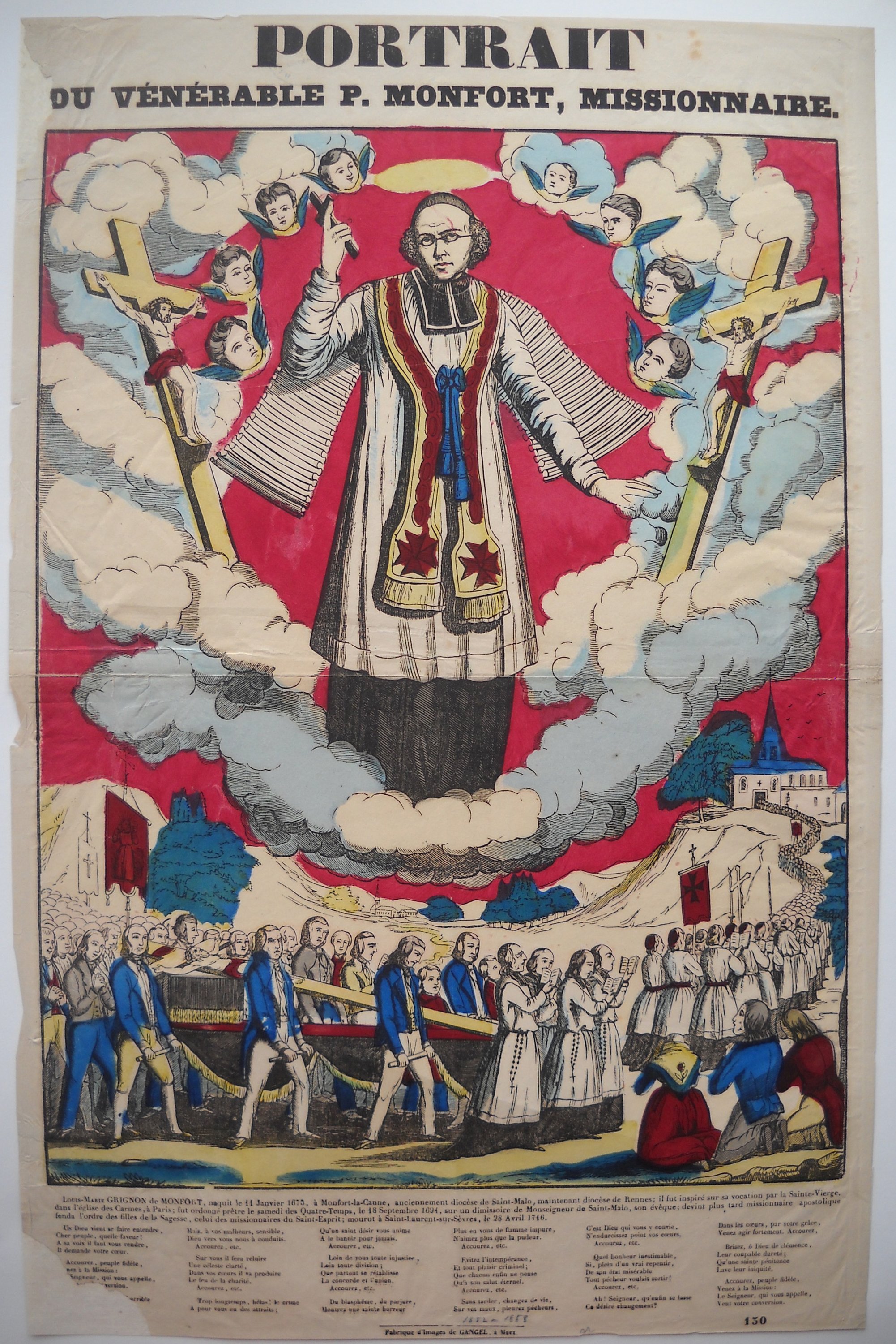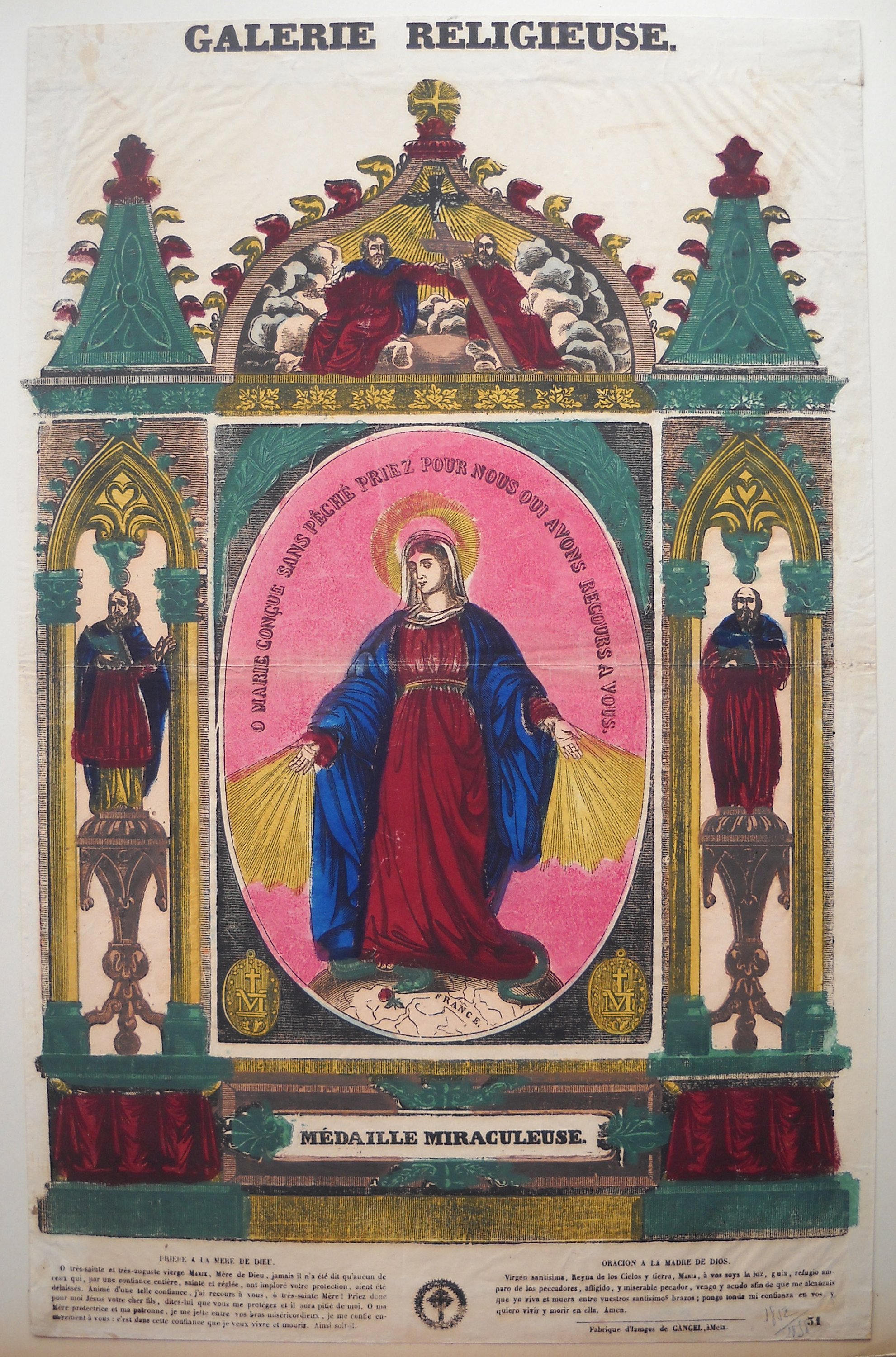 Exceptionnel lot de 72 épreuves, xylographies et lithographies, sur papier vergé ou mince, en majorité rehaussées aux coloris de l'époque, certaines double légende français/espagnol ou français/allemand, la plupart contrecollées sur carton épais ou placées sous passe-partout, env. 63 x 40 cm et inverse, états B à TTB : " L'ENFER - Tourments des damnés " ; " JESUS SUR LE CALVAIRE " ; " LA MORT DU JUSTE " ; " CHRIST AUX EVANGELISTES " ; " DESCENTE DE CROIX " ; 2 ex. " INSTITUTION DE LA CENE " ; " JUGEMENT ET CONDAMNATION DE JESUS " ; " CHRIST AUX LARRONS " ; " JESUS BENISSANT LES ENFANTS " ; " LE SAUVEUR DU MONDE " ; " HEUREUSE BENEDICTION DES MAISONS ET DES FAMILLES " ; " L'ENFANT PRODIGUE " ; 2 ex. " PROCESSION DE LA FÊTE DIEU " ; " L'ENFANT PRODIGUE " ; " L'ADORATION DES BERGERS " ; 3 ex. " L'ADORATION DES ROIS " ; " MARIAGE DE LA STE VIERGE AVEC ST JOSEPH " ; " JOSEPH / EXPLIQUANT LES SONGES DE PHARAON " ; " SAINT JOSEPH EPOUX DE LA VIERGE MARIE " ; " SAINT PAUL " ; " SAINT FAUSTIN MARTYR " ; " SAINT ANTOINE " ; " SAINT DONAT " ; " GRANDE CONFRERIE / DE SAINT CREPIN ET DE SAINT CREPINIEN " ; " SAINT FRANCOIS-XAVIER " ; " PORTRAIT / DU VENERABLE MONTFORT, MISSIONNAIRE " ; " SAINT YVES DE TREGUIER " ; 2 ex. " SAINT ELOI " ; " SAINT MARTIAL " ; " STE BARBE, / PATRONNE DES ARTILLEURS " ; " SAINTE GENEVIEVE DE BRABANT " ; " SAINTE THERESE " ; " Ste MARGUERITE " ; " Ste PHILOMENE " ; " SAINTE CATHERINE " ; " L'ASSOMPTION DE LA VIERGE " ; " MEDAILLE MIRACULEUSE " ; " LA Ste VIERGE " ; " LA TRES SAINTE VIERGE, / REFUGE DES CHOLERIQUES " ; 3 ex. " NOTRE-DAME DE HALL " ; " N.D. SOUTERRAINE / DU PORT " ; " NUESTRA SENORA DE UXUE, / En Navarra " ; " N. DAME D'ORCIVAL " ; " NOTRE-DAME / SUR VIRE " ; " NOTRE-DAME DE LA GARDE DE MARSEILLE " ; " NOTRE-DAME DES ERMITES " ; " NOTRE-DAME DES ANGES " ; " NOTRE-DAME DE MONTAIGU " ; 2 ex. " N.D. DES OLIVIERS " ; " N.D. DU SAINT ROSAIRE " ; 3 ex. " N.D. DE BON-SECOURS " ; " NOTRE-DAME DE FOURVIERES " ; 2 ex. " NOTRE-DAME DE BONNE-ESPERANCE " ; 2 ex. " NOTRE-DAME DE BON-SECOURS " ; " N.S. DE GUADALOUPE " ; " NOTRE-DAME / AUX FLEURS " ; etc.