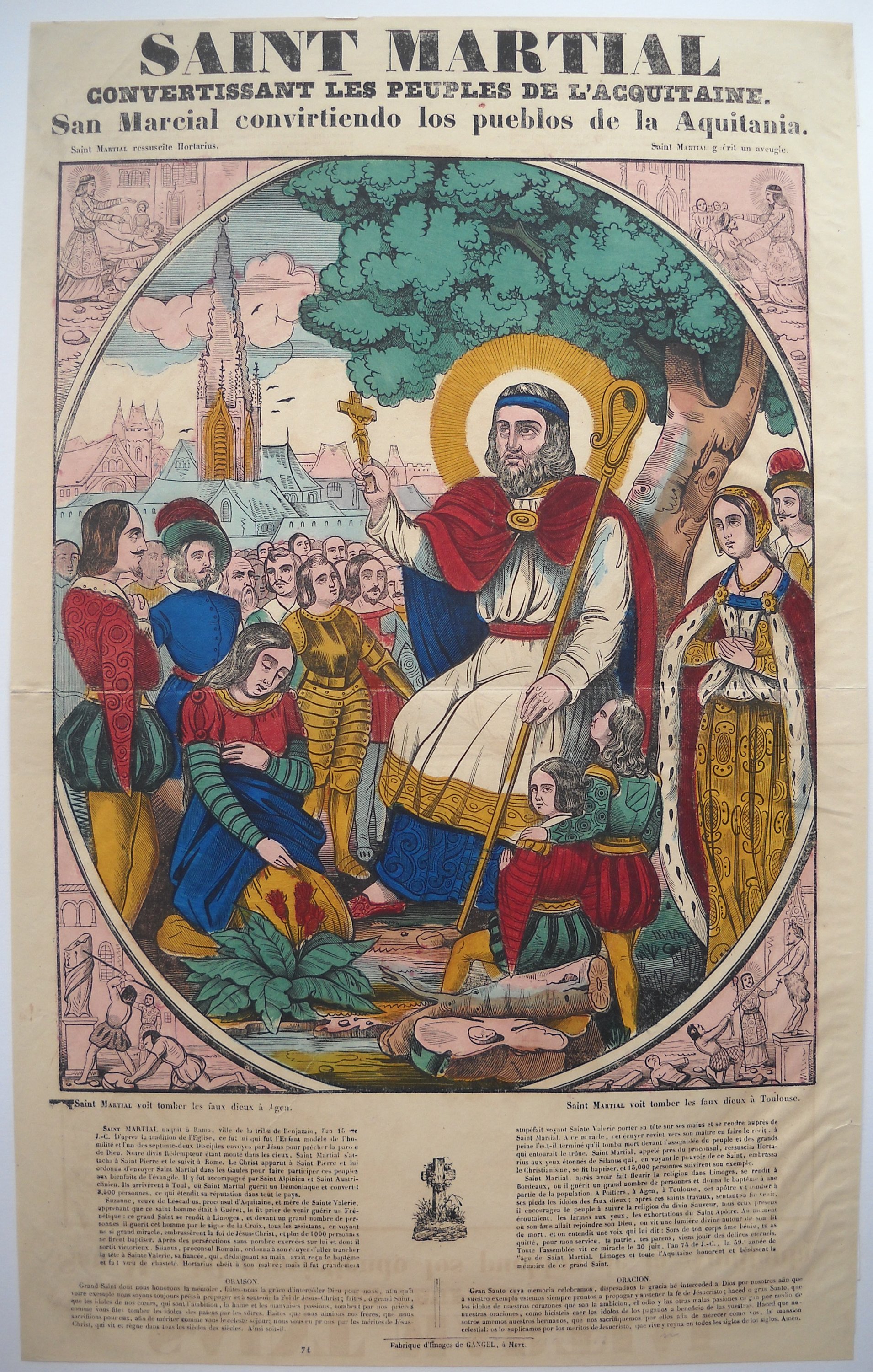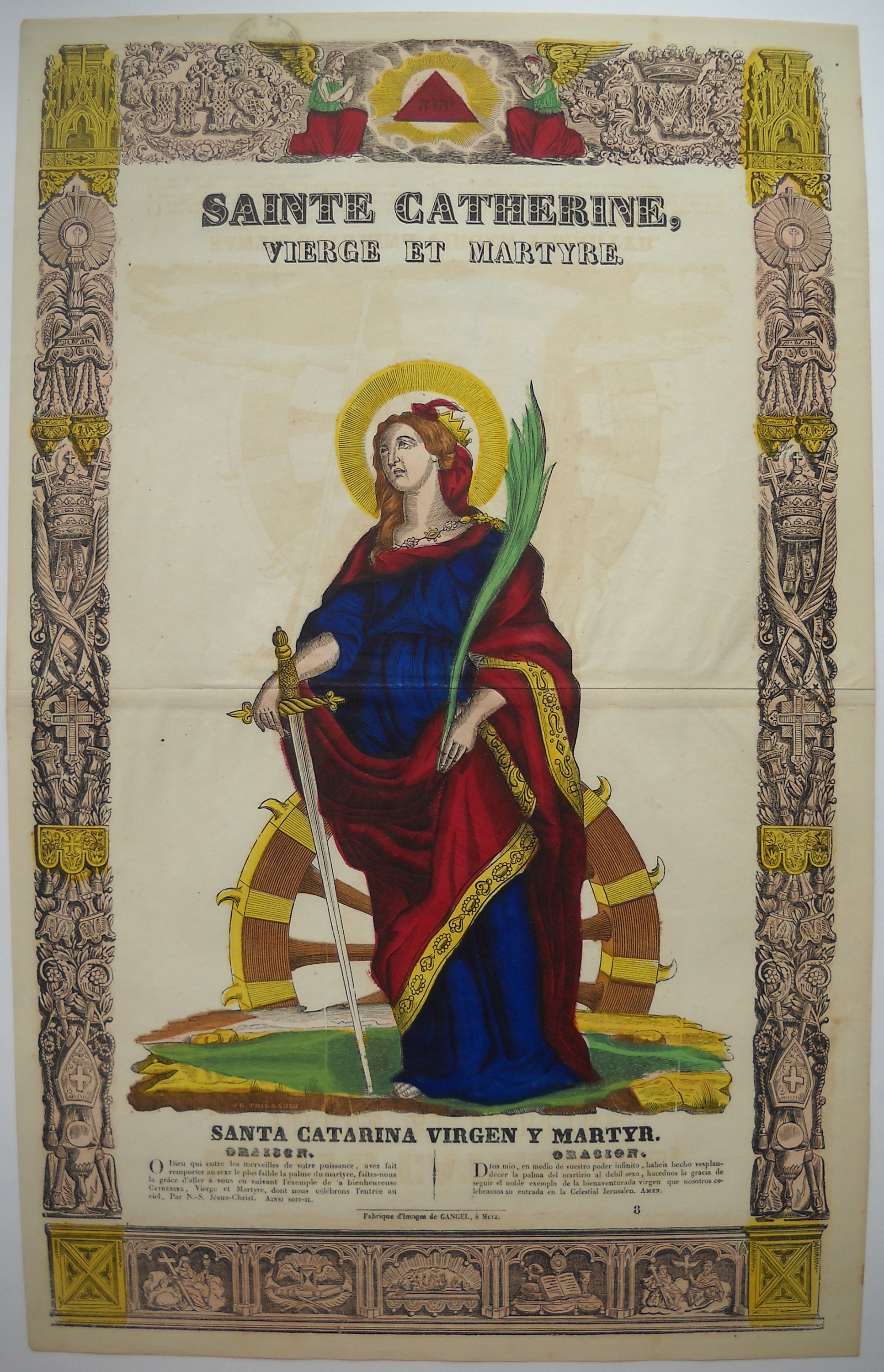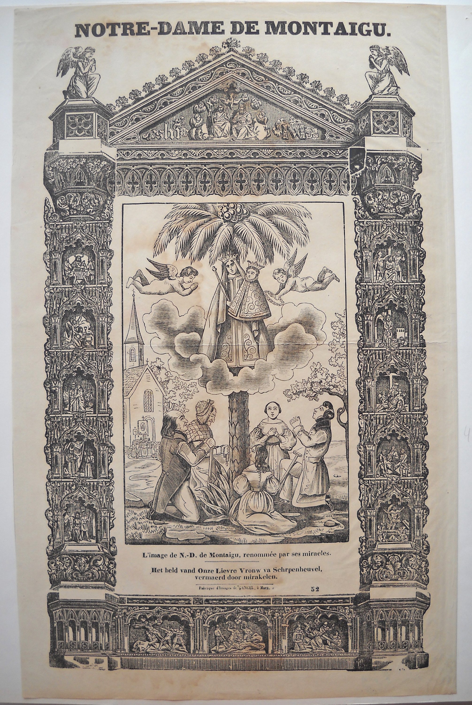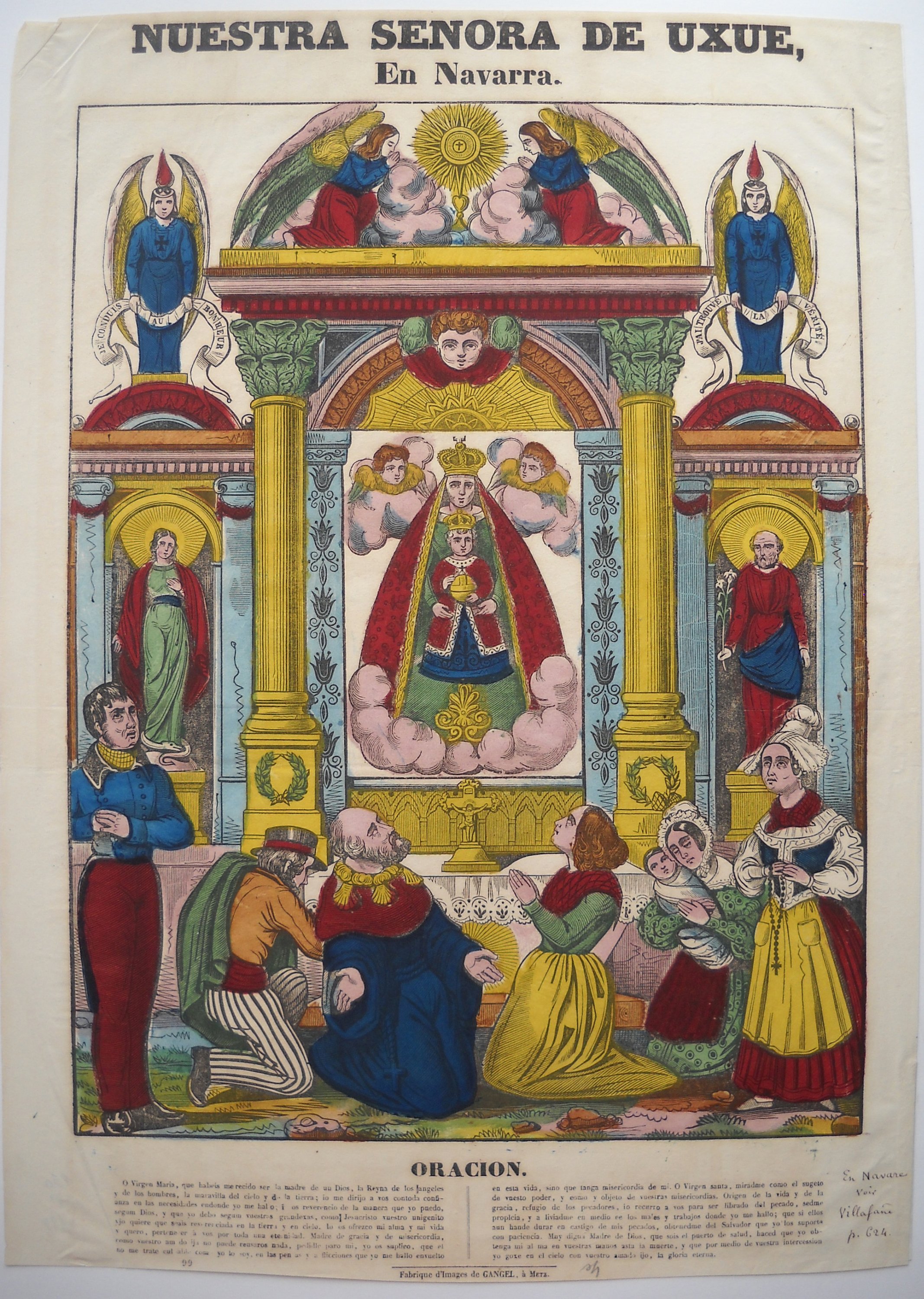 Exceptionnel lot de 72 épreuves, xylographies et lithographies, sur papier vergé ou mince, en majorité rehaussées aux coloris de l'époque, certaines double légende français/espagnol ou français/allemand, la plupart contrecollées sur carton épais ou placées sous passe-partout, env. 63 x 40 cm et inverse, états B à TTB : " L'ENFER - Tourments des damnés " ; " JESUS SUR LE CALVAIRE " ; " LA MORT DU JUSTE " ; " CHRIST AUX EVANGELISTES " ; " DESCENTE DE CROIX " ; 2 ex. " INSTITUTION DE LA CENE " ; " JUGEMENT ET CONDAMNATION DE JESUS " ; " CHRIST AUX LARRONS " ; " JESUS BENISSANT LES ENFANTS " ; " LE SAUVEUR DU MONDE " ; " HEUREUSE BENEDICTION DES MAISONS ET DES FAMILLES " ; " L'ENFANT PRODIGUE " ; 2 ex. " PROCESSION DE LA FÊTE DIEU " ; " L'ENFANT PRODIGUE " ; " L'ADORATION DES BERGERS " ; 3 ex. " L'ADORATION DES ROIS " ; " MARIAGE DE LA STE VIERGE AVEC ST JOSEPH " ; " JOSEPH / EXPLIQUANT LES SONGES DE PHARAON " ; " SAINT JOSEPH EPOUX DE LA VIERGE MARIE " ; " SAINT PAUL " ; " SAINT FAUSTIN MARTYR " ; " SAINT ANTOINE " ; " SAINT DONAT " ; " GRANDE CONFRERIE / DE SAINT CREPIN ET DE SAINT CREPINIEN " ; " SAINT FRANCOIS-XAVIER " ; " PORTRAIT / DU VENERABLE MONTFORT, MISSIONNAIRE " ; " SAINT YVES DE TREGUIER " ; 2 ex. " SAINT ELOI " ; " SAINT MARTIAL " ; " STE BARBE, / PATRONNE DES ARTILLEURS " ; " SAINTE GENEVIEVE DE BRABANT " ; " SAINTE THERESE " ; " Ste MARGUERITE " ; " Ste PHILOMENE " ; " SAINTE CATHERINE " ; " L'ASSOMPTION DE LA VIERGE " ; " MEDAILLE MIRACULEUSE " ; " LA Ste VIERGE " ; " LA TRES SAINTE VIERGE, / REFUGE DES CHOLERIQUES " ; 3 ex. " NOTRE-DAME DE HALL " ; " N.D. SOUTERRAINE / DU PORT " ; " NUESTRA SENORA DE UXUE, / En Navarra " ; " N. DAME D'ORCIVAL " ; " NOTRE-DAME / SUR VIRE " ; " NOTRE-DAME DE LA GARDE DE MARSEILLE " ; " NOTRE-DAME DES ERMITES " ; " NOTRE-DAME DES ANGES " ; " NOTRE-DAME DE MONTAIGU " ; 2 ex. " N.D. DES OLIVIERS " ; " N.D. DU SAINT ROSAIRE " ; 3 ex. " N.D. DE BON-SECOURS " ; " NOTRE-DAME DE FOURVIERES " ; 2 ex. " NOTRE-DAME DE BONNE-ESPERANCE " ; 2 ex. " NOTRE-DAME DE BON-SECOURS " ; " N.S. DE GUADALOUPE " ; " NOTRE-DAME / AUX FLEURS " ; etc.