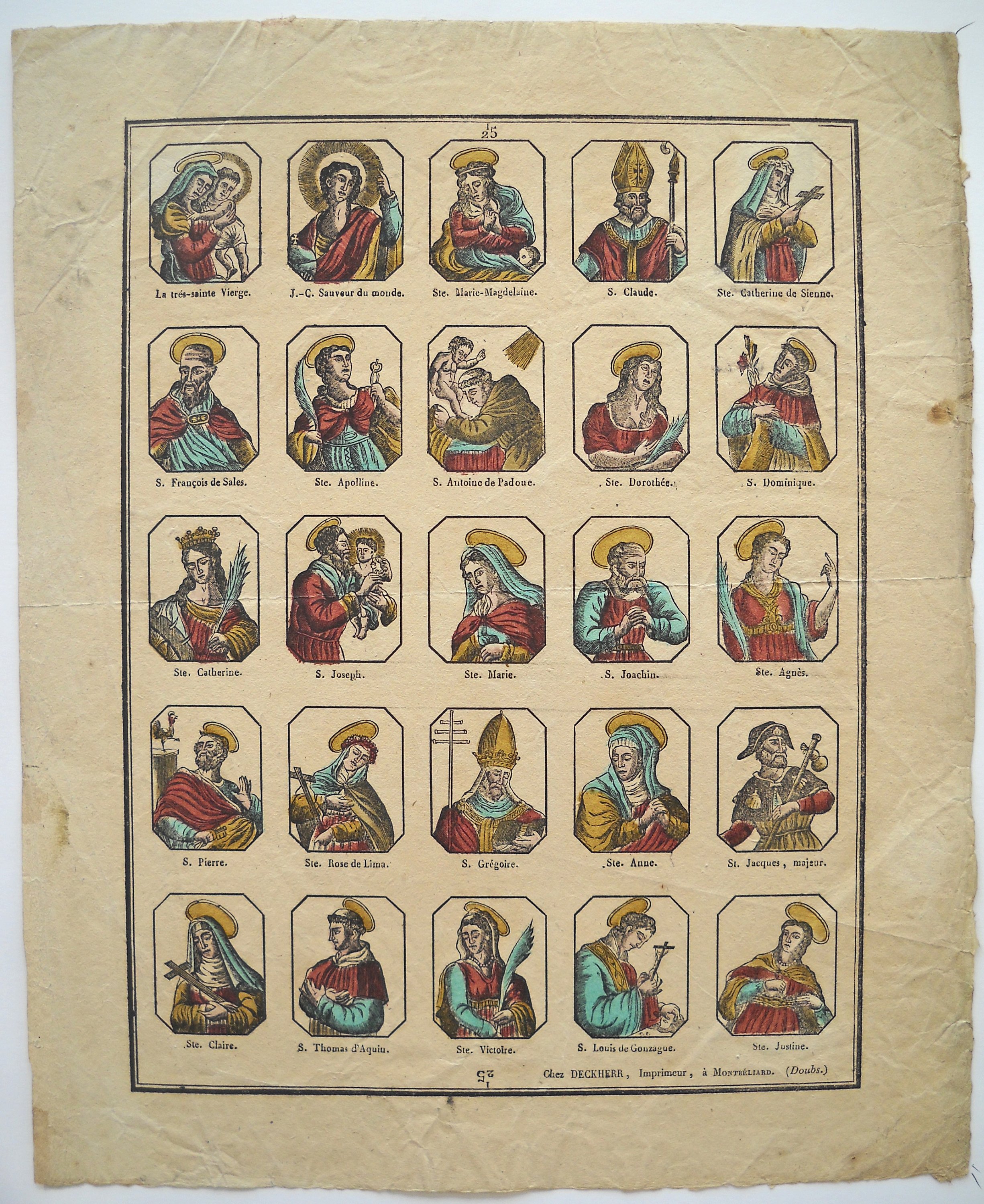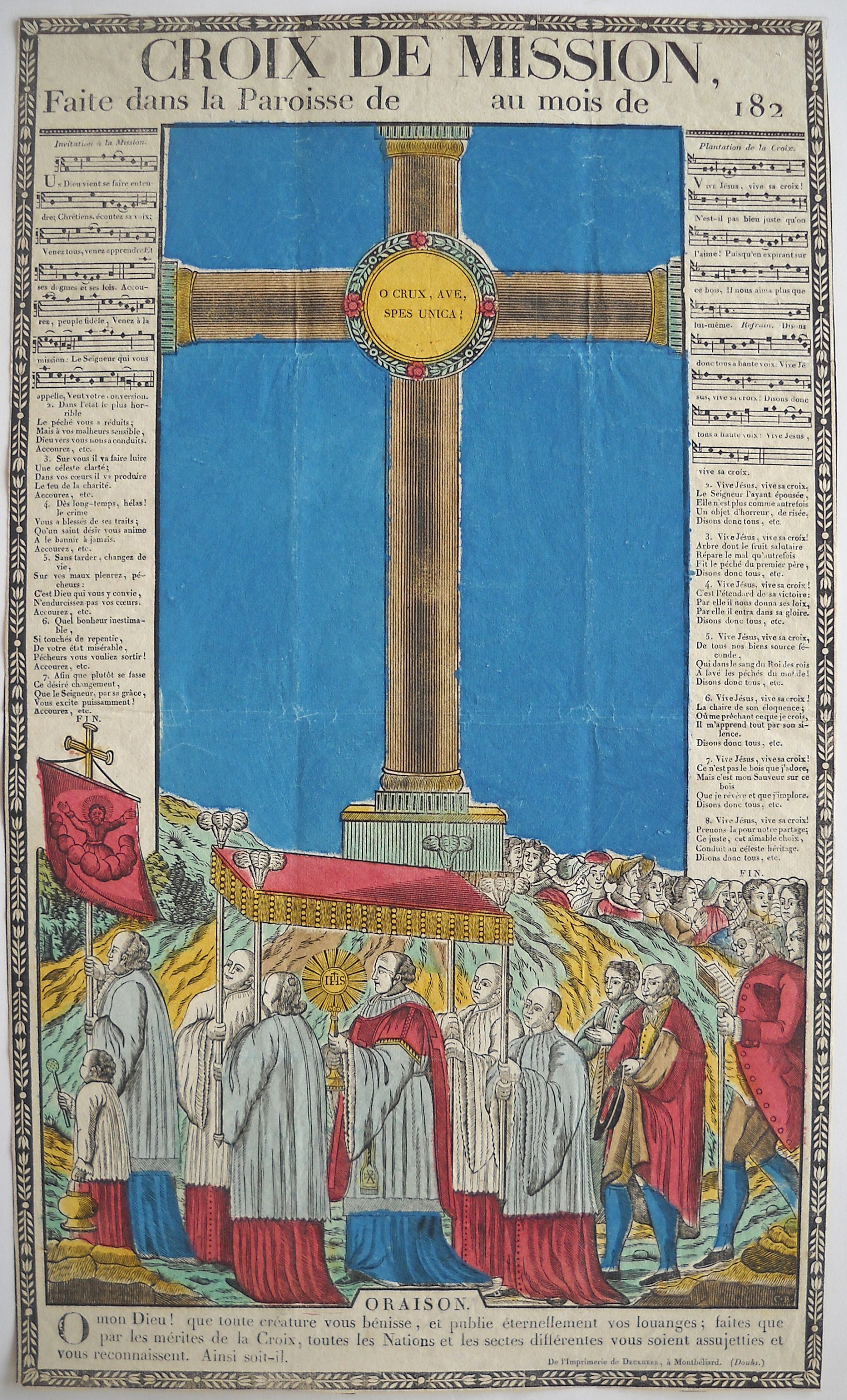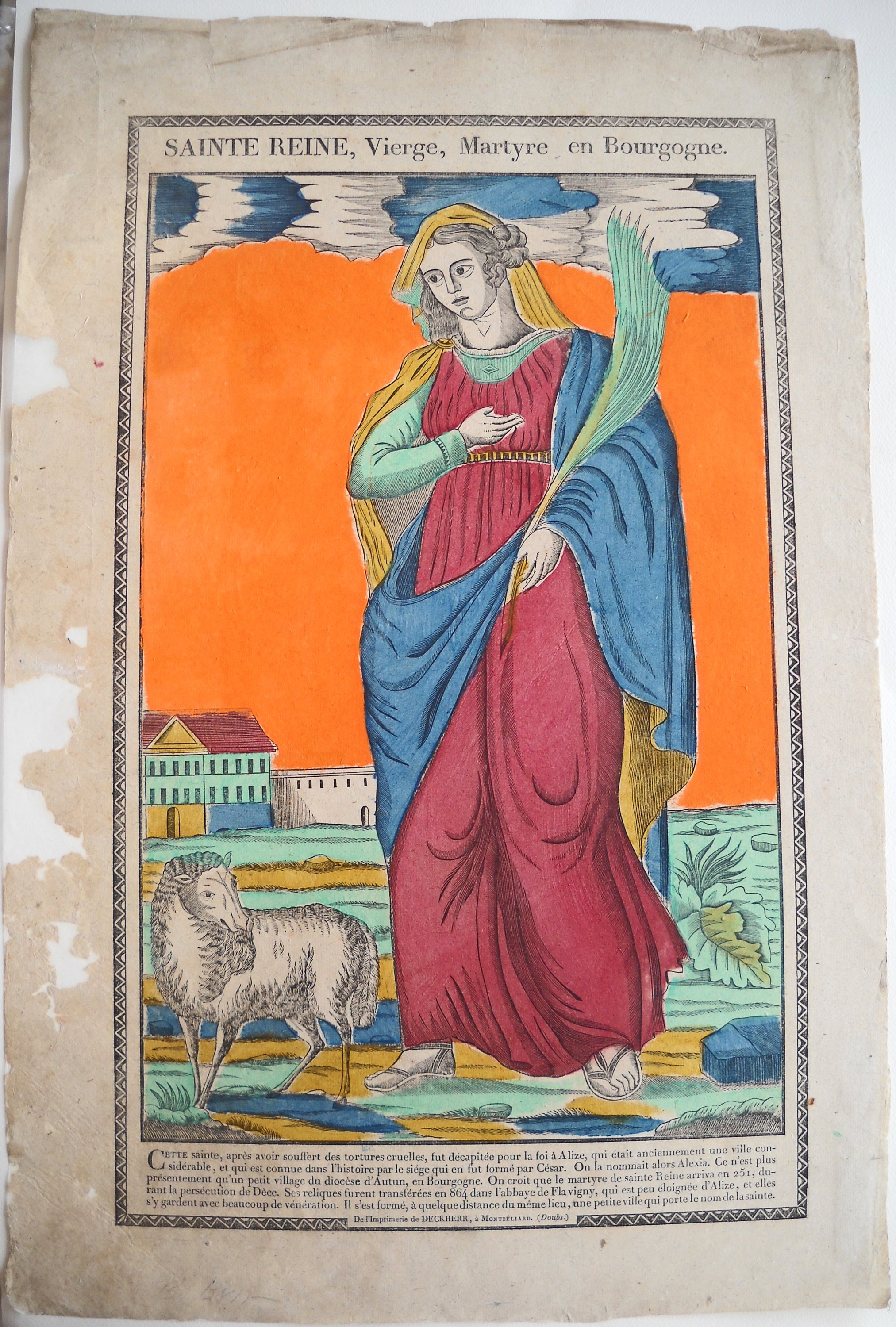 10 épreuves, gravures sur bois, coloris d'époque, sur papier vergé, placées sous passe-partout : " SAINTE REINE, Vierge, Martyre en Bourgogne ", 67 x 43,5 cm (manques, doublé en papier Japon) - " Notre-Dame des Hermites ", 61,5 x 39 cm (petits manques, plis, rest.) - " NOTRE-DAME DE BON SECOURS ", 66 x 42,5 cm (plis, taches, petits défauts) - " La Nouvelle Jérusalem ", 46,5 x 54,5 cm - " CROIX DE MISSION ", [août 1824], 56 x 33 cm (marges courtes, légers plis) - " Saint Joseph ", 64 x 41,5 cm (plis) - " CANTIQUE SPIRITUEL. L'ASSOMPTION DE LA TRÈS-SAINTE VIERGE ", 41 x 32 cm (plis) - " CANTIQUE SPIRITUEL. SAINT HONORÉ, Evêque, Patron des Boulangers ", 42,5 x 33 cm (manques) - Planche à compartiments de saintetés (5 x 5), 41,5 x 33 cm - Planche à compartiments de saintetés (6 x 4).