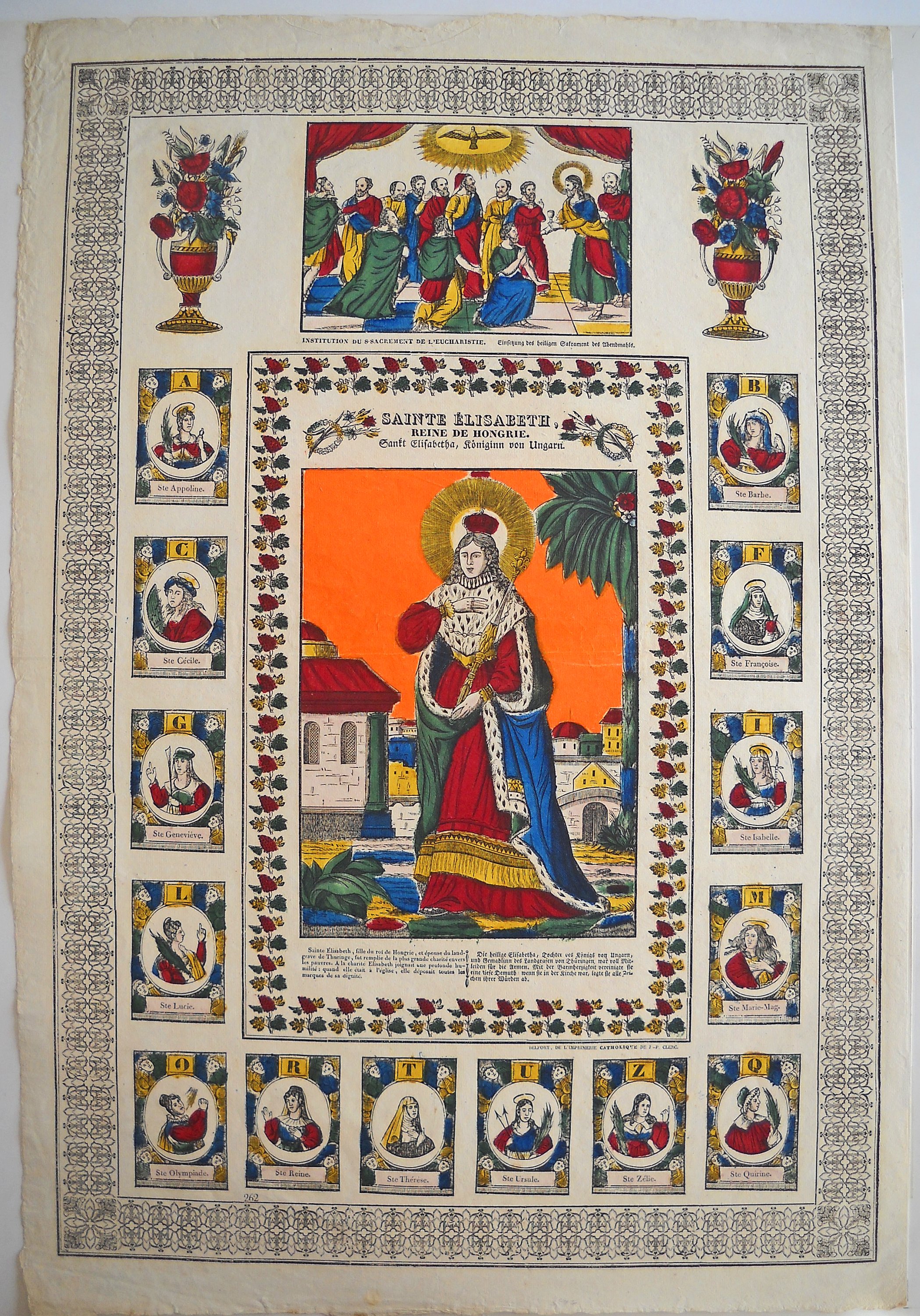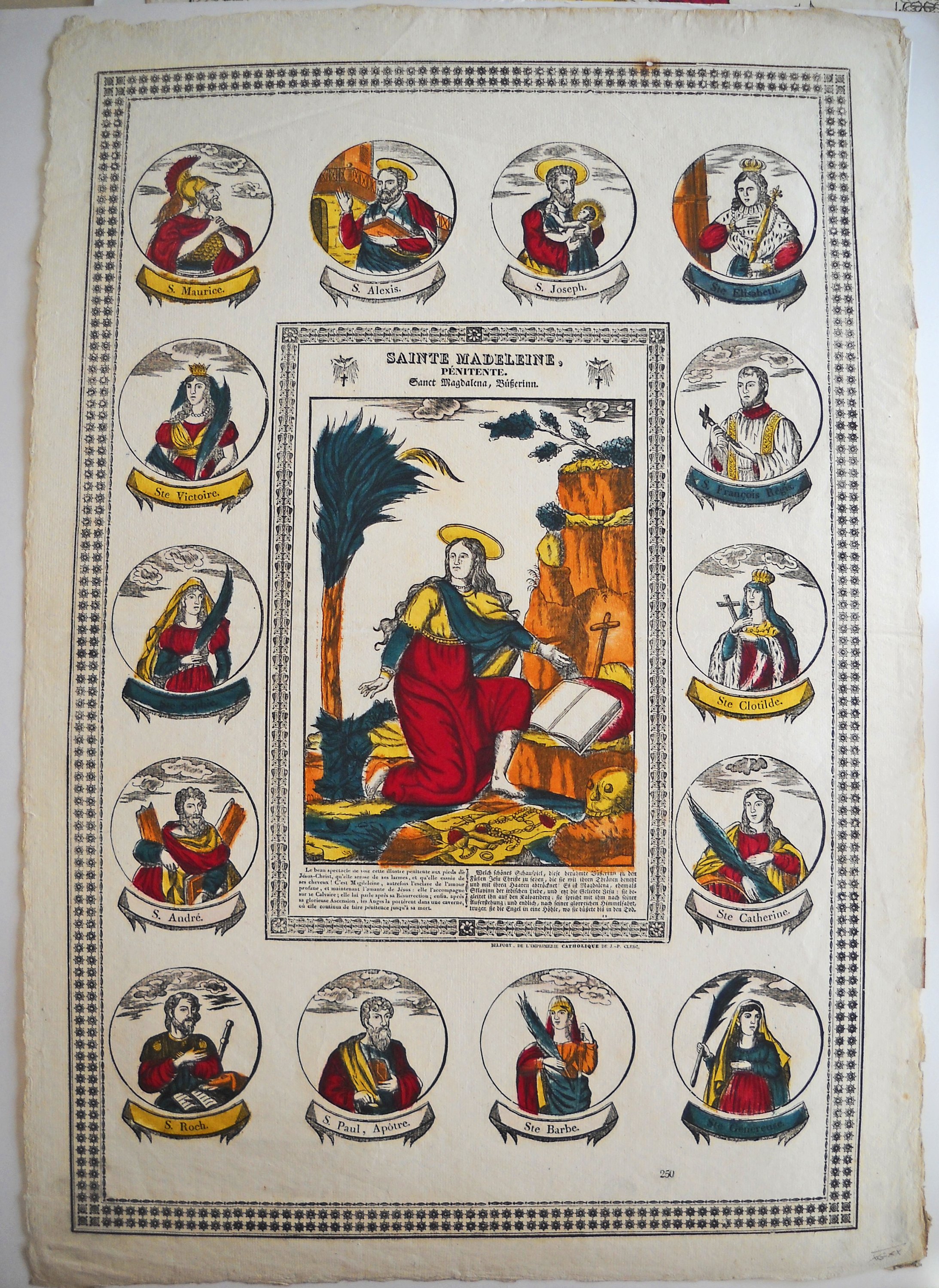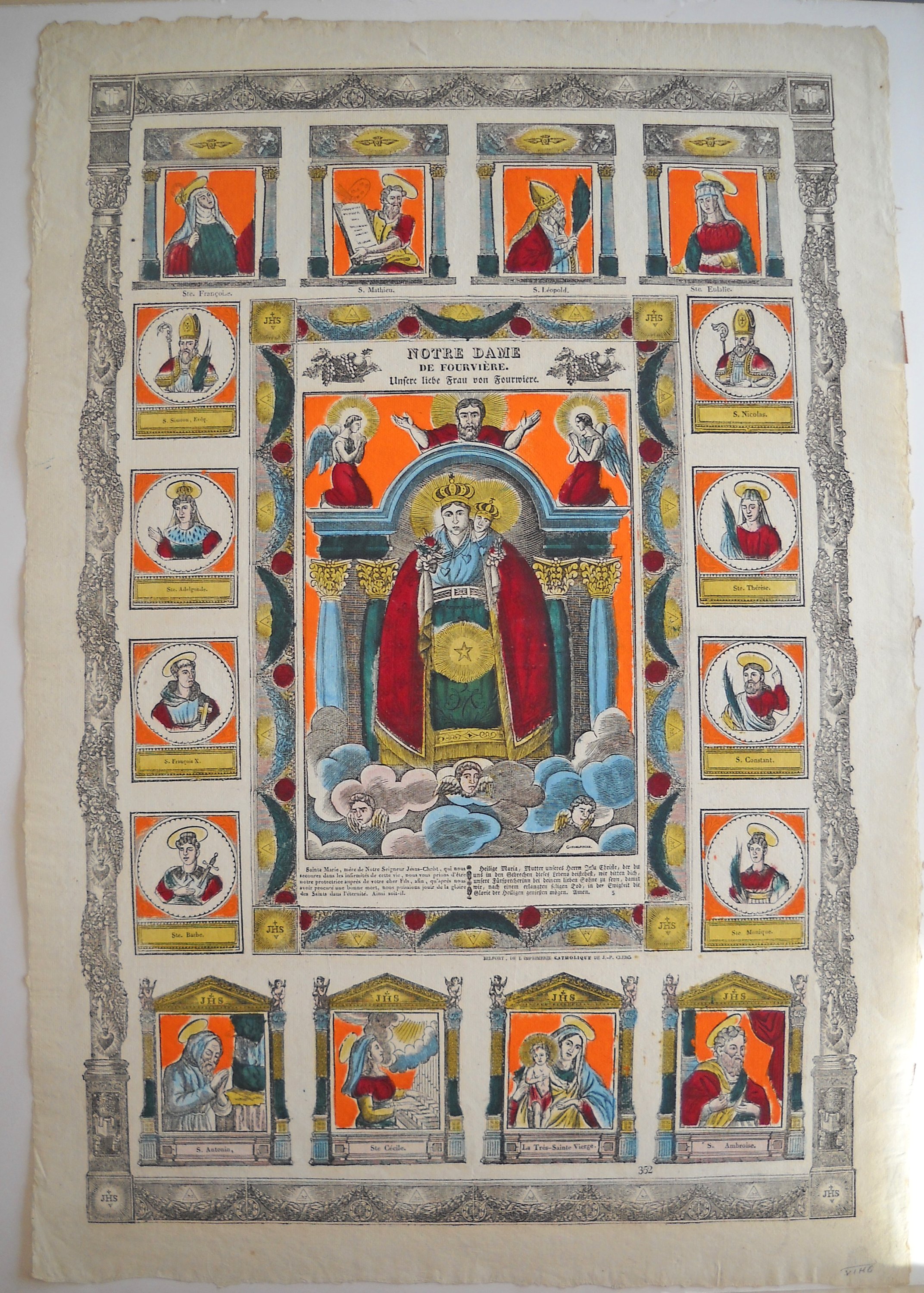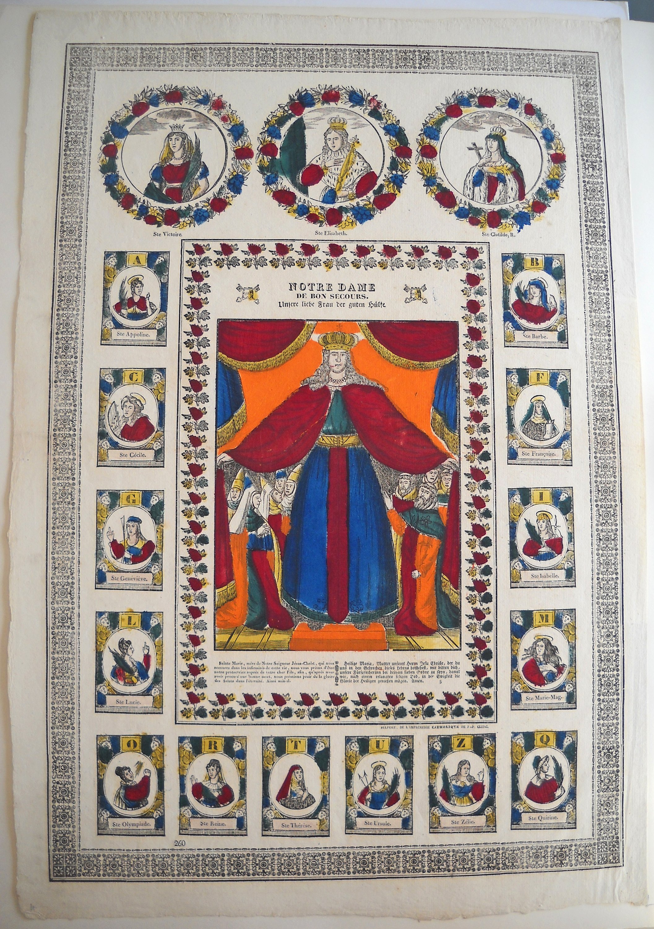 9 épreuves, gravures sur bois, coloris d'époque, sur papier vergé, placées sous passe-partout : " SAINTE MADELEINE, PÉNITENTE " - " NOTRE DAME DE BON SECOURS " - " SAINTE ÉLISABETH, REINE DE HONGRIE " - " LA TRÈS SAINTE VIERGE " - " SAINTE FRANCOISE, VEUVE ROMAINE " - " NOTRE DAME DE FOURVIÈRE " - " NOTRE DAME DE CONSOLATION " - " Ste THÉRÈSE " - " SAINTE REINE, VIERGE ET MARTYRE ", toutes env. 63 x 43 cm.