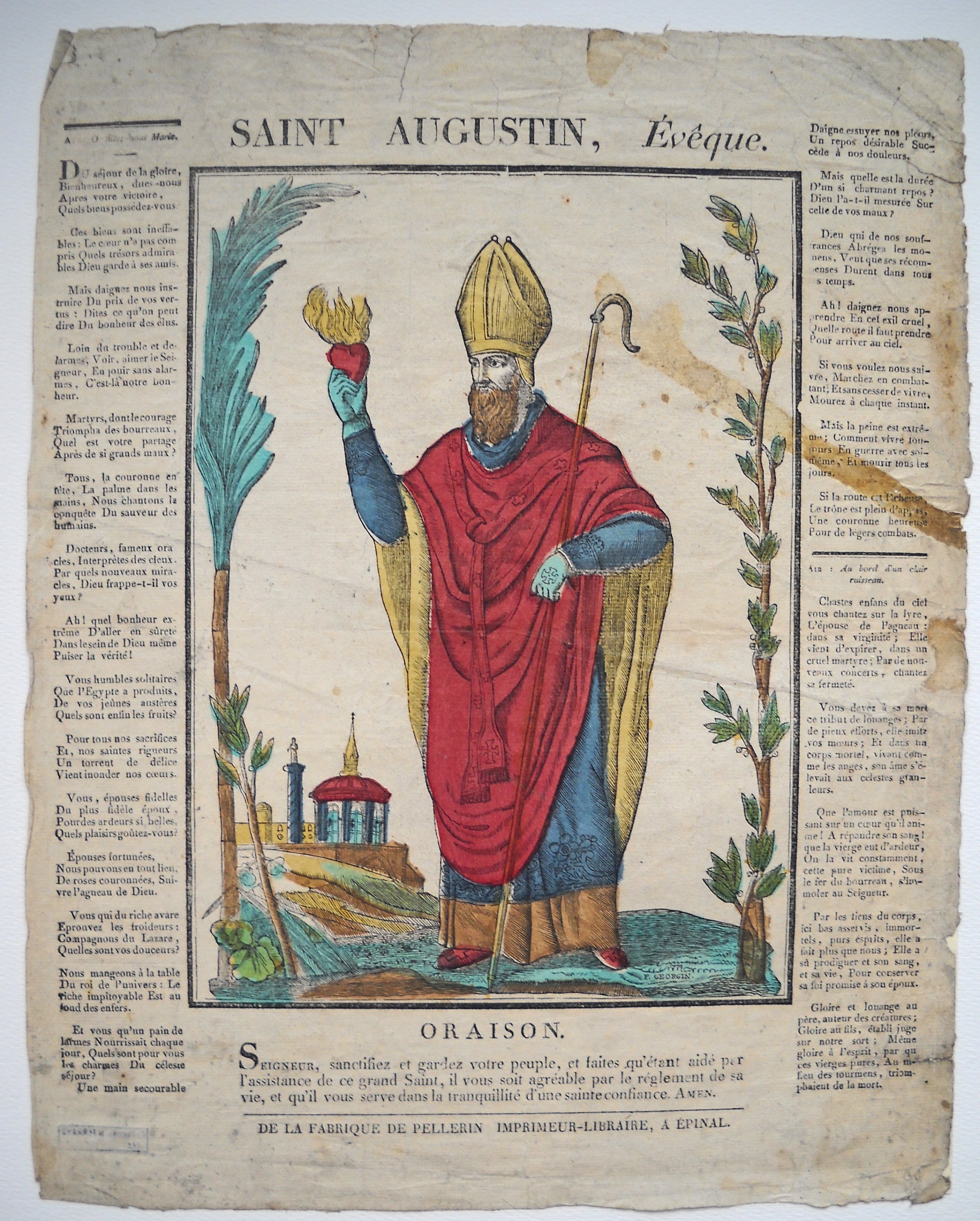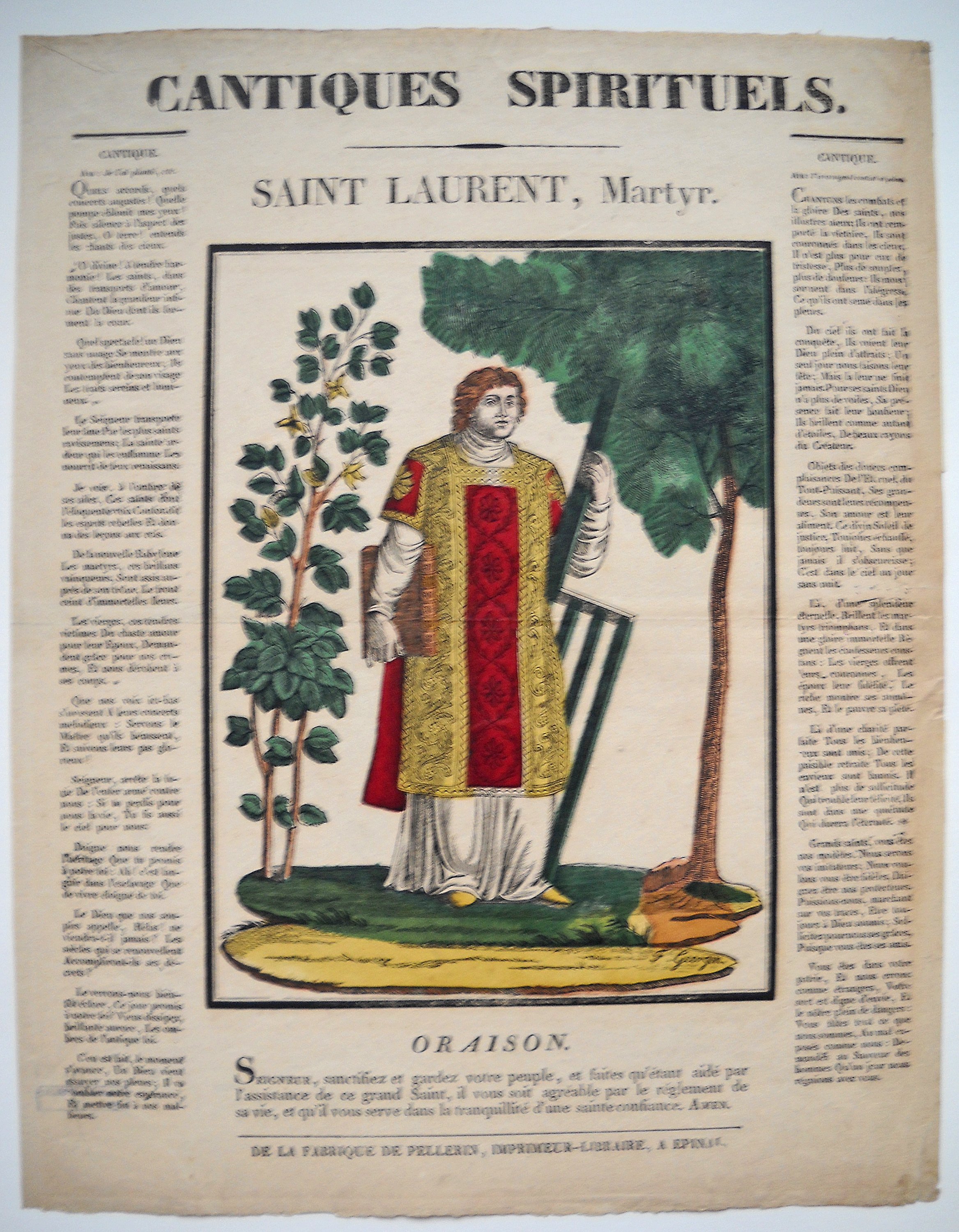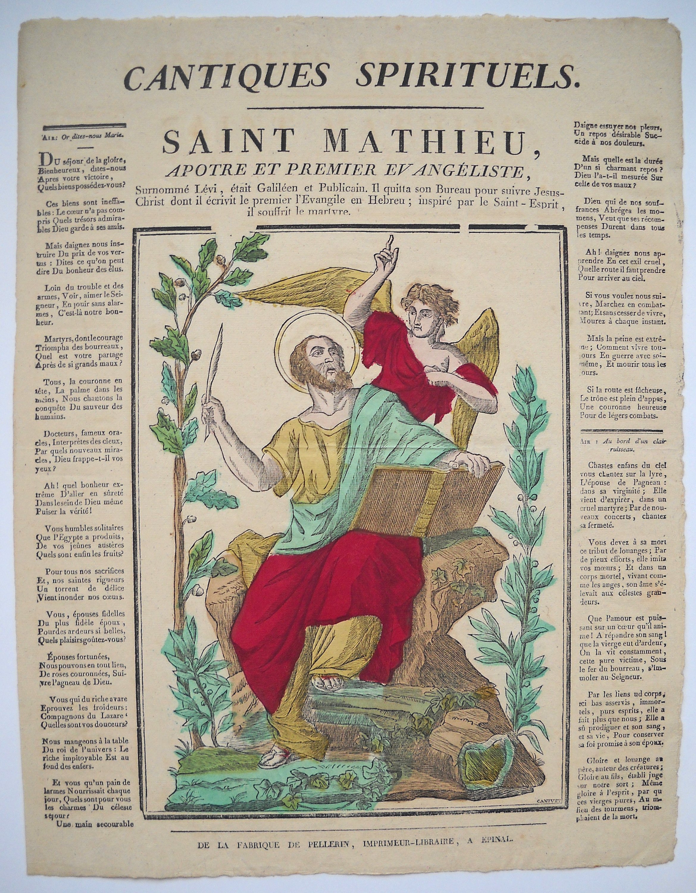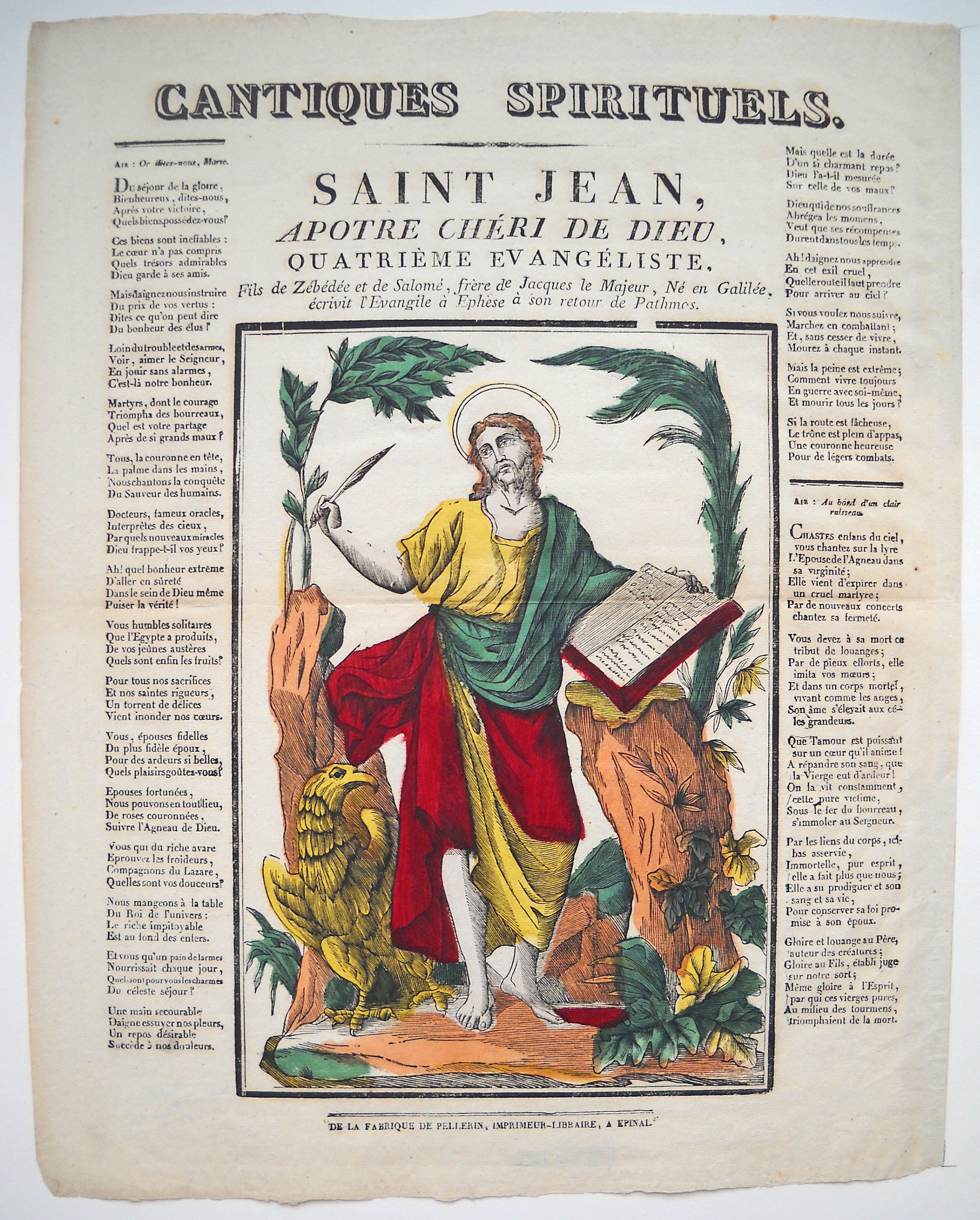 ", [avant 1814 - DL 11 octobre 1822] - " L'HORLOGE DE LA PASSION ", par F. GEORGIN, [DL 11 octobre 1822] - " CANTIQUES SPIRITUELS / SAINT LAURENT, Martyr ", par F. GEORGIN, [DL 1er décembre 1829] - " CANTIQUES SPIRITUELS / SAINT JEAN / APOTRE CHÉRI DE DIEU, / QUATRIÈME EVANGÉLISTE ", [avant 1814 - DL 16 octobre 1822] - " SAINT AUGUSTIN, Évêque ", [DL 16 octobre 1822] - " CANTIQUES SPIRITUELS / LE VÉRITABLE PORTRAIT / DE NOTRE-DAME DE SION ", entre 1814 et 1822 - " NOTRE-DAME DE LA GARDE / PATRONNE DES MARINS ", [DL 1837] - " CANTIQUE SPIRITUEL / Ste MARIE MAGDELEINE ", avant 1814 - " CANTIQUES SPIRITUELS / SAINTE VICTOIRE ", par F. GEORGIN, [DL 27 septembre 1822] - " CANTIQUES SPIRITUELS / SAINT MATHIEU, / APOTRE ET PREMIER EVANGÉLISTE ", CANIVET graveur, avant 1814 - 2 ex. " CANTIQUES SPIRITUELS / SAINT MARC, / DEUXIÈME EVANGÉLISTE ", CANIVET graveur, [avant 1814 - DL 28 octobre 1822] - " CANTIQUES SPIRITUELS / SAINT LUC, / TROISIÈME EVANGÉLISTE ", CANIVET graveur ?, [avant 1814 - DL 28 octobre 1822] - " CANTIQUES SPIRITUELS / NOTRE-DAME AUXILIATRICE ", avant octobre 1822 - " CANTIQUES SPIRITUELS / JÉSUS ENTRE DEUX LARRONS ", [DL 11 octobre 1822] (en l'état) - " St ELOY, patron des Maréchaux et des Forgerons ", par F. GEORGIN, [DL 19 octobre 1822] - " CANTIQUES SPIRITUELS / SAINTE ADELAIDE, / Reine d'Italie, Impératrice d'Allemagne ", CANIVET graveur ?, [DL 4 février 1825] - " NOTRE-DAME DU MONT-CARMEL ", par F. GEORGIN, [DL 4 décembre 1822] - " CANTIQUE SPIRITUEL / SAINT ALEXIS ", vers 1830-1840 - " " CANTIQUES SPIRITUELS / NOTRE-DAME DE FOURVIÈRE ", vers 1820-1830 (en l'état) - " CANTIQUES SPIRITUELS / NOTRE-DAME DU ROSAIRE ", par F. GEORGIN, entre 1819 et 1837 - " SAINT FRANCOIS d'Assise ", par F. GEORGIN, [DL 28 octobre 1822] - " LITANIES DE LA SAINTE VIERGE " - Planche à compartiments (2 x 2) - " Bonne Ste Fainéante, Protectrice des paresseux ! " [DL 28 mai 1823].