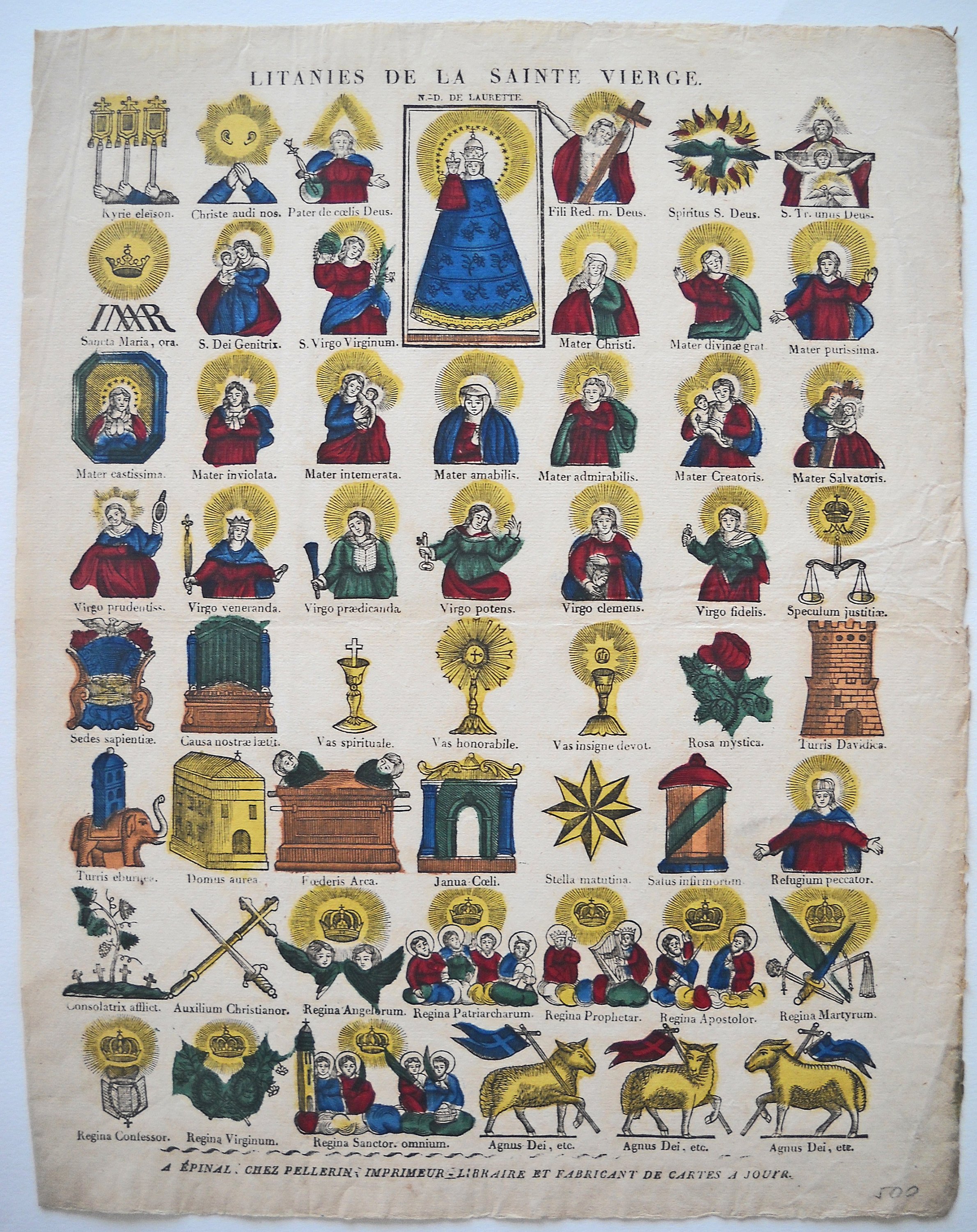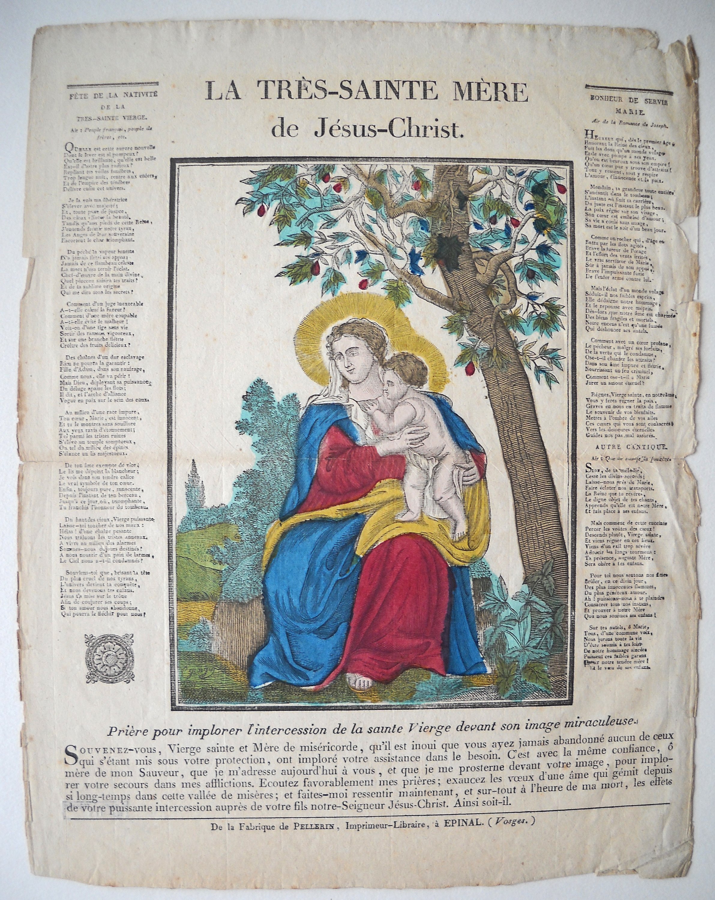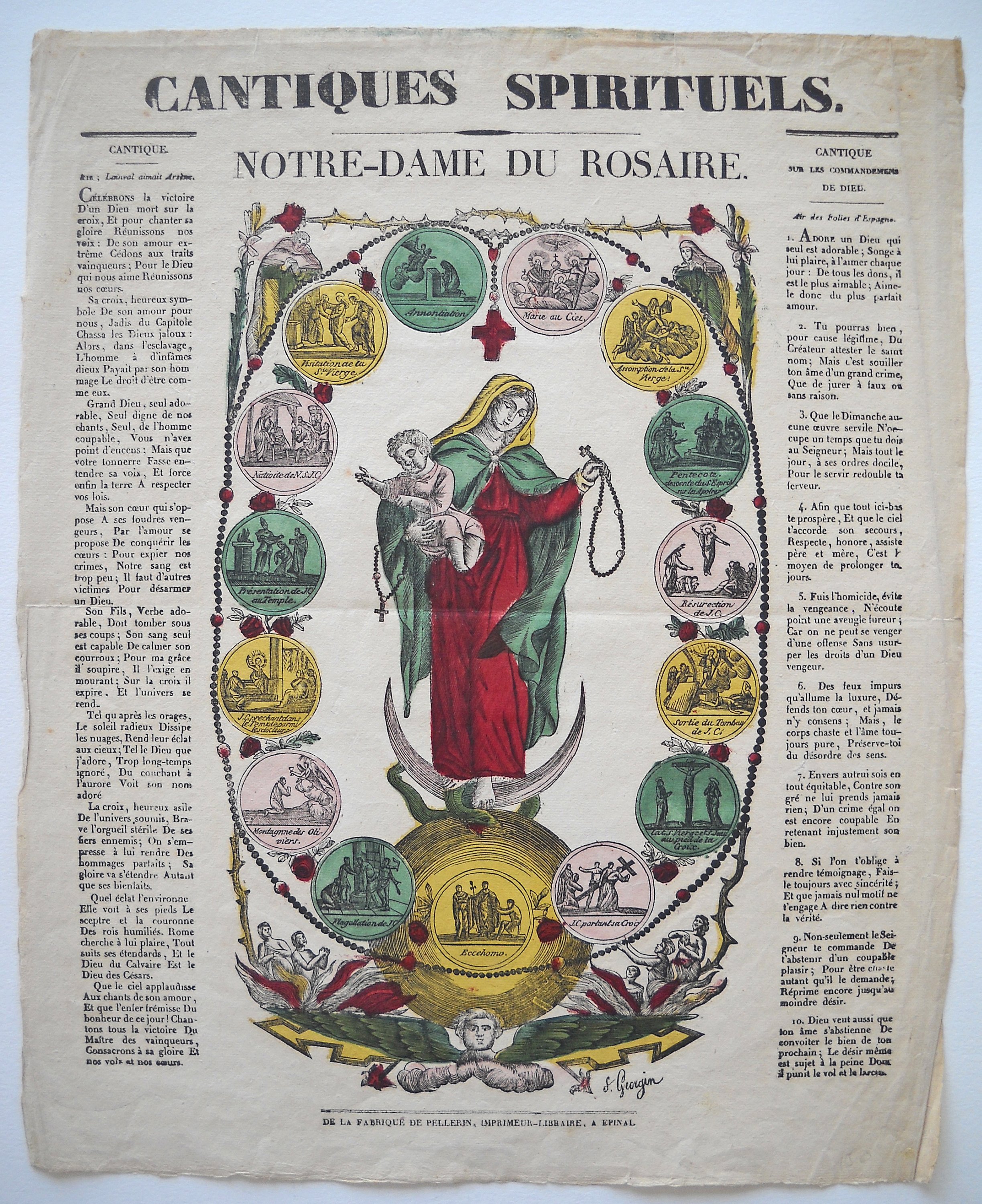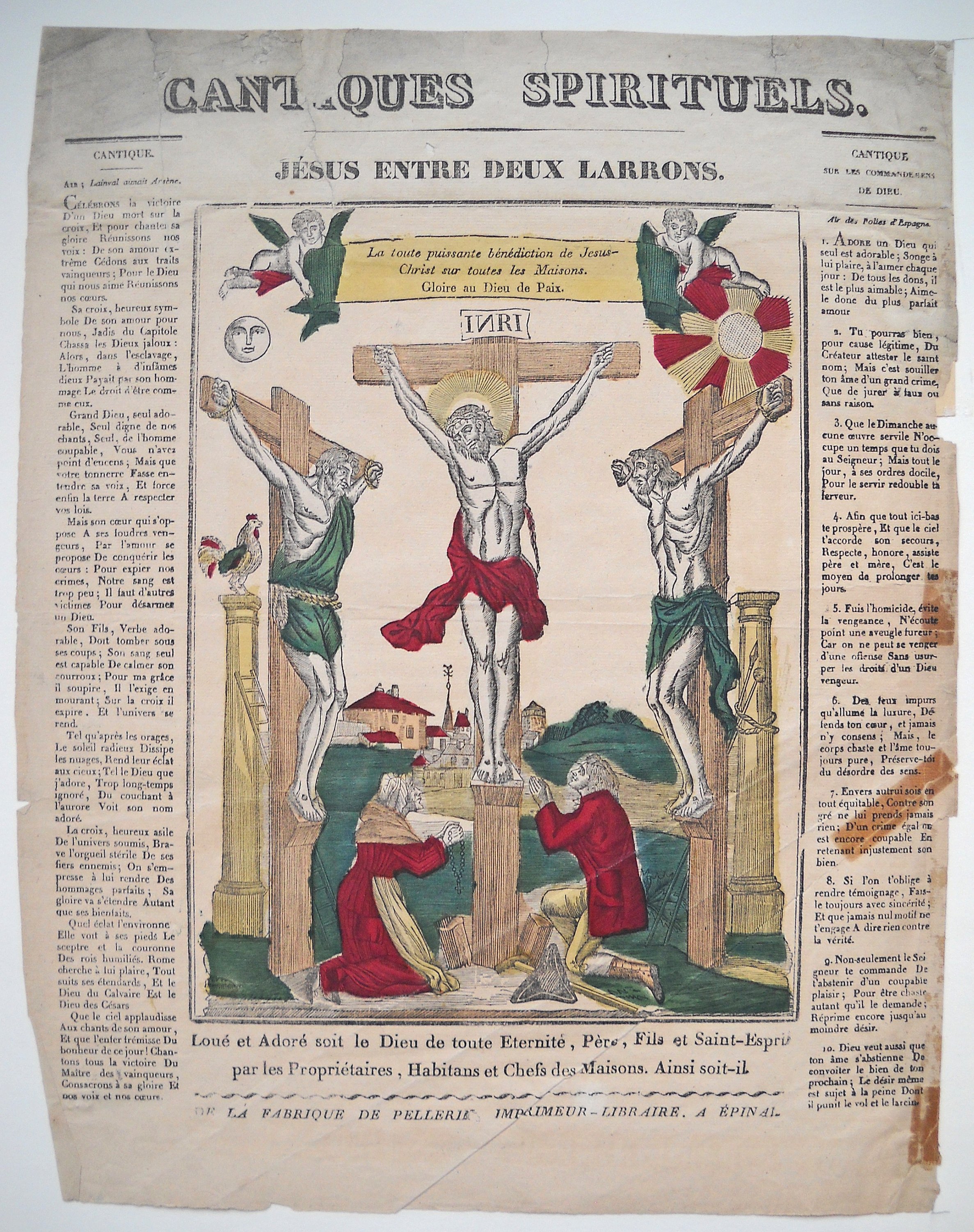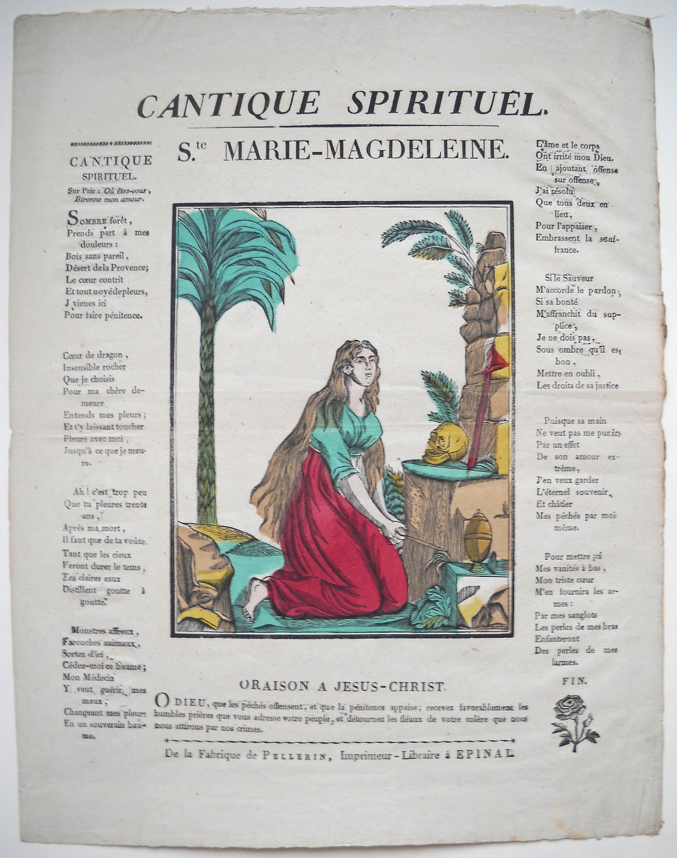 ", [avant 1814 - DL 11 octobre 1822] - " L'HORLOGE DE LA PASSION ", par F. GEORGIN, [DL 11 octobre 1822] - " CANTIQUES SPIRITUELS / SAINT LAURENT, Martyr ", par F. GEORGIN, [DL 1er décembre 1829] - " CANTIQUES SPIRITUELS / SAINT JEAN / APOTRE CHÉRI DE DIEU, / QUATRIÈME EVANGÉLISTE ", [avant 1814 - DL 16 octobre 1822] - " SAINT AUGUSTIN, Évêque ", [DL 16 octobre 1822] - " CANTIQUES SPIRITUELS / LE VÉRITABLE PORTRAIT / DE NOTRE-DAME DE SION ", entre 1814 et 1822 - " NOTRE-DAME DE LA GARDE / PATRONNE DES MARINS ", [DL 1837] - " CANTIQUE SPIRITUEL / Ste MARIE MAGDELEINE ", avant 1814 - " CANTIQUES SPIRITUELS / SAINTE VICTOIRE ", par F. GEORGIN, [DL 27 septembre 1822] - " CANTIQUES SPIRITUELS / SAINT MATHIEU, / APOTRE ET PREMIER EVANGÉLISTE ", CANIVET graveur, avant 1814 - 2 ex. " CANTIQUES SPIRITUELS / SAINT MARC, / DEUXIÈME EVANGÉLISTE ", CANIVET graveur, [avant 1814 - DL 28 octobre 1822] - " CANTIQUES SPIRITUELS / SAINT LUC, / TROISIÈME EVANGÉLISTE ", CANIVET graveur ?, [avant 1814 - DL 28 octobre 1822] - " CANTIQUES SPIRITUELS / NOTRE-DAME AUXILIATRICE ", avant octobre 1822 - " CANTIQUES SPIRITUELS / JÉSUS ENTRE DEUX LARRONS ", [DL 11 octobre 1822] (en l'état) - " St ELOY, patron des Maréchaux et des Forgerons ", par F. GEORGIN, [DL 19 octobre 1822] - " CANTIQUES SPIRITUELS / SAINTE ADELAIDE, / Reine d'Italie, Impératrice d'Allemagne ", CANIVET graveur ?, [DL 4 février 1825] - " NOTRE-DAME DU MONT-CARMEL ", par F. GEORGIN, [DL 4 décembre 1822] - " CANTIQUE SPIRITUEL / SAINT ALEXIS ", vers 1830-1840 - " " CANTIQUES SPIRITUELS / NOTRE-DAME DE FOURVIÈRE ", vers 1820-1830 (en l'état) - " CANTIQUES SPIRITUELS / NOTRE-DAME DU ROSAIRE ", par F. GEORGIN, entre 1819 et 1837 - " SAINT FRANCOIS d'Assise ", par F. GEORGIN, [DL 28 octobre 1822] - " LITANIES DE LA SAINTE VIERGE " - Planche à compartiments (2 x 2) - " Bonne Ste Fainéante, Protectrice des paresseux ! " [DL 28 mai 1823].