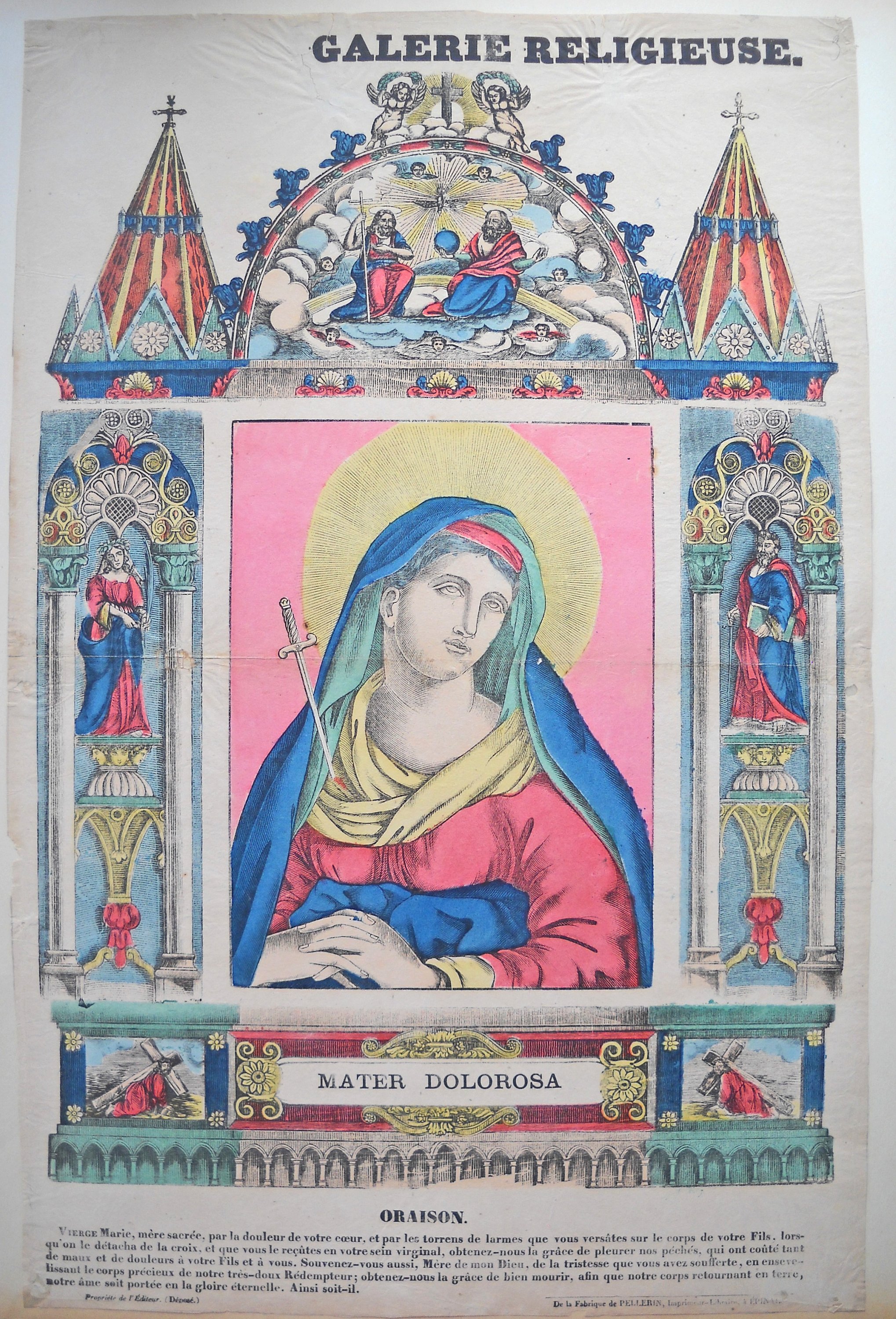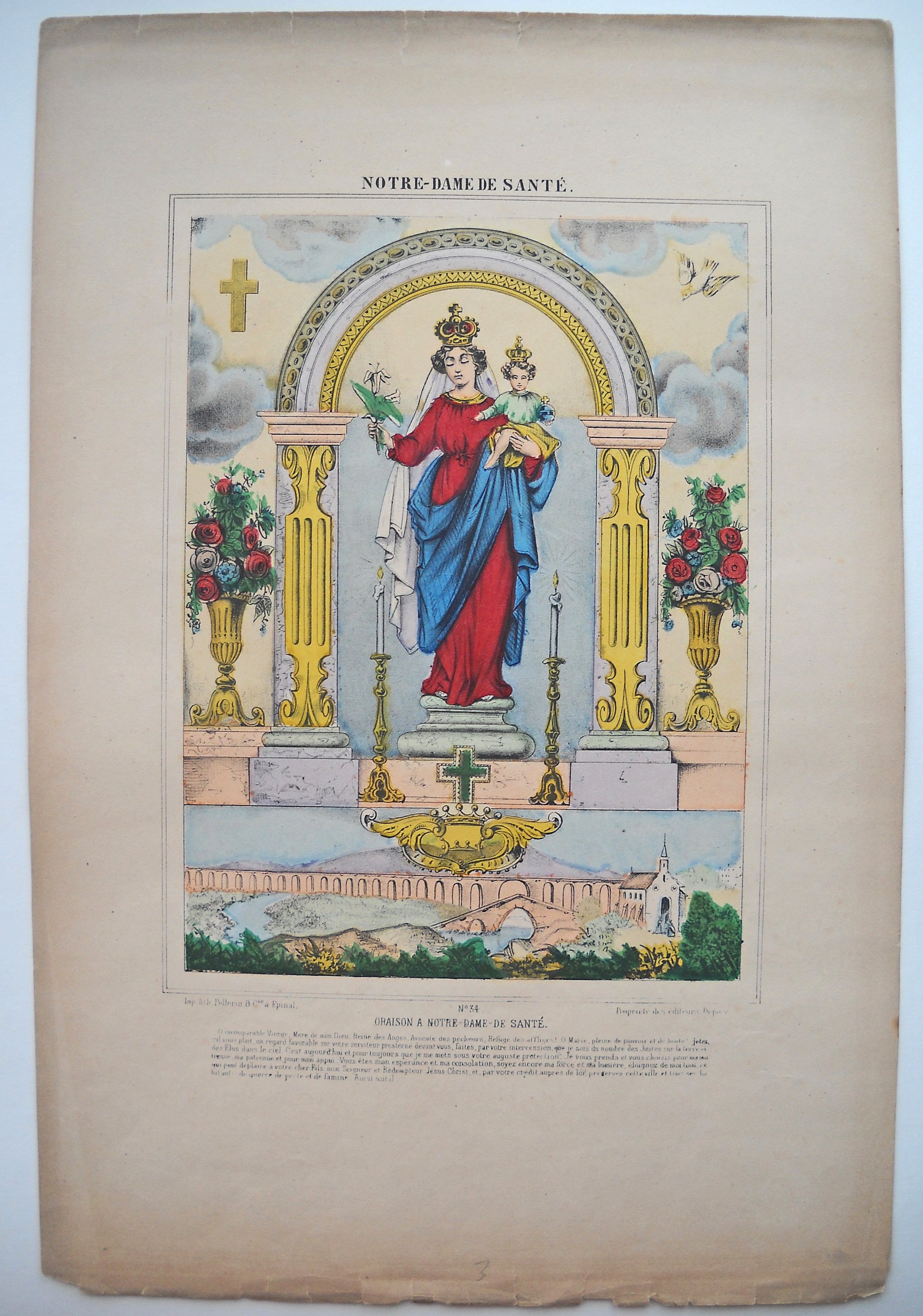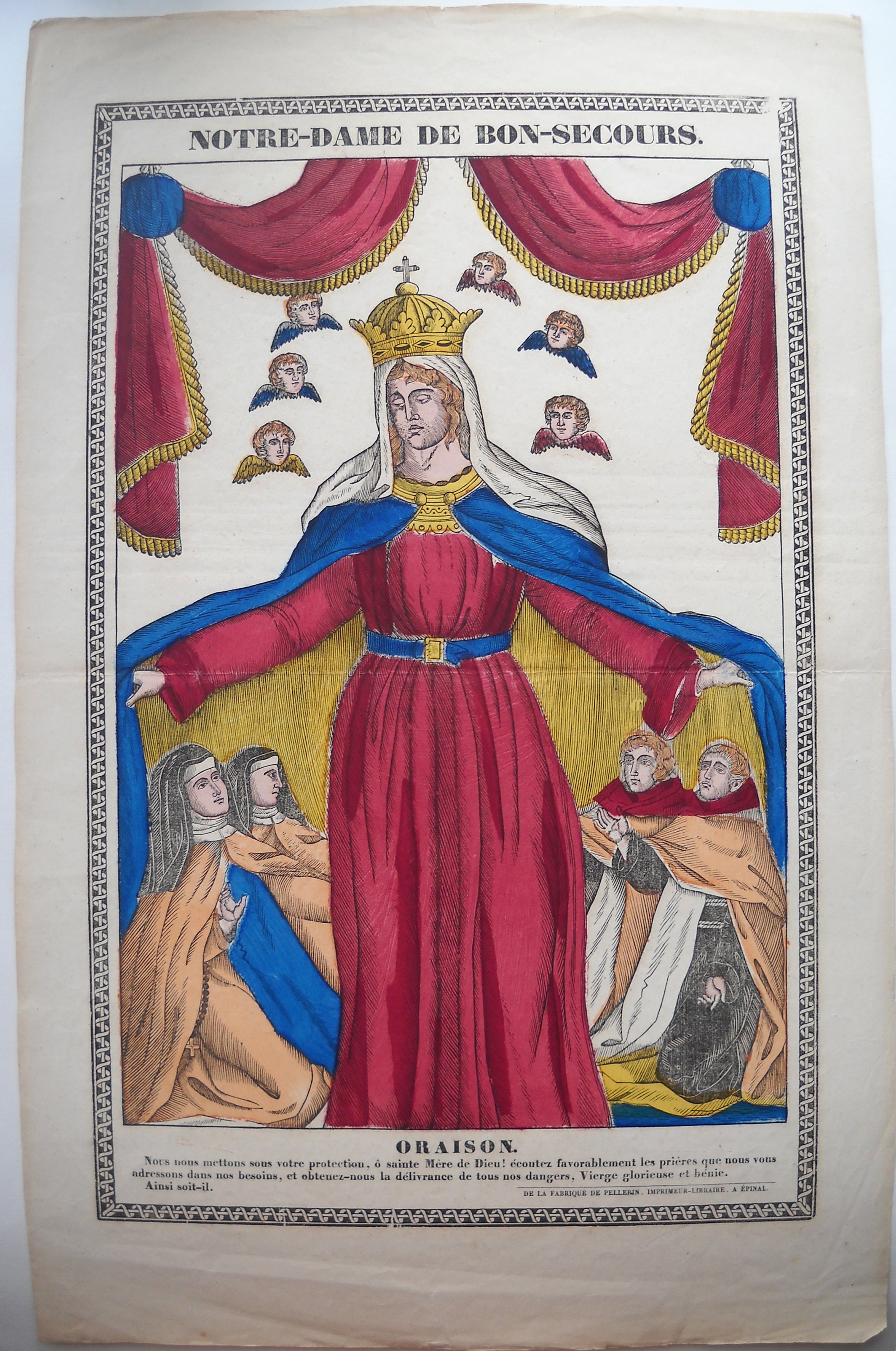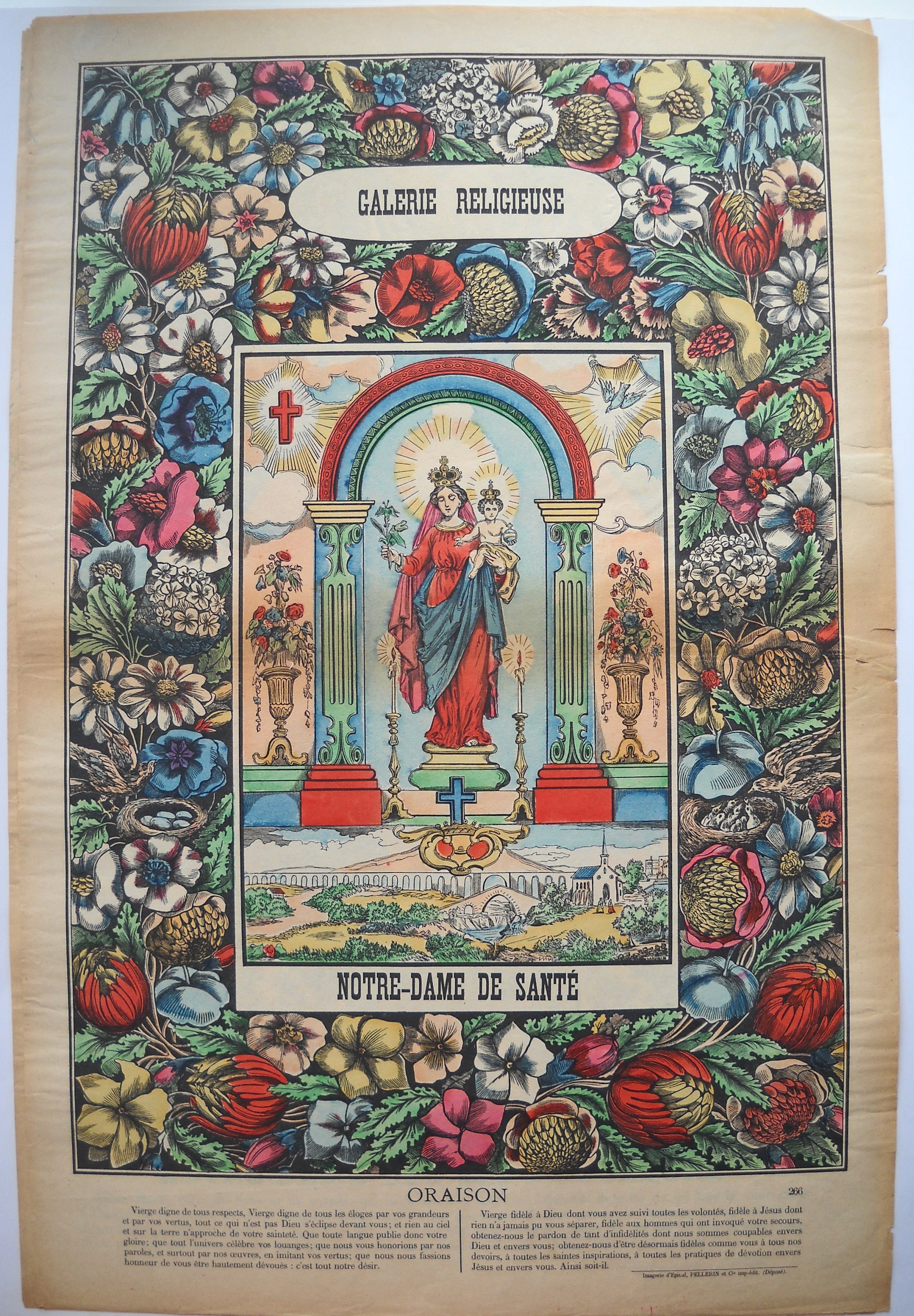 84 épreuves, gravures sur bois ou lithographies, rehaussées aux coloris de l'époque, certaines montées sur papier épais ou placées sous passe-partout, 36 grands formats et 49 petits formats, états médiocre à TTB dont " NAISSANCE DE LA Ste VIERGE " ; " MARIAGE DE SAINTE VIERGE AVEC SAINT JOSEPH " ; " L'ANNONCIATION DE LA TRES SAINTE VIERGE " ; " LE TREPASSEMENT DE LA SAINTE VIERGE " ; " L'ASSOMPTION DE LA SAINTE VIERGE " ; " MATER DOLOROSA " ; " LA REINE DES ANGES " ; " LA SAINTE VIERGE A LA CHAISE " ; " LA TRES SAINTE VIERGE " ; " NOTRE DAME DE BON-SECOURS " ; " NOTRE DAME DE BON-SECOURS DE GUINGAMP " ; " N.D. DE BONNE DELIVRANCE " ; " NOTRE DAME DES ERMITES " ; " NOTRE DAME D'ESPERANCE " ; " NOTRE DAME DE GRACE " ; " NOTRE DAME DE LIESSE " ; " NOTRE DAME DE LORETTE " ; " NOTRE DAME DU ROSAIRE " ; " NOTRE DAME DE RUMENGOL " ; " N. D. DE SALETTE " ; " NOTRE DAME DE SANTE " ; " PROCESSION DE LA Ste VIERGE " ; " LA SAINTE VIERGE AU RAISIN " ; " NOTRE DAME DU MONT-CARMEL " ; " NOTRE DAME DU PUY " ; " NOTRE DAME DE FOURVIERES " ; " MEDAILLE MIRACULEUSE " ; " APPARITION DE SAINTE VIERGE " ; " SACRE CUR DE MARIE " ; " NOTRE DAME D'AVESNIERES " ; " NOTRE DAME AUXILIATRICE " ; " LITANIES DE LA Ste VIERGE " ; " NOTRE DAME DE LUXEMBOURG " ; " N. D. DE SEPTEMBRE ". Qqs multiples.
