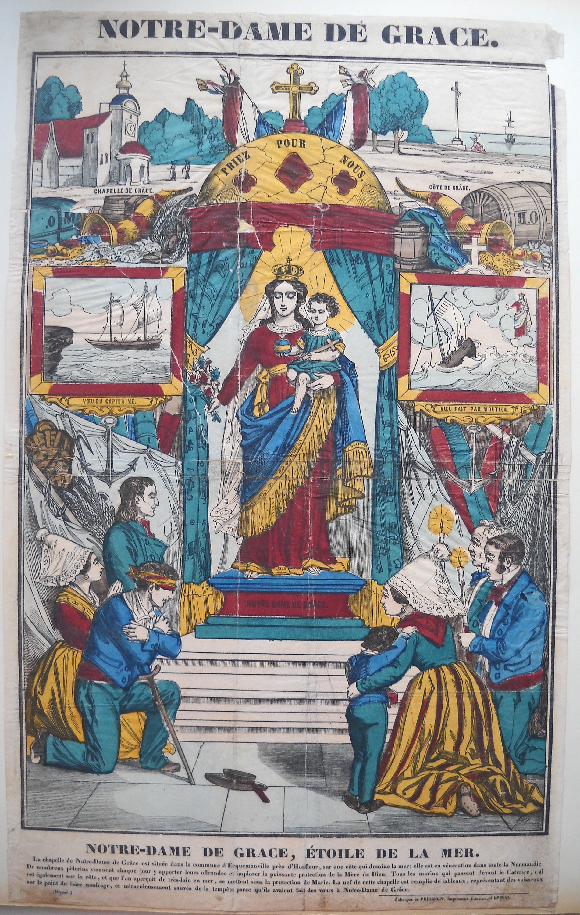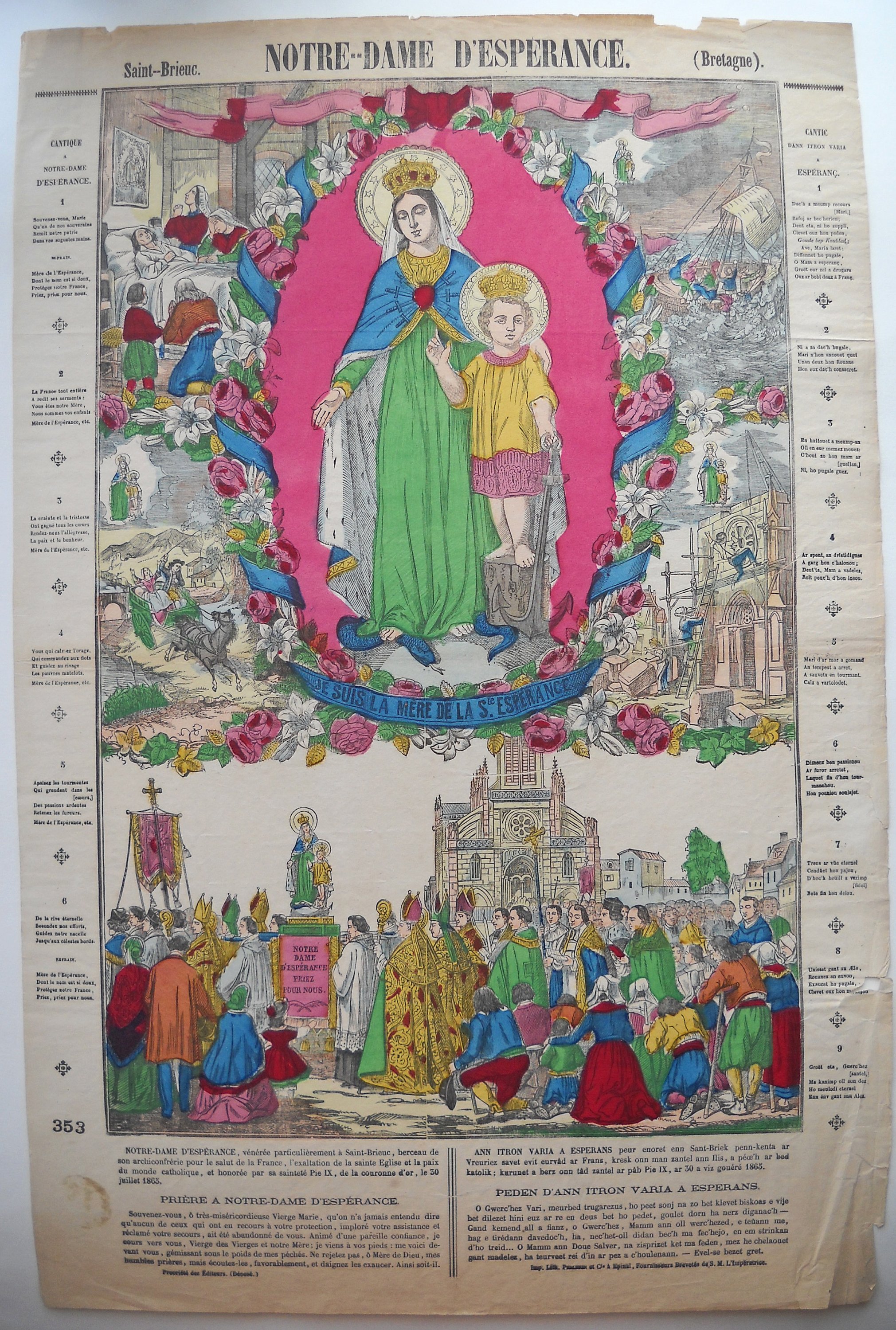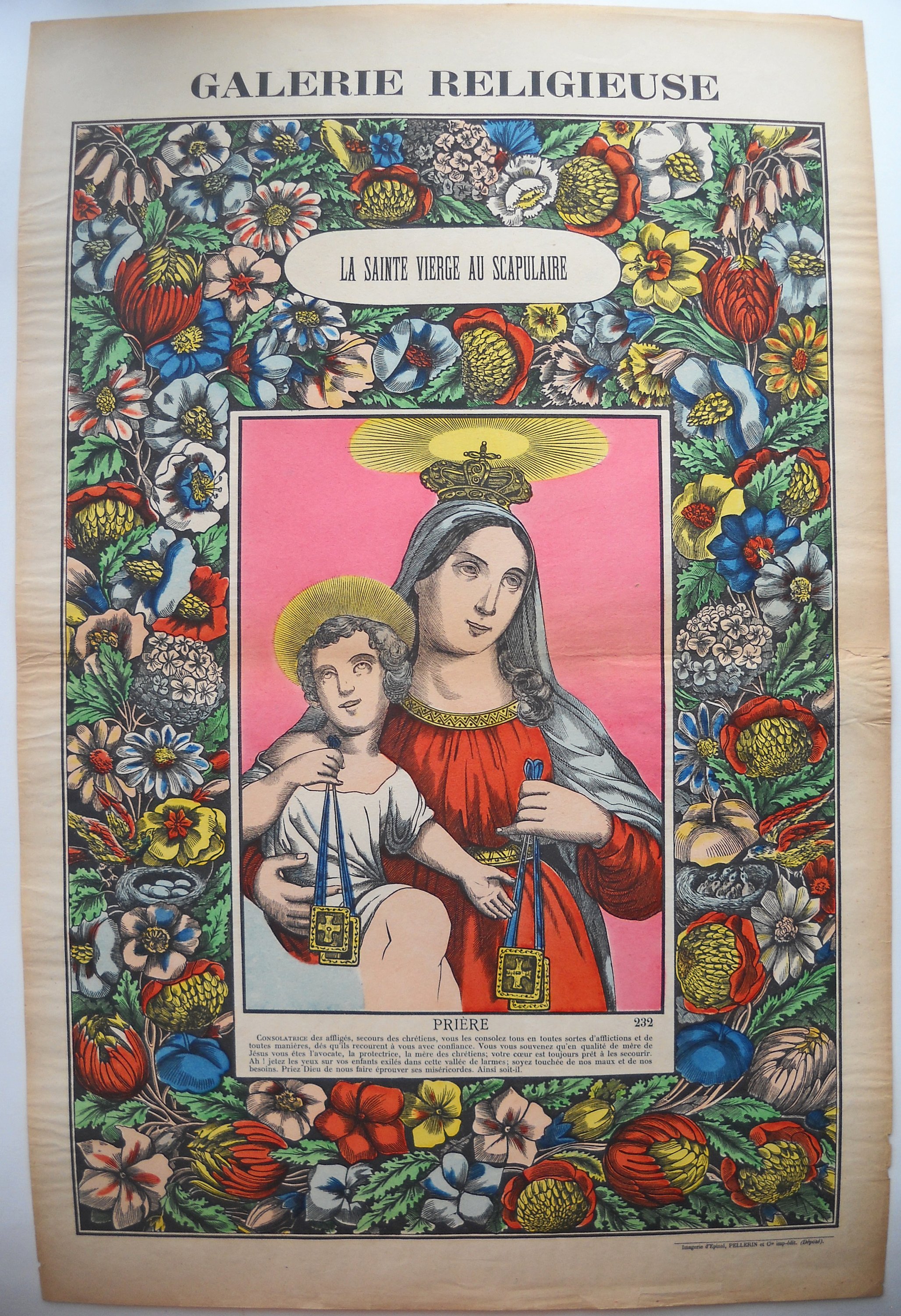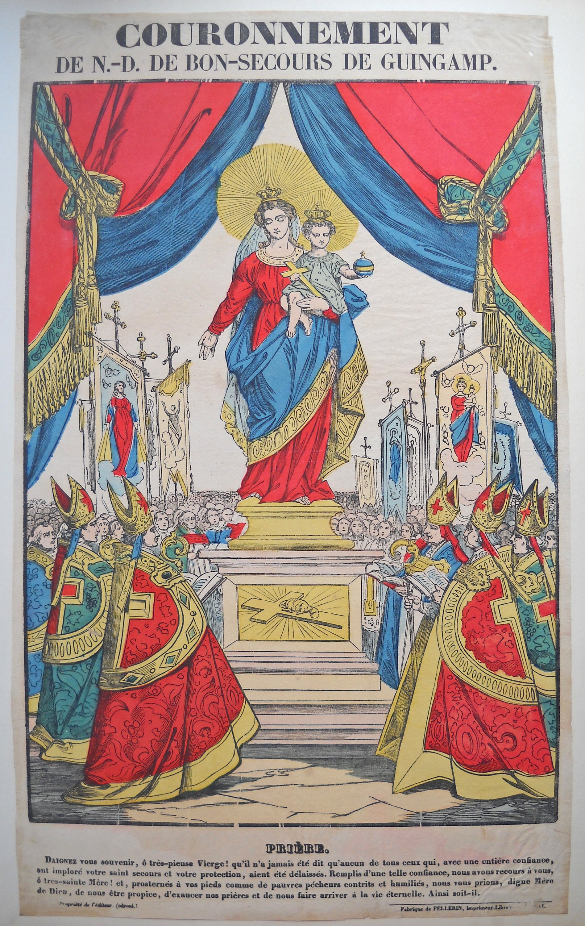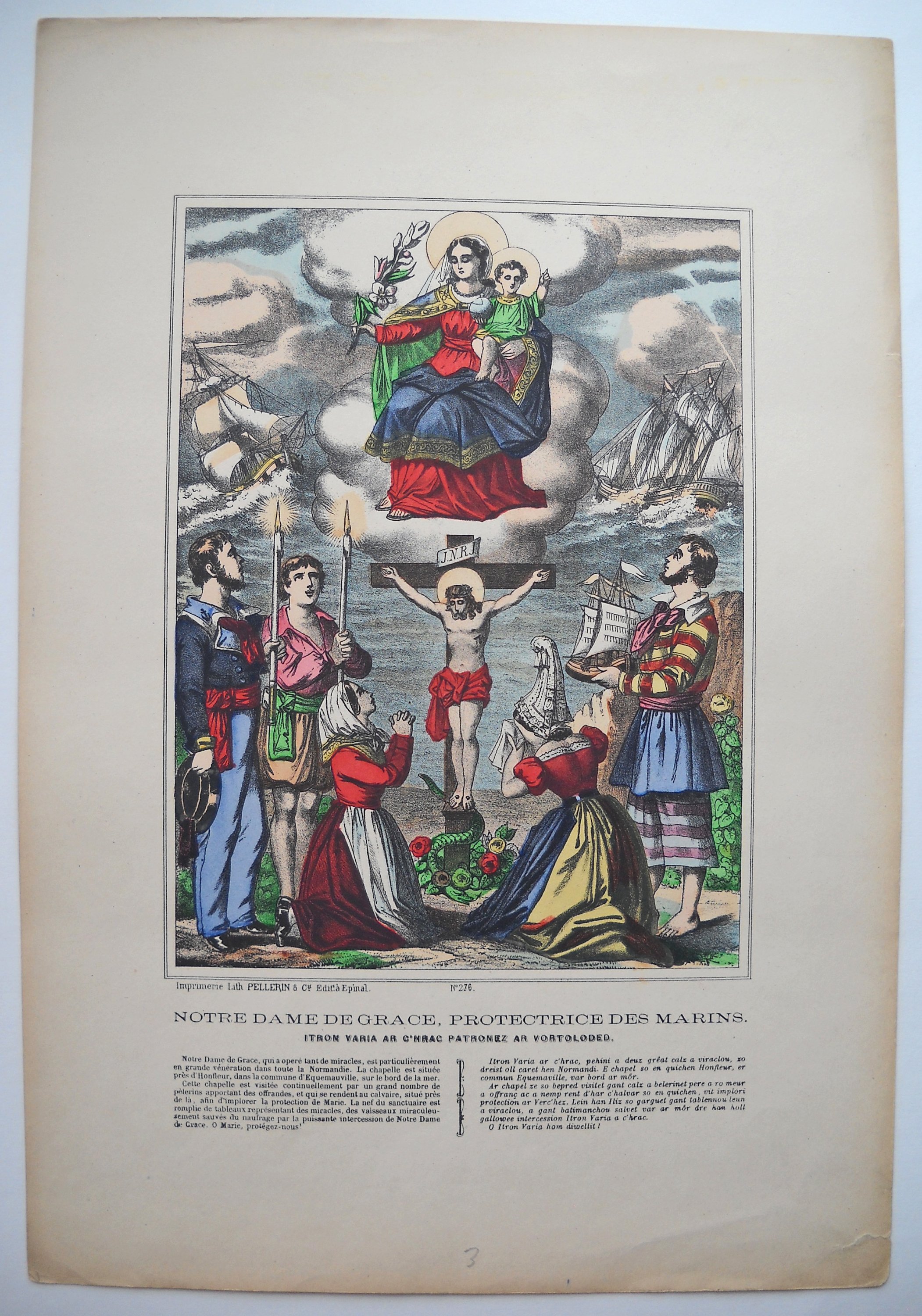 84 épreuves, gravures sur bois ou lithographies, rehaussées aux coloris de l'époque, certaines montées sur papier épais ou placées sous passe-partout, 36 grands formats et 49 petits formats, états médiocre à TTB dont " NAISSANCE DE LA Ste VIERGE " ; " MARIAGE DE SAINTE VIERGE AVEC SAINT JOSEPH " ; " L'ANNONCIATION DE LA TRES SAINTE VIERGE " ; " LE TREPASSEMENT DE LA SAINTE VIERGE " ; " L'ASSOMPTION DE LA SAINTE VIERGE " ; " MATER DOLOROSA " ; " LA REINE DES ANGES " ; " LA SAINTE VIERGE A LA CHAISE " ; " LA TRES SAINTE VIERGE " ; " NOTRE DAME DE BON-SECOURS " ; " NOTRE DAME DE BON-SECOURS DE GUINGAMP " ; " N.D. DE BONNE DELIVRANCE " ; " NOTRE DAME DES ERMITES " ; " NOTRE DAME D'ESPERANCE " ; " NOTRE DAME DE GRACE " ; " NOTRE DAME DE LIESSE " ; " NOTRE DAME DE LORETTE " ; " NOTRE DAME DU ROSAIRE " ; " NOTRE DAME DE RUMENGOL " ; " N. D. DE SALETTE " ; " NOTRE DAME DE SANTE " ; " PROCESSION DE LA Ste VIERGE " ; " LA SAINTE VIERGE AU RAISIN " ; " NOTRE DAME DU MONT-CARMEL " ; " NOTRE DAME DU PUY " ; " NOTRE DAME DE FOURVIERES " ; " MEDAILLE MIRACULEUSE " ; " APPARITION DE SAINTE VIERGE " ; " SACRE CUR DE MARIE " ; " NOTRE DAME D'AVESNIERES " ; " NOTRE DAME AUXILIATRICE " ; " LITANIES DE LA Ste VIERGE " ; " NOTRE DAME DE LUXEMBOURG " ; " N. D. DE SEPTEMBRE ". Qqs multiples.