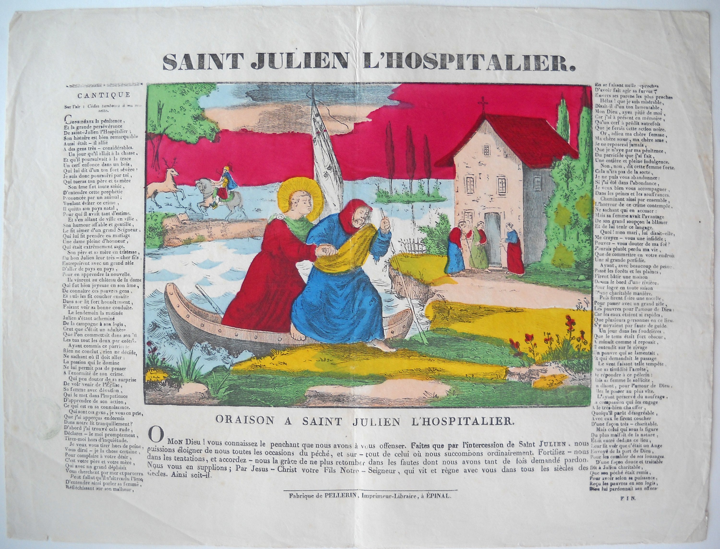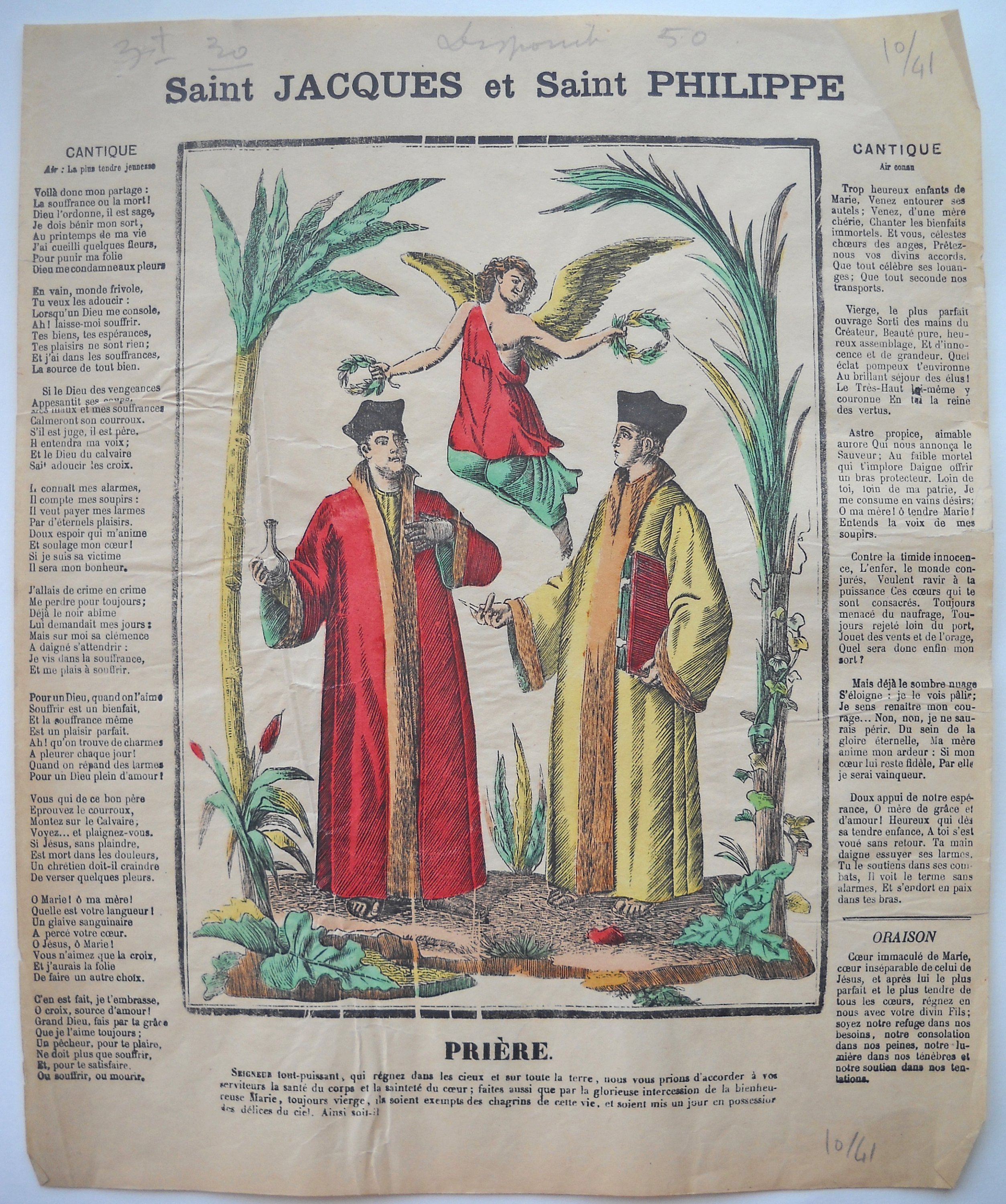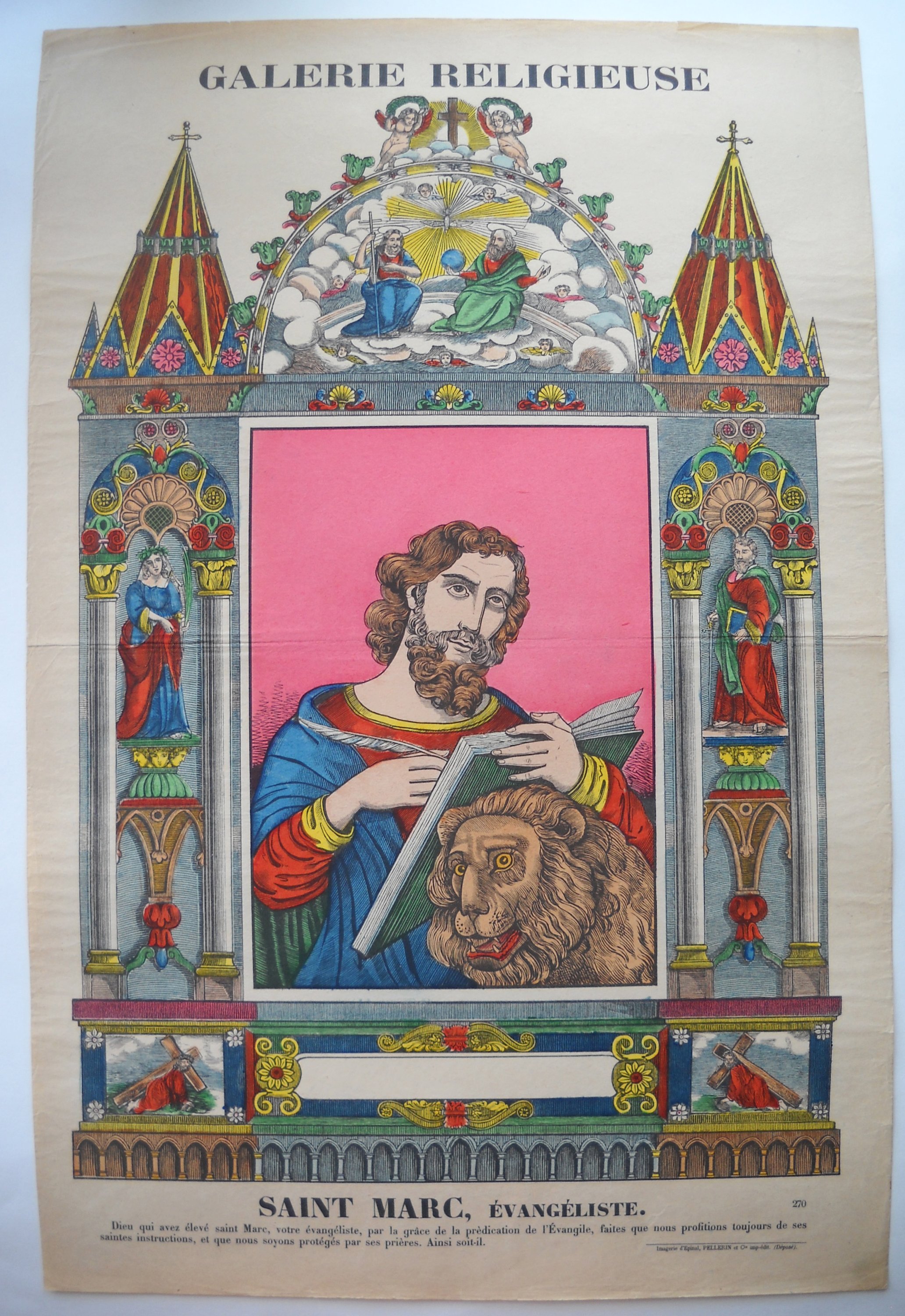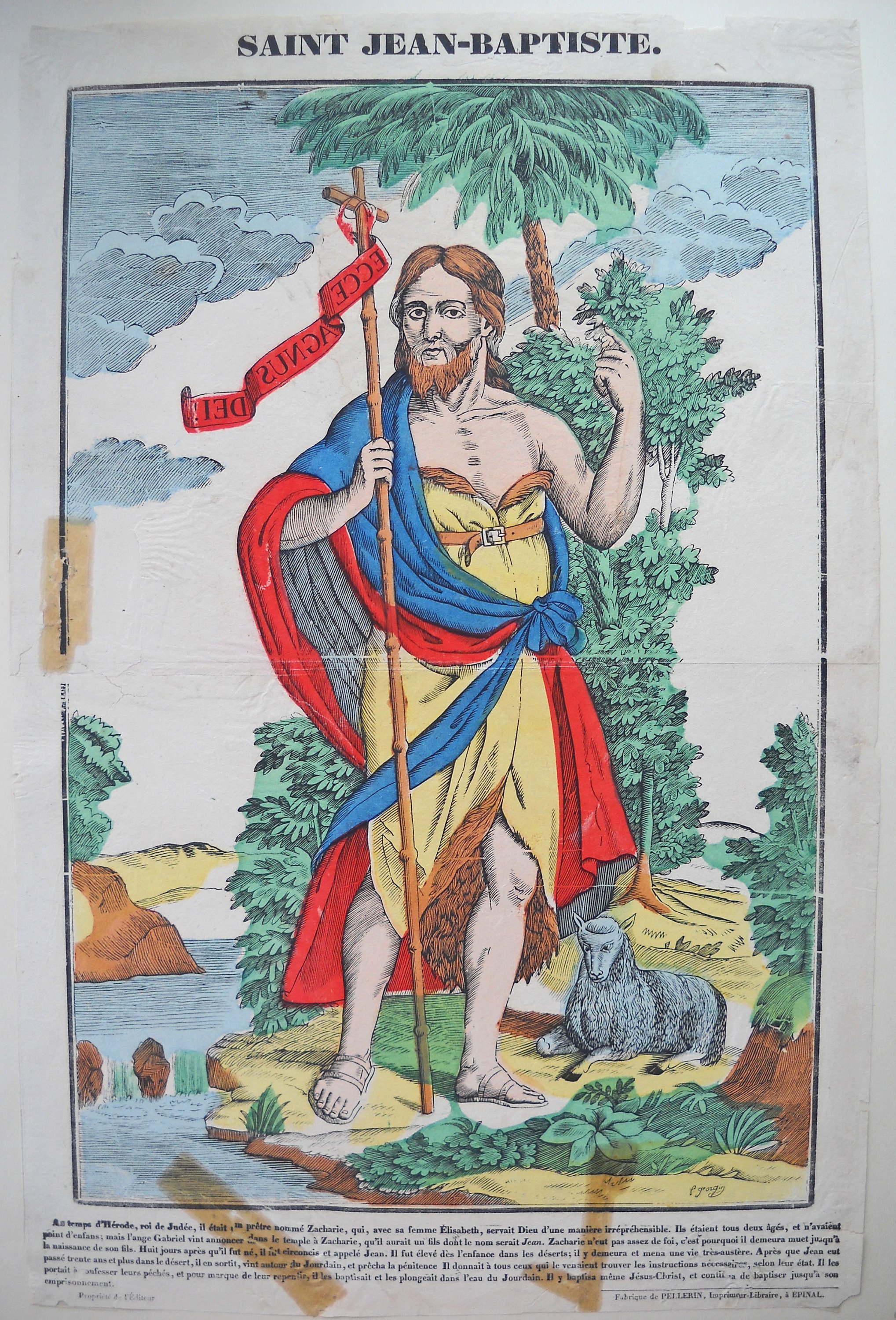 97 épreuves, gravures sur bois ou lithographies, rehaussées aux coloris de l'époque, certaines montées sur papier épais ou placées sous passe-partout, 47 grands formats et 50 petits formats, états moyen à TTB dont " L'ANGE GABRIEL " ; " SAINT ALBIN " ; " SAINT ALEXIS " ; " St ANTOINE, ERMITE " ; " SAINT ARNOULD " ; " SAINT AUGUSTIN, EVEQUE " ; " SAINT BARTHELEMY, APOTRE " ; " SAINT BERNARD " ; " St BLAISE et St GUERIN, Evêques " ; " SAINT CHARLES-BOROMEE, CARDINAL " ; " SAINT CLAUDE, ARCHEVÊQUE DE BESANCON " ; " SAINT COME ET SAINT DAMIEN " ; " Saint CORNELY " ; " St CREPIN et CREPINIEN " ; " SAINT DONAT, MARTYR " ; " SAINT ELOI " ; " St ETIENNE, PREMIER MARTYR " ; " SAINT FIACRE " ; " SAINT FRANCOIS REGIS " ; " SAINT FRANCOIS DE SALES " ; " SAINT GEORGES, MARTYR " ; " SAINT GERVAIS ET SAINT PROTAIS " ; " SAINT GREGOIRE, PAPE " ; " SAINT HENRY, EMPEREUR " ; " SAINT HONORE " ; " SAINT ISIDORE, PATRON DES LABOUREURS " ; " Saint JACQUES et Saint PHILIPPE " ; " SAINT JACQUES LE MAJEUR " ; " DECOLLATION DE SAINT JEAN BAPTISTE " ; " SAINT JEAN BAPTISTE ENFANT " ; " LE PETIT St JEAN BAPTISTE " ; " SAINT JEAN-BAPTISTE " ; " SAINT JOSEPH " ; " SAINT JULIEN " ; " SAINT JULIEN L'HOSPITALIER " ; " SAINT LAMBERT " ; " SAINT LAURENT, MARTYR " ; " SAINT LEON, PAPE " ; " SAINT LOUIS, ROI " ; " SAINT LOUIS DE GONZAGUE " ; " SAINT LUC EVANGELISTE " ; " SAINT MARC, PAPE " ; " SAINT MARC, EVANGELISTE " ; " SAINT MARTIN, EVEQUE " ; " SAINT MATHIEU, EVANGELISTE " ; " SAINT MATHURIN " ; " SAINT MAURICE ET SES COMPAGNONS " ; " LE BIENHEUREUX ET VENERABLE / P. MONFORT MISSIONNAIRE " ; " SAINT PAUL, APOTRE " ; " SAINT PIERRE, APOTRE " ; " SAINT PIERRE FOURIER DE MATTAINCOURT " ; " SAINT REMY, EVEQUE DE REIMS " ; " SAINT RENE, EVEQUE " ; " SAINT ROCH " ; " SAINT PIERRE & SAINT PAUL, APOTRES " ; " SAINT STANISLAS DE KOSTKA " ; " SAINT THOMAS " ; " SAINT YVES, DE TREGUIER ". Qqs multiples.