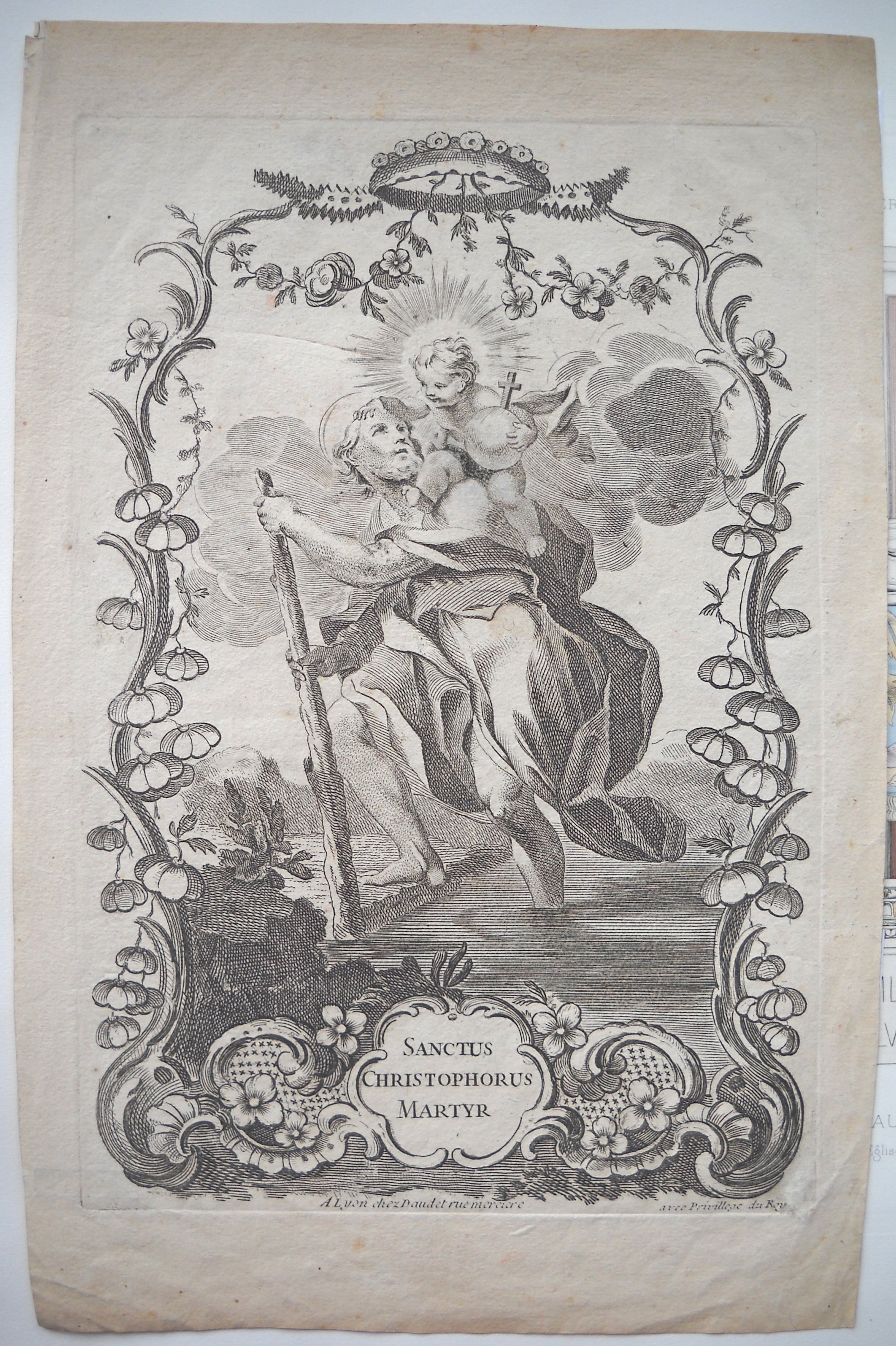A Lion chez Daudet Graveur ", gravure en taille-douce sur papier vergé, entre 1725 et 1760, 44 x 38 cm (petits déf.) - " SANCTUS CHRISTOPHORUS MARTYR