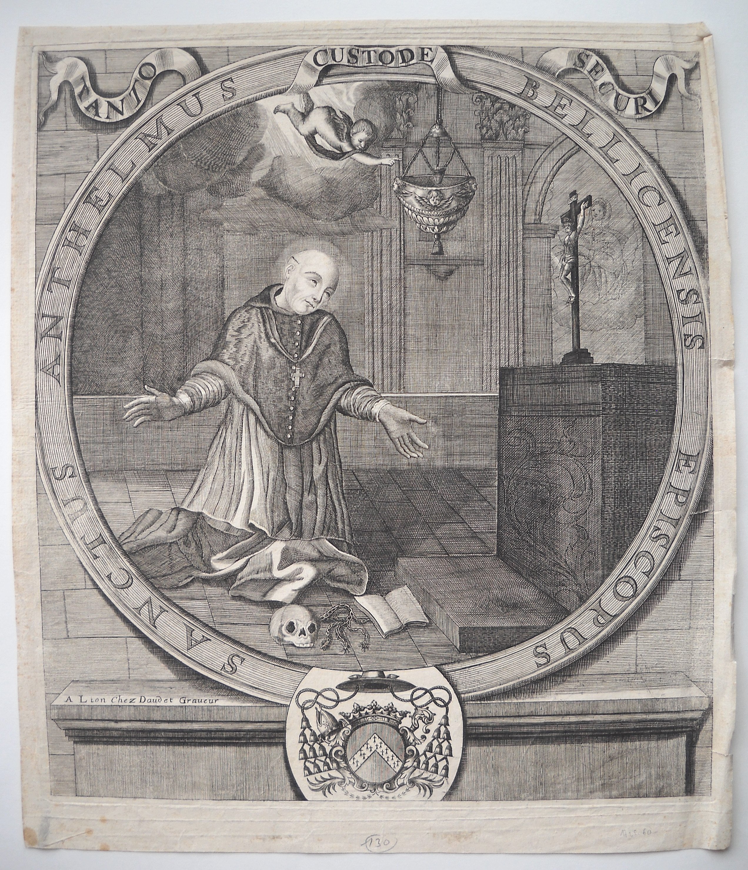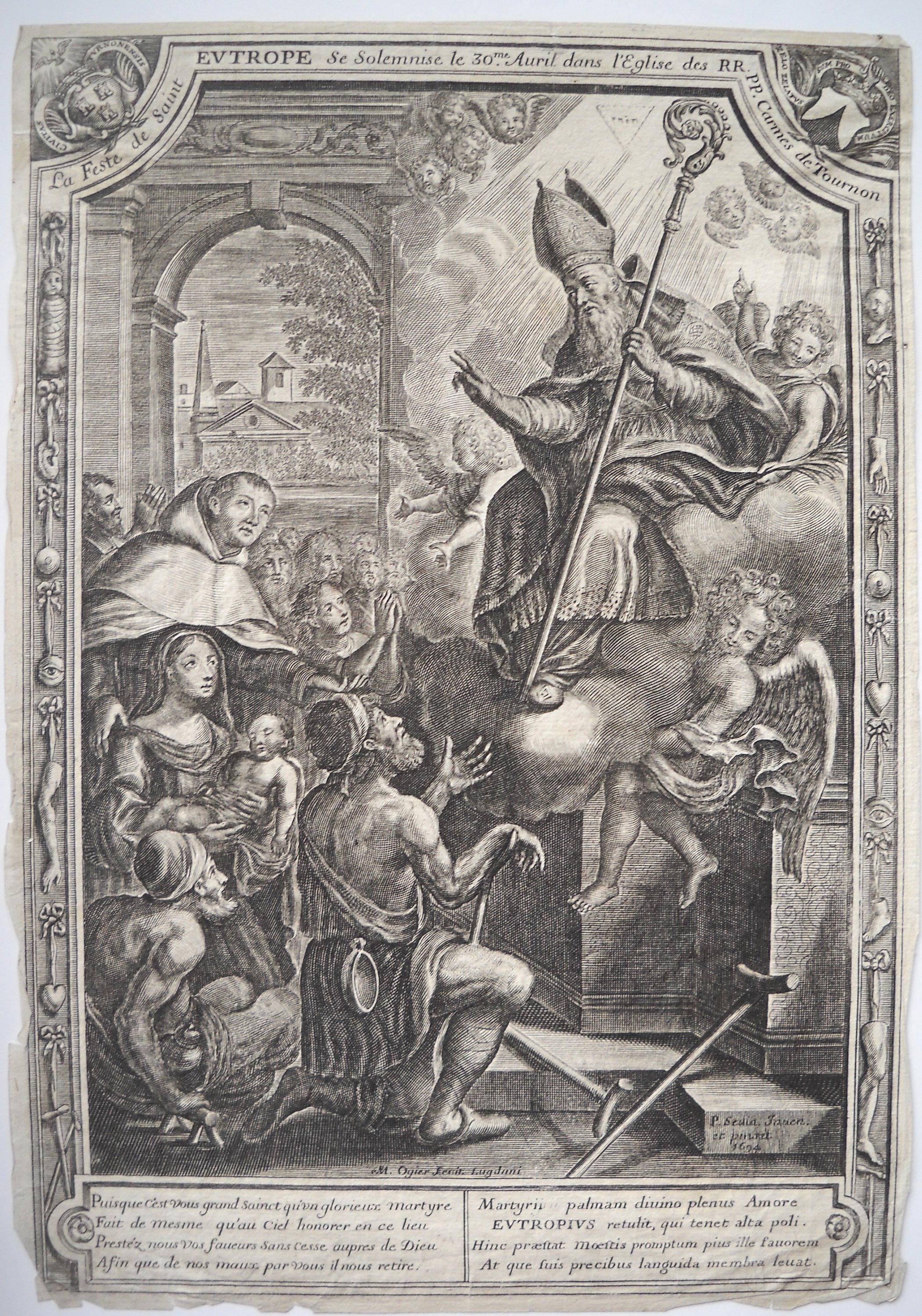 5 estampes, gravées en taille-douce sur papier vergé, certaines placées sous passe-partout ou contrecollées sur carton épais : " La Feste de Saint EUTROPE se solennise le 30me Avril dans l'Eglise des RR PP Carmes de Tournon " [Tournon-sur-Rhône], gravure en taille-douce par Pierre OGIER, peintre et graveur en activité à Lyon de 1676 à 1710, 35 x 24 cm - " SANCTUS ANTHELMUS