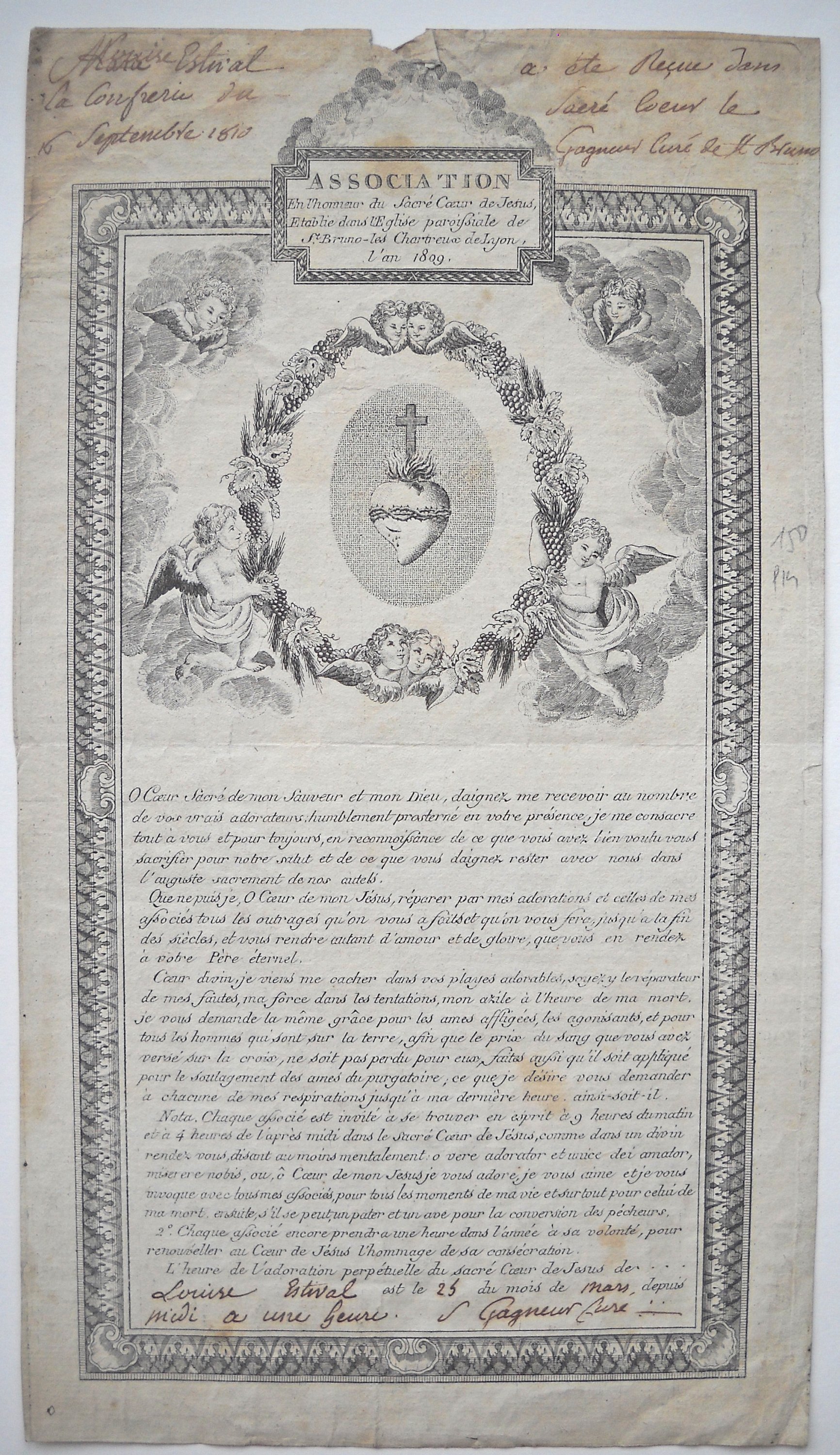 Paris, chez Gentot rue Saint Jacques ", [Lambert Gentot, graveur à Lyon], XVIIIe siècle, 30,5 x 21,5 cm - Image de confrérie de l'association du Sacré-Cur de Jésus en l'église paroissiale de St Bruno les Chartreux à Lyon, début XIXe s., 36 x 20 cm.