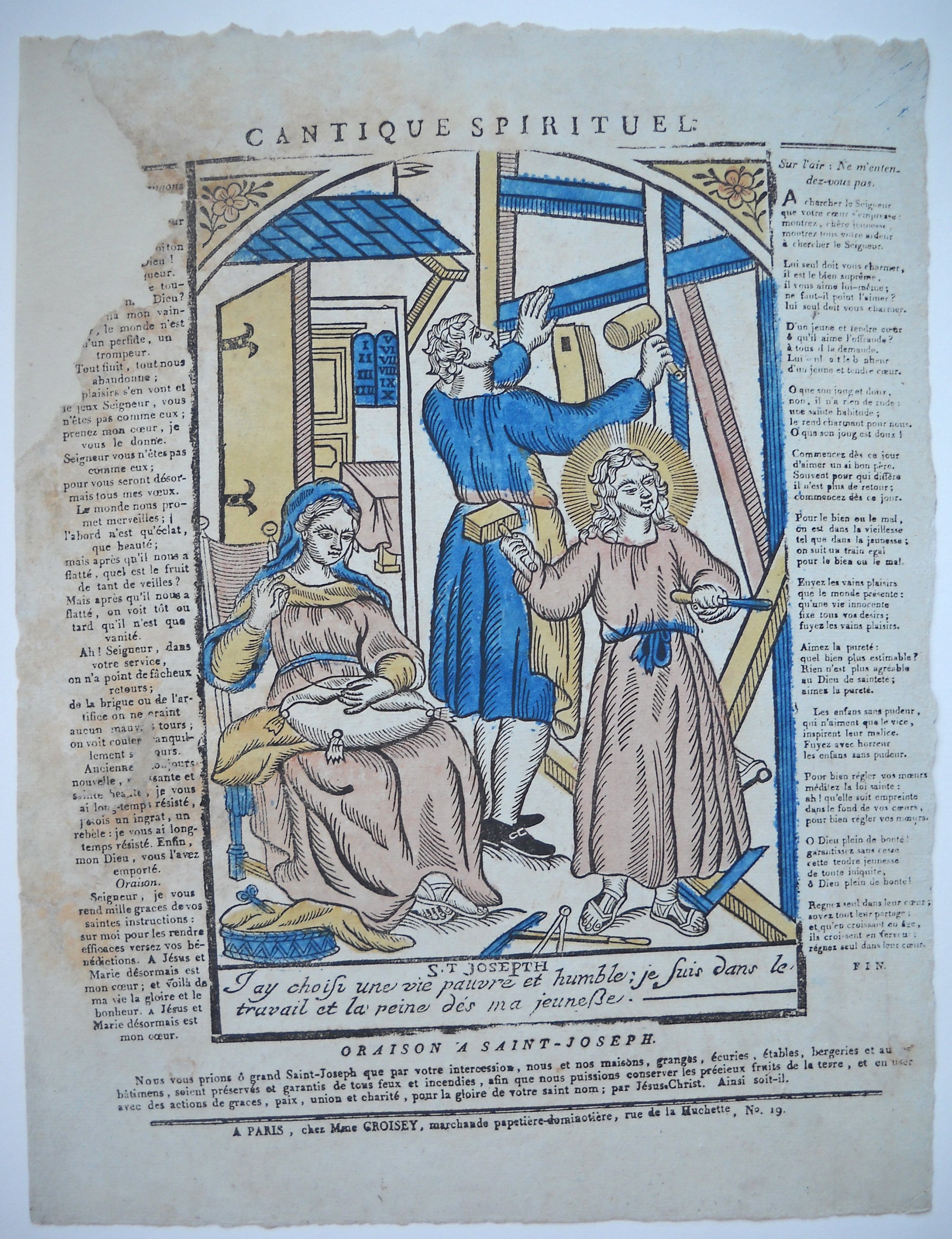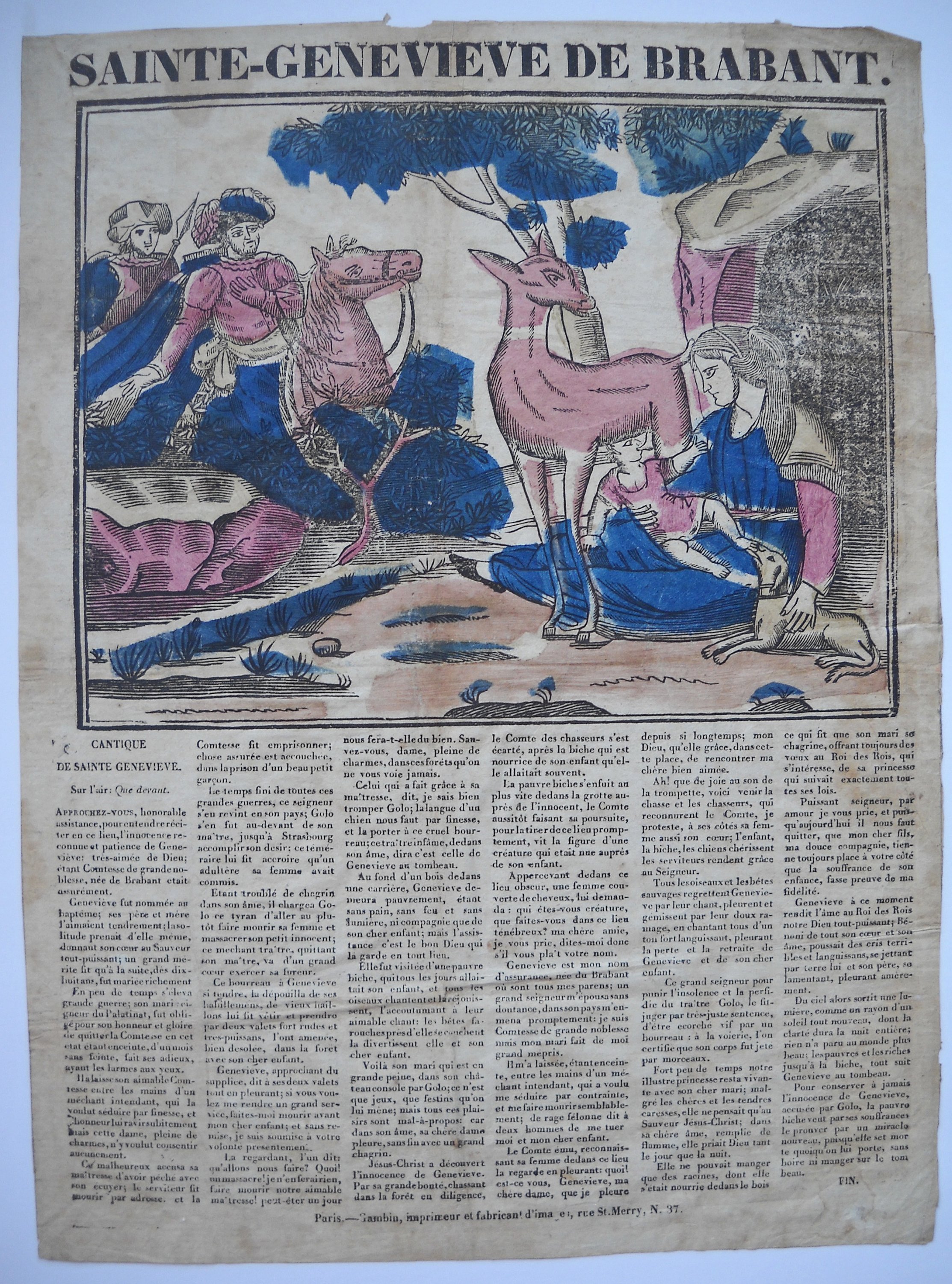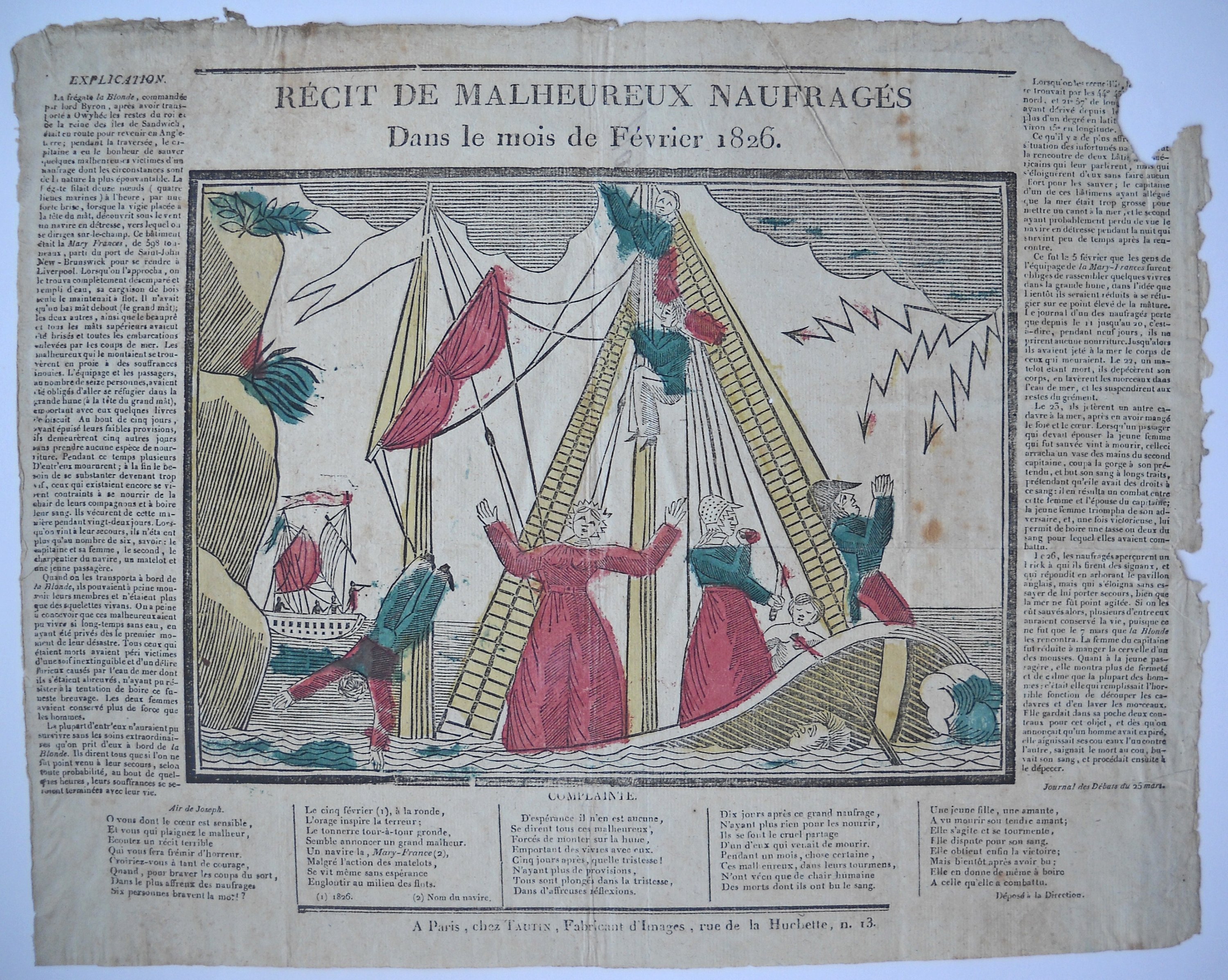 5 épreuves, gravure sur bois sur papier vergé, coloris d'époque, certaines placées sous passe-partout dont 3 p. éditées " A PARIS, chez Mme CROISEY, Marchande Papetière, rue de la Huchette, N°19 ",: " LES VOIX DE LA FRANCE EXAUCÉS " 37,5 x 30 cm ; " SAINT-SPIRE " 41 x 30 cm (manques et rest.) - ; " St JOSEPTH " 40 x 30 cm (manques et rest.) - " SAINTE-GENEVIEVE DE BRABANT " " Paris - Gambin, imprimeur et fabricant d'images, rue St Merry, N°37 ", 38 x 28 cm - " RECIT DE MALHEUREUX NAUFRAGÉS / Dans le mois de Février 1826 " " A Paris, chez TAUTIN, Fabricant d'images, rue de la Huchette, n.13 ", bel exemplaire de " canard " qui décrit une scène d'anthropophagie et de vampirisme à la suite d'un naufrage, 30 x 38 cm (manque). Rare.