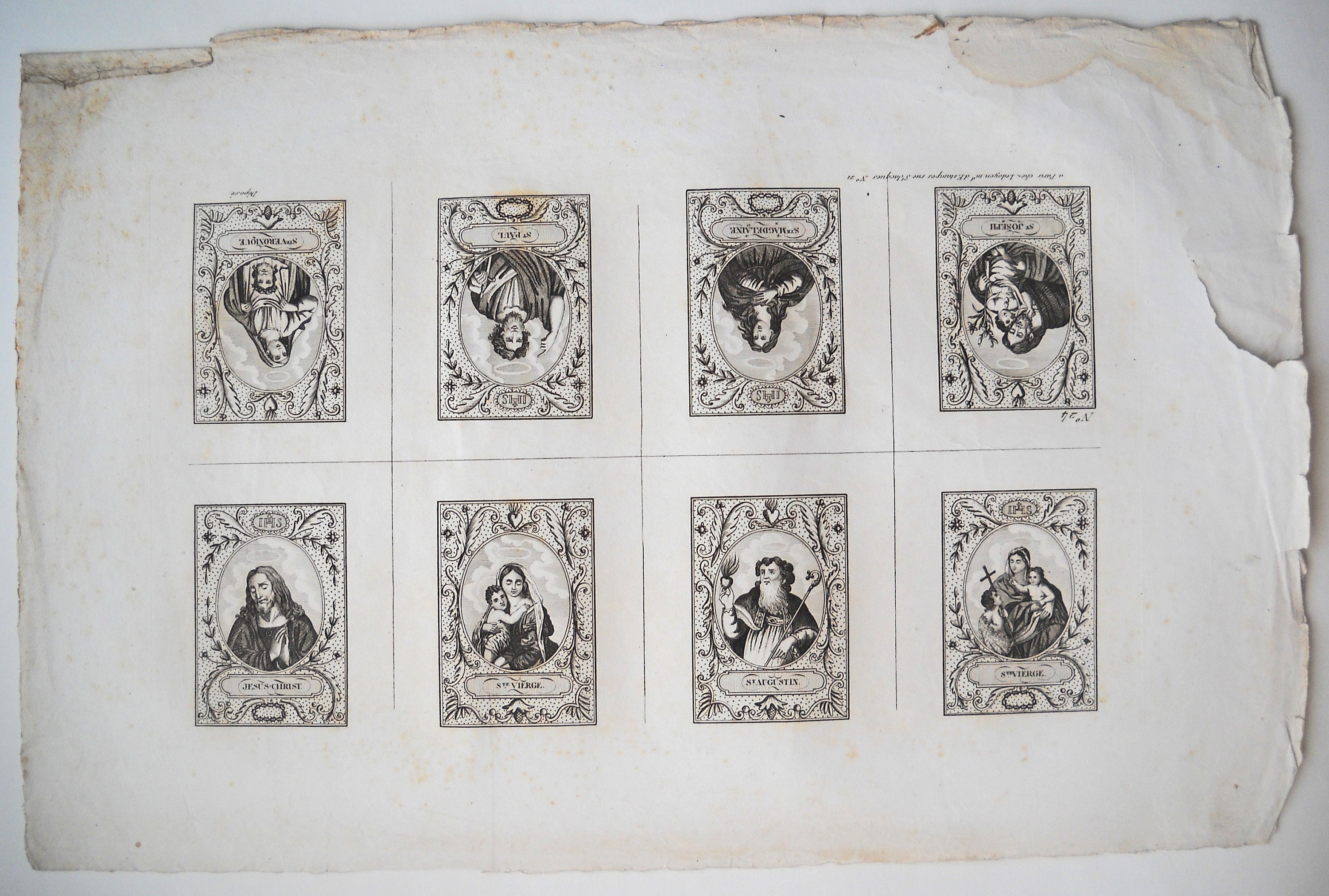 24 estampes gravées en taille-douce ou au pointillé, env. 48 x 30 cm, dont 7 p. rehaussées au coloris d'époque : " ECCE HOMO " ; " SAINT ETIENNE PREMIER MARTYR " ; " LA NAISSANCE DU SAUVEUR DU MONDE " - 21 planches à compartiments de saintetés, de personnages et de scènes bibliques dont 4 rehaussées au coloris d'époque.