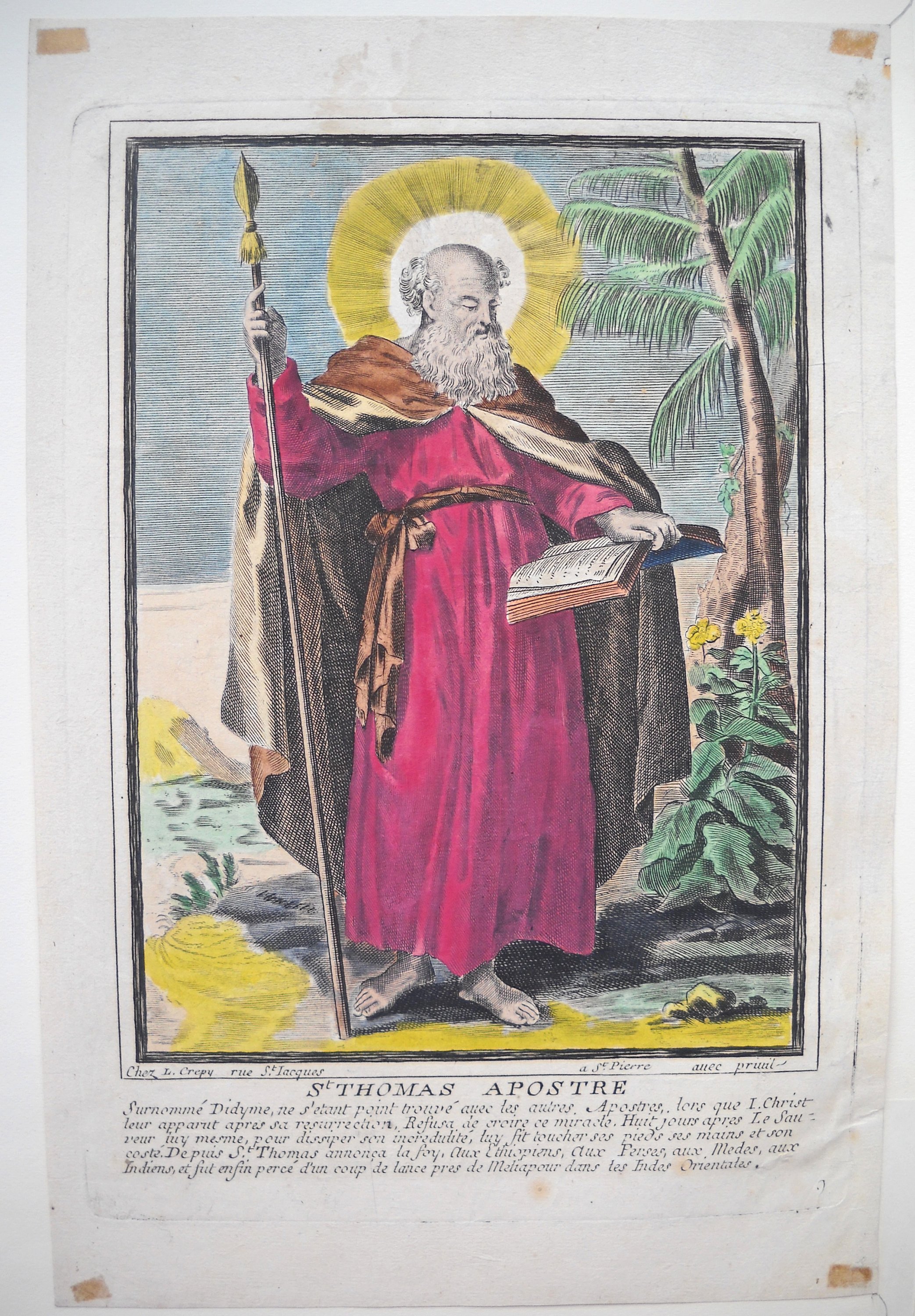 Réunion de 40 estampes, gravées en taille-douce sur papier vergé ou vélin, en majorité rehaussées de coloris d'époque, la plupart placées sous passe-partout ou contrecollées sur carton épais, éditeurs divers : de POILLY " La Visitation de la Ste Vierge ", fin XVIIe s., 40 x 27 cm - NOLIN " Saint Fursy ses actions et principaux miracle ", c. 1682, 51 x 36 cm - Henry II BONNART " DONNER A BOIRE A CEUX QUI ONT SOIF ", fin du XVIIe s., 33 x 22 cm (en l'état) - Famille BASSET, 10 p., XVIIIe et début du XIXe s. : " St FRANCOIS DE PAULE ", 39,5 x 24 cm ; " St JEAN APOTRE ", 33,5 x 21,5 cm (en l'état) ; " St THOMAS APÔTRE DES INDES ", 41,5 x 27 cm ; " NOTRE DAME DE LILLE ", 43 x 26,5 cm ; " S. JOACHIM EPOUX DE Ste ANNE ", 34,5 x 21,5 cm ; " St SIMON ET St JUDES APÔTRES ", 42,5 x 26,5 cm ; 2 ex. " Représentation de la Croix plantée à Compiègne Paroisse Saint Antoine ", 43 x 26,5 cm ; " Ste CHRISTINE ", 40 x 27 cm ; " S. Fernando Roy d'Espana ", 34 x 23,5 cm - C. GUERARD " St DENIS ET SES COMPAGNONS ", avant 1750, 36,5 x 23,5 cm - Michel CORRETTE (rue Montorgueil à la Croix d'Argent) " St Pierre ", après 1754, 18,5 x 24,5 cm (en l'état) - Jacques CHEREAU, 2 p., entre 1720 et 1769 : " Ste Barbe Vierge et Martyre ", 37,5 x 25,5 cm ; " Maria Virgini Contemplanti ", 27,5 x 21,5 cm - DAUMONT : " Représentation de l'image miraculeuse de Notre Dame de Bon Secours ", avant 1775, 31 x 22,5 cm - MONDHARE, 2 p., milieu du XVIIIe s., " RADIX JESSE ", 29 x 19,5 cm ; " PORTRAIT DE NOTRE SEIGNEUR JESUS Christ ", 34,5 x 22,5 cm - Louis CREPY, 3 p., milieu du XVIIIe s. : " St THOMAS APOSTRE " ; " St SIMON APOSTRE " ; " St IVIDE APOSTRE ", 34,5 x 22,5 cm - Jacques CHIQUET, 3 p., avant 1768 : " La Magdeleine quittant les habits du Monde ", 37,5 x 25,5 cm ; " Saint Joseph ", 25 x 20 cm ; " Saint André Apostre ", 25,5 x 20,5 cm - JEAN " HISTOIRE DE SAMSON ", début XIXe s., 27,5 x 41,5 cm - JAGOT " L'IMMACULEE CONCEPTION ", vers 1800, 39 x 26 cm - François BONNEVILLE, 2 p., avant 1805 : " L'EXCELLENT POURVOYEUR ", 35,5 x 24 cm ; " LE St PERE LE PAPE PIE VII ", 30,5 x 21 cm - GENTY " St AUGUSTIN ", avant 1818, 38 x 26 cm - etc.