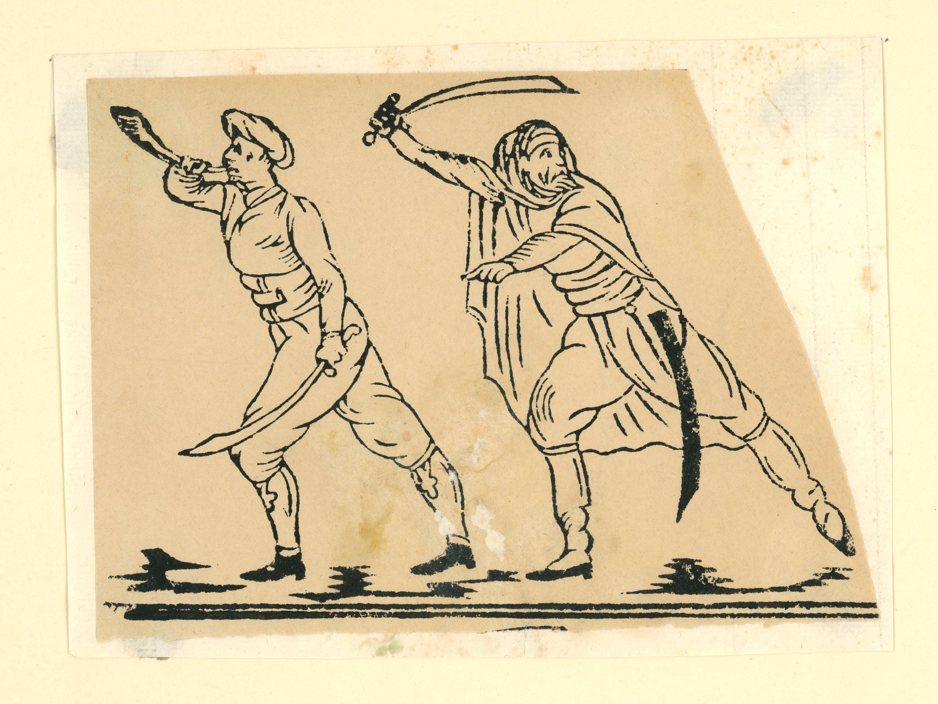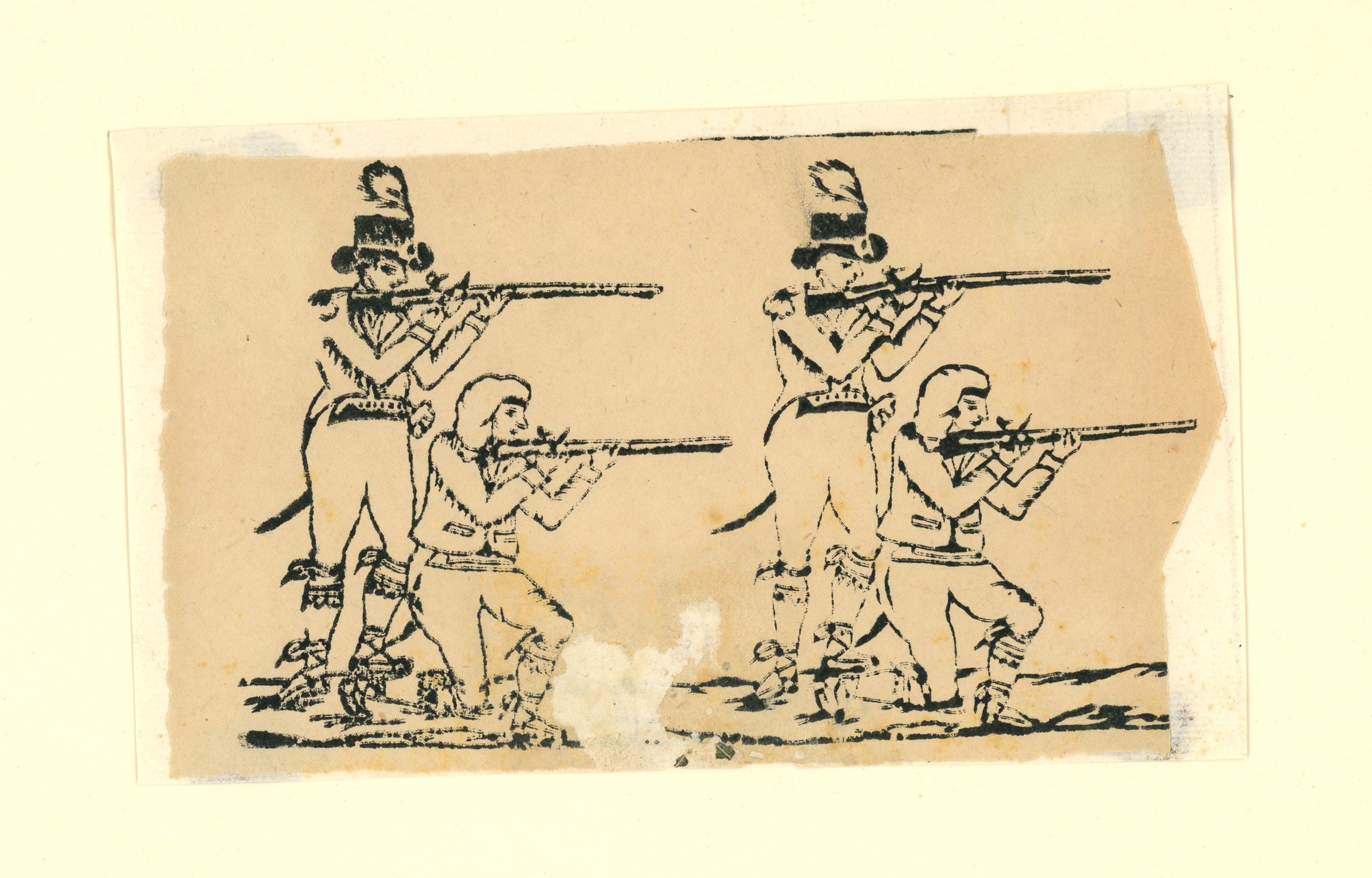 10 épreuves, gravures sur bois, contrecollées sur carton épais, à décor de scènes ou fragments de scènes animées, certaines légendées : groupes de grognards napoléoniens ; soldats anglais ; cavalier ; " Los minds con el maestro en el campo " ; " Alanos " ; " I.H.S. ". Formats in-12 et in-8, états divers.