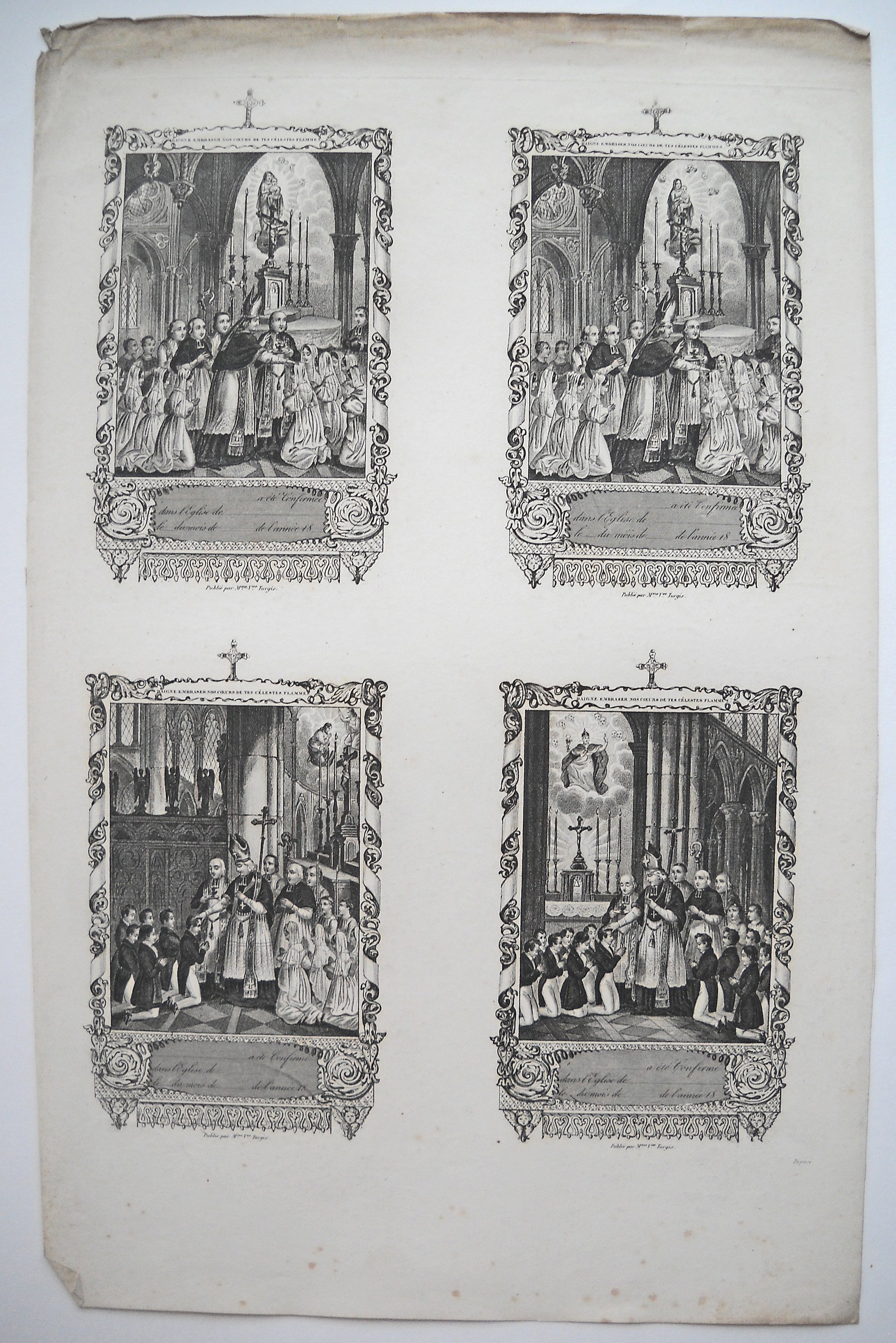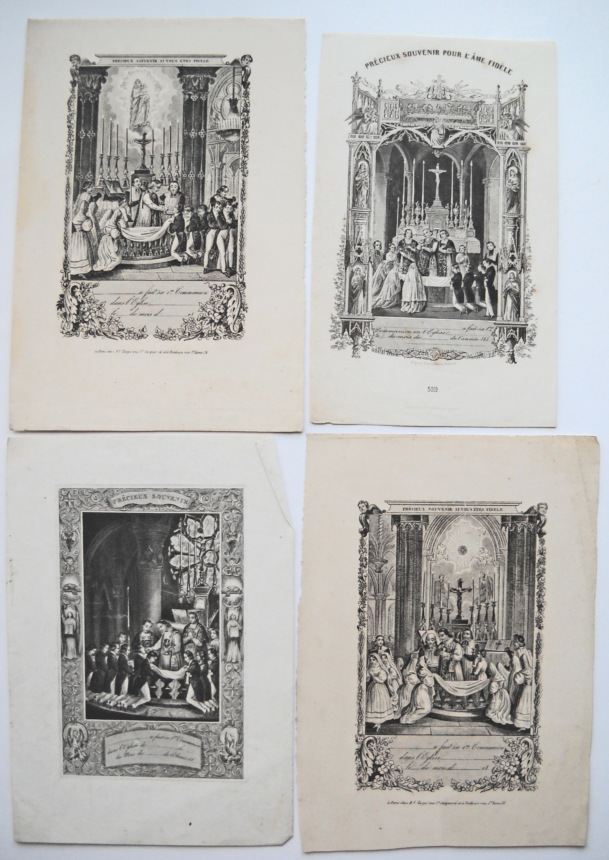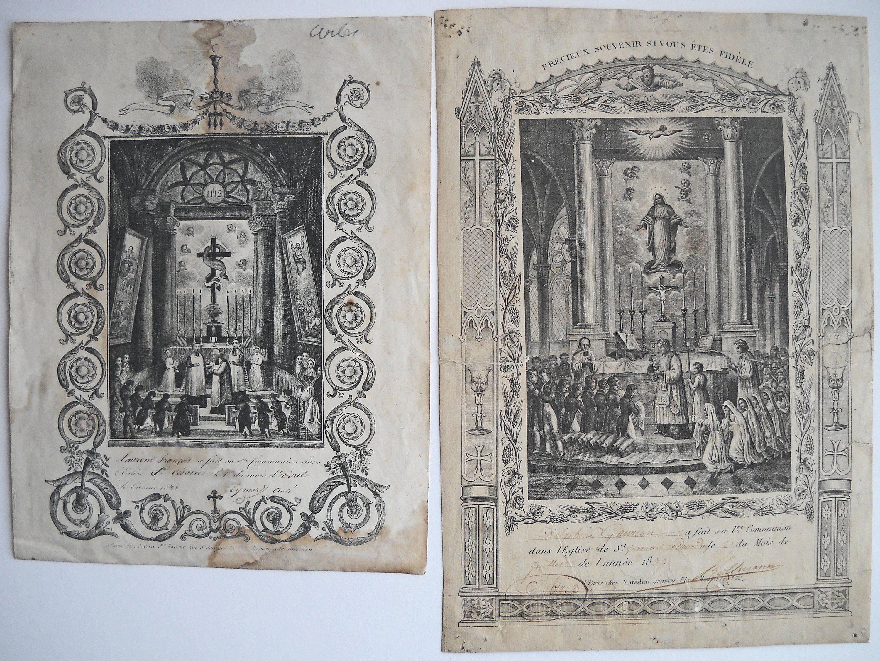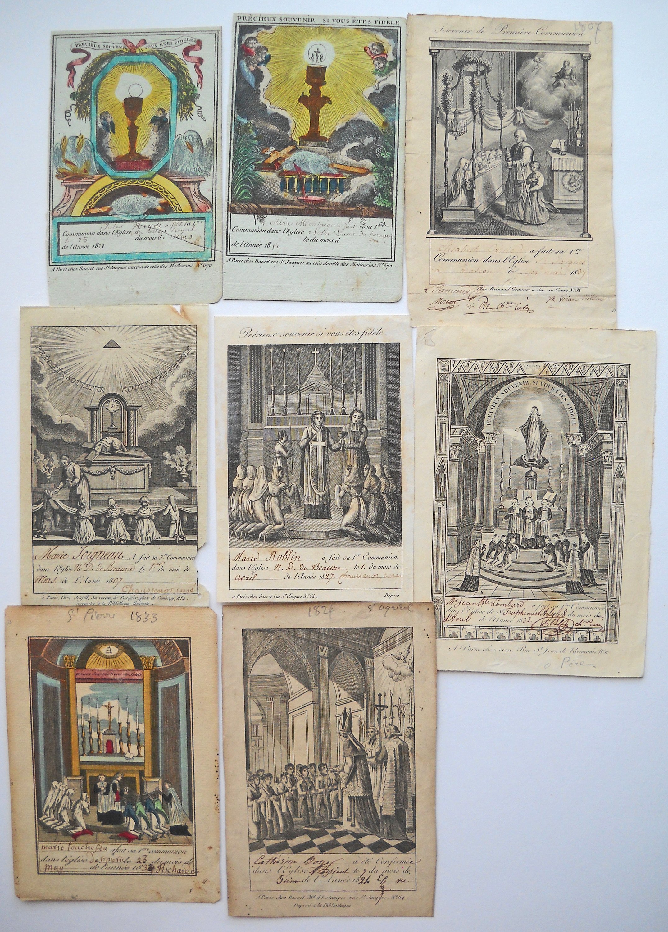 Lot de + de 105 documents divers dont 4 fragments de manuscrits, XIV ou XVe siècles, sur parchemin - 78 " Souvenir de communion ", XIXe et XXe siècles, tous formats - 2 certificats de confession à la basilique Saint Pierre de Rome, 1773 - Affiche de l'église paroissiale de Notre Dame Saint Vincent de Lyon, 71 x 54 cm - Page manuscrite de St Alphonse Marie de Liguori (1696-1787), canonisé en 1839 - etc.