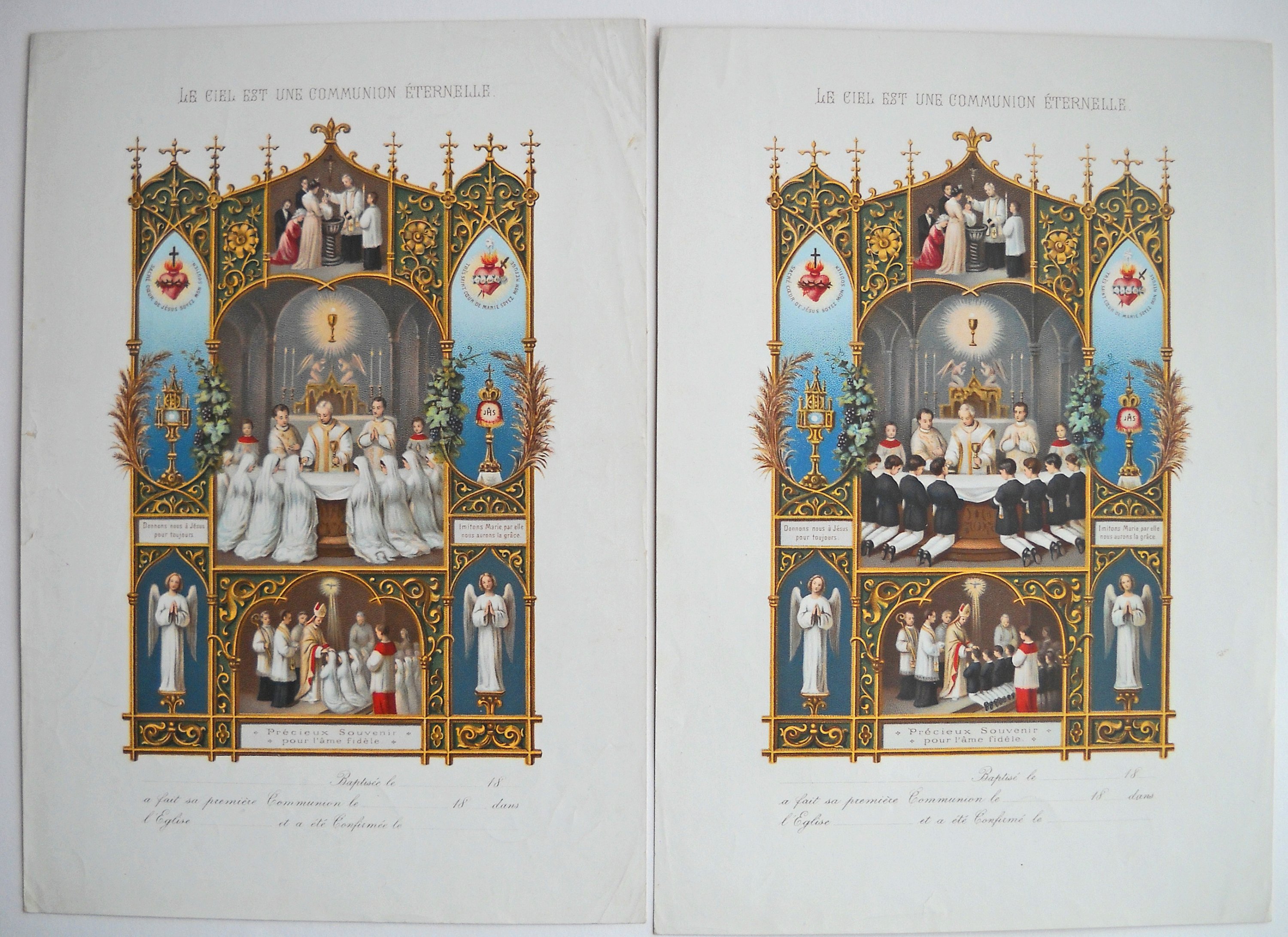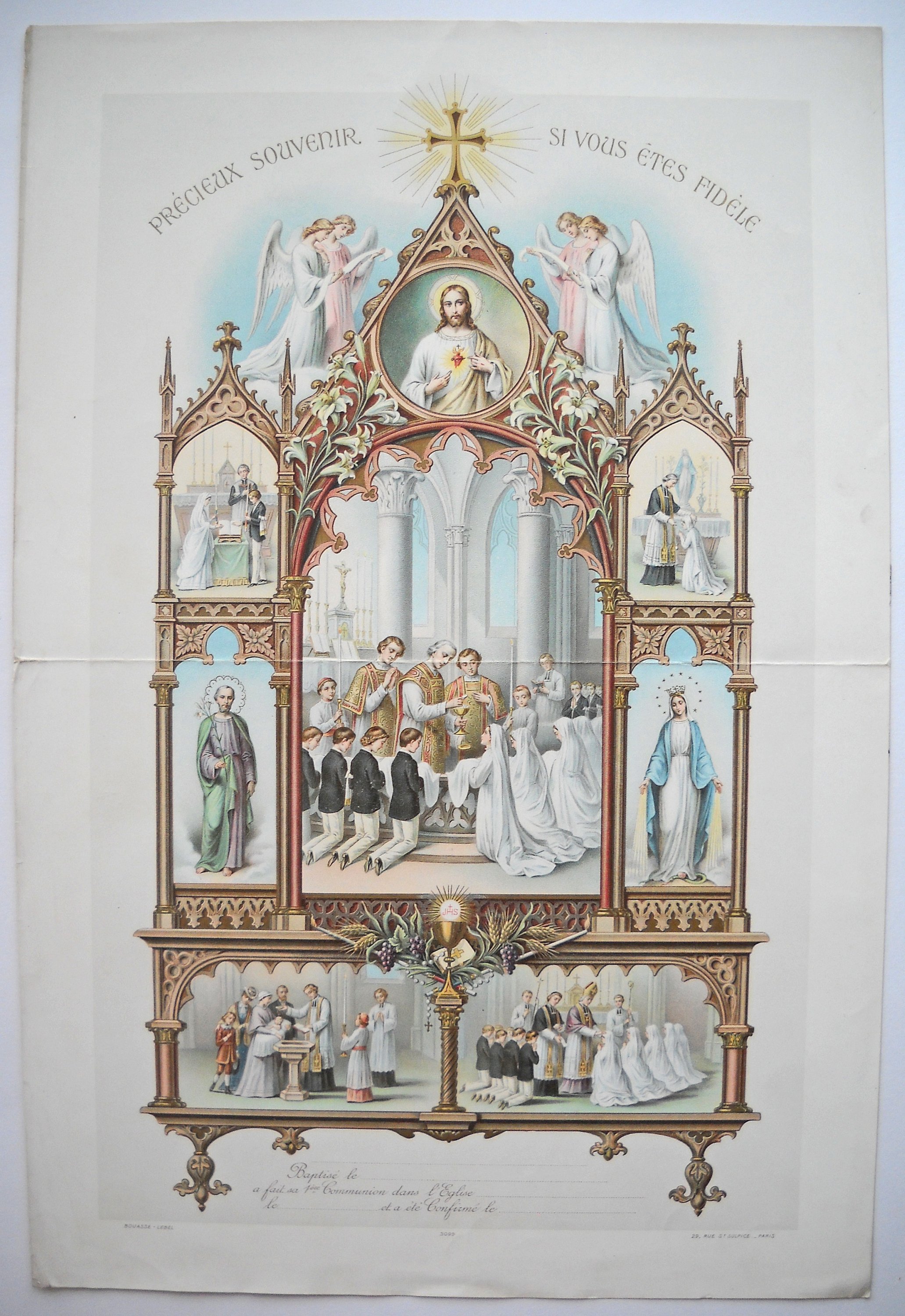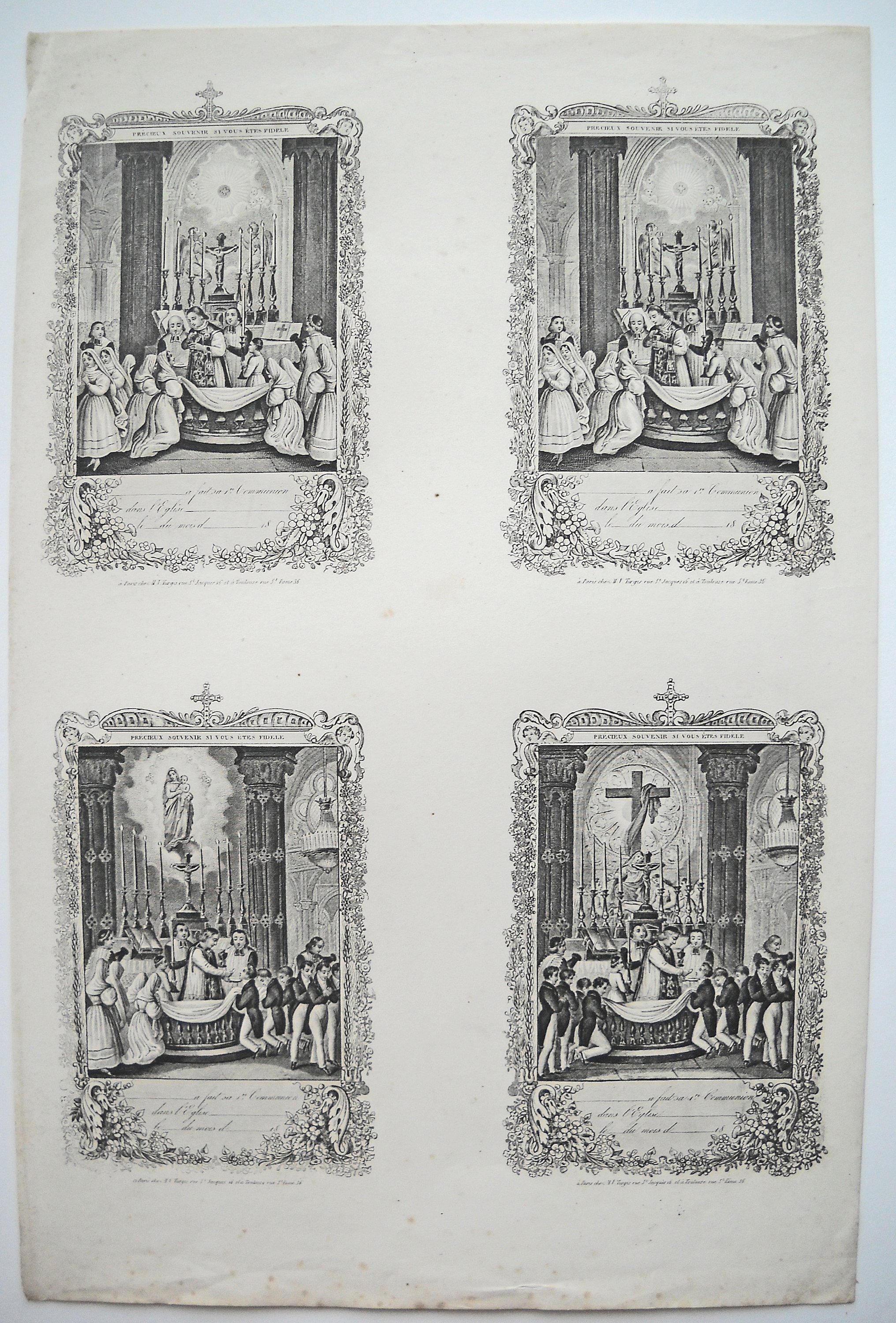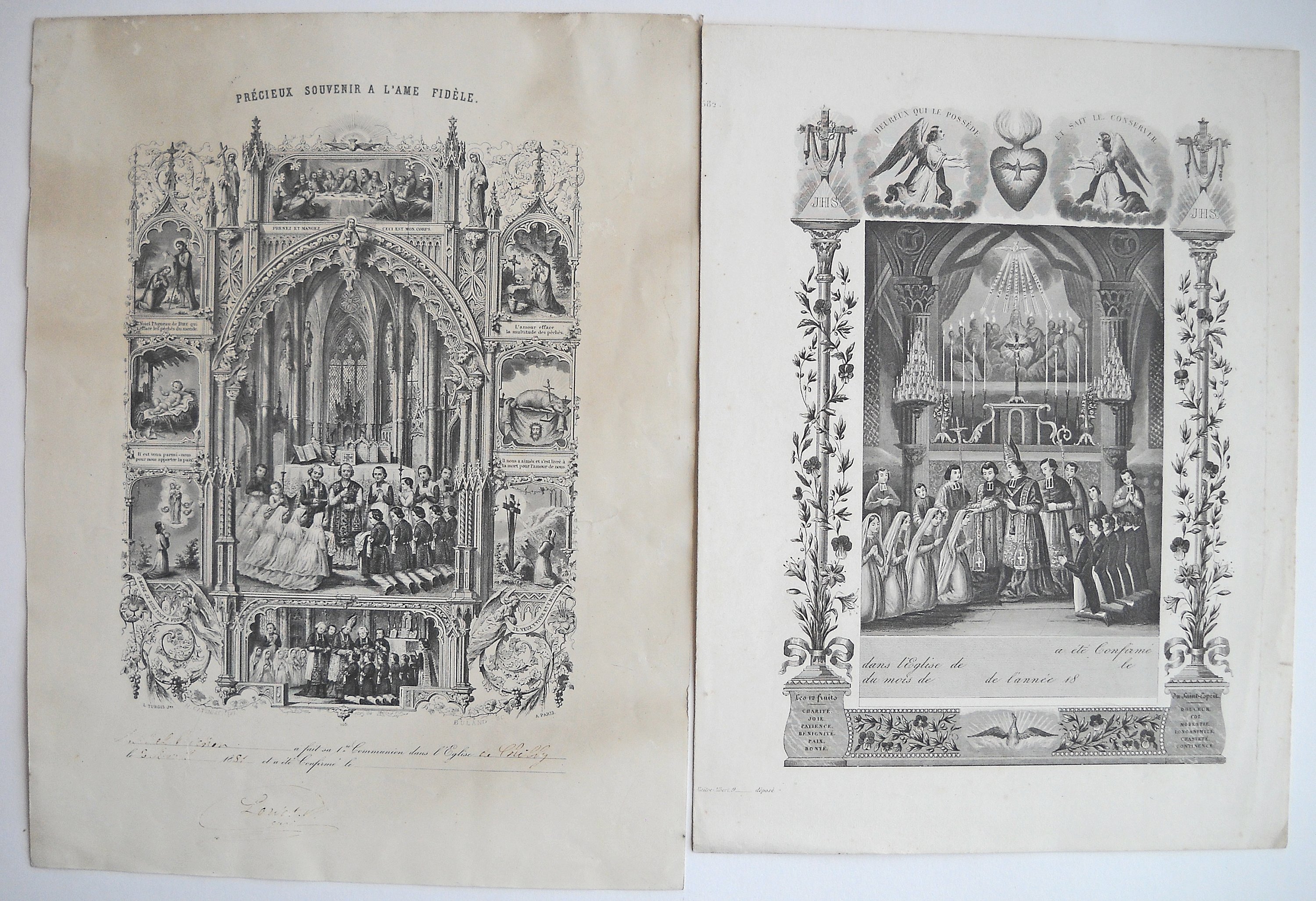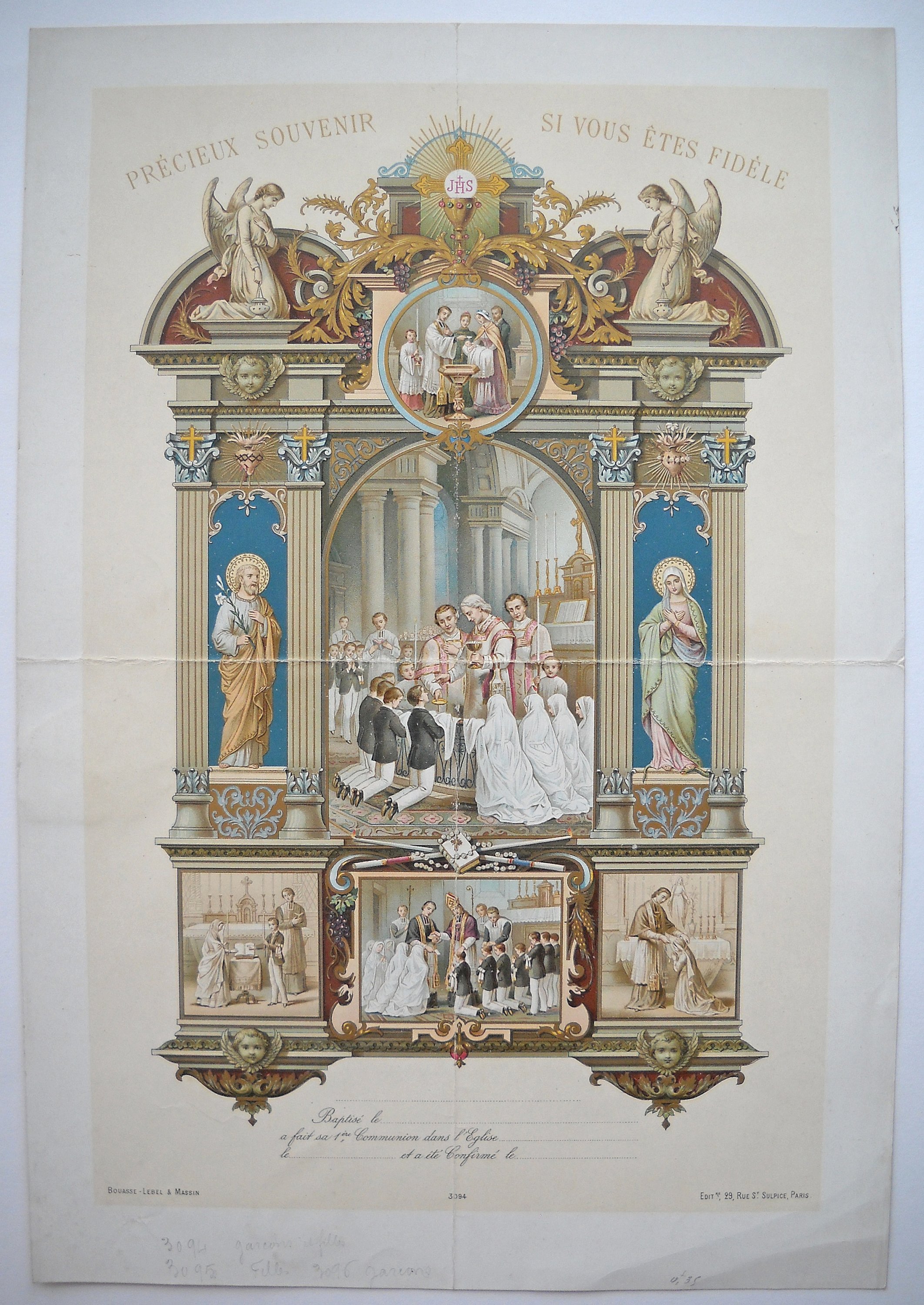 Lot de + de 105 documents divers dont 4 fragments de manuscrits, XIV ou XVe siècles, sur parchemin - 78 " Souvenir de communion ", XIXe et XXe siècles, tous formats - 2 certificats de confession à la basilique Saint Pierre de Rome, 1773 - Affiche de l'église paroissiale de Notre Dame Saint Vincent de Lyon, 71 x 54 cm - Page manuscrite de St Alphonse Marie de Liguori (1696-1787), canonisé en 1839 - etc.