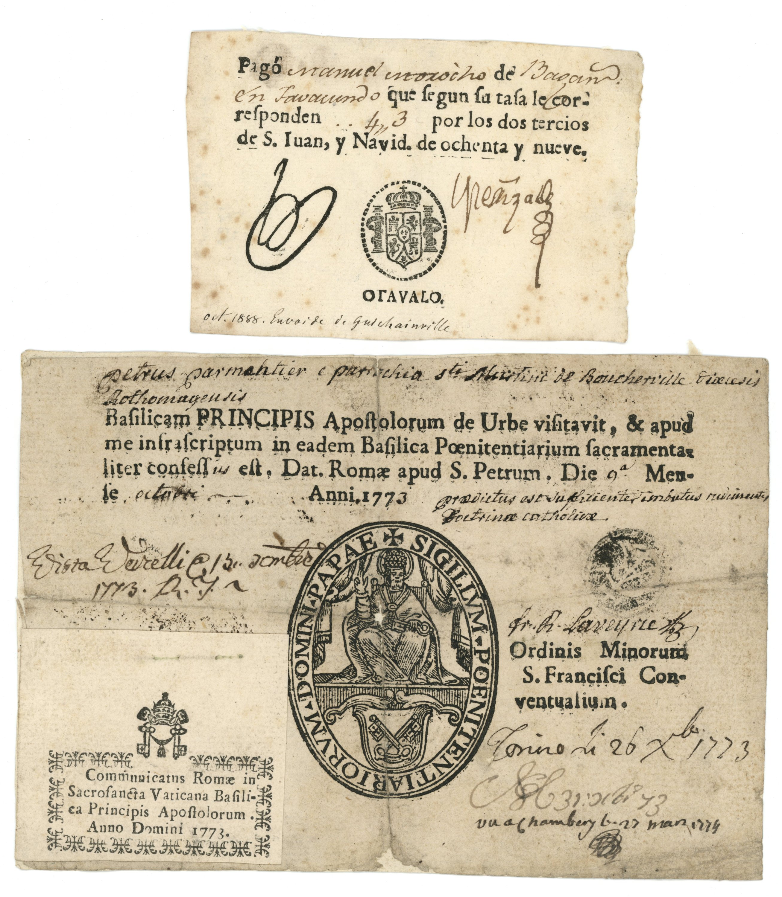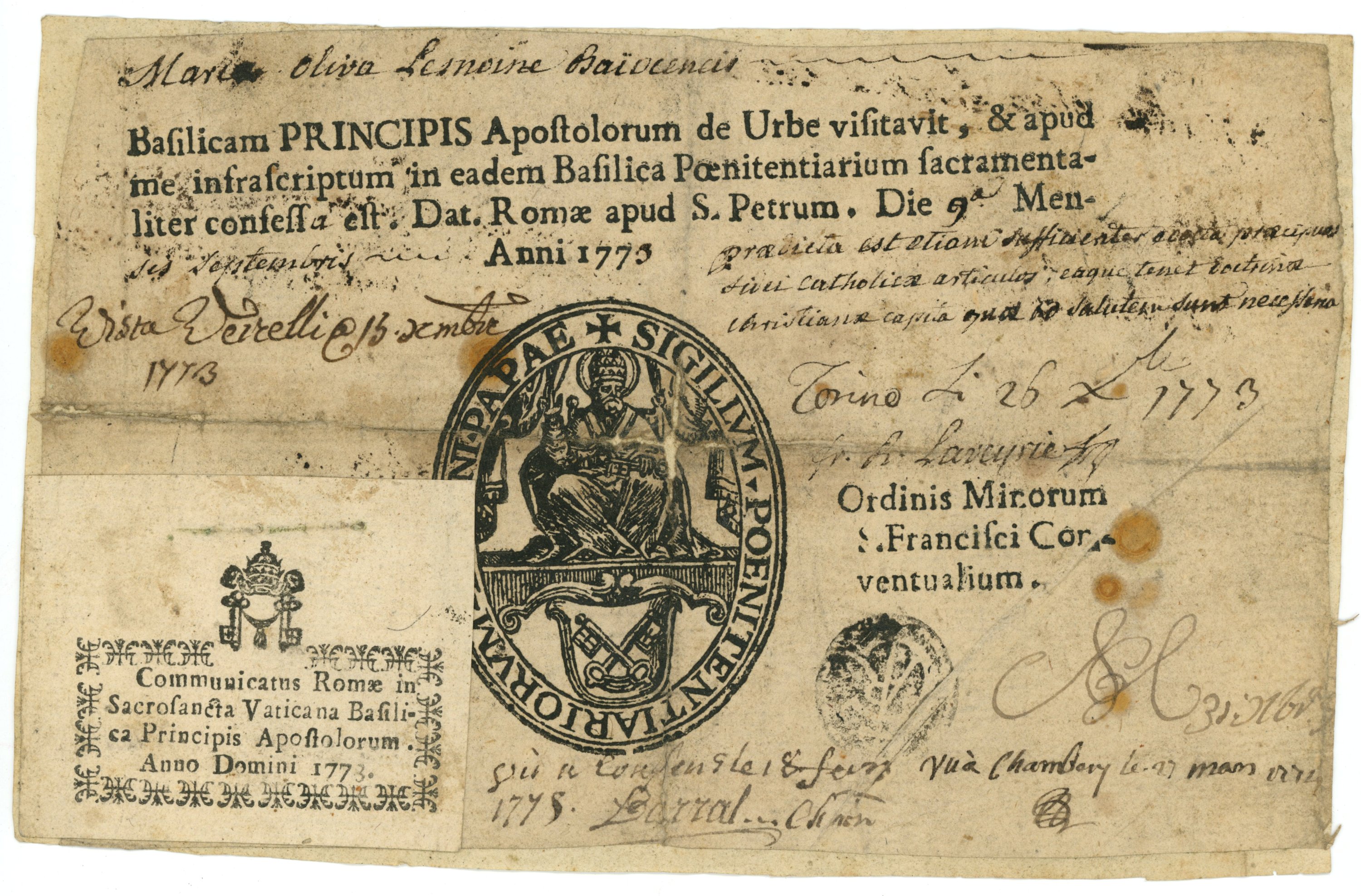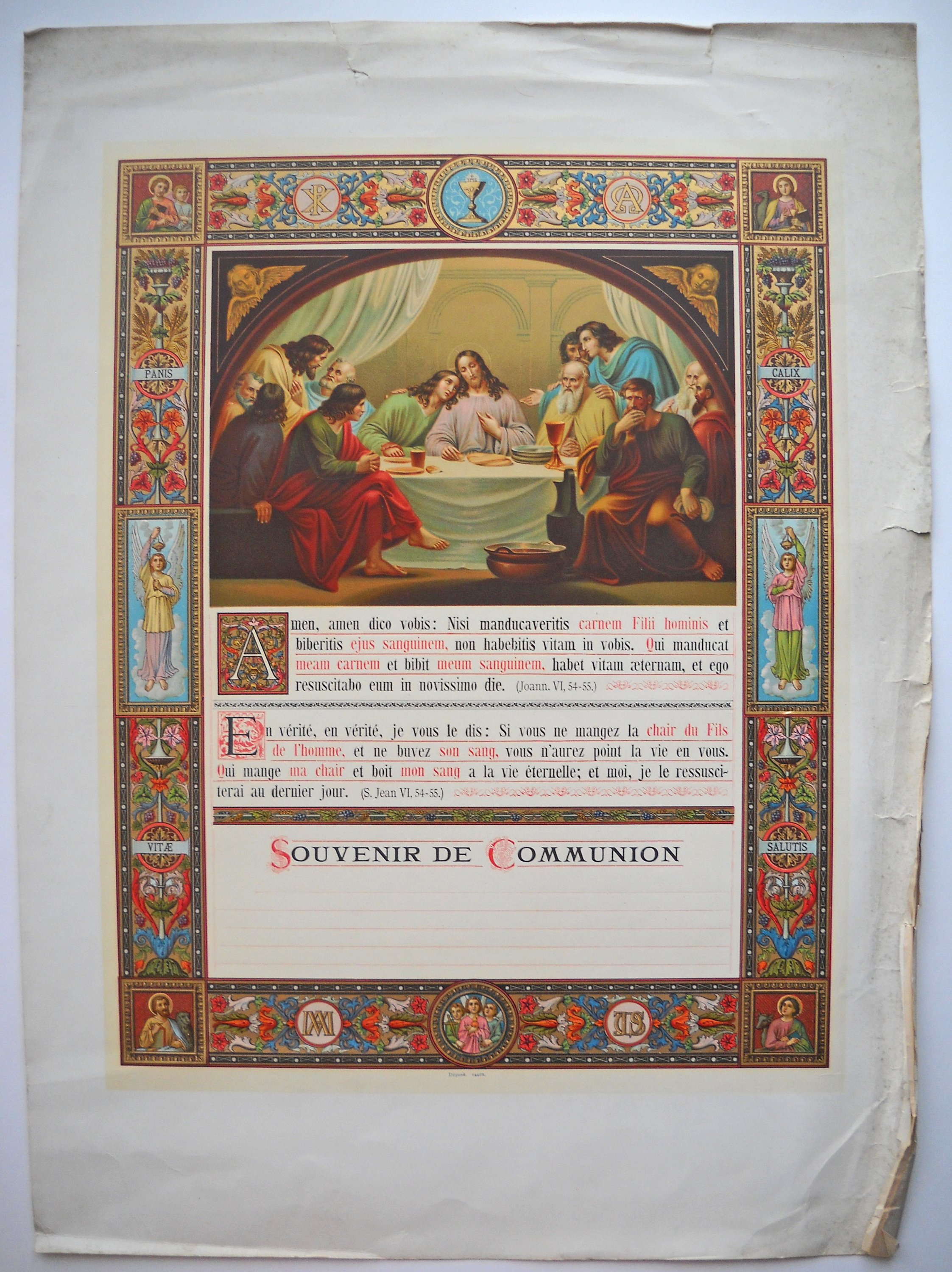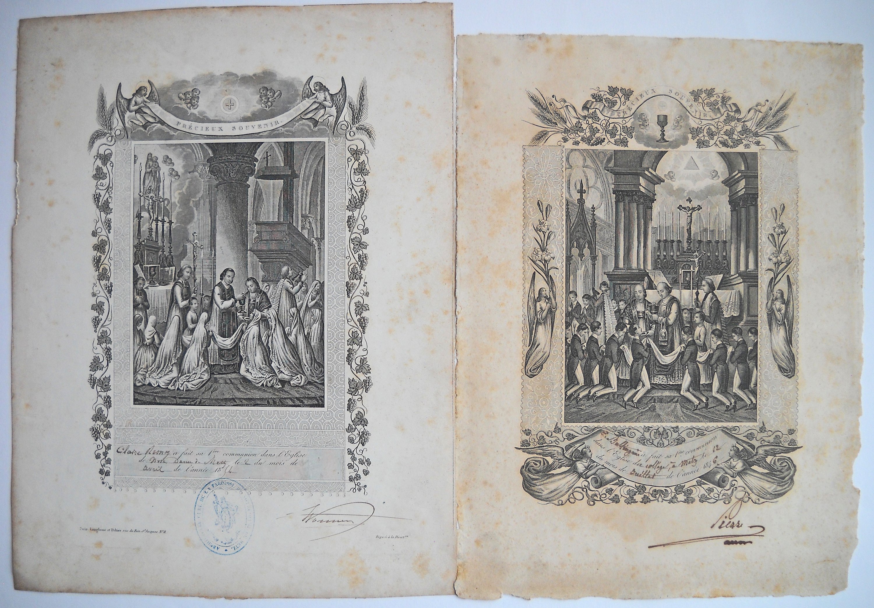 Lot de + de 105 documents divers dont 4 fragments de manuscrits, XIV ou XVe siècles, sur parchemin - 78 " Souvenir de communion ", XIXe et XXe siècles, tous formats - 2 certificats de confession à la basilique Saint Pierre de Rome, 1773 - Affiche de l'église paroissiale de Notre Dame Saint Vincent de Lyon, 71 x 54 cm - Page manuscrite de St Alphonse Marie de Liguori (1696-1787), canonisé en 1839 - etc.