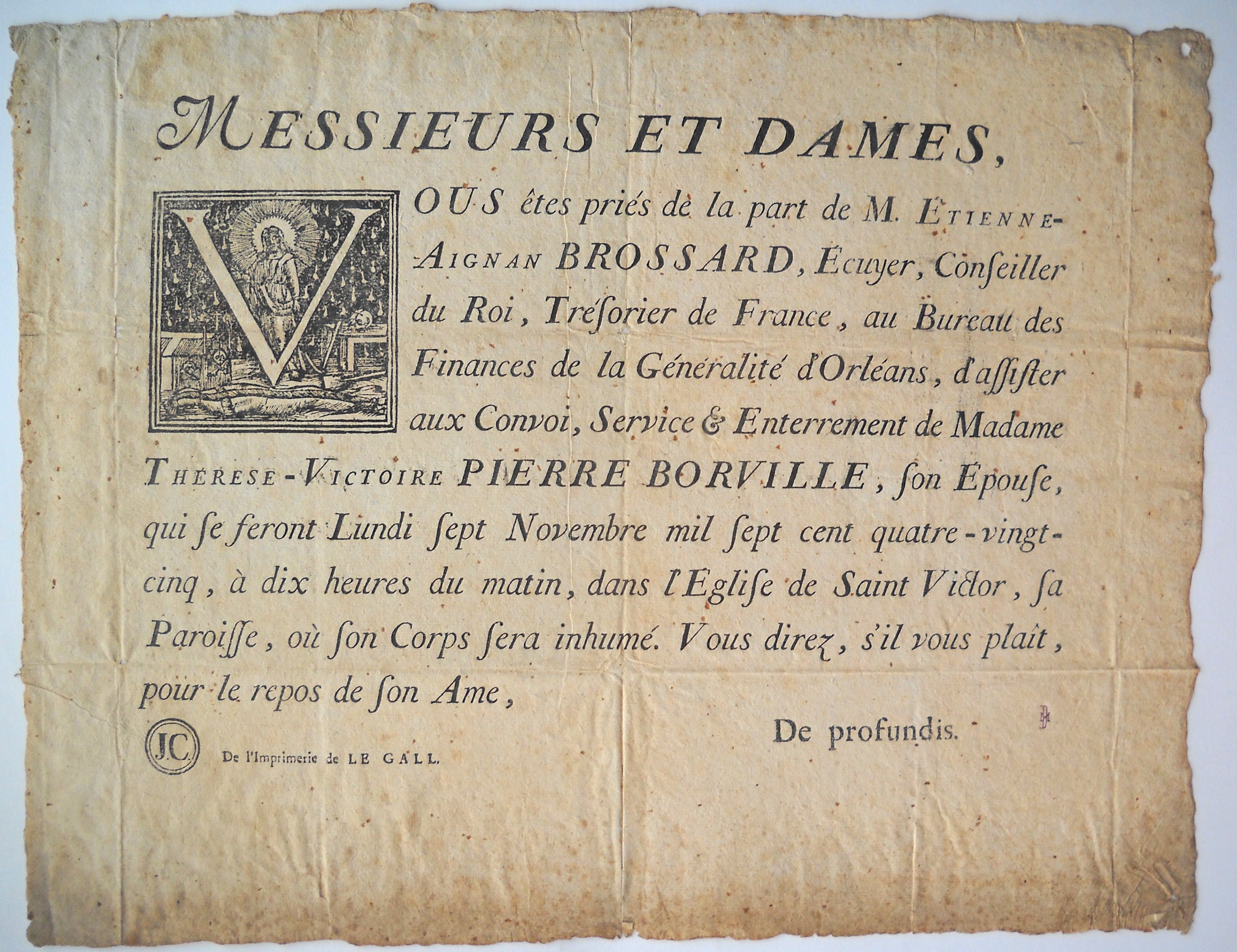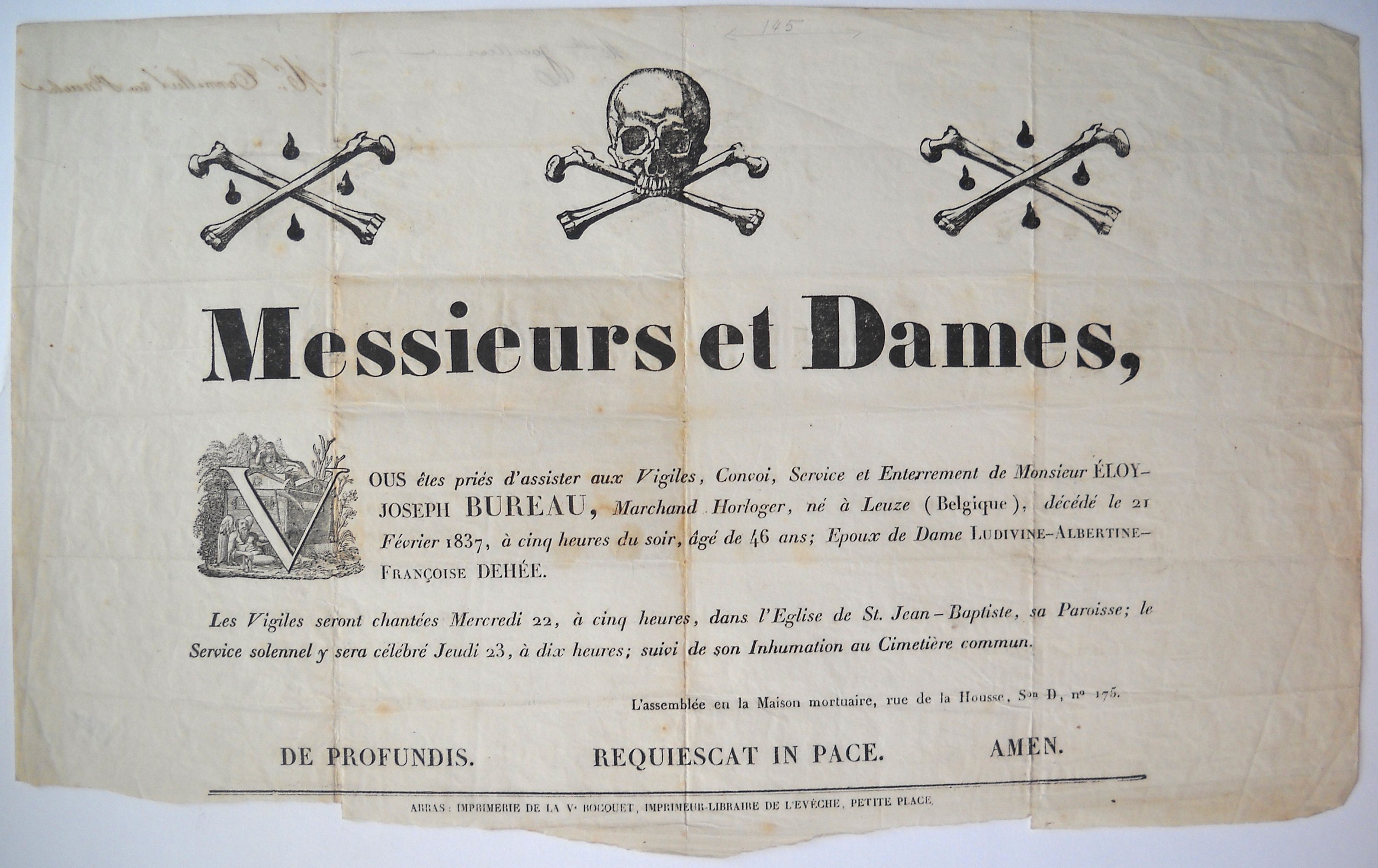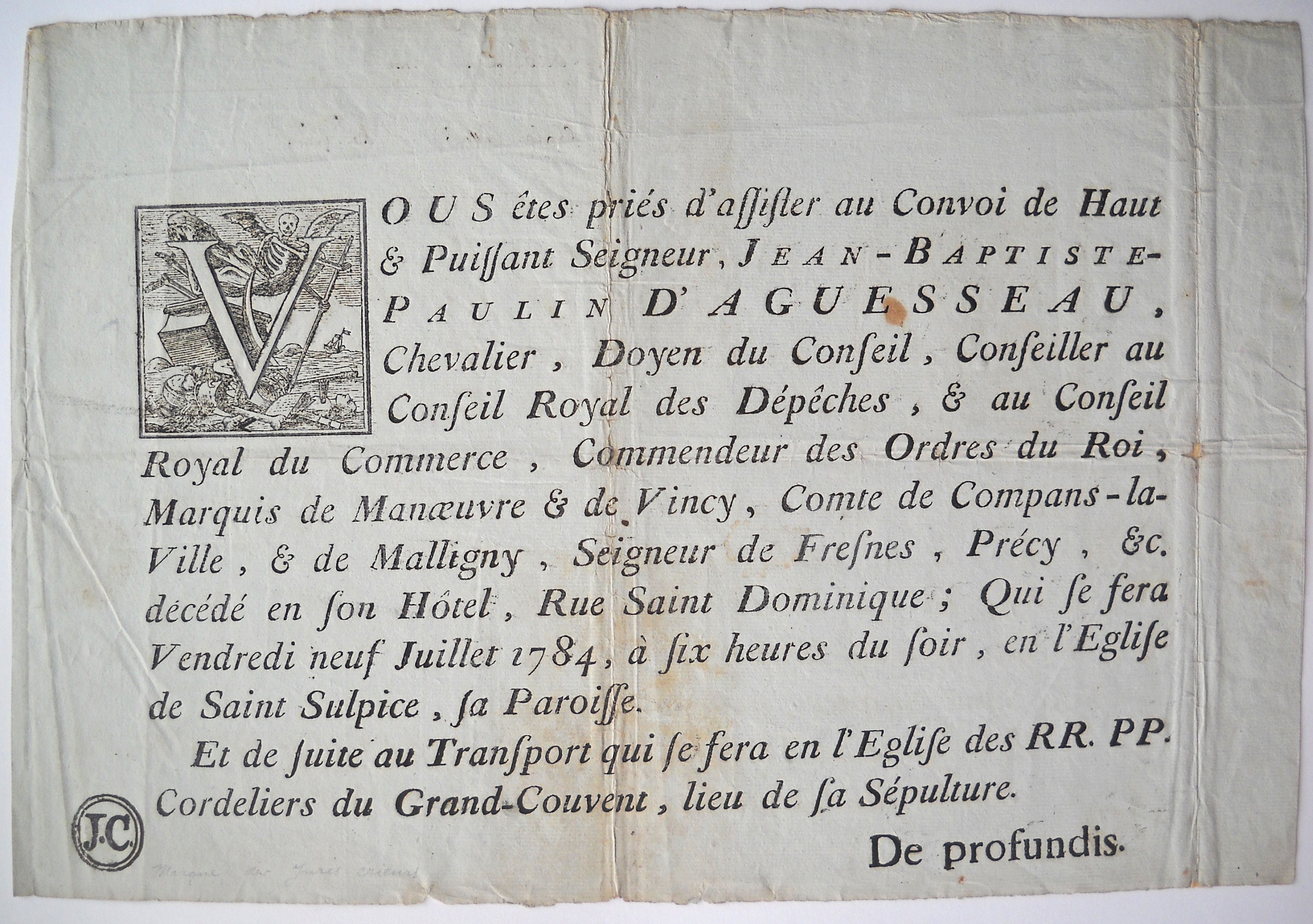 Lot d'env. 80 placards mortuaires, faireparts et divers documents " macabres ", en majorité contrecollés sur papier épais, formats divers, états moyen à TTB ; imprimés à Paris, Lille, Beauvais, Arras, Metz, Langres, Troyes, Dunkerque, Bergues, Beaune, Orléans ; période de la Régence jusqu'à la IIIe République, dont Placard de M. Pieron intendant du cardinal de Noailles archevêque de Paris, 5 août 1715 ; Jean Baptiste Paulin d'AGUESSEAU chevalier et doyen du Conseil, 9 juillet 1784 ; l'épouse d'Etienne Aignan Brossard trésorier de France, 7 novembre 1785 ; un procureur de Paris du 13 octobre 1792 ; Guy Félix ALLAN académicien de chirurgie de Paris et trésorier de la société de médecine au Louvre, 4 vendémiaire an XI ; etc.