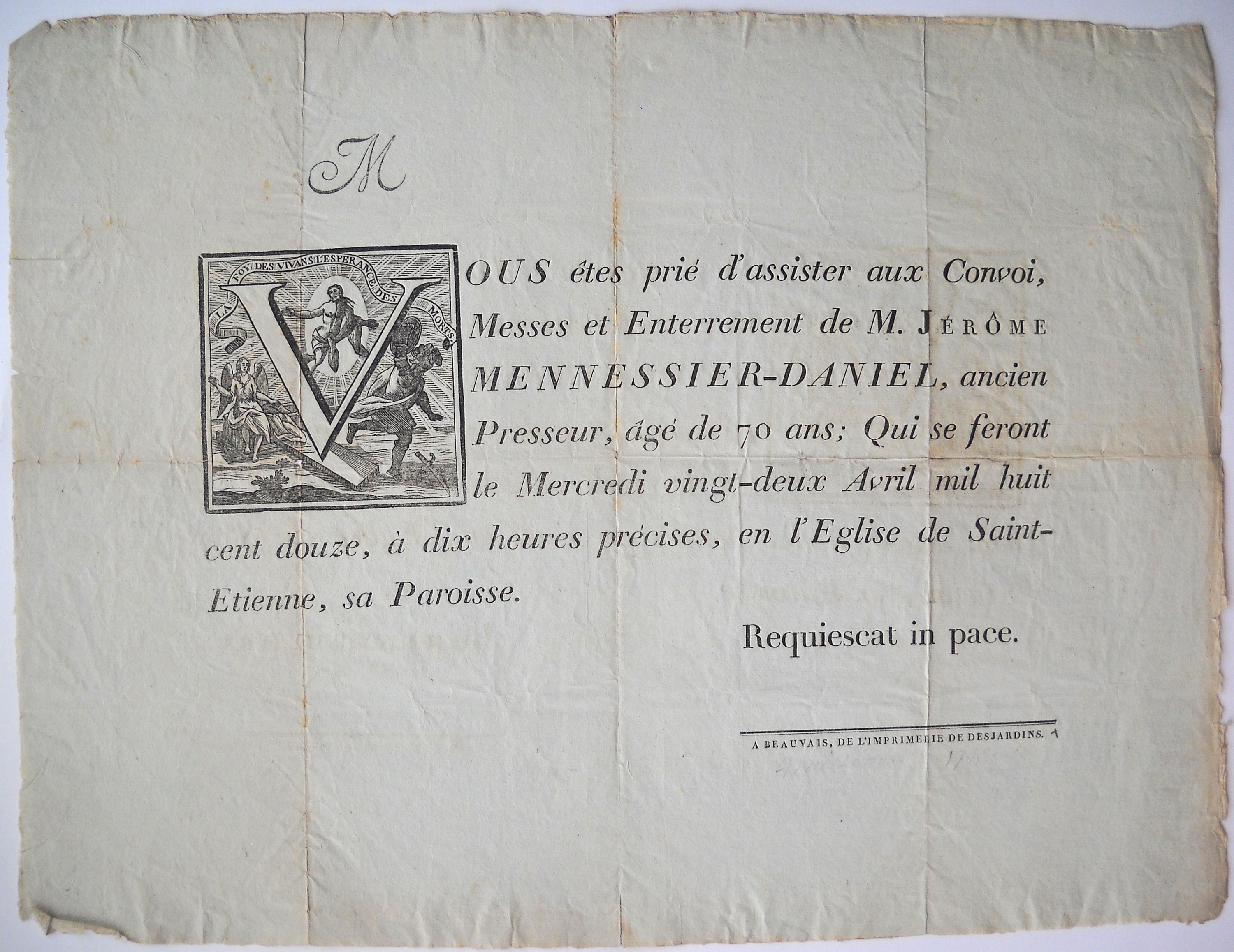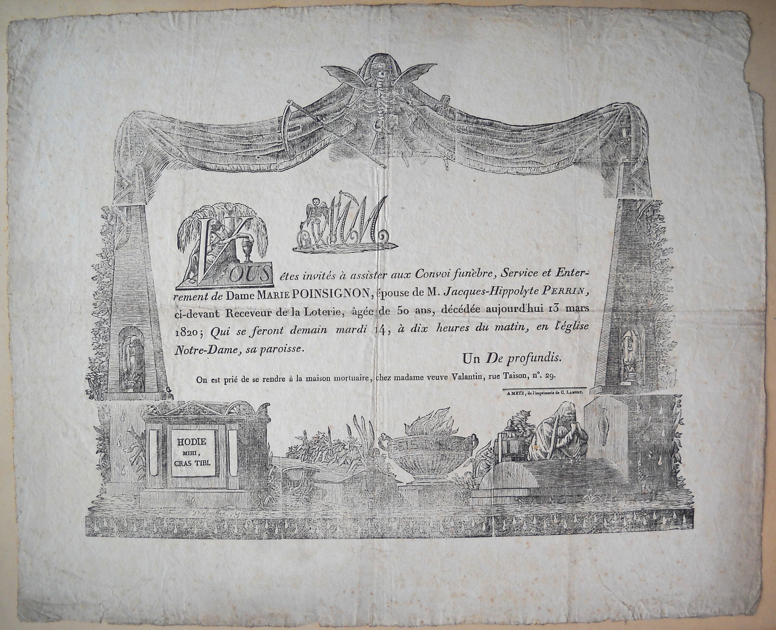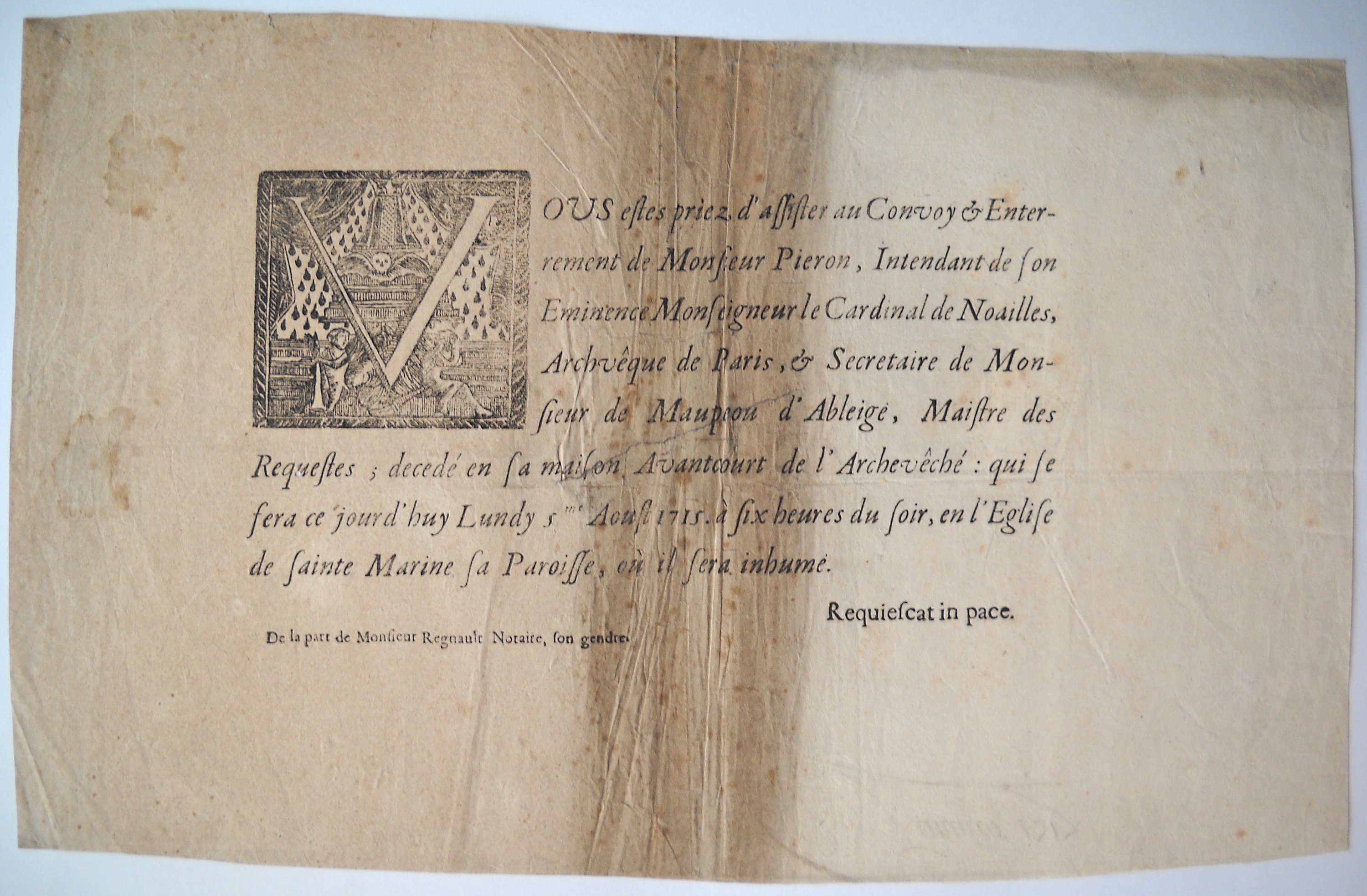 Lot d'env. 80 placards mortuaires, faireparts et divers documents " macabres ", en majorité contrecollés sur papier épais, formats divers, états moyen à TTB ; imprimés à Paris, Lille, Beauvais, Arras, Metz, Langres, Troyes, Dunkerque, Bergues, Beaune, Orléans ; période de la Régence jusqu'à la IIIe République, dont Placard de M. Pieron intendant du cardinal de Noailles archevêque de Paris, 5 août 1715 ; Jean Baptiste Paulin d'AGUESSEAU chevalier et doyen du Conseil, 9 juillet 1784 ; l'épouse d'Etienne Aignan Brossard trésorier de France, 7 novembre 1785 ; un procureur de Paris du 13 octobre 1792 ; Guy Félix ALLAN académicien de chirurgie de Paris et trésorier de la société de médecine au Louvre, 4 vendémiaire an XI ; etc.