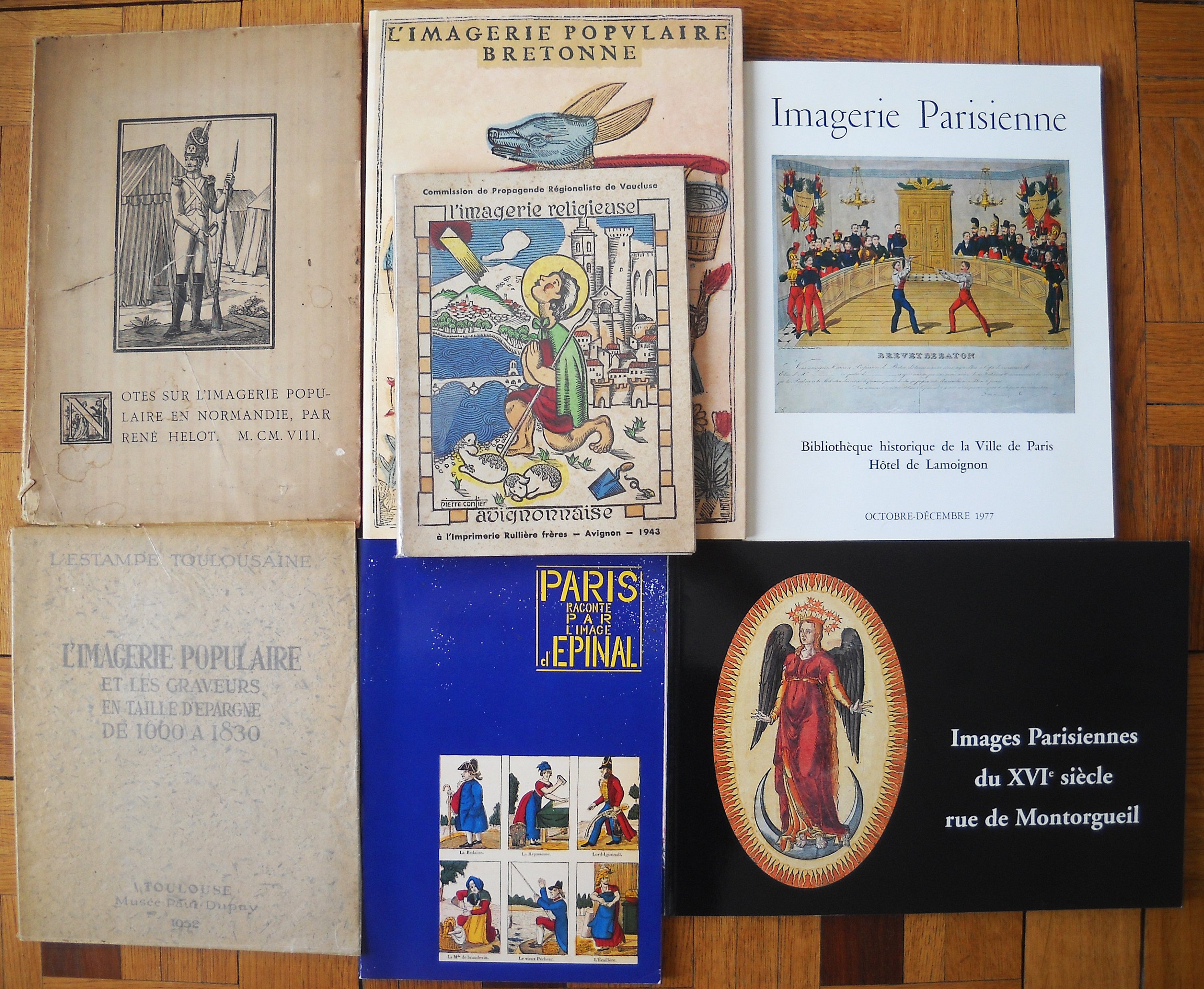 7 brochures et plaquettes : " L'IMAGERIE RELIGIEUSE AVIGNONNAISE ", Pierre Contier, 1943, 180 pp. - " L'IMAGERIE POPULAIRE ET LES GRAVEURS EN TAILLE D'EPARGNE DE 1660 à 1830 ", catalogue d'exposition, musée Paul-Dupuy de Toulouse, 1952, 110 pp. + planches HT - " Imagerie Parisienne ", catalogue d'exposition, bibliothèque historique de Paris, 1977, 167 pp. - " Paris raconté par l'image d'Epinal ", catalogue d'exposition, musée Carnavalet, 1990, 127 pp. - " Images Parisiennes du XVIe siècle rue de Montorgueil ", catalogue de ventes aux enchères, Galerie de Chartres, 2004, 167 pp. - " NOTES SUR L'IMAGERIE POPULAIRE EN NORMANDIE ", René Helot, 1908, 77 pp. + pl. HT - " L'IMAGERIE POPULAIRE BRETONNE ", catalogue d'exposition, Archives départementales du Finistère, 1992, 207 pp.
