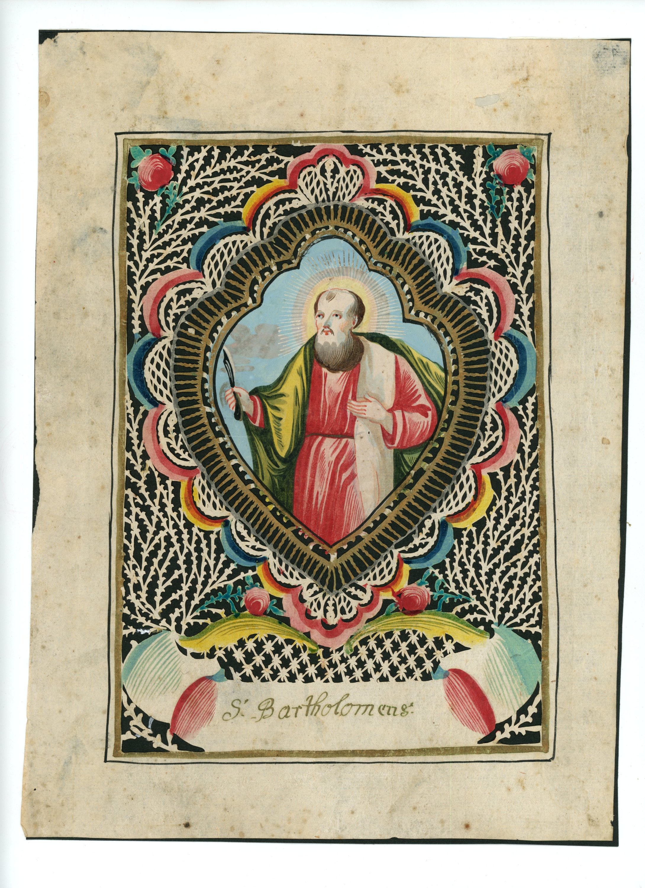 - au centre d'un réseau de capillaires, entouré de festons et de roses peintes, un médaillon festonné serti d'or représentant Saint Barthélémy sur fond bleu ciel, vêtu d'un vaste manteau vert et habillé d'une tunique rouge et d'une étole blanche, tenant dans sa main droite le couteau de son martyr. Cartouche tricolore portant pour inscription en lettres dorées : S. Bartholomeus. 27 x 20 cm. Petits accdts.