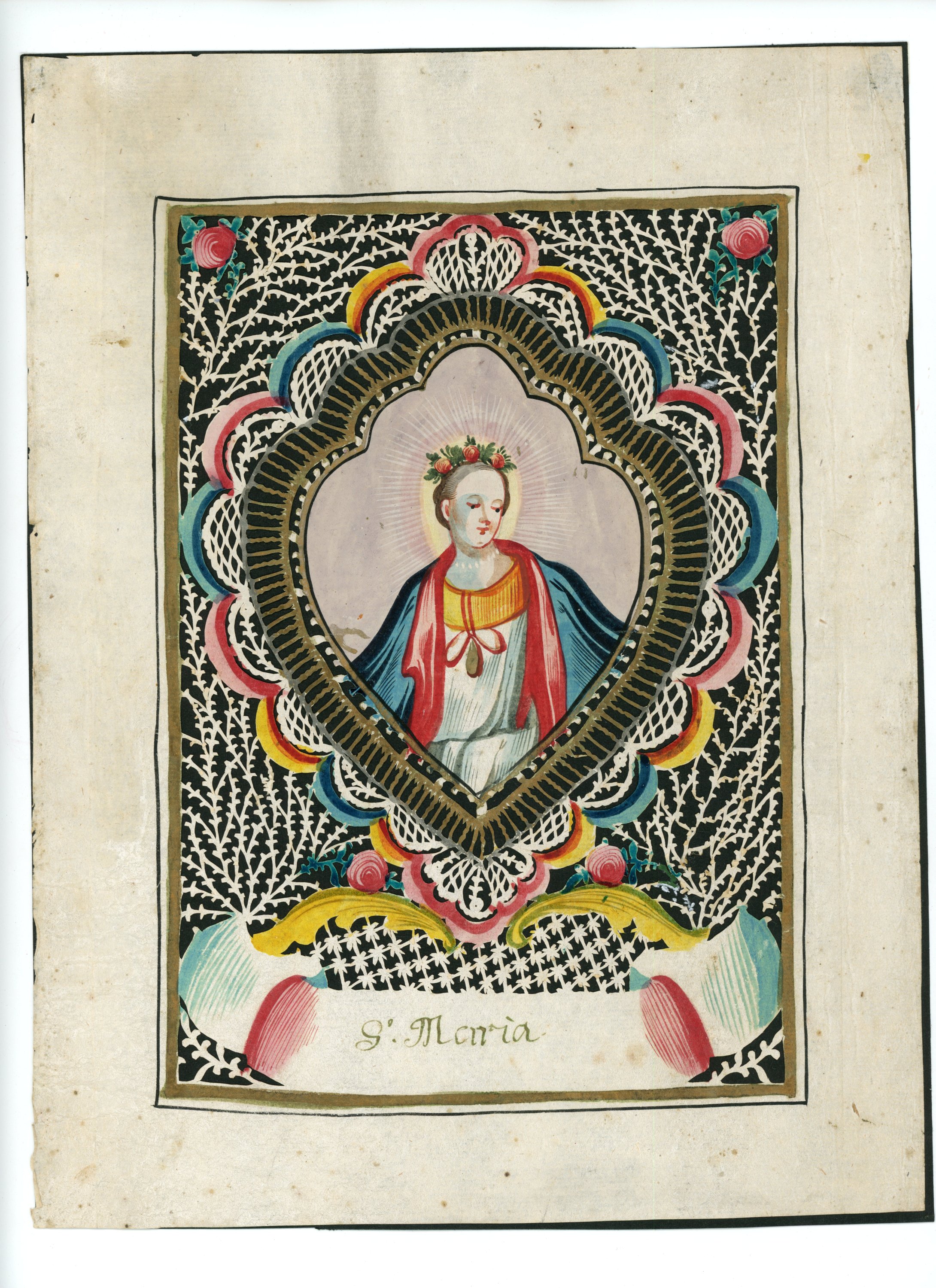- au centre d'un réseau de capillaires, entouré de festons et de roses peintes, un médaillon festonné serti d'or représentant la Vierge Marie. Se détachant sur fond mauve, elle est auréolée et coiffée d'une couronne de roses rouges, apprêtée d'un collier de perles, vêtue d'un ample manteau bleu et rouge et habillée d'une tunique blanche à bord jaune. Cartouche tricolore portant pour inscription en lettres dorées : S. Maria. 27 x 20,5 cm. Petits accdts.