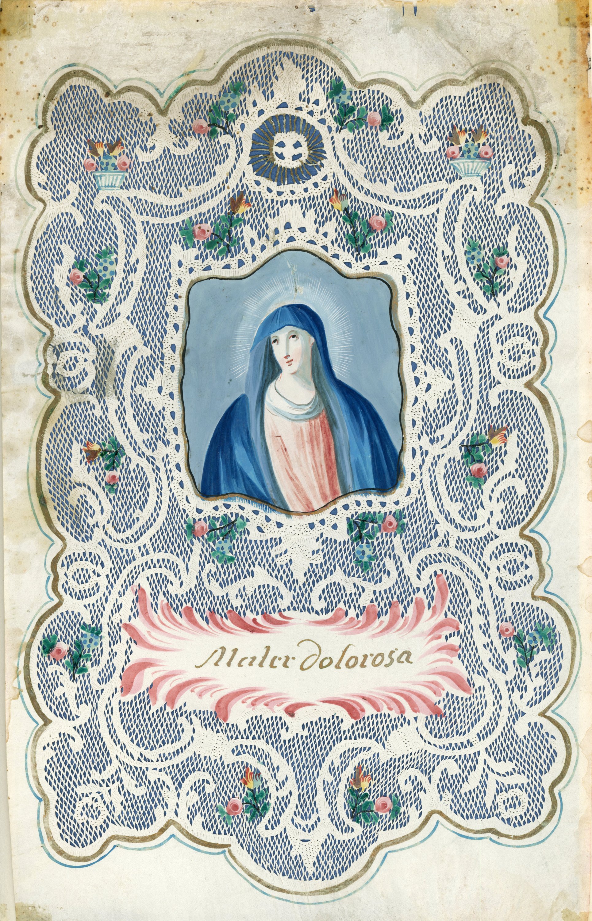 Canivet sur vélin : dans un écusson baroque à double tracé bleu et or sur marge blanche, à décor de découpes de Valenciennes, entrelacs, bouquets fleuris et fleurs peintes, un médaillon central chantourné représentant la Mater Dolorosa auréolée, drapée dans un long manteau bleu et habillée d'une robe rouge. Cartouche frangé de rouge portant pour inscription en lettres dorées : Mater dolorosa. 29,5 x 18,5 cm. Petits accdts et tâches.